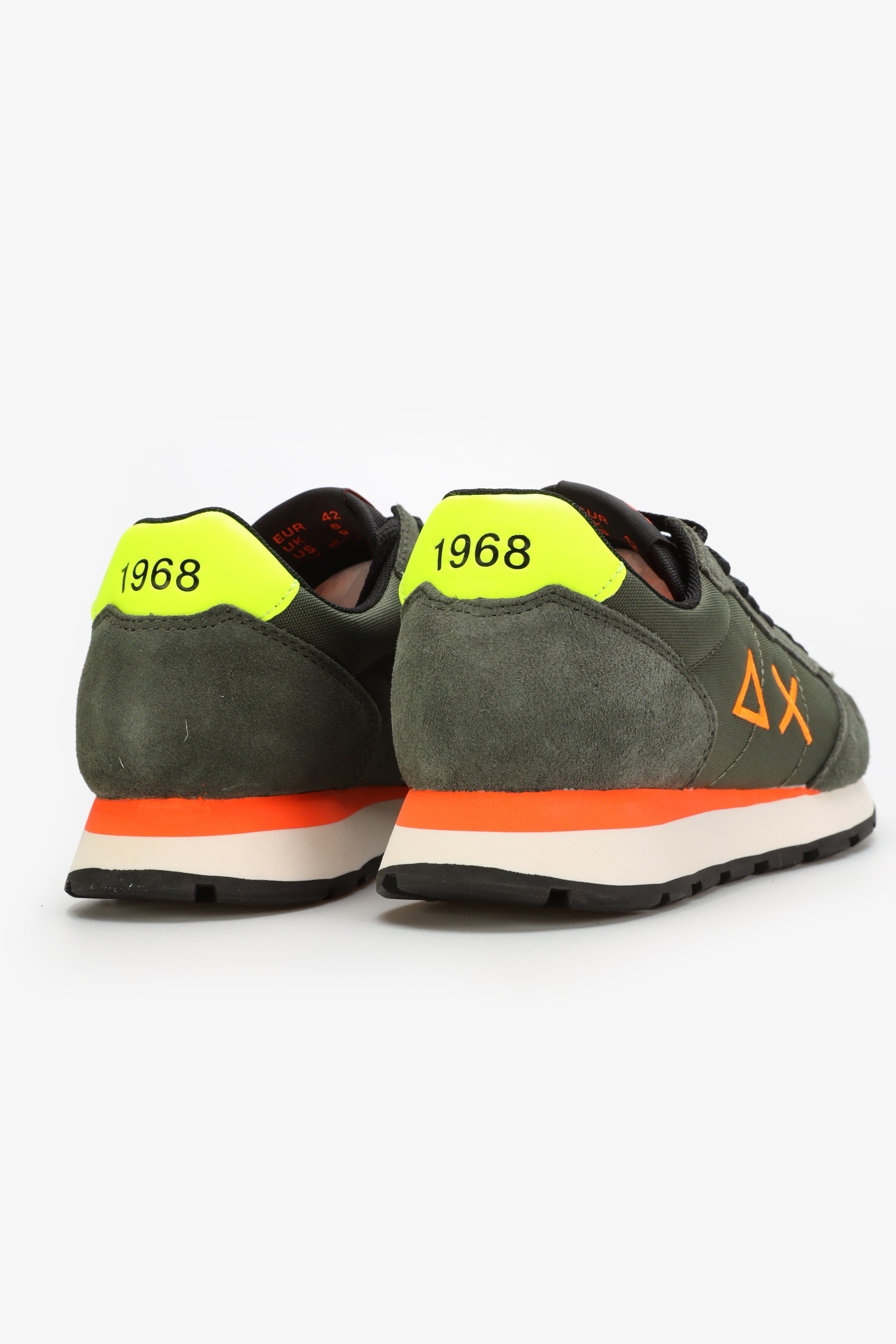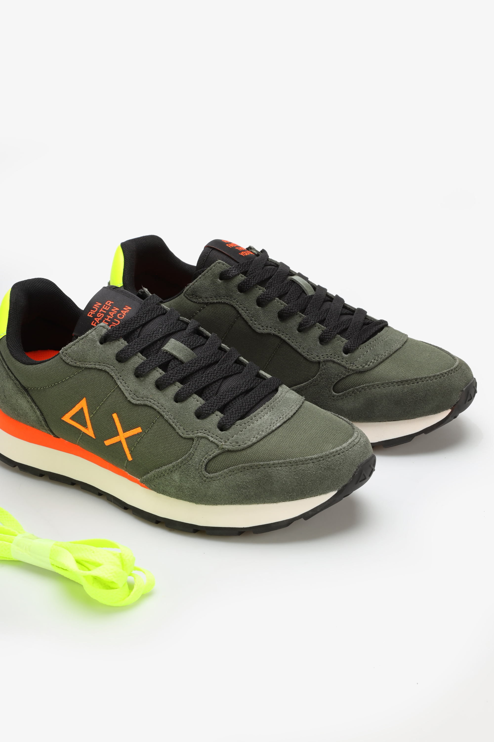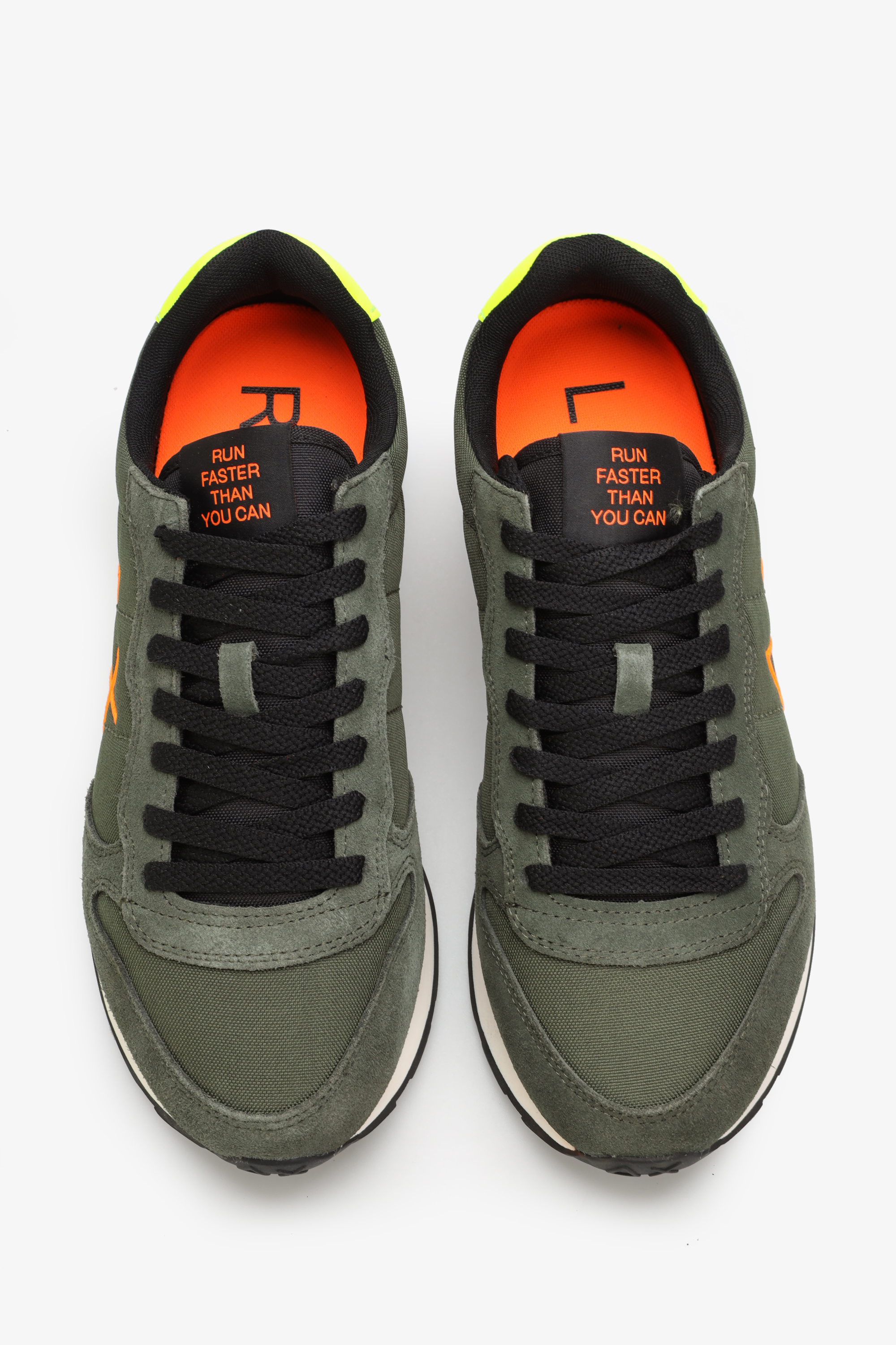 Sneakersy męskie w zielonym kolorze wykonane są z zamszowej skóry i materiału tekstylnego. Posiadają żółty, odblaskowy zapiętek a z boku widoczne jest logo marki. Wygodna i miękka podeszwa w stylu running shoes odpowiada za komfort chodzenia przez cały dzień. Dodatkowa para sznurówek w innym kolorze pozwala zmieniać je w zależności od nastroju.