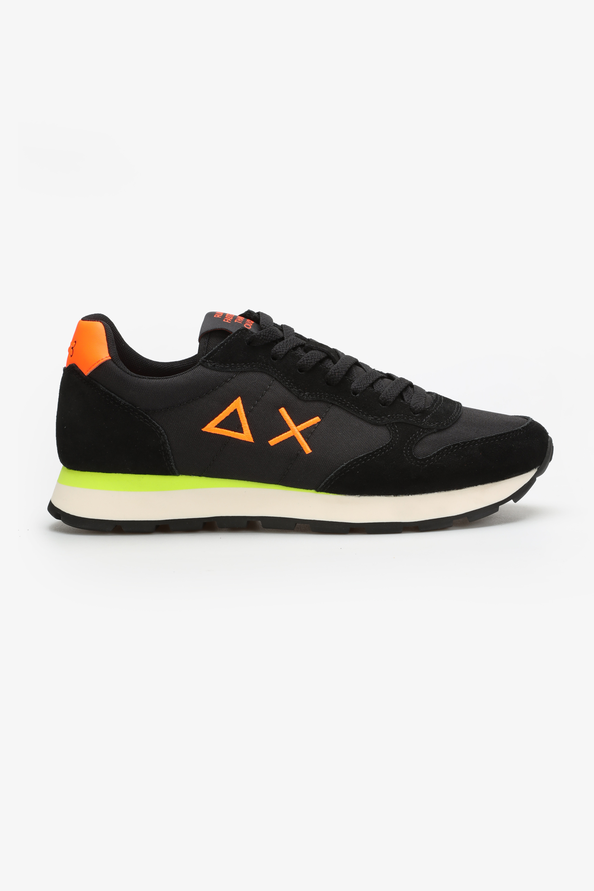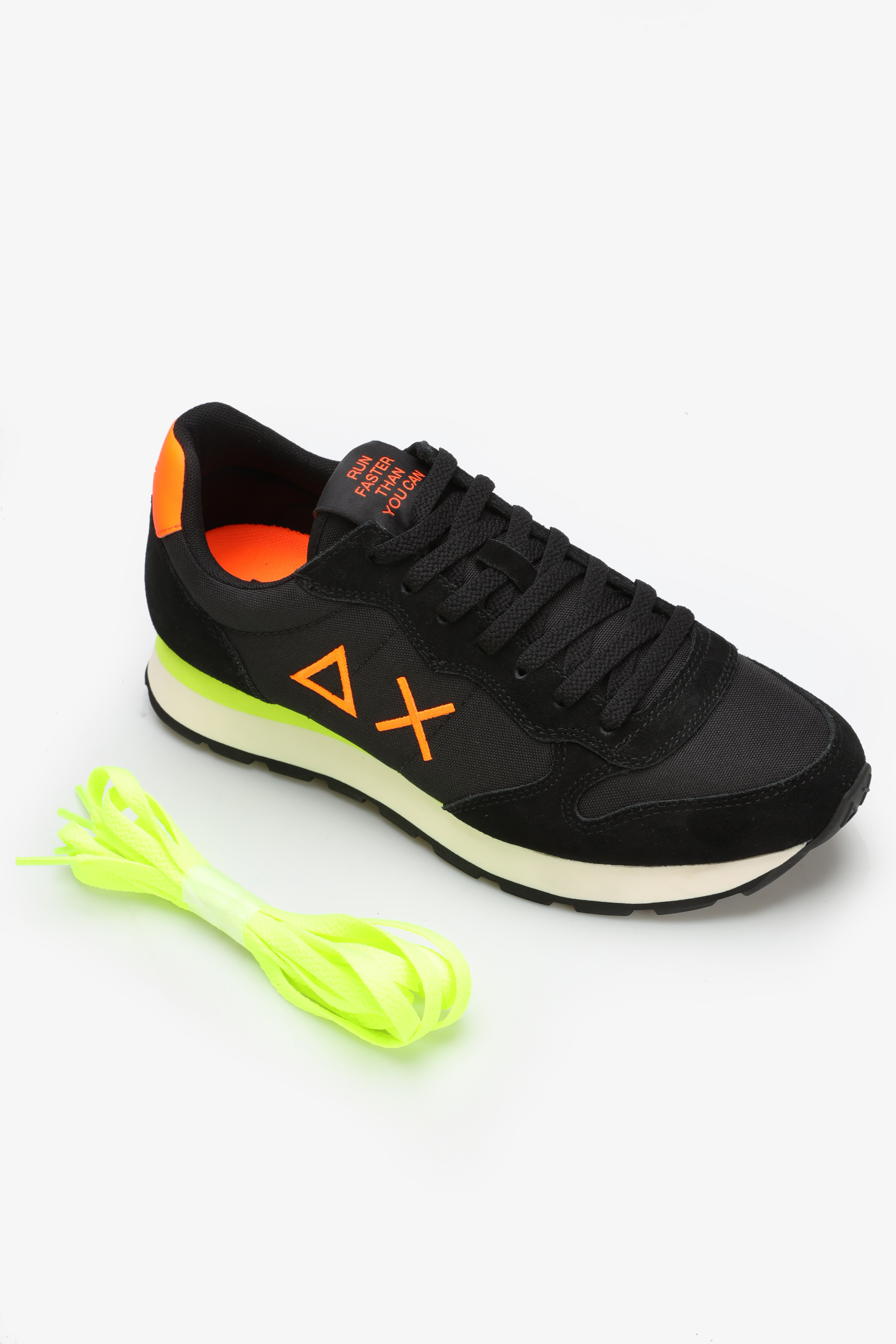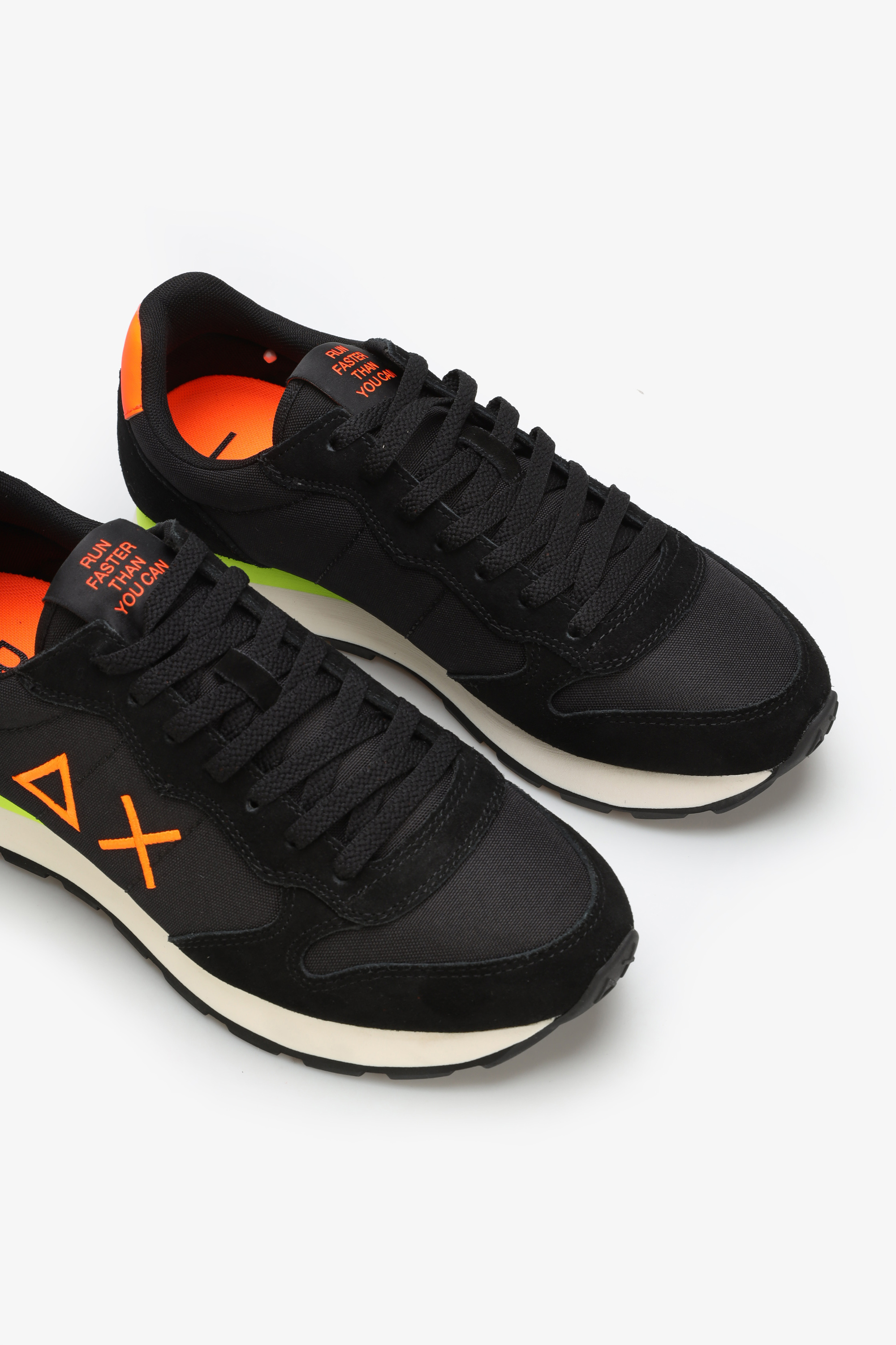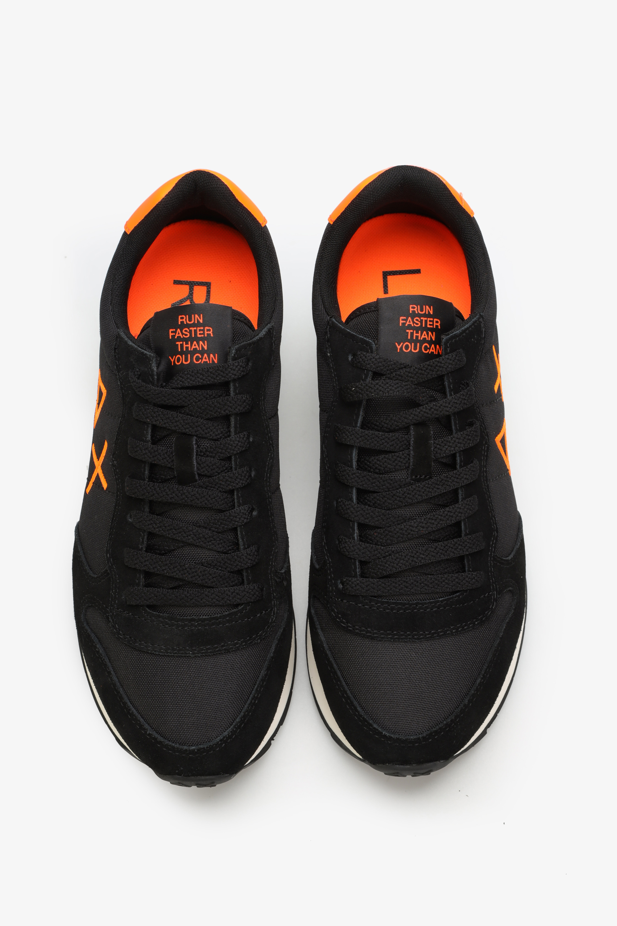 Sneakersy męskie w czarnym kolorze wykonane są z zamszowej skóry i materiału tekstylnego. Posiadają pomarańczowy zapiętek a z boku widoczne jest logo marki. Wygodna i miękka podeszwa w stylu running shoes odpowiada za komfort chodzenia przez cały dzień. Dodatkowa para sznurówek w innym kolorze pozwala zmieniać je w zależności od nastroju.