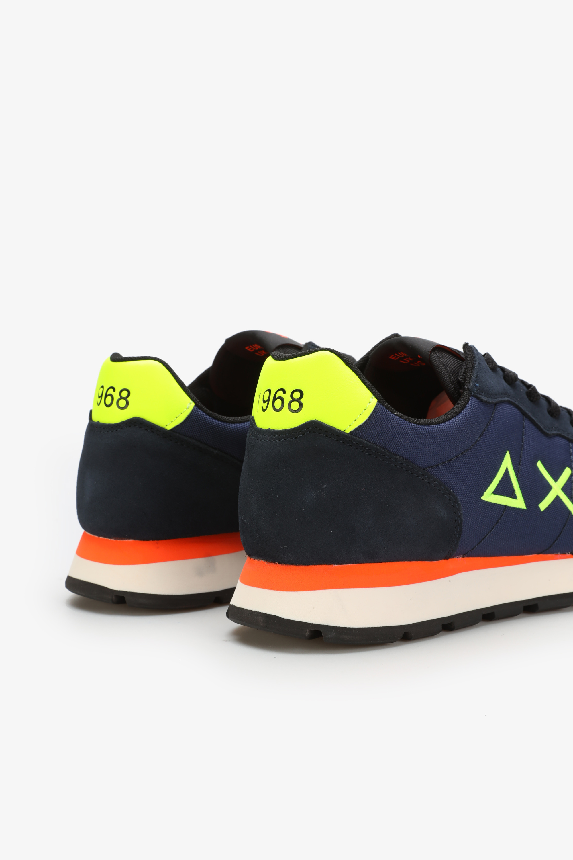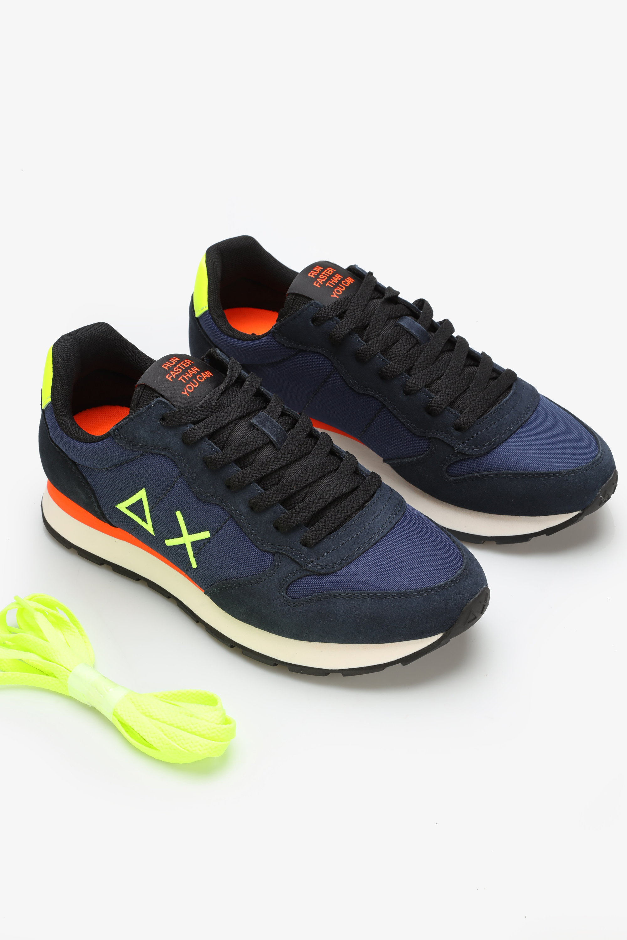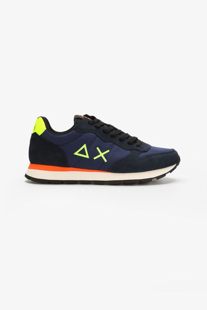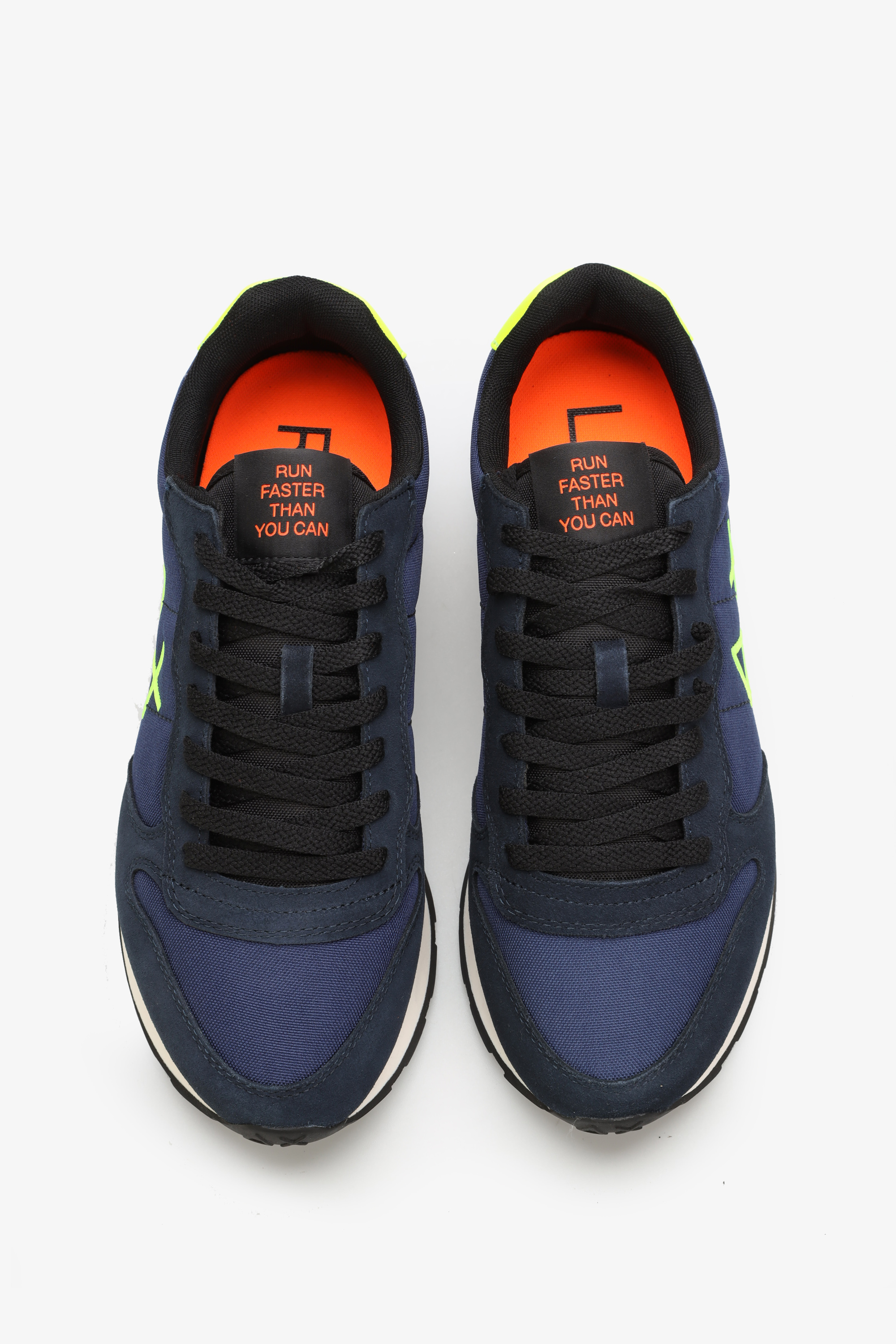 Sneakersy męskie w niebieskim kolorze wykonane są z zamszowej skóry i materiału tekstylnego. Posiadają żółty, odblaskowy zapiętek a z boku widoczne jest logo marki. Wygodna i miękka podeszwa w stylu running shoes odpowiada za komfort chodzenia przez cały dzień. Dodatkowa para sznurówek w innym kolorze pozwala zmieniać je w zależności od nastroju.