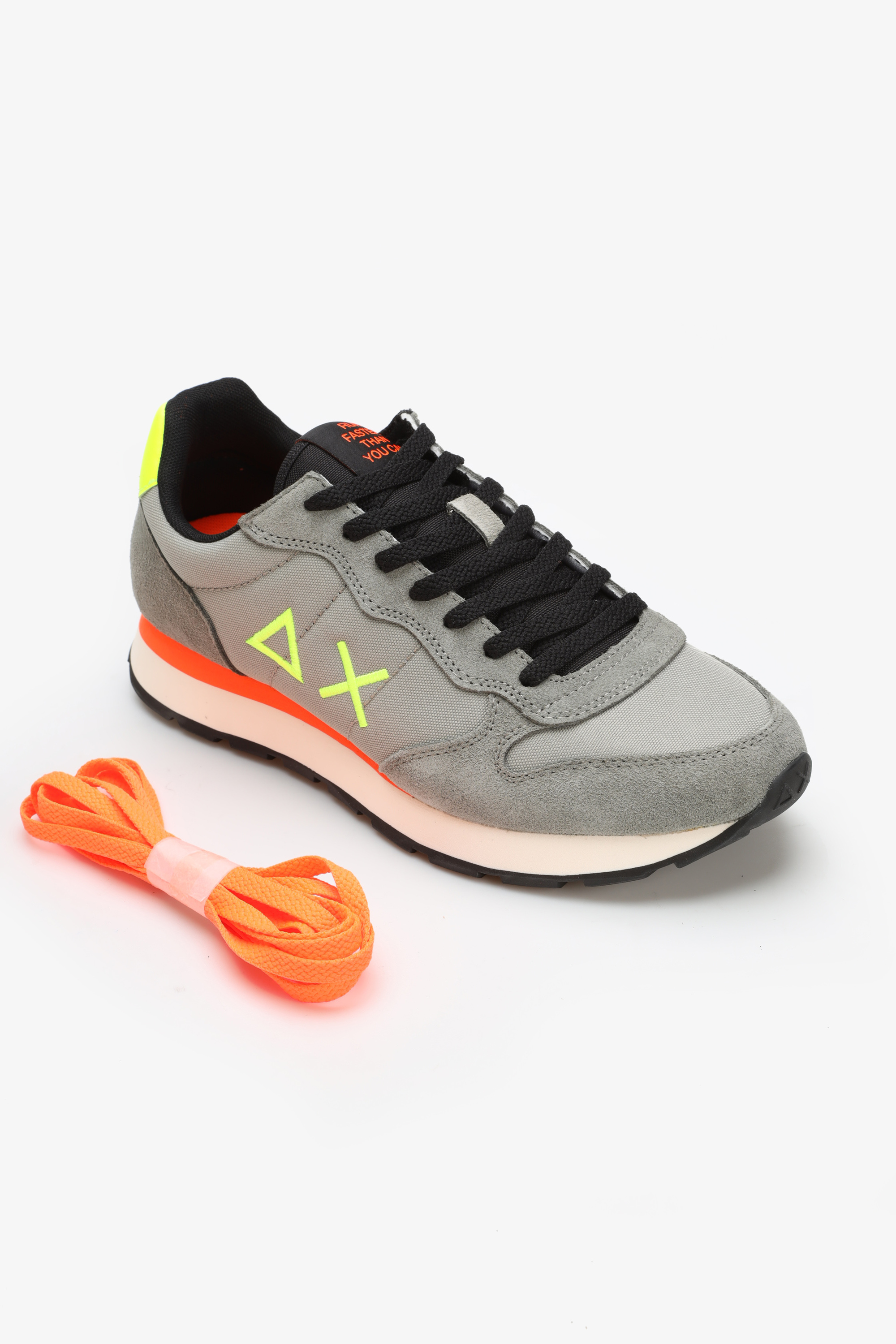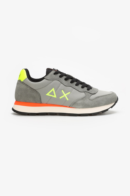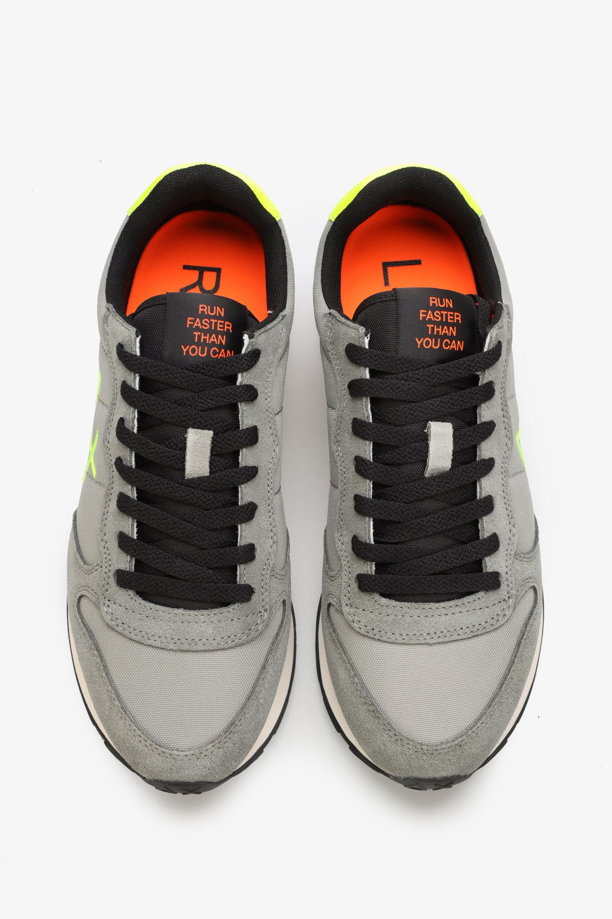 Sneakersy męskie w szarym kolorze wykonane są z zamszowej skóry i materiału tekstylnego. Posiadają żółty, odblaskowy zapiętek a z boku widoczne jest logo marki. Wygodna i miękka podeszwa w stylu running shoes odpowiada za komfort chodzenia przez cały dzień. Dodatkowa para sznurówek w innym kolorze pozwala zmieniać je w zależności od nastroju.