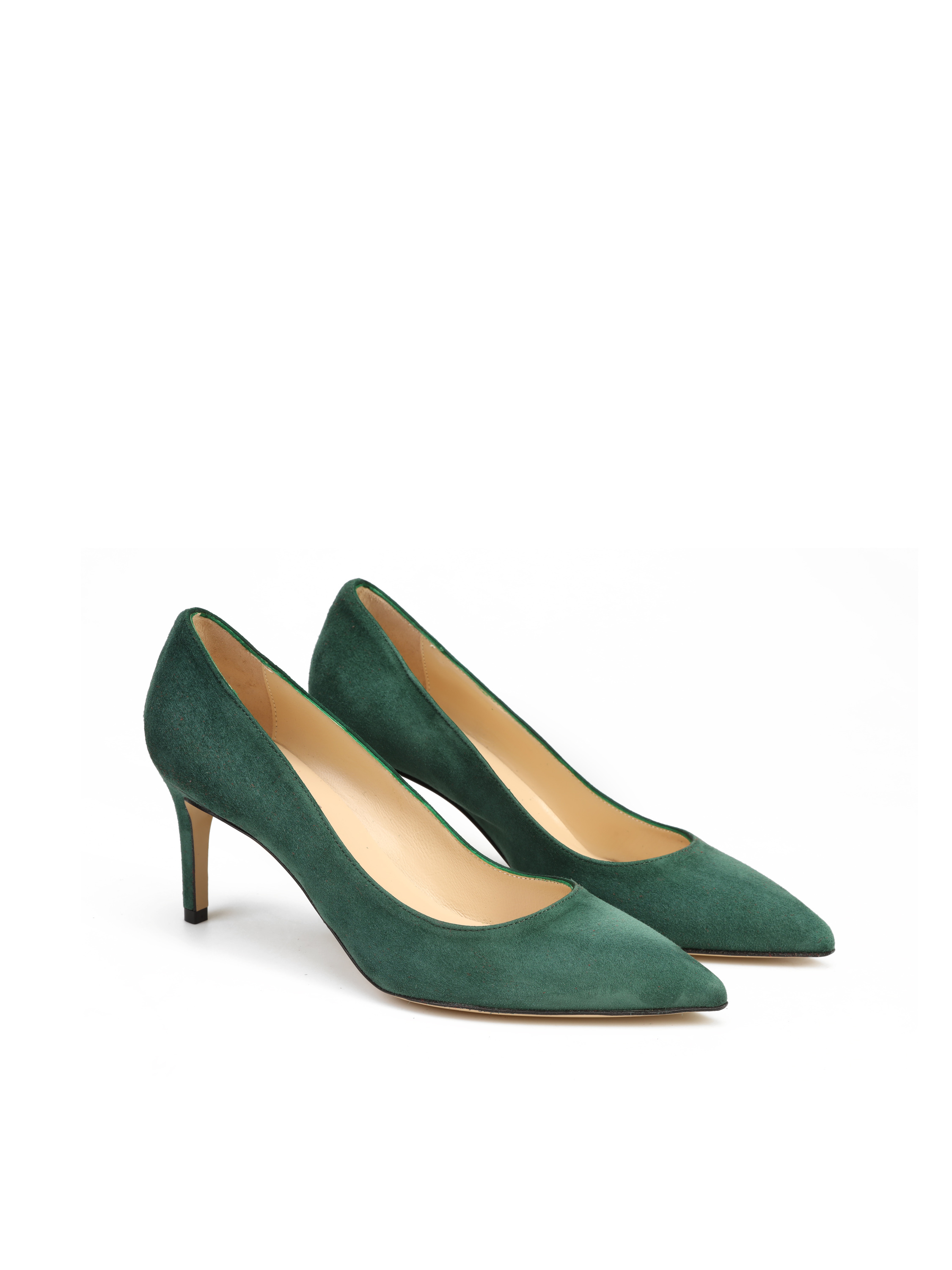 Szpilki w szpic wykonane są z włoskiej, zamszowej skóry. Cholewka w modnym kolorze zieleni. Wygodny obcas na szpilce w połączeniu ze skórzaną wkładką zapewnią komfort podczas użytkowania obuwia.