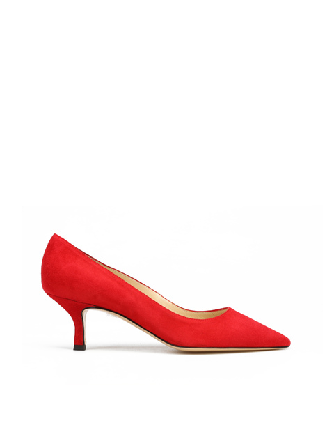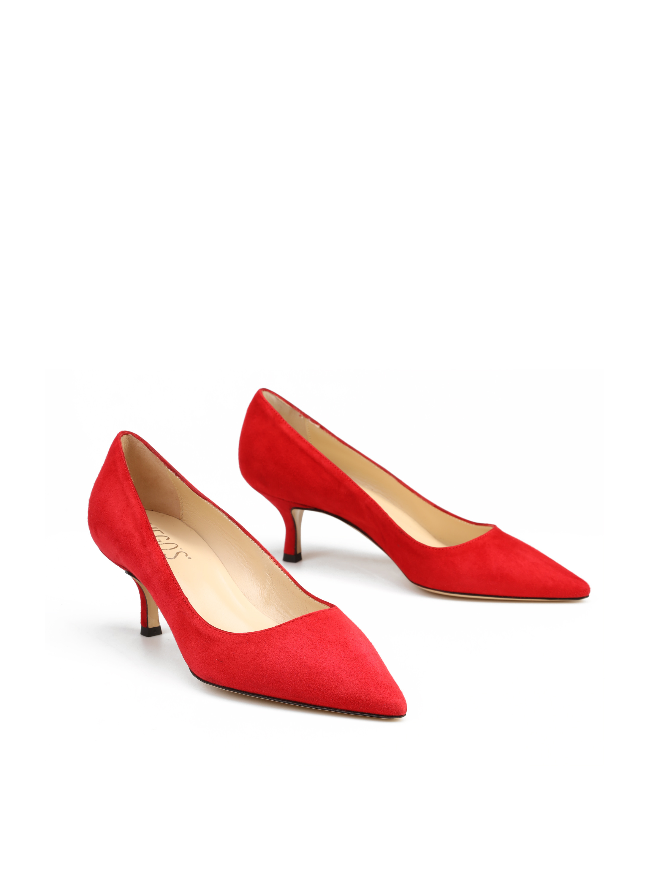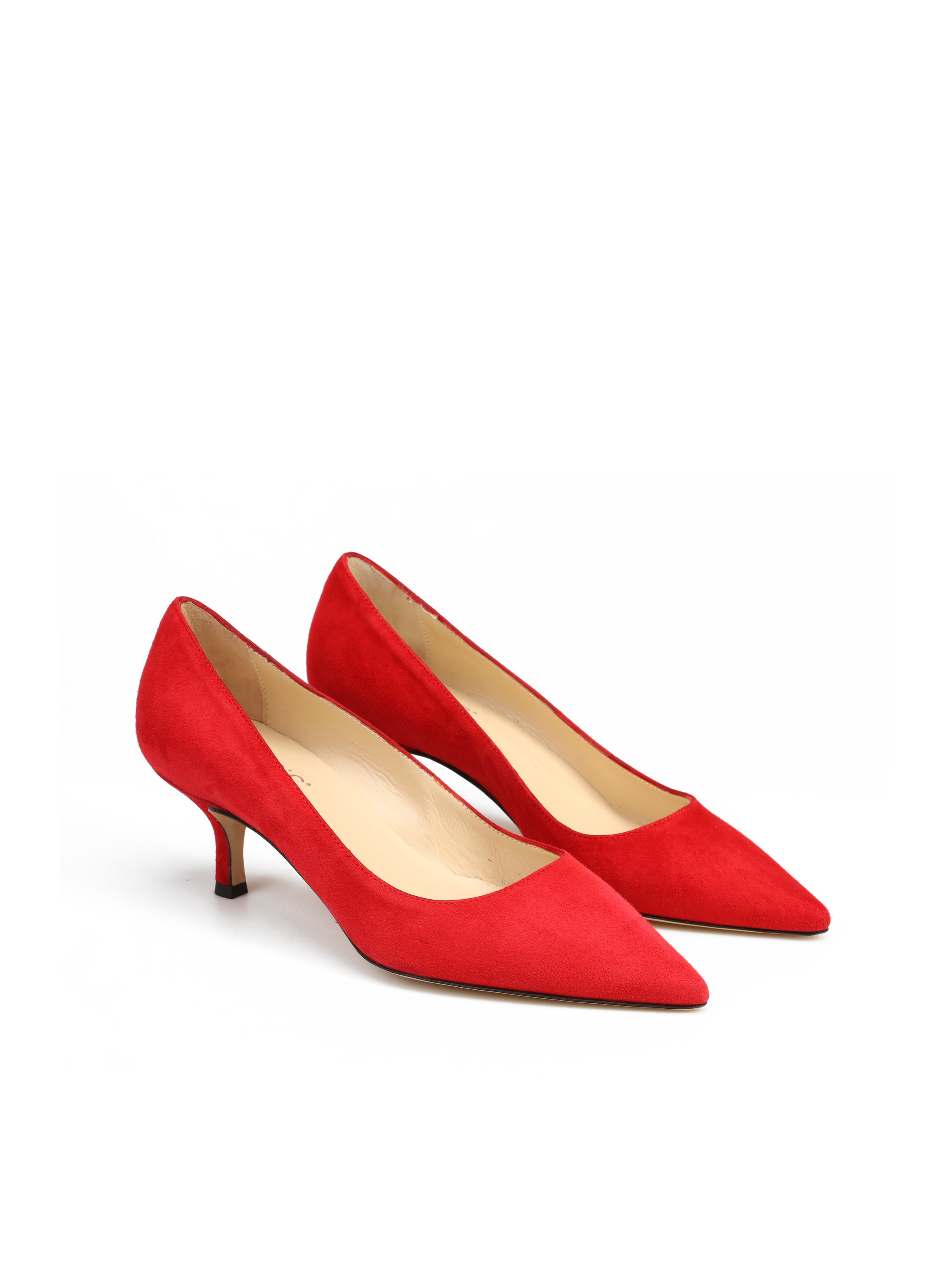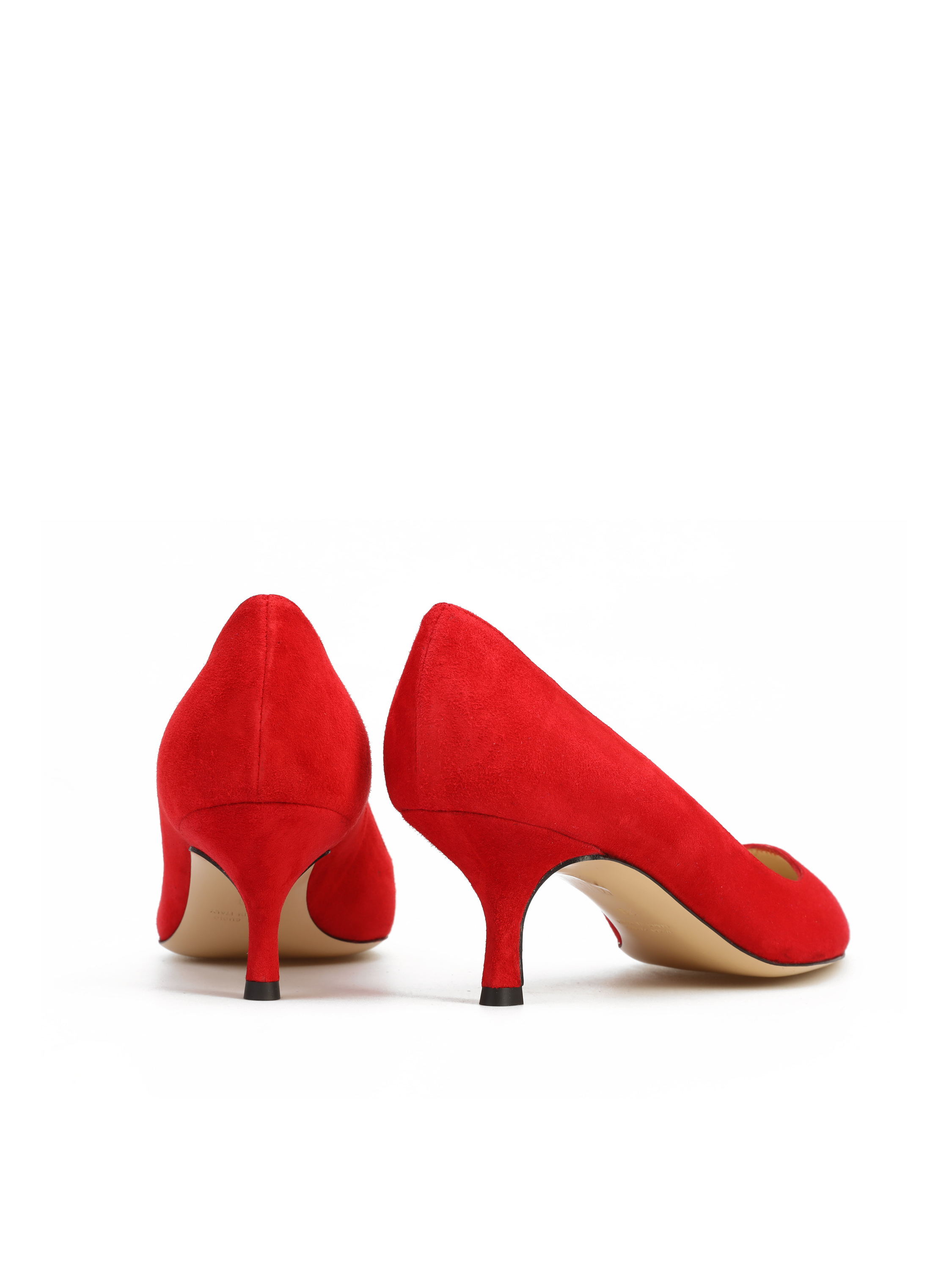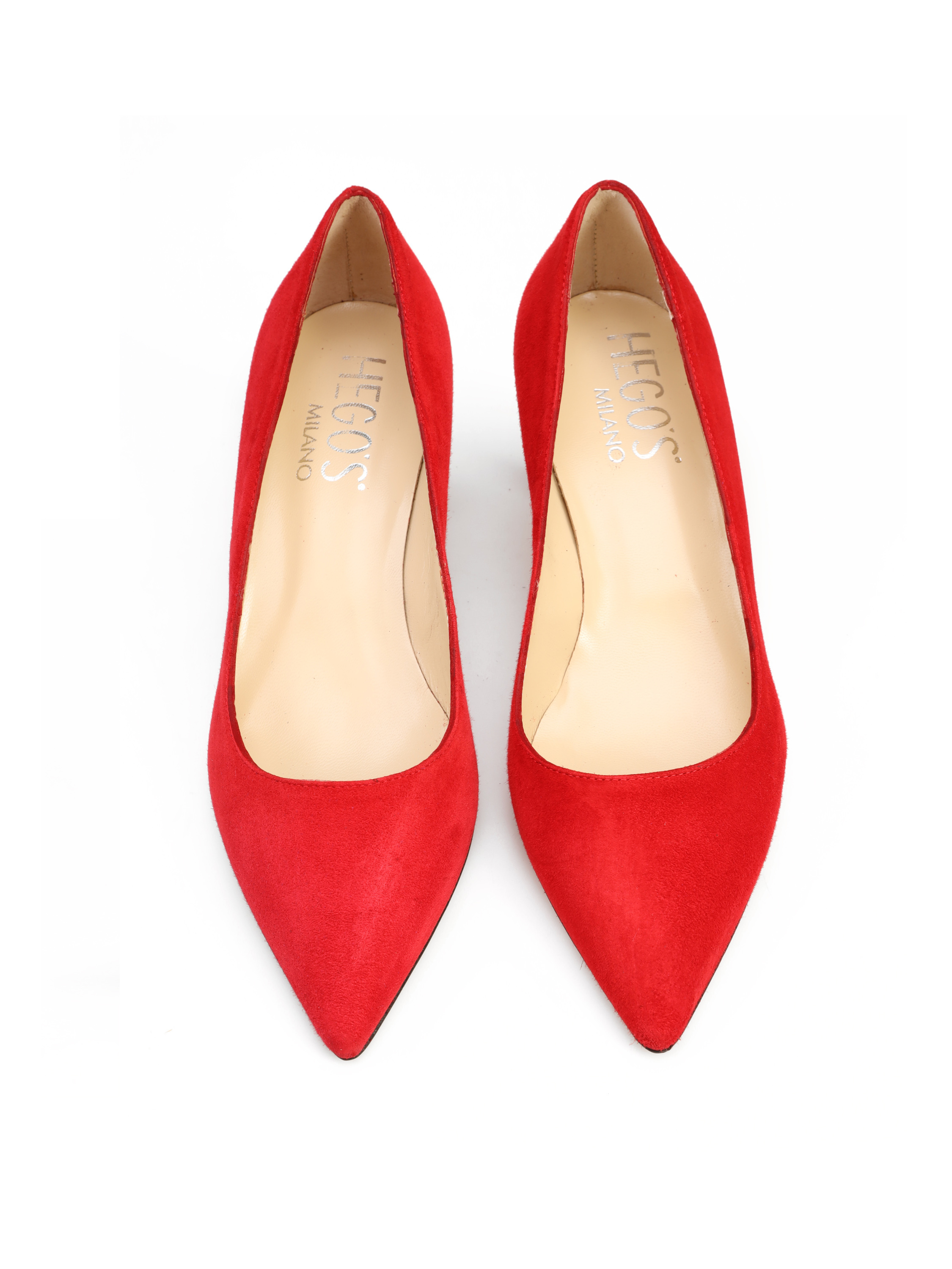 Szpilki w szpic wykonane są z włoskiej, zamszowej skóry. Cholewka w modnym, czerwonym kolorze. Wygodny obcas na szpilce w połączeniu ze skórzaną wkładką zapewnią komfort podczas użytkowania obuwia.