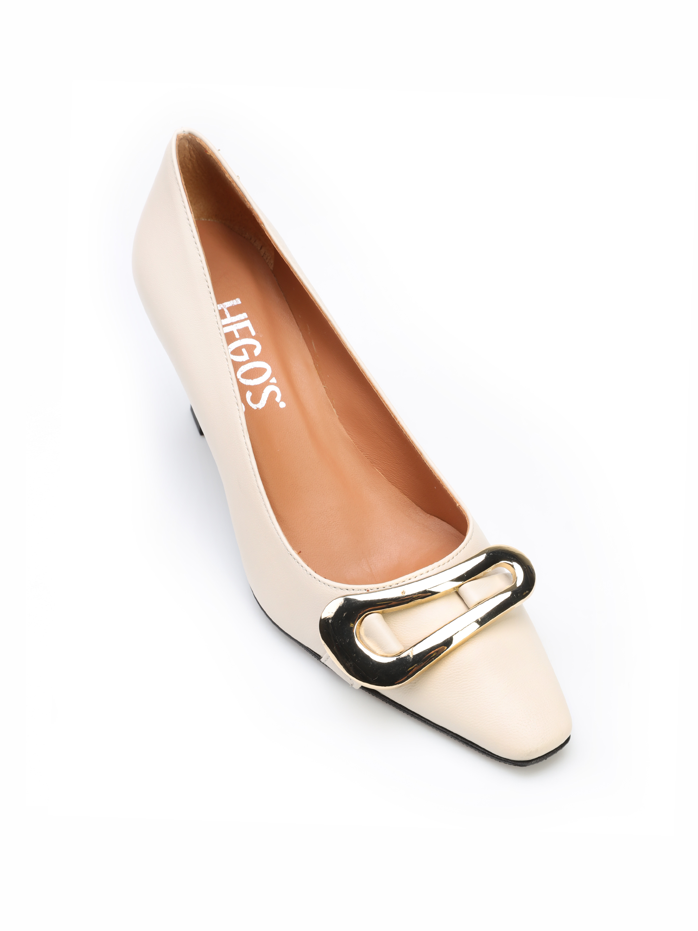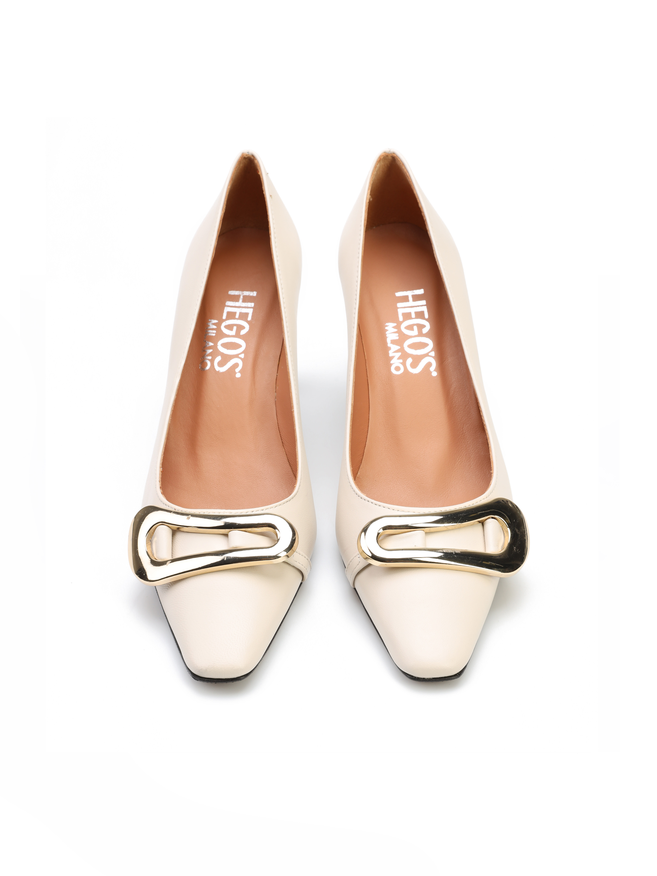 Klasyczne szpilki wykonane są z włoskiej, naturalnej skóry. Cholewka w kremowym kolorze ozdobiona została złotą broszką. Model ze sciętym noskiem i stabilnym obcasem na szpilce.
