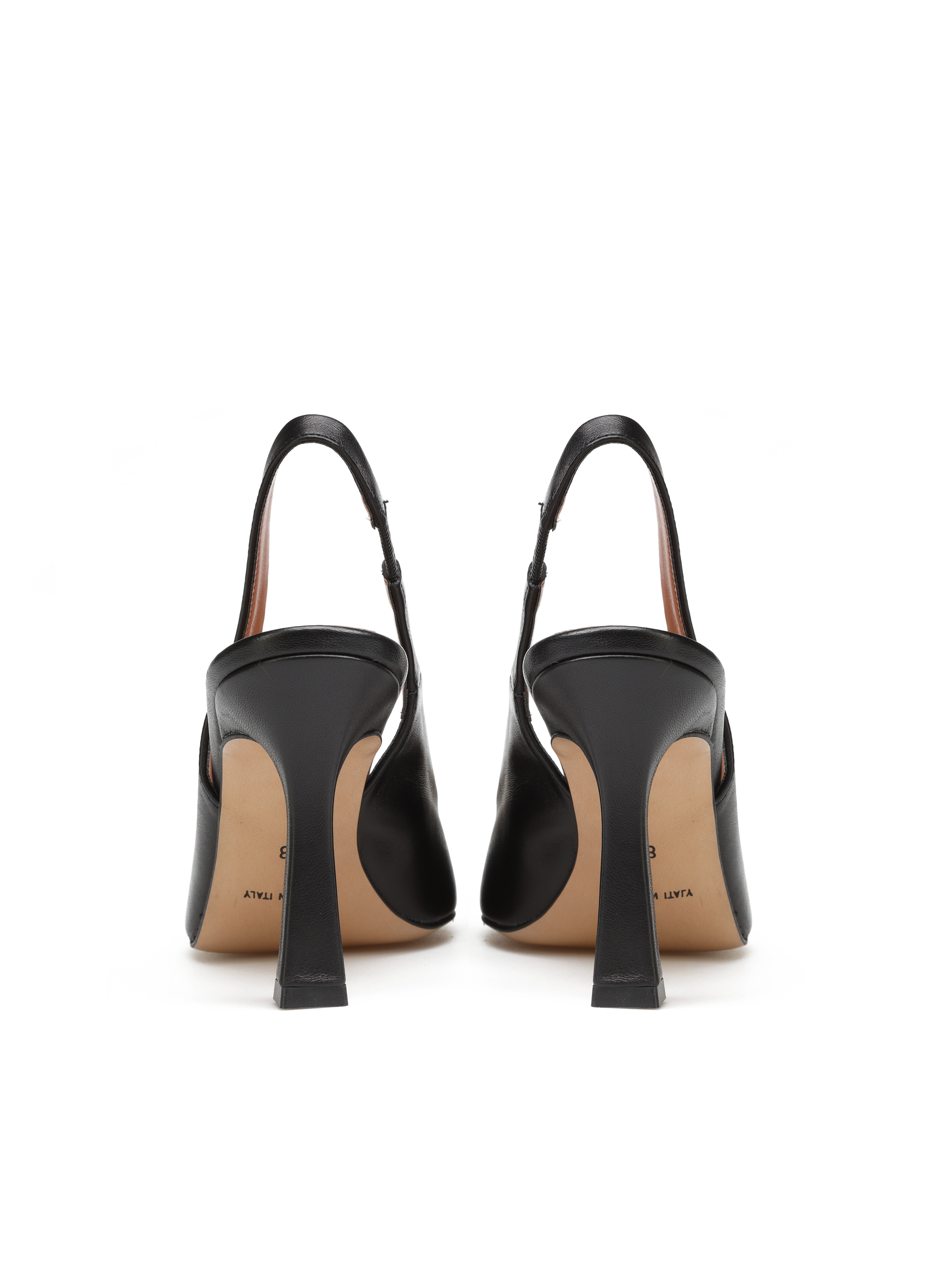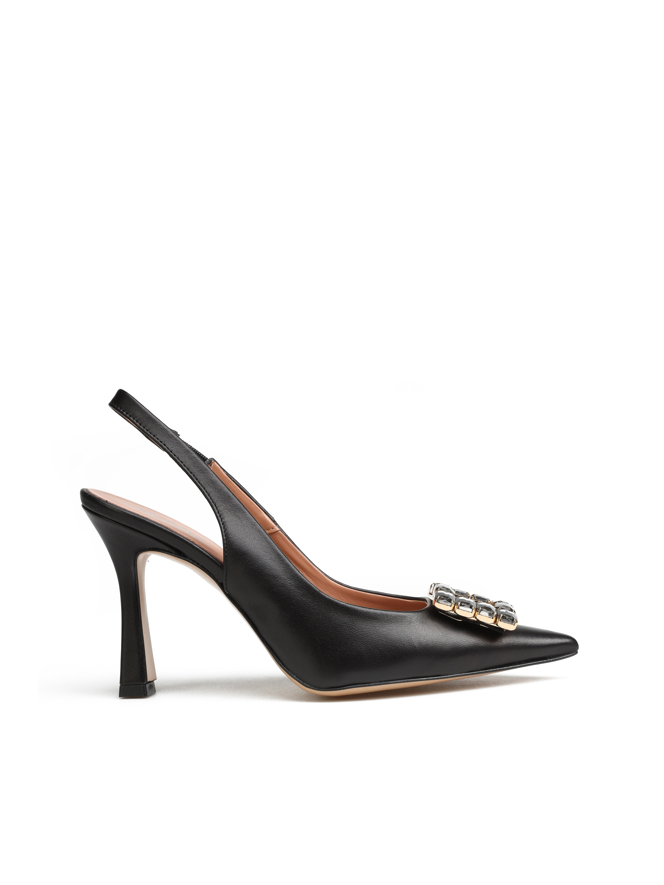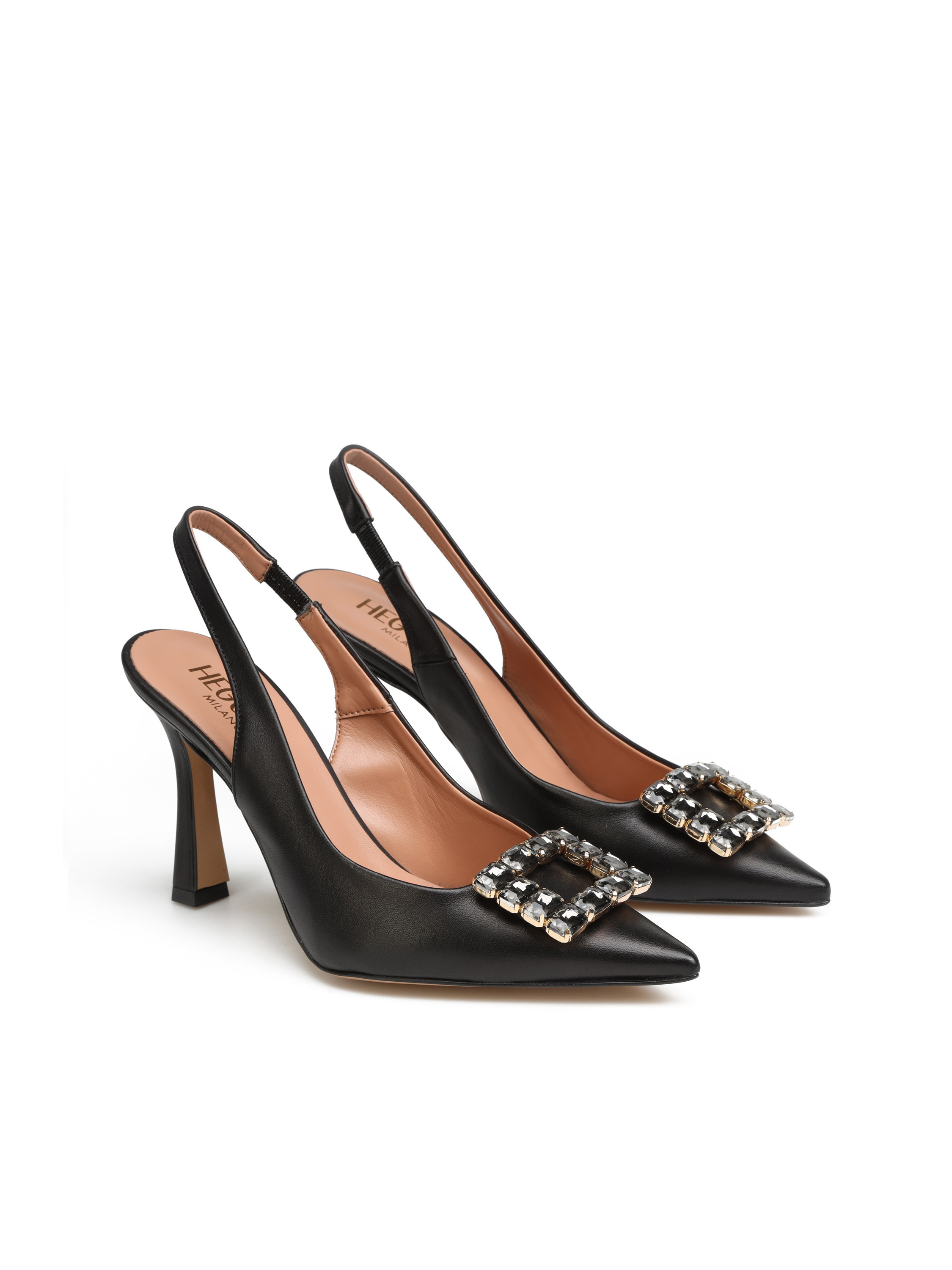 Szpilki z odkrytą piętą HEGO'S Milano to model prosto z włoskich ulic. Cholewka w czarnym kolorze wykonana jest z naturalnej skóry. Wzbogacona została o biżuteryjną broszkę z kamieni. Nosek w szpic wpisuje się nie tylko w obecne Trendy. Wygodna, wszyta gumka na pięcie pozwala dopasować obuwie do stopy. Skórzana wkładka w połączeniu ze stabilnym obcasem na szpilce to komfort i wygoda na co dzień.