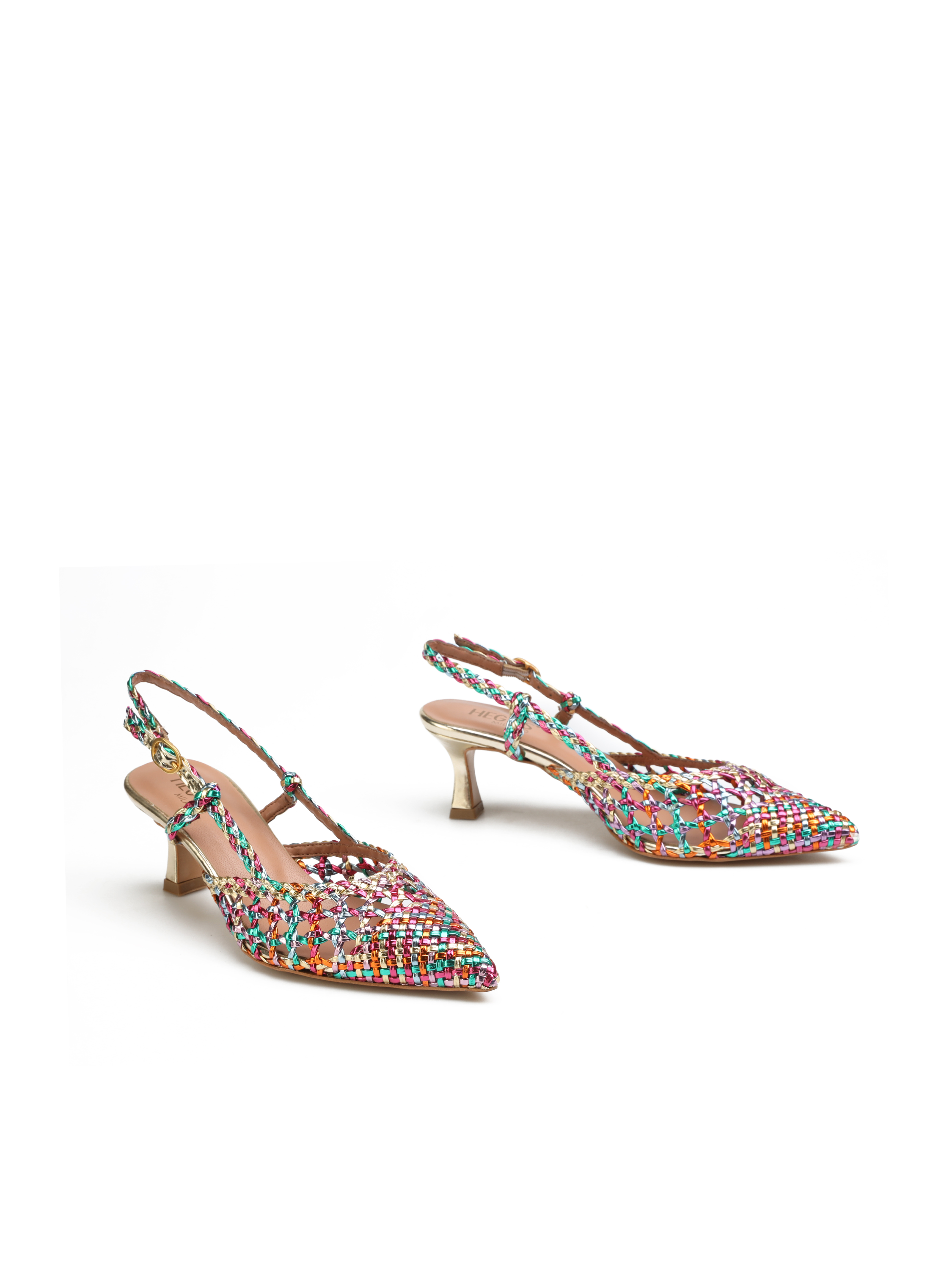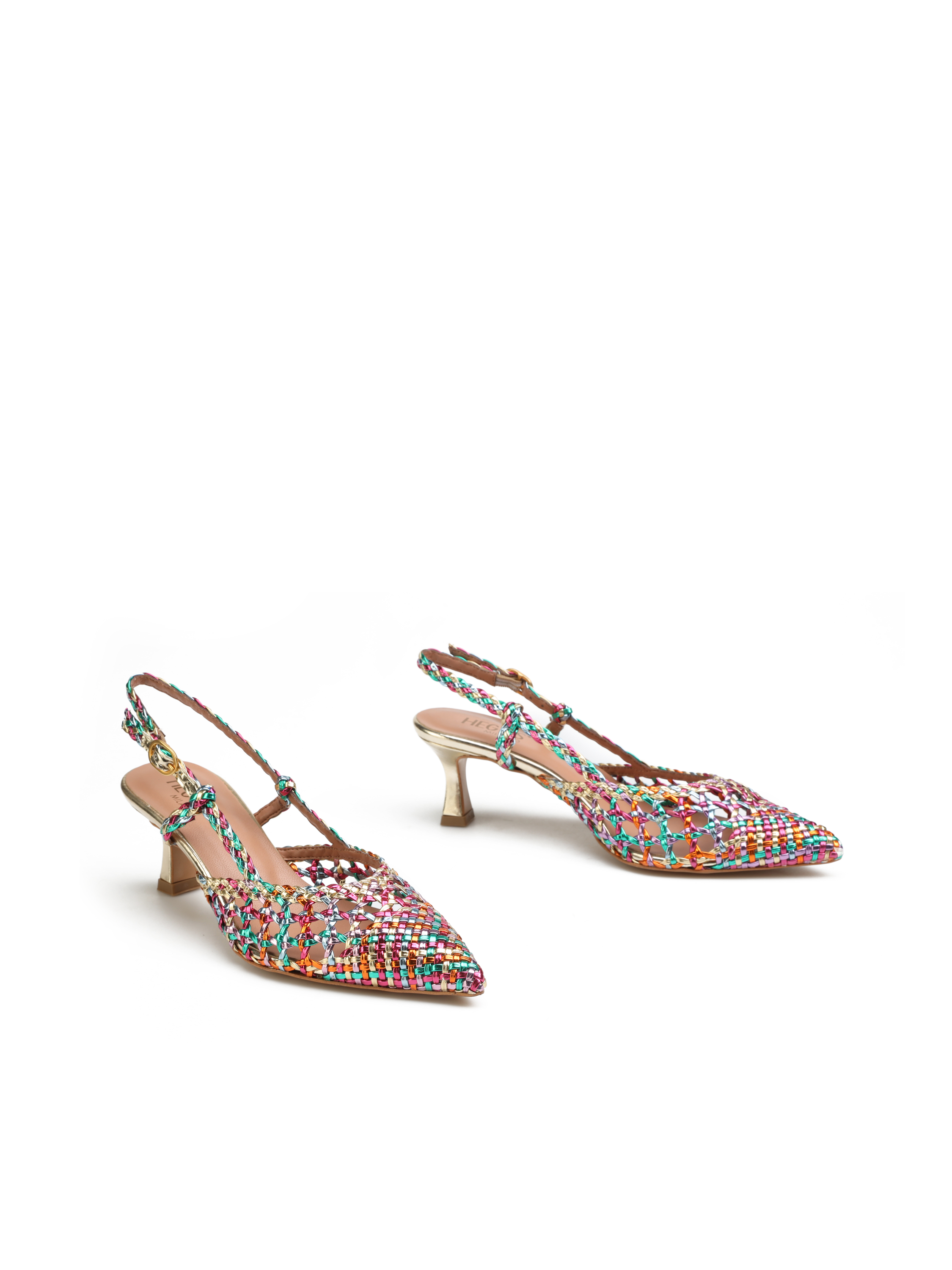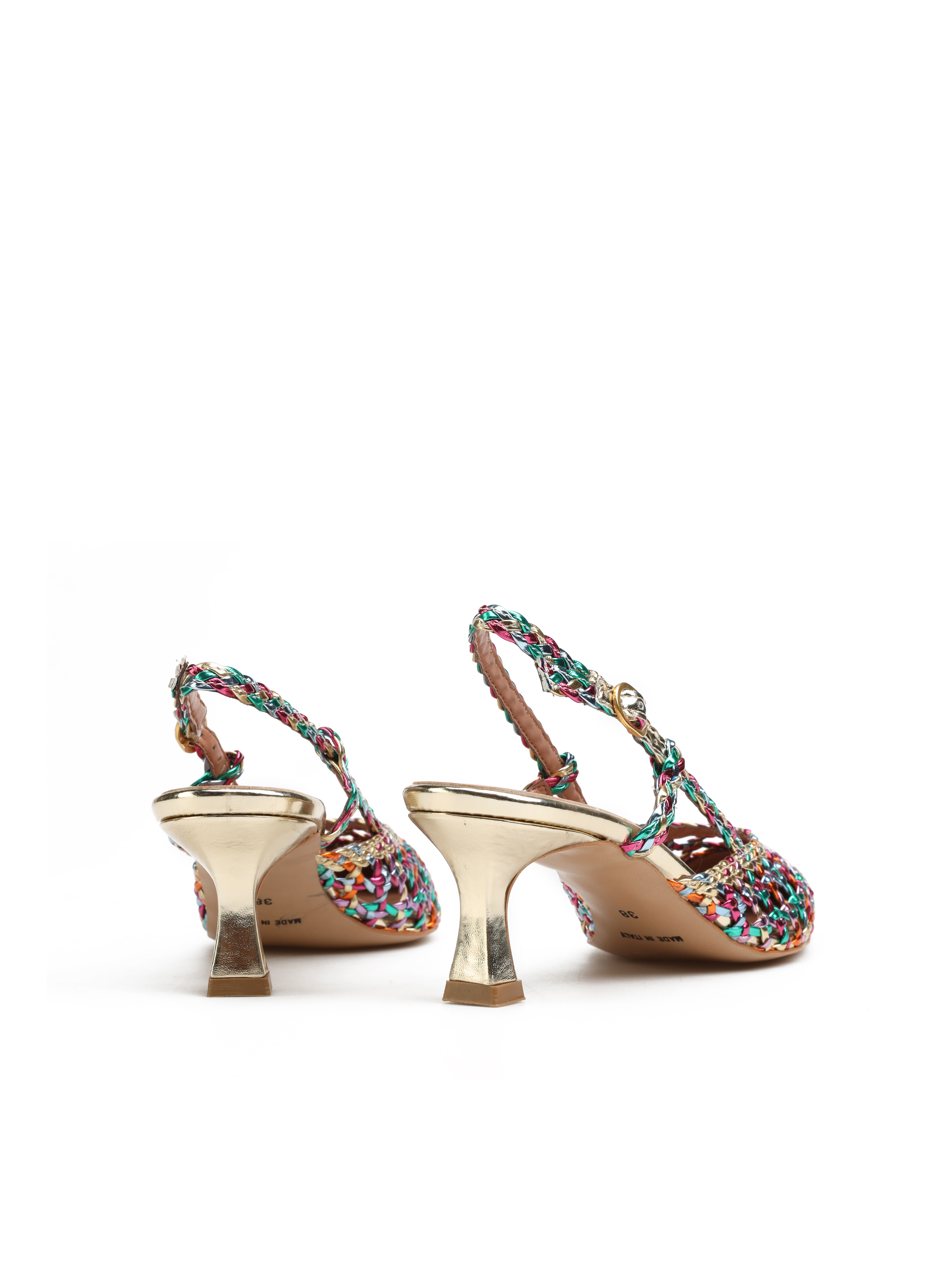 Szpilki z odkrytą piętą to model dla kobiet ceniących wygodę i najnowsze Trendy. Pleciona, metaliczna cholewka oraz nosek w szpic to must have sezonu. Niski, wygodny obcas zapewnia komfort podczas użytkowania obuwia. Model zapinany regulowanym paskiem na sprzączkę.