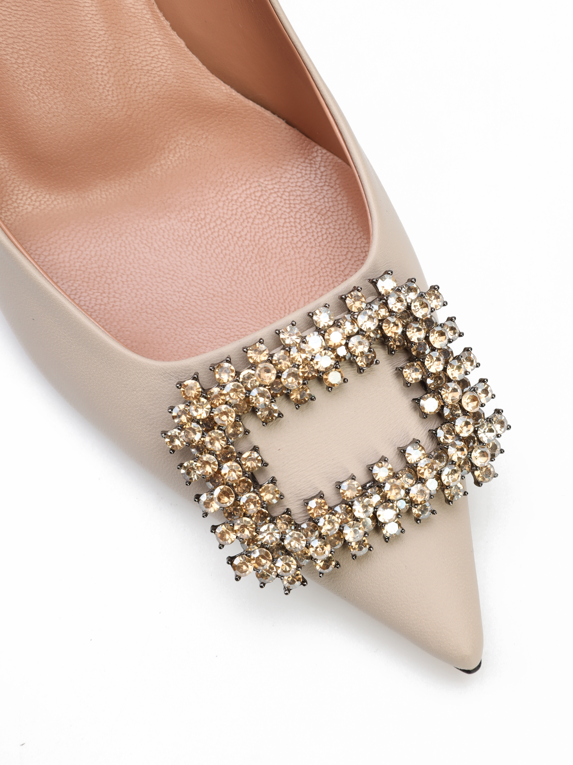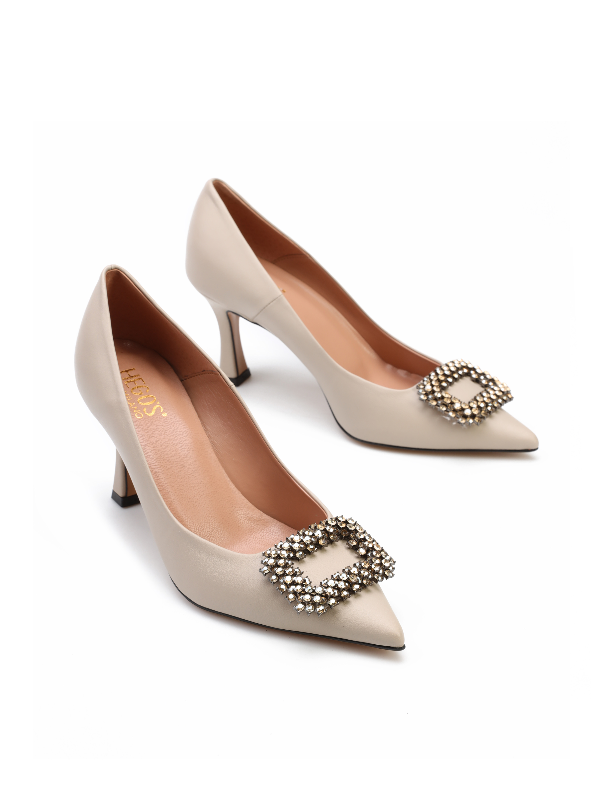 Szpilki w szpic to klasyka w eleganckim wydaniu. Cholewka w kremowym kolorze wykonana jest z włoskiej, naturalnej skóry. Wzbogacona została o biżuteryjną broszkę z kamieni. Model osadzony na stabilnym obcasie na szpilce. Stylowe, będą ozdobą Twoich stylizacji.