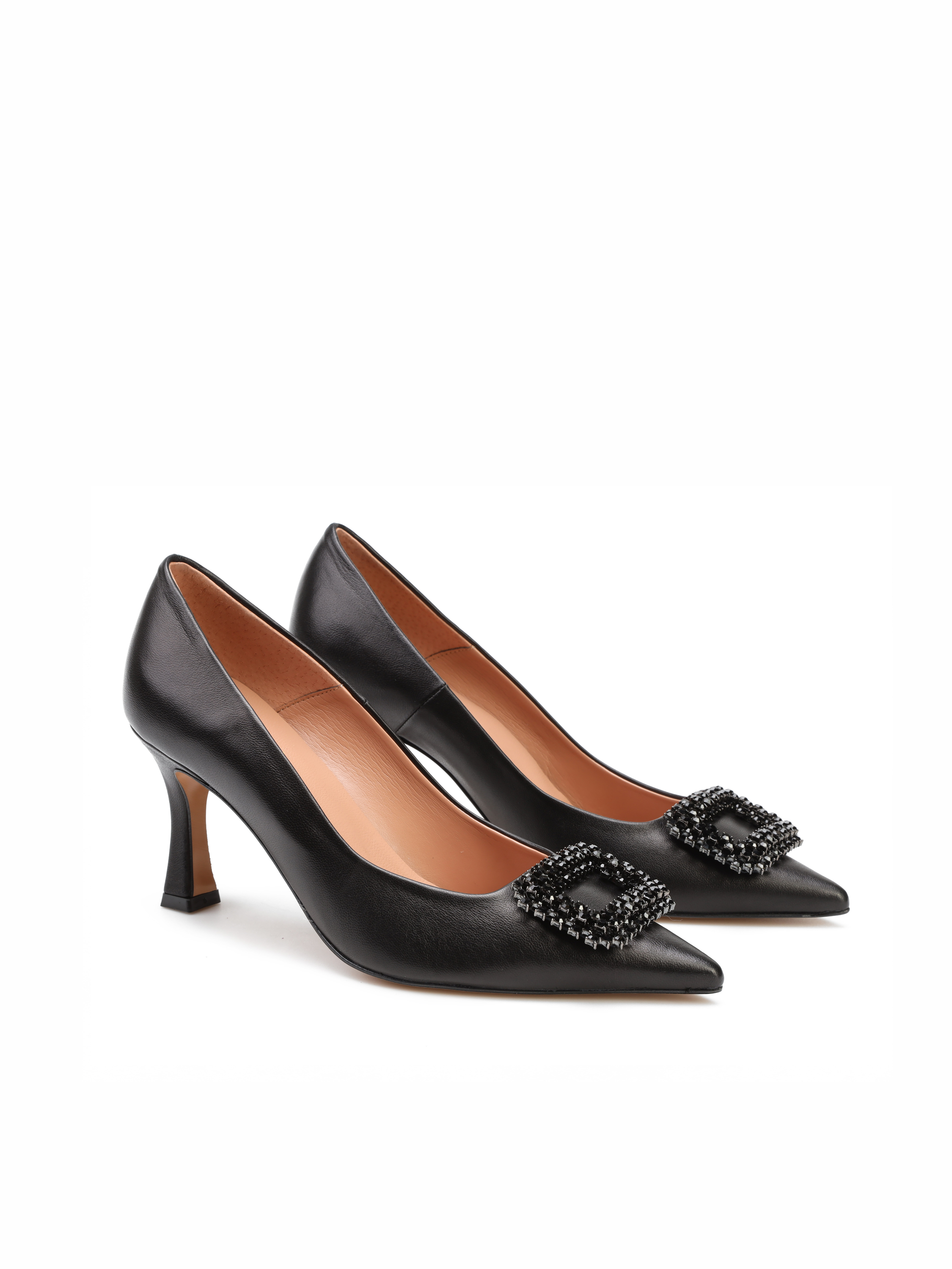 Szpilki w szpic to klasyka w eleganckim wydaniu. Cholewka w czarnym kolorze wykonana jest z włoskiej, naturalnej skóry. Wzbogacona została o biżuteryjną broszkę z kamieni. Model osadzony na stabilnym obcasie na szpilce. Stylowe, będą ozdobą Twoich stylizacji.