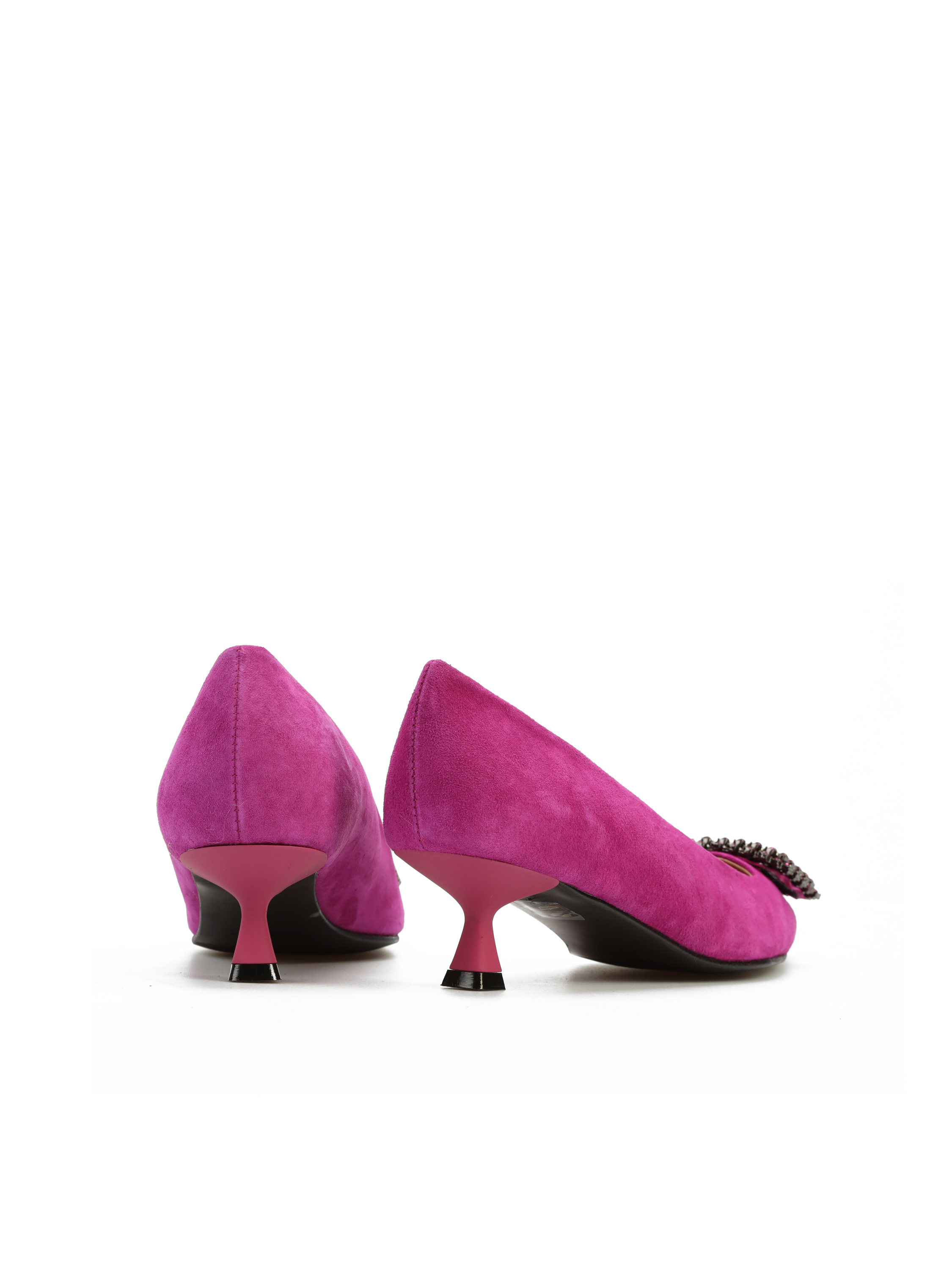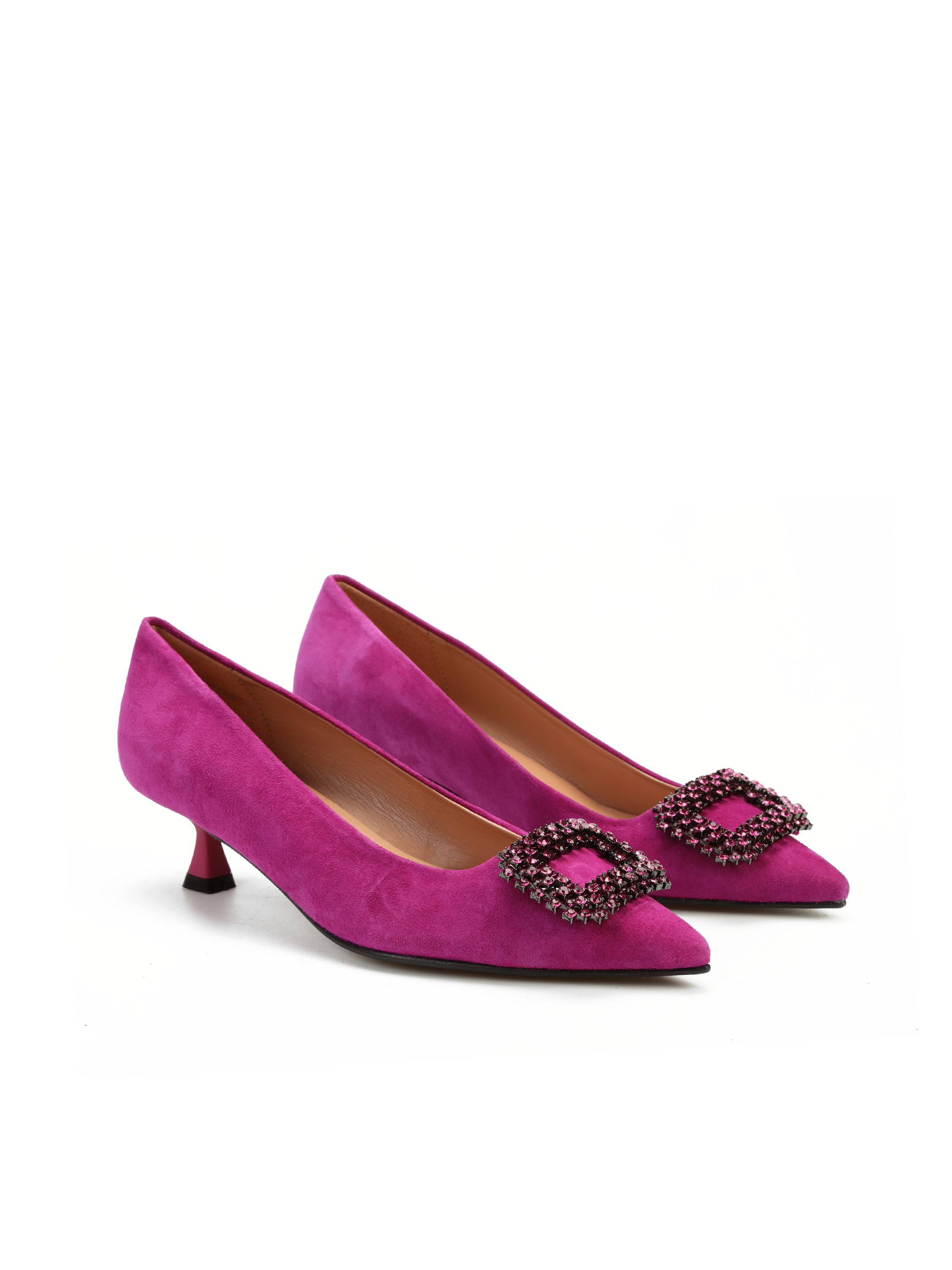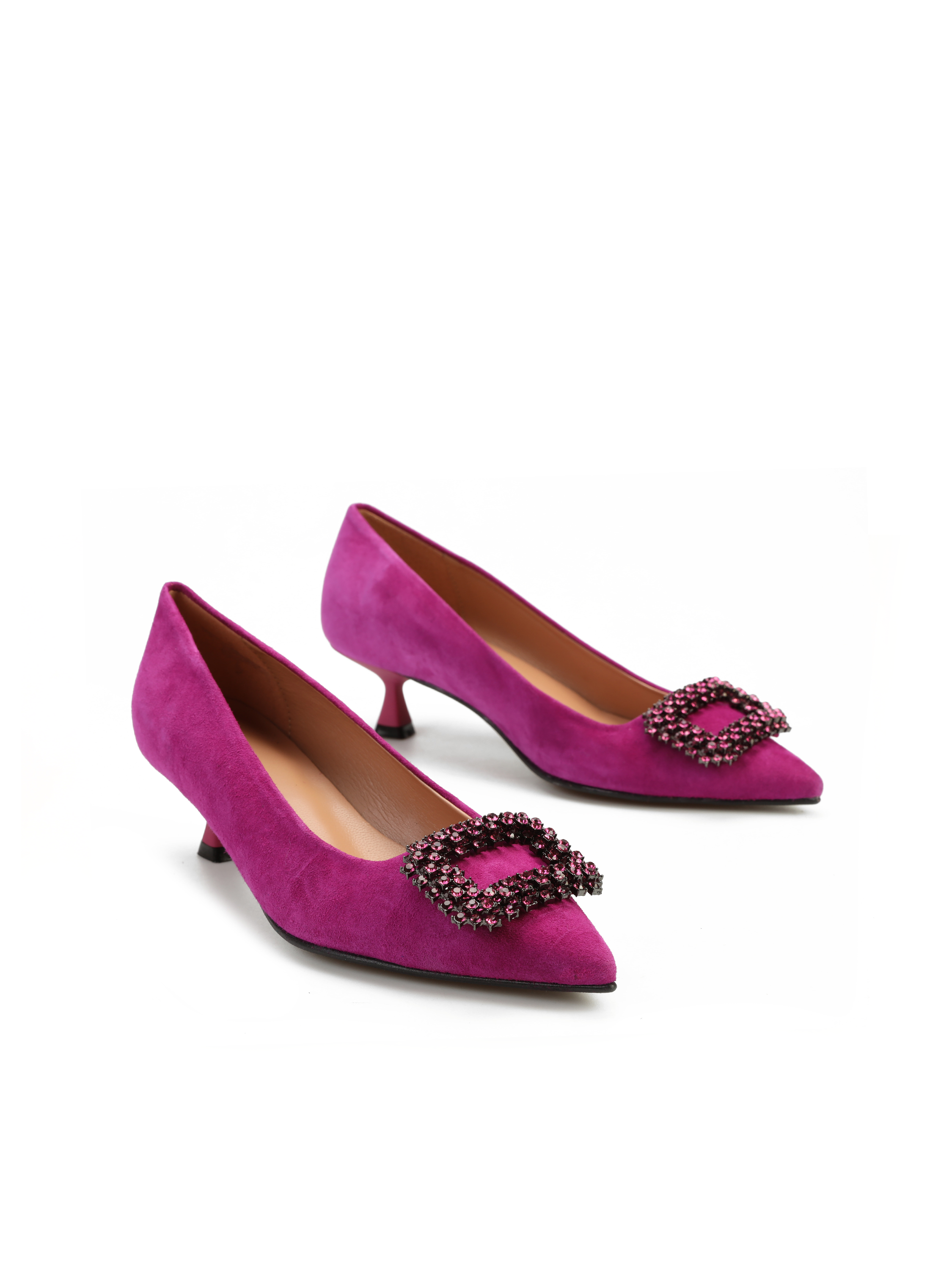 Szpilki w szpic to model prosto z włoskich ulic. Cholewka w modnym, fuksjowym kolorze wykonana jest zamszowej skóry. Wzbogacona została o biżuteryjną broszkę z kamieni. Stylowe i eleganckie będą ozdobą Twoich stylizacji.