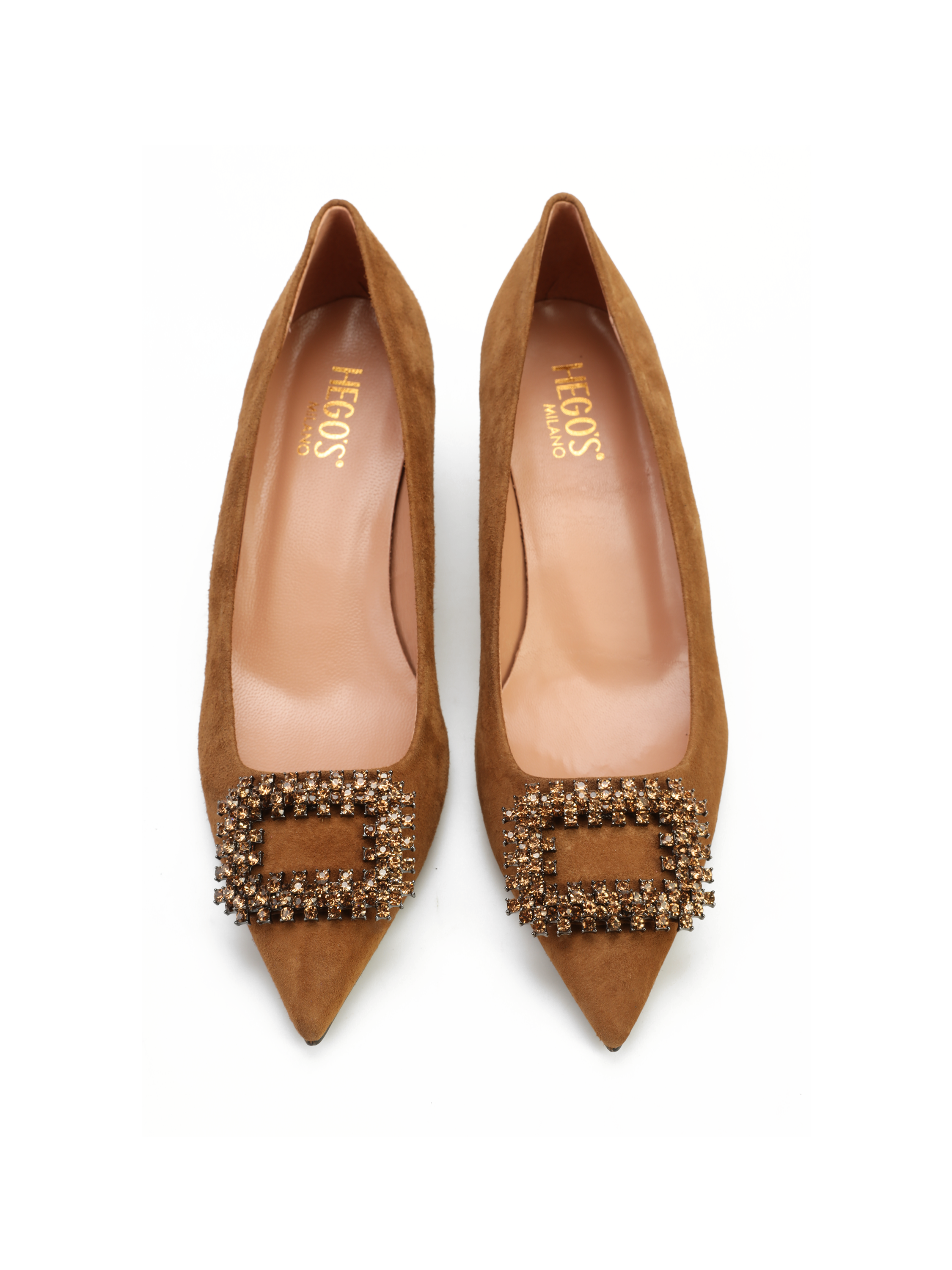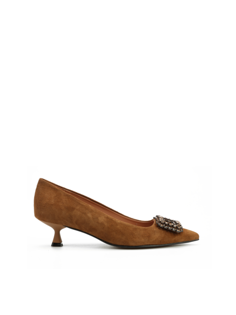 Szpilki w szpic to model prosto z włoskich ulic. Cholewka w beżowym kolorze wykonana jest zamszowej skóry. Wzbogacona została o biżuteryjną broszkę z kamieni. Stylowe i eleganckie będą ozdobą Twoich stylizacji.
