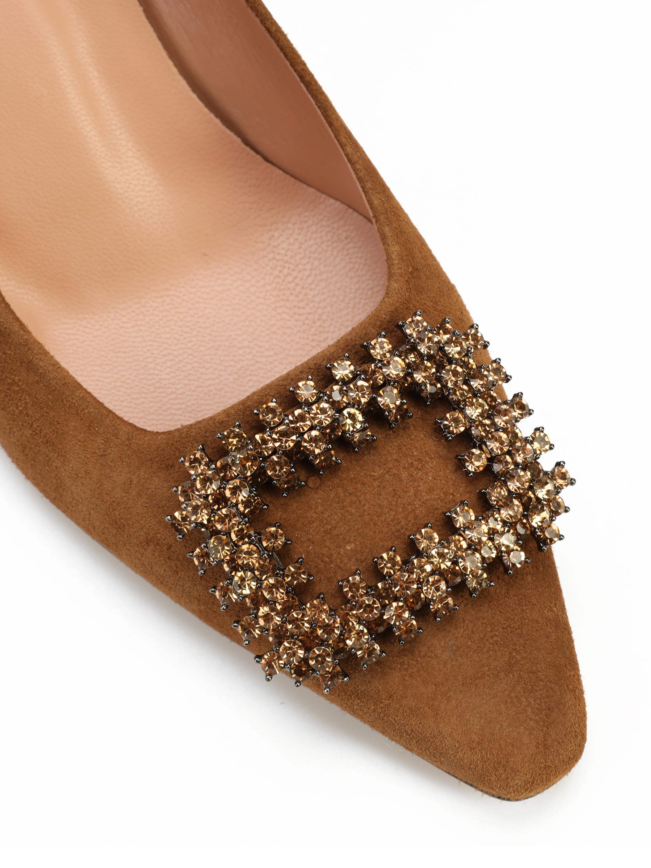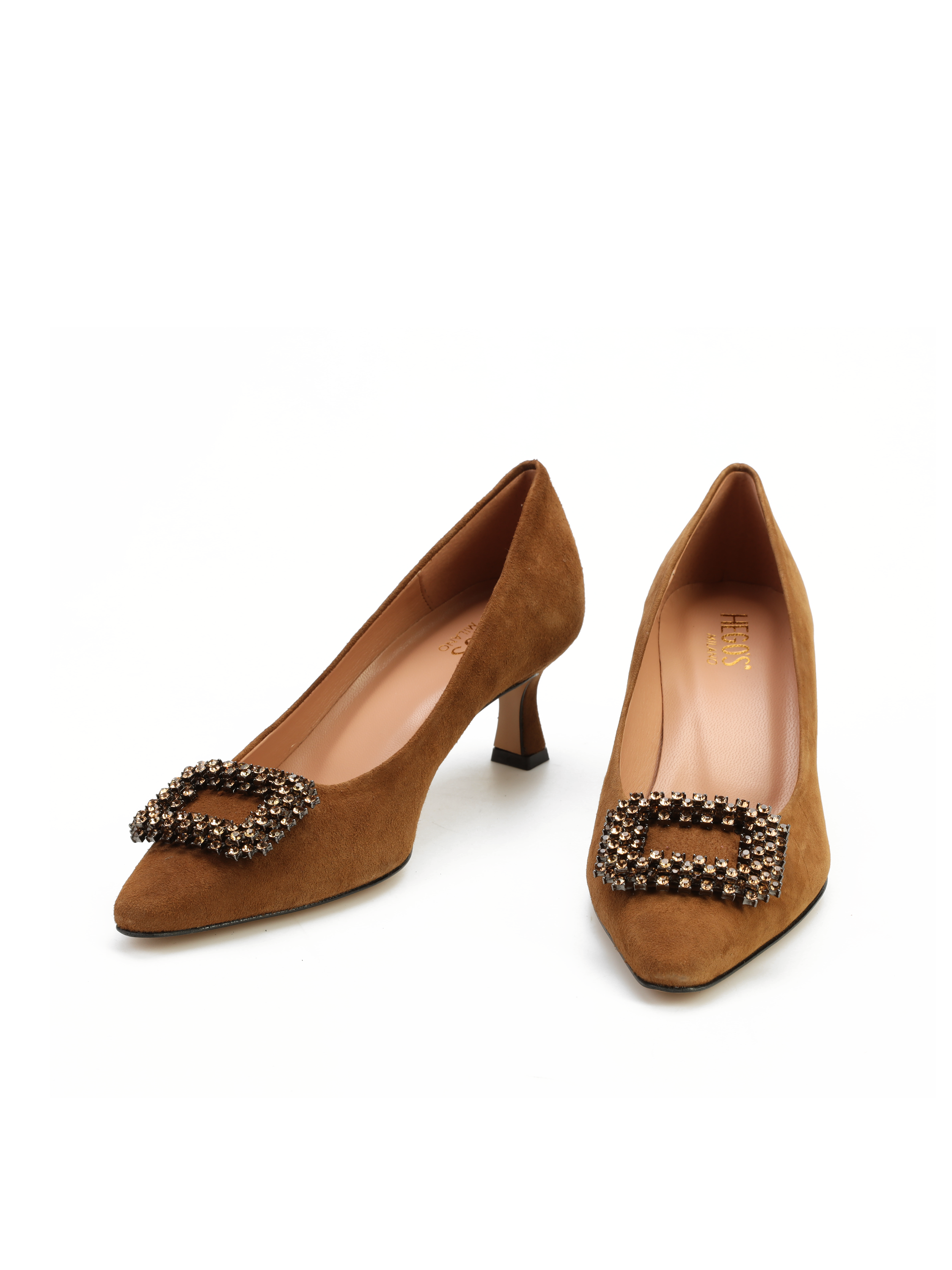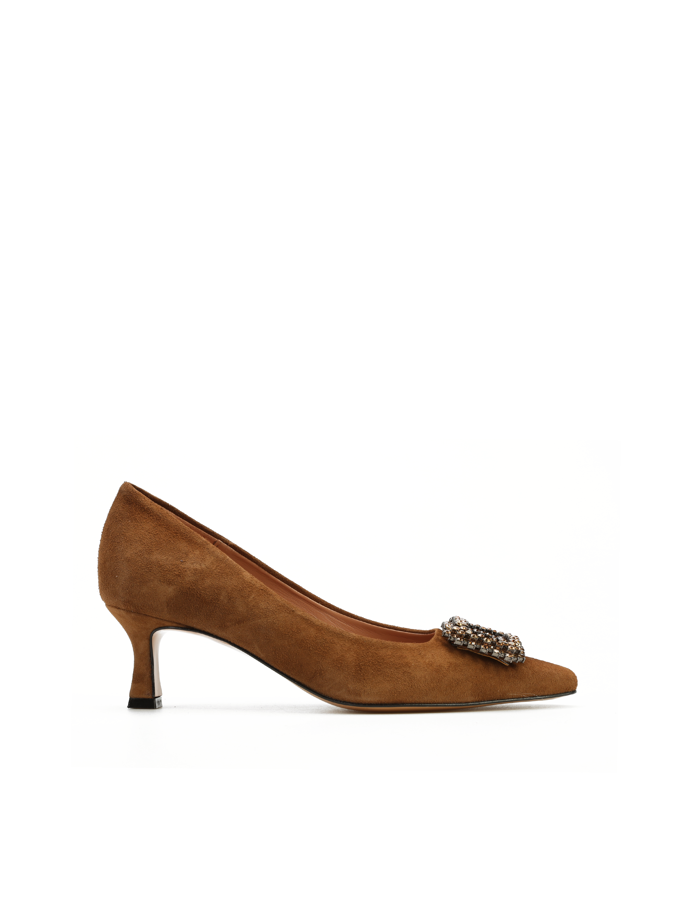 Szpilki w szpic to model prosto z włoskich ulic. Cholewka w rudym kolorze wykonana jest zamszowej skóry. Wzbogacona została o biżuteryjną broszkę z kamieni. Model osadzony na stabilnym obcasie na szpilce. Stylowe i eleganckie będą ozdobą Twoich stylizacji.