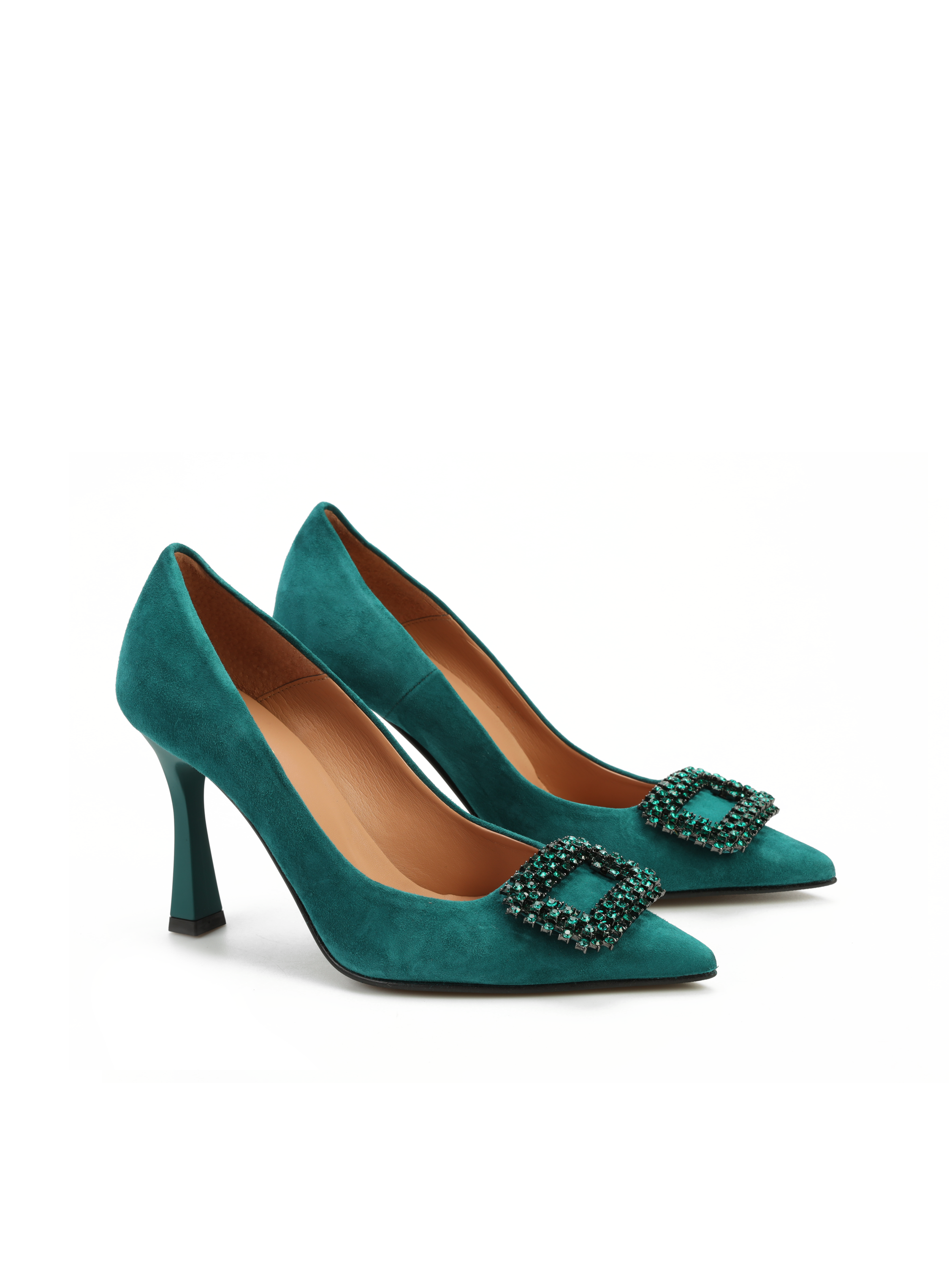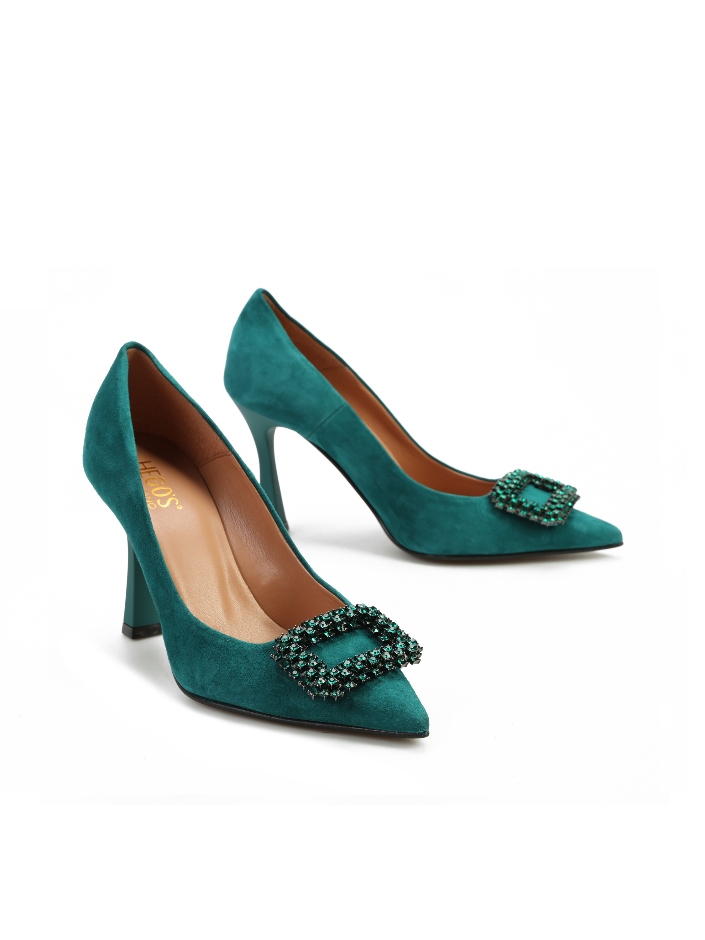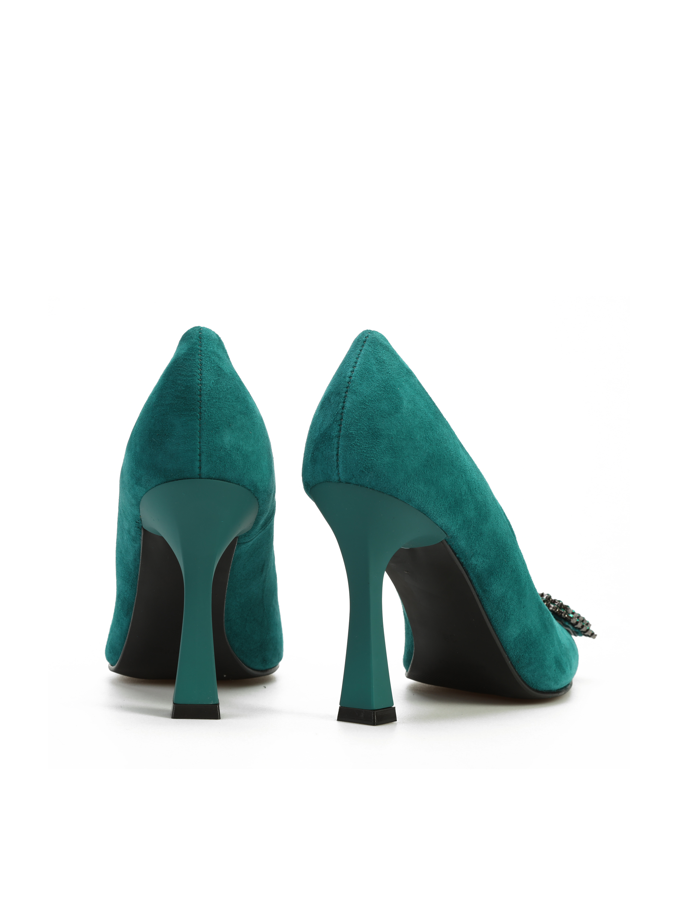 Szpilki w szpic to model prosto z włoskich ulic. Cholewka w modnym, turkusowym kolorze wykonana jest zamszowej skóry. Wzbogacona została o biżuteryjną broszkę z kamieni. Model na wysokim, stabilnym obcasie na szpilce. Stylowe i eleganckie będą ozdobą Twoich stylizacji.