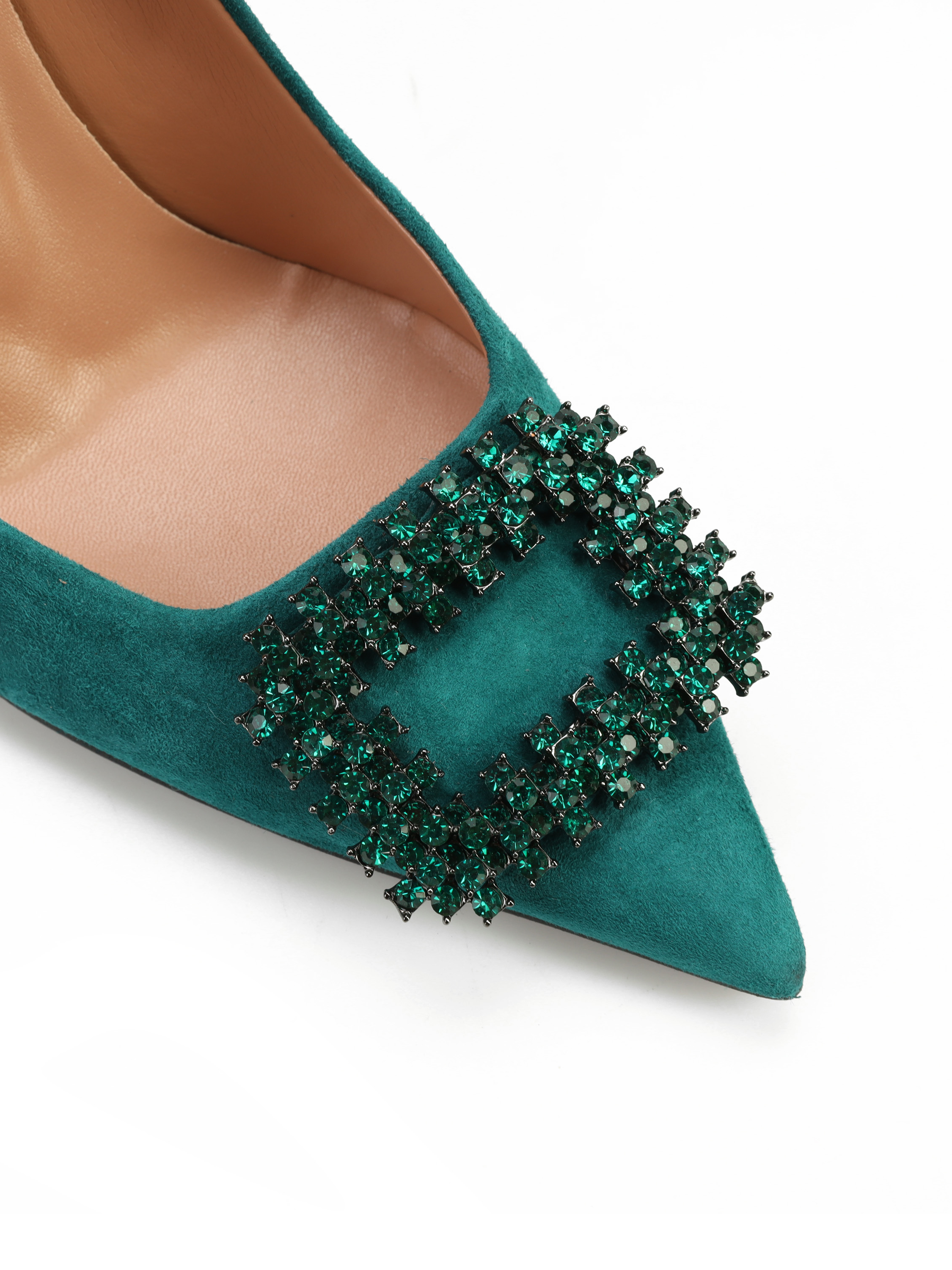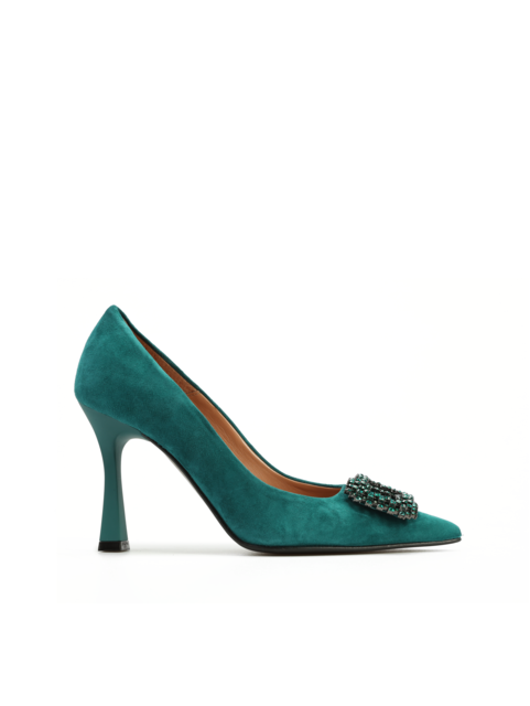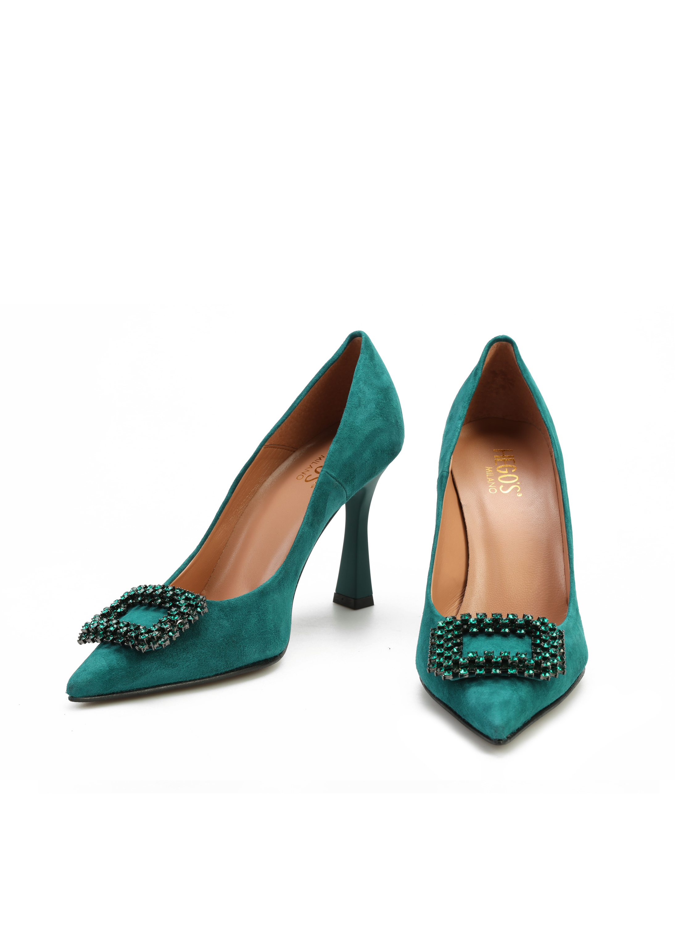 Szpilki w szpic to model prosto z włoskich ulic. Cholewka w modnym, turkusowym kolorze wykonana jest zamszowej skóry. Wzbogacona została o biżuteryjną broszkę z kamieni. Model na wysokim, stabilnym obcasie na szpilce. Stylowe i eleganckie będą ozdobą Twoich stylizacji.