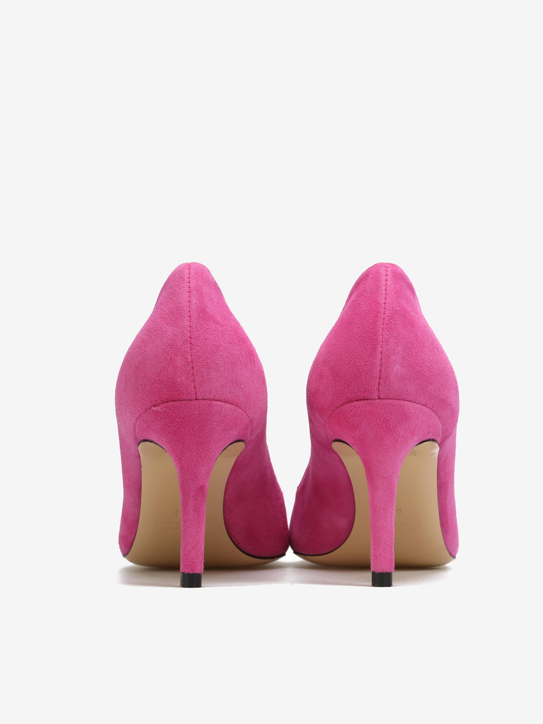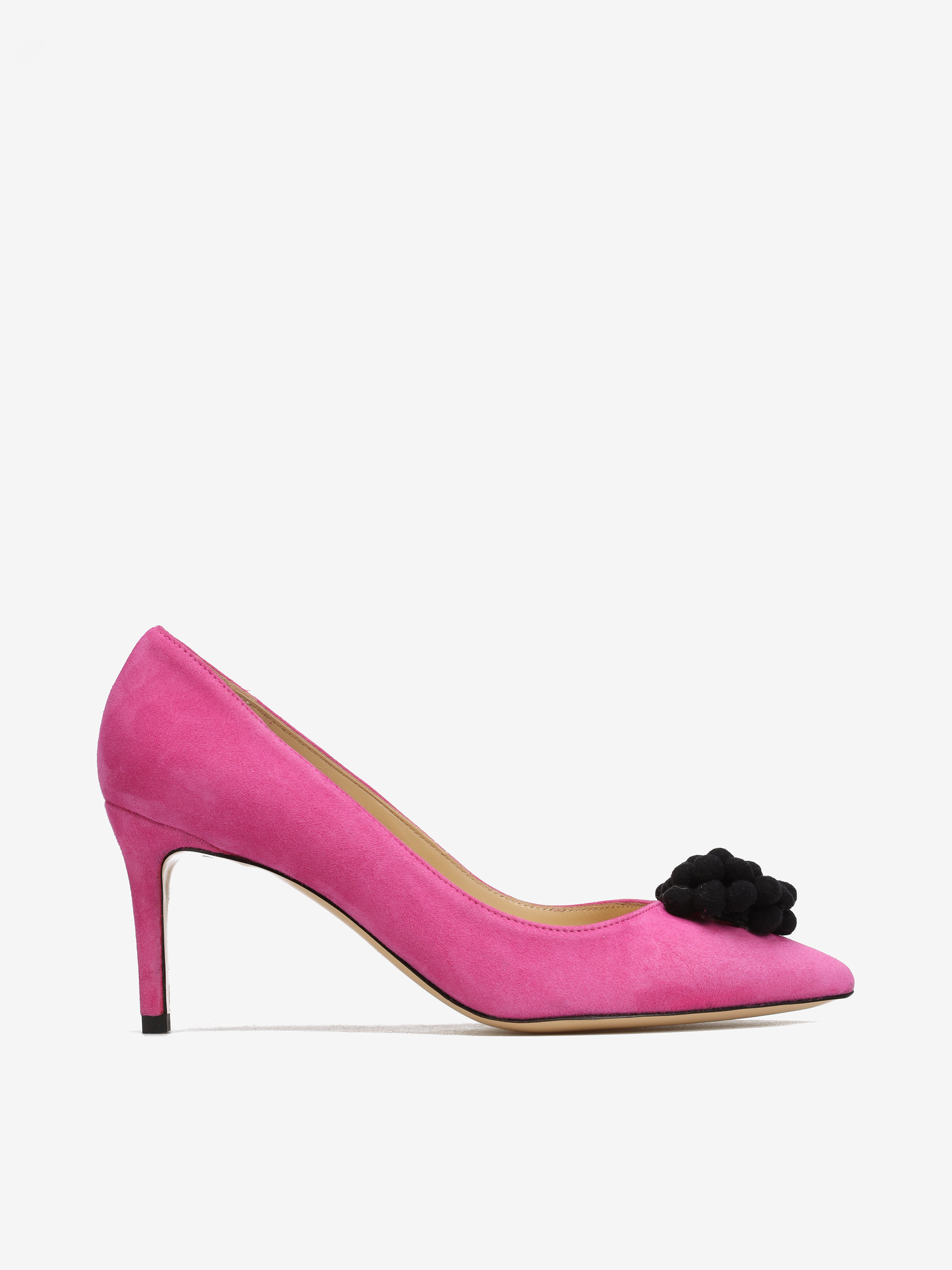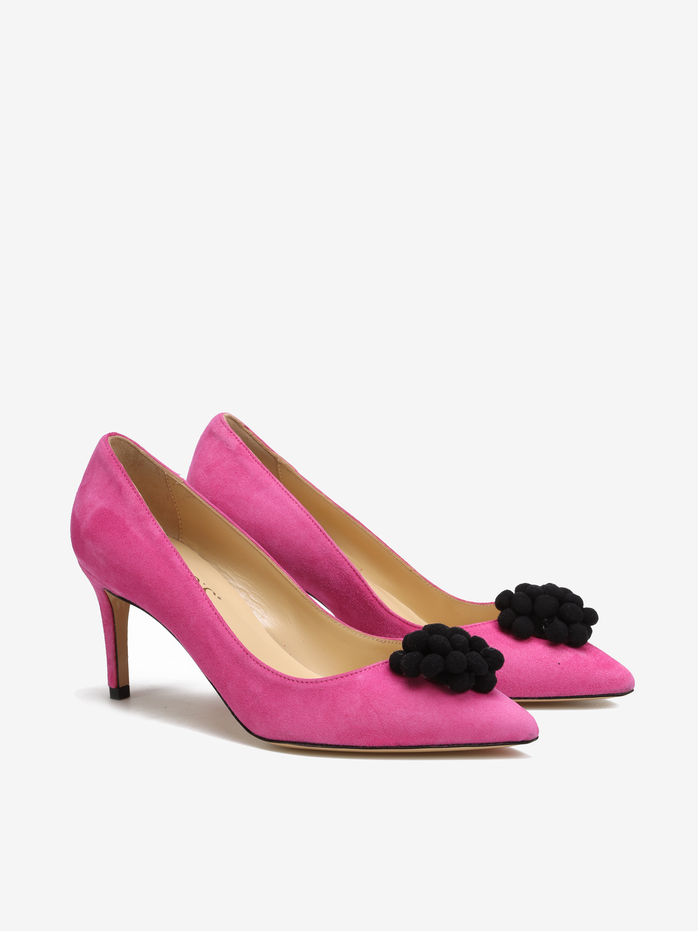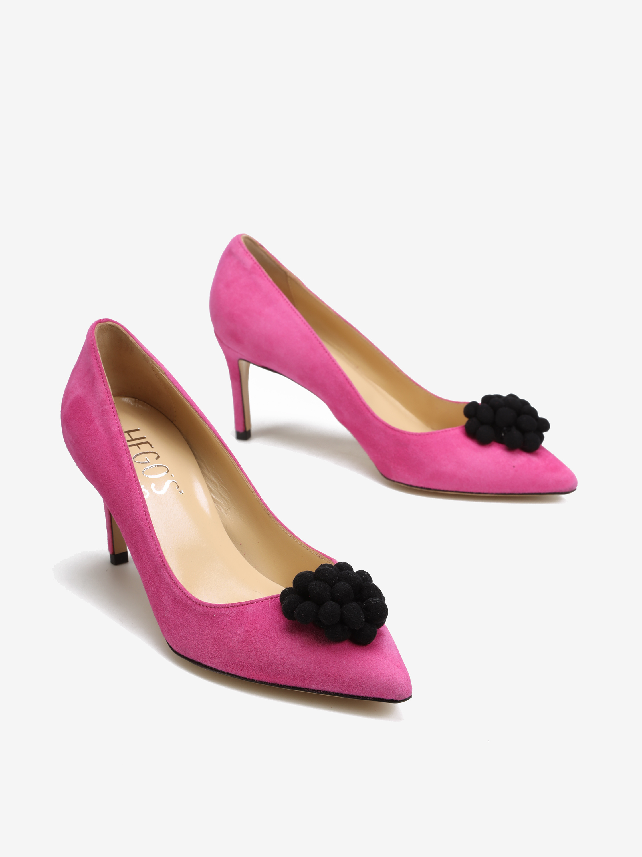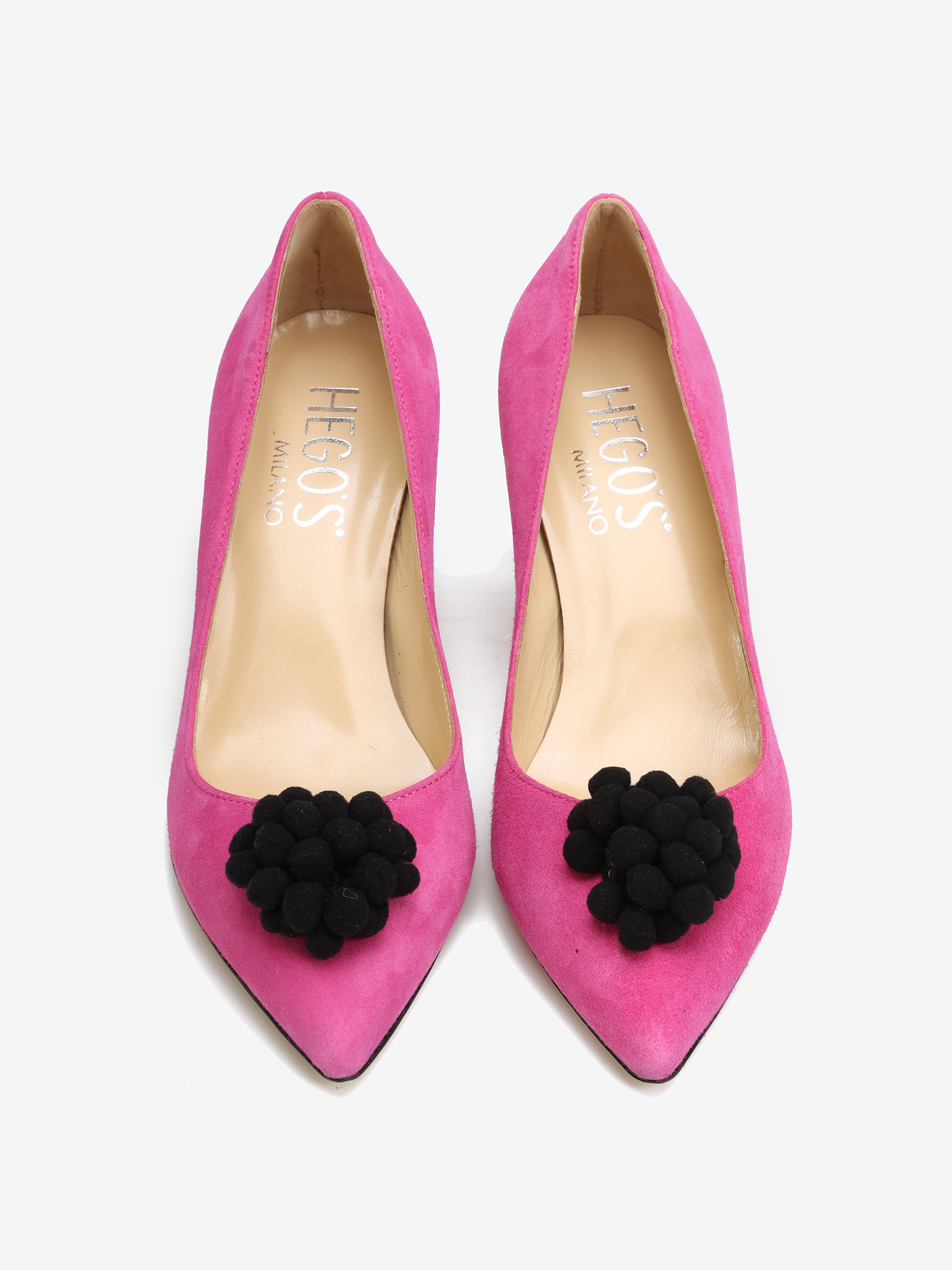 Szpilki w szpic HEGO'S Milano wykonane są z włoskiej, zamszowej skóry. Cholewka w kolorze różowym z czarnym pomponem. Wygodny obcas na szpilce w połączeniu ze skórzaną wkładką zapewnią komfort podczas użytkowania obuwia.