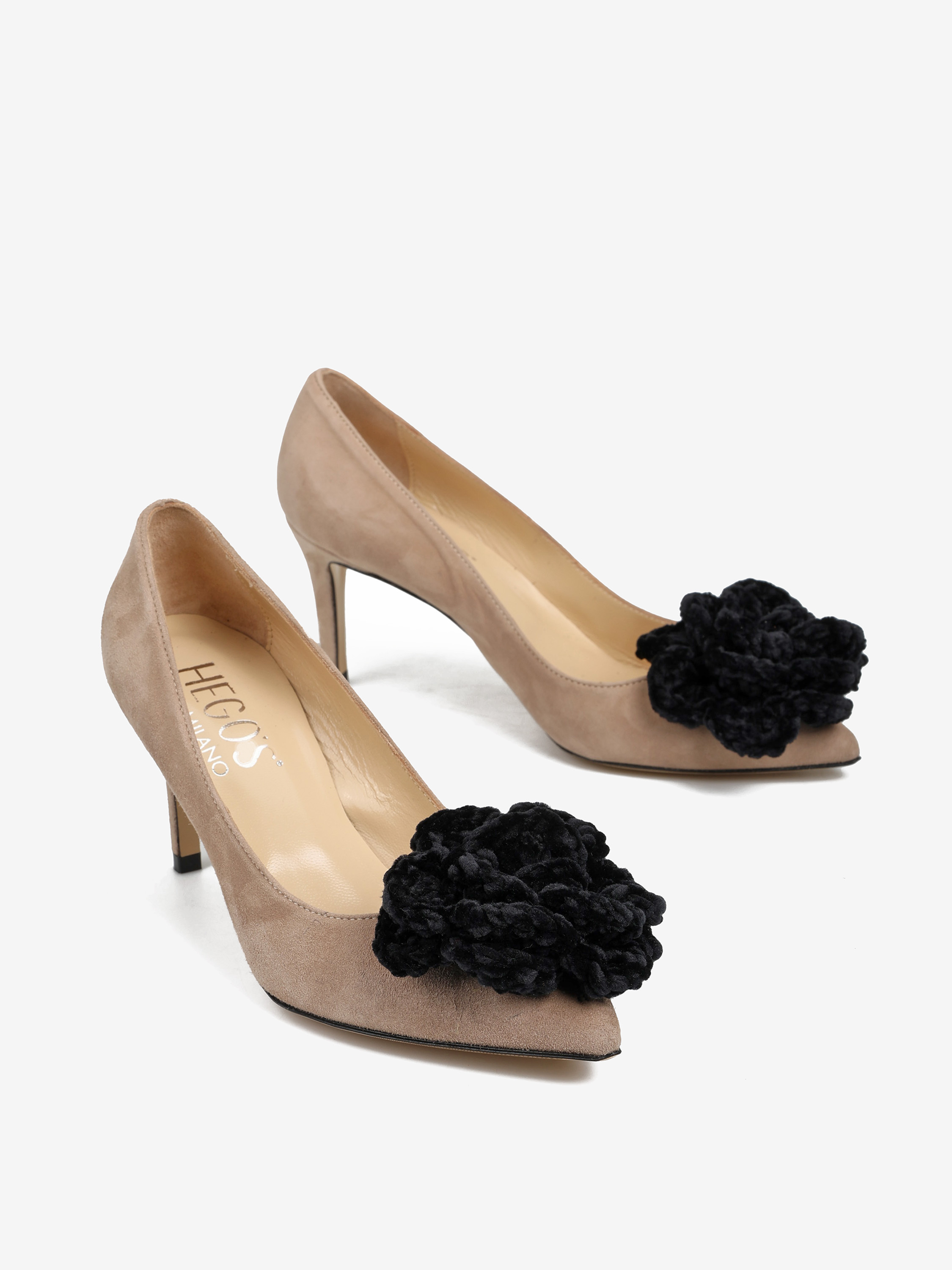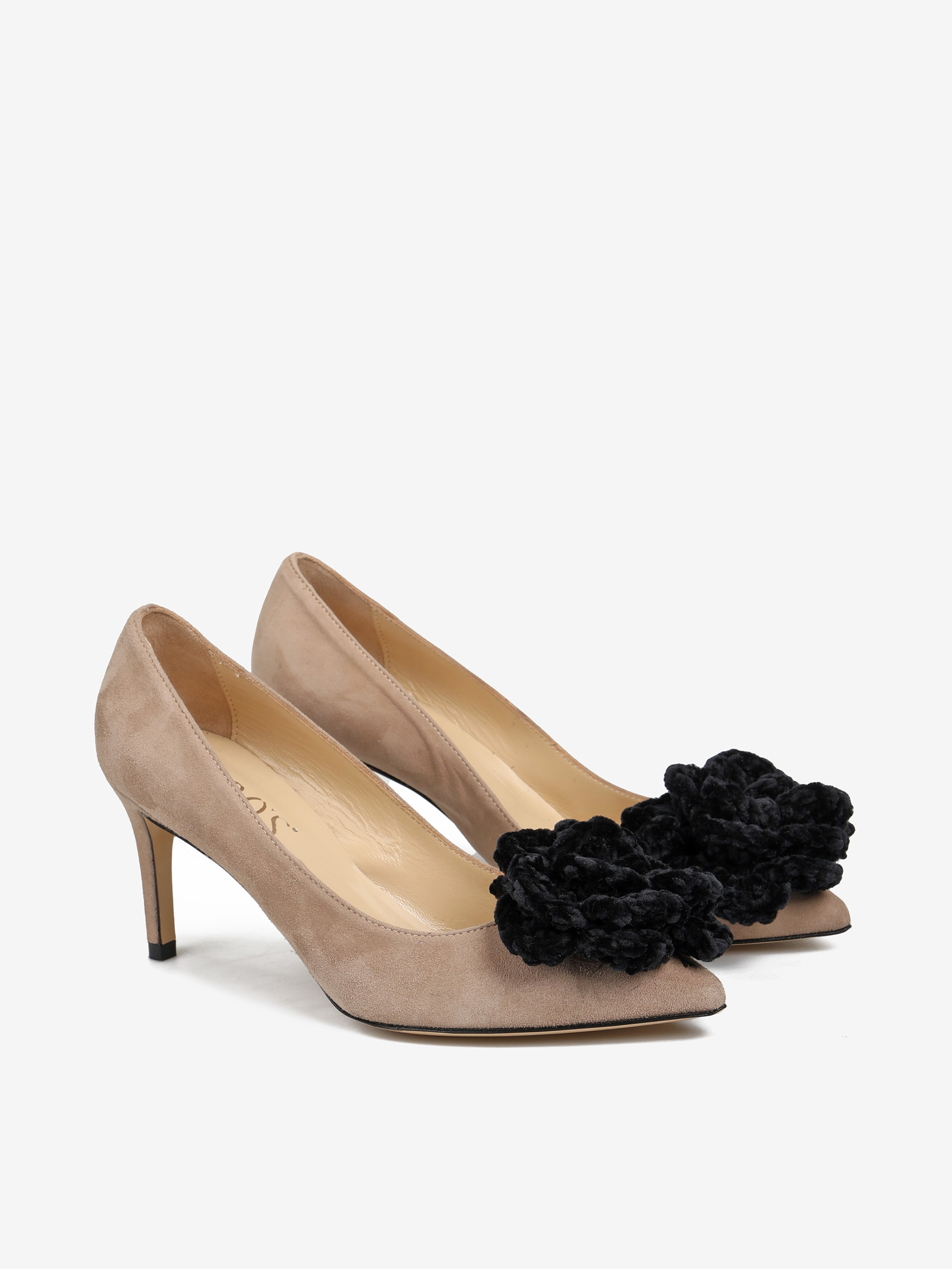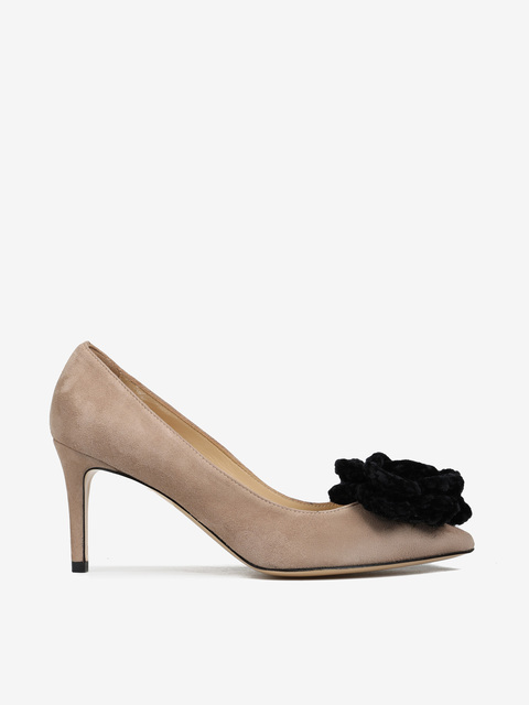 Zamszowe szpilki z noskiem w szpic ozdobione szydełkowym, czarnym kwiatem.