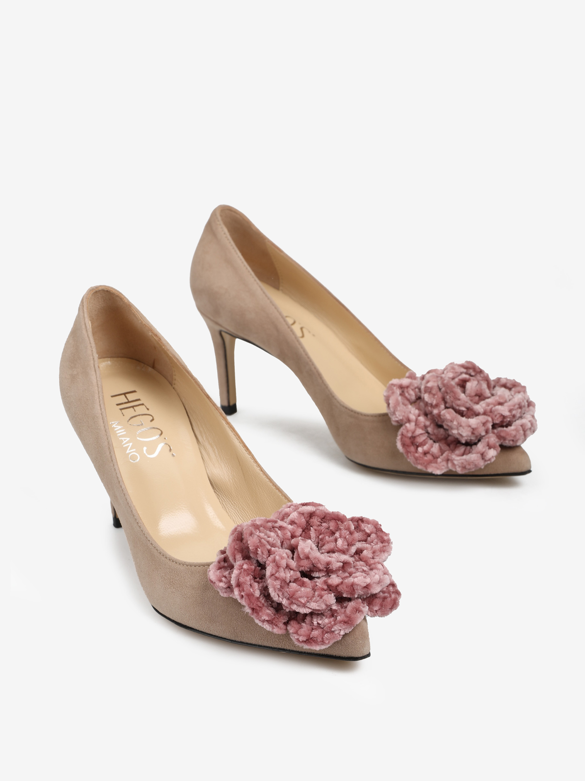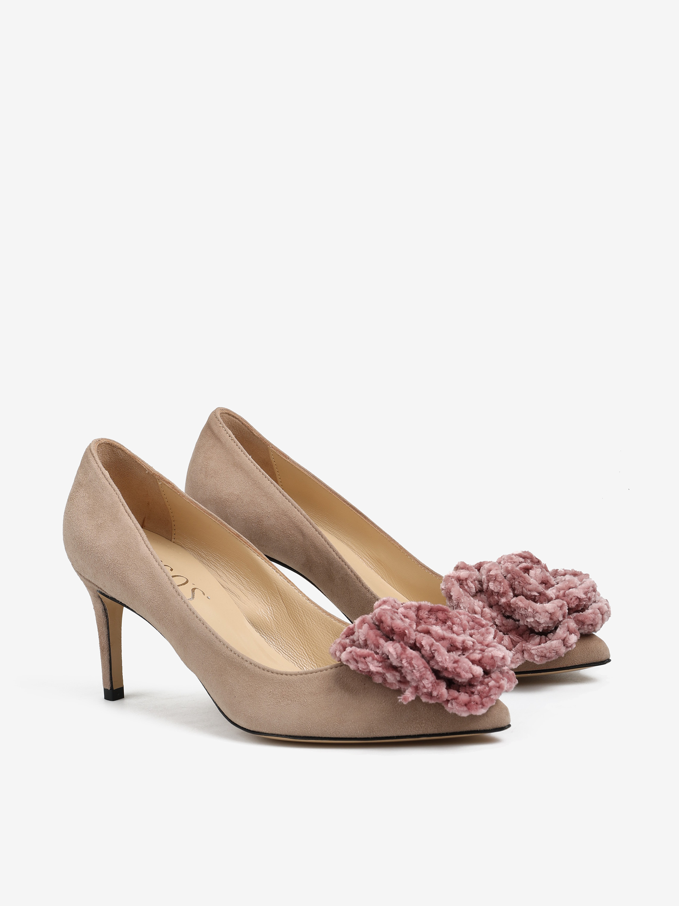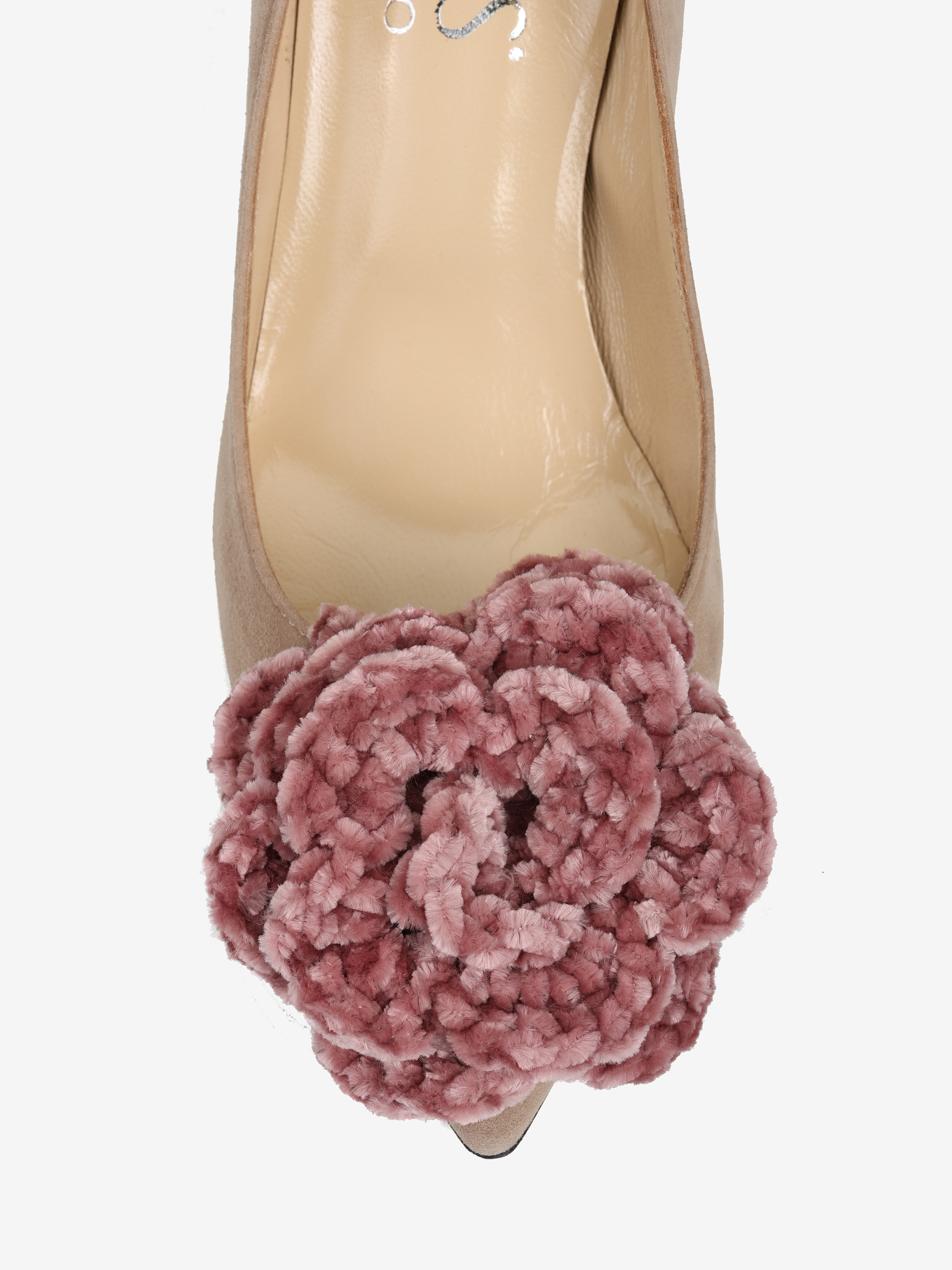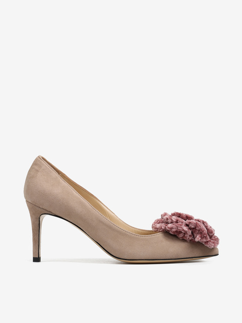 Zamszowe szpilki z noskiem w szpic ozdobione szydełkowym, pudrowo różowym kwiatem.