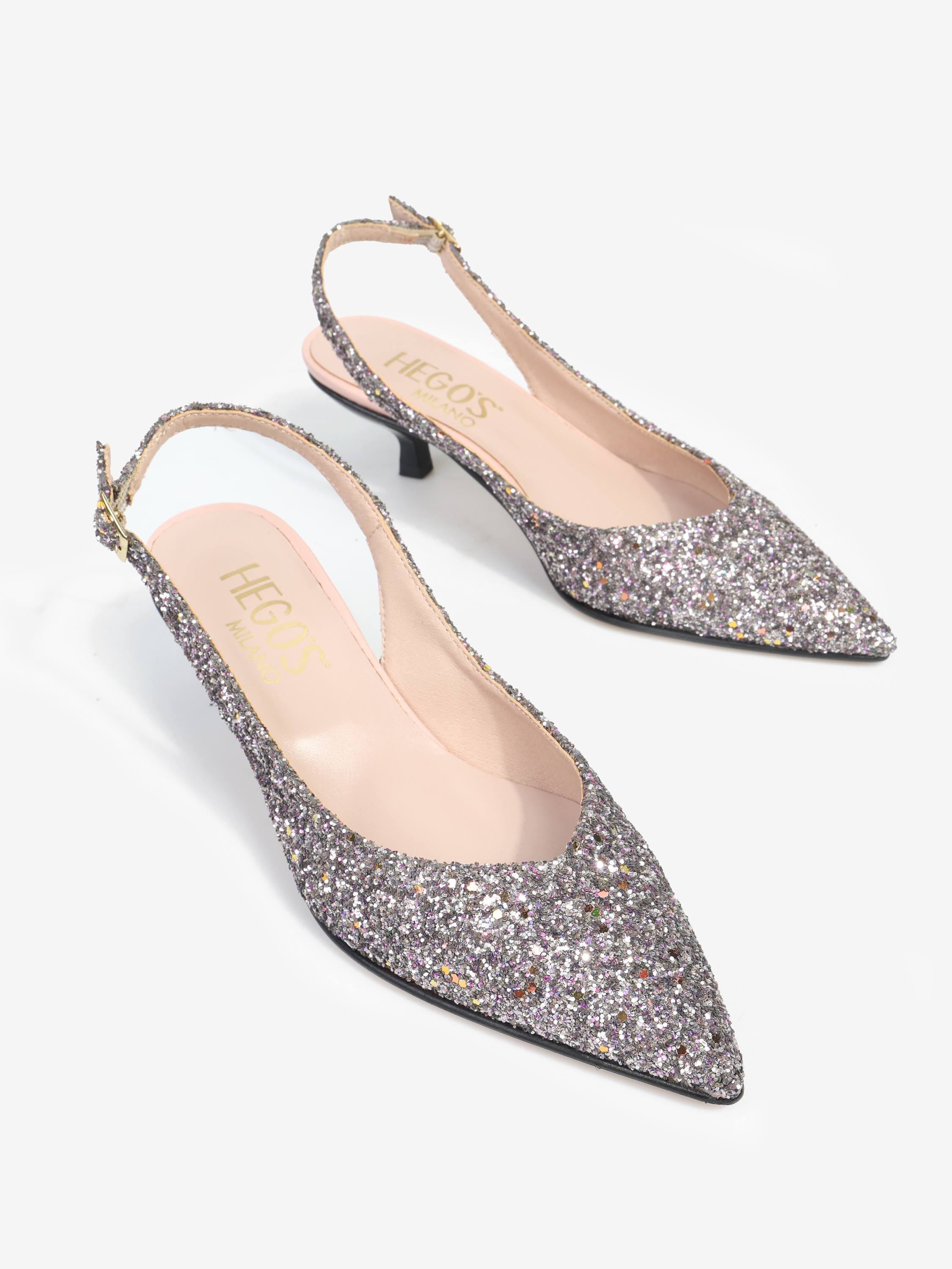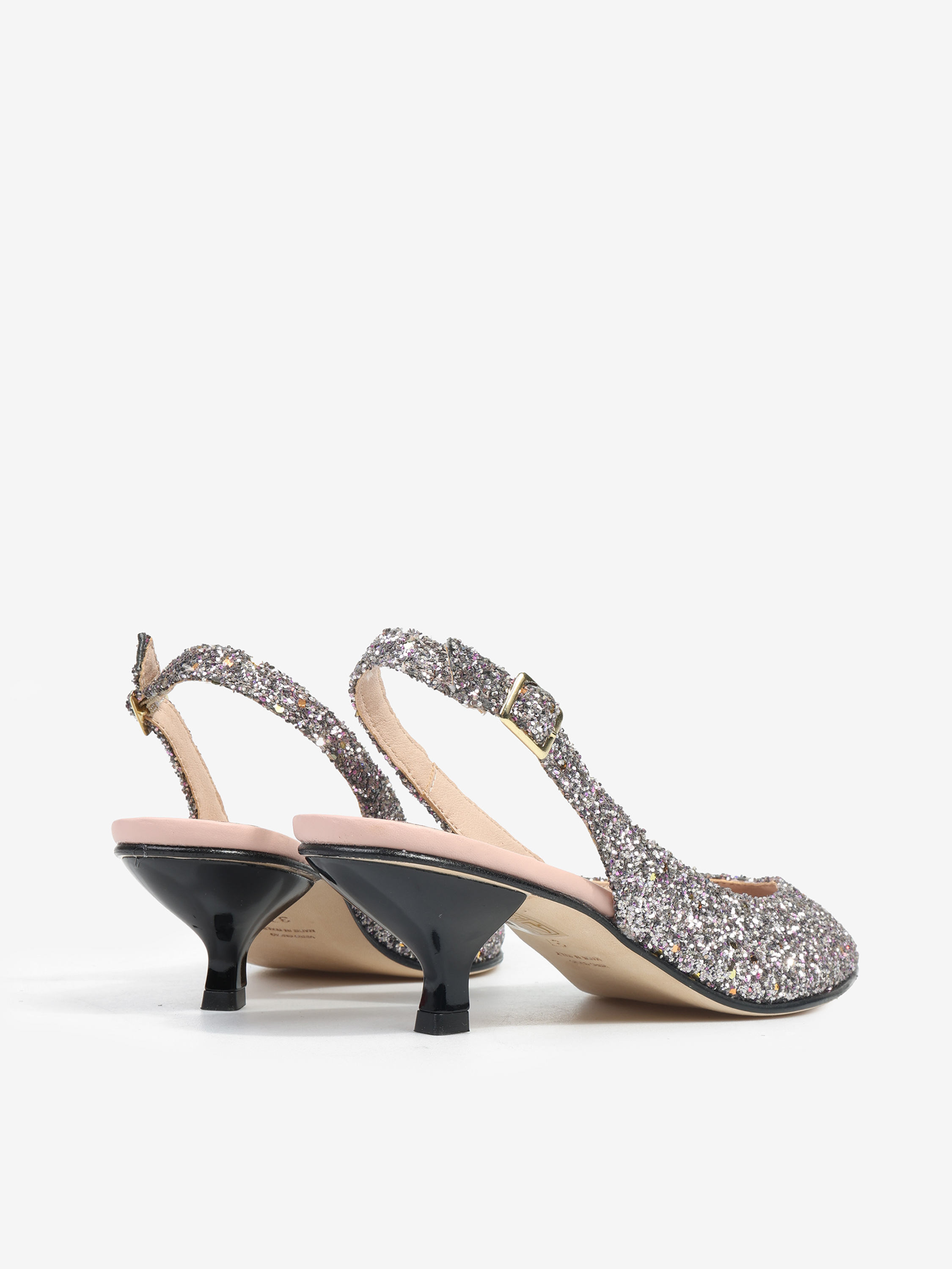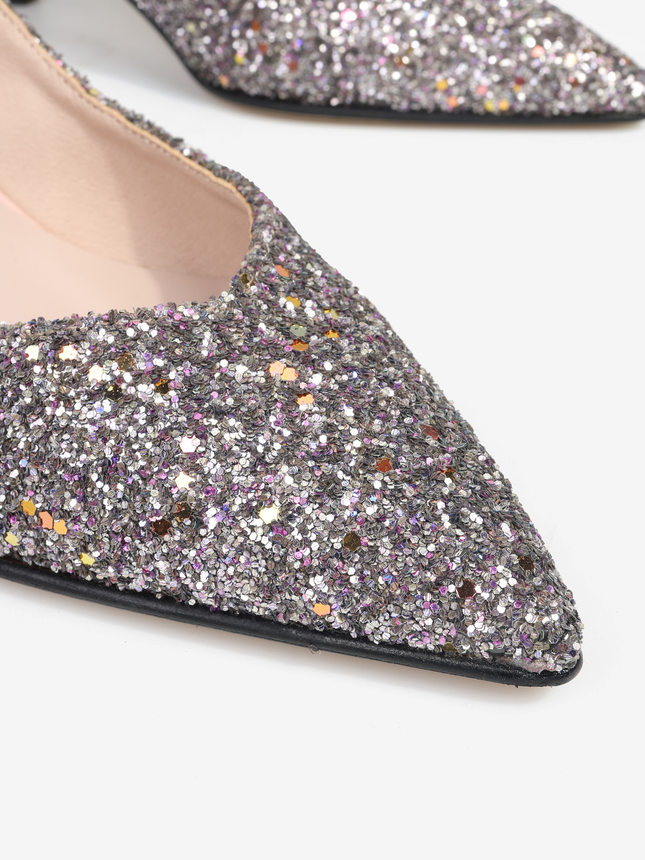 Szpilki z noskiem w szpic wykończone gruboziarnistym brokatem. Odkryta pięta z regulowanym paskiem.