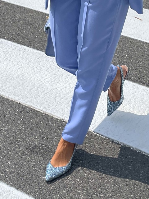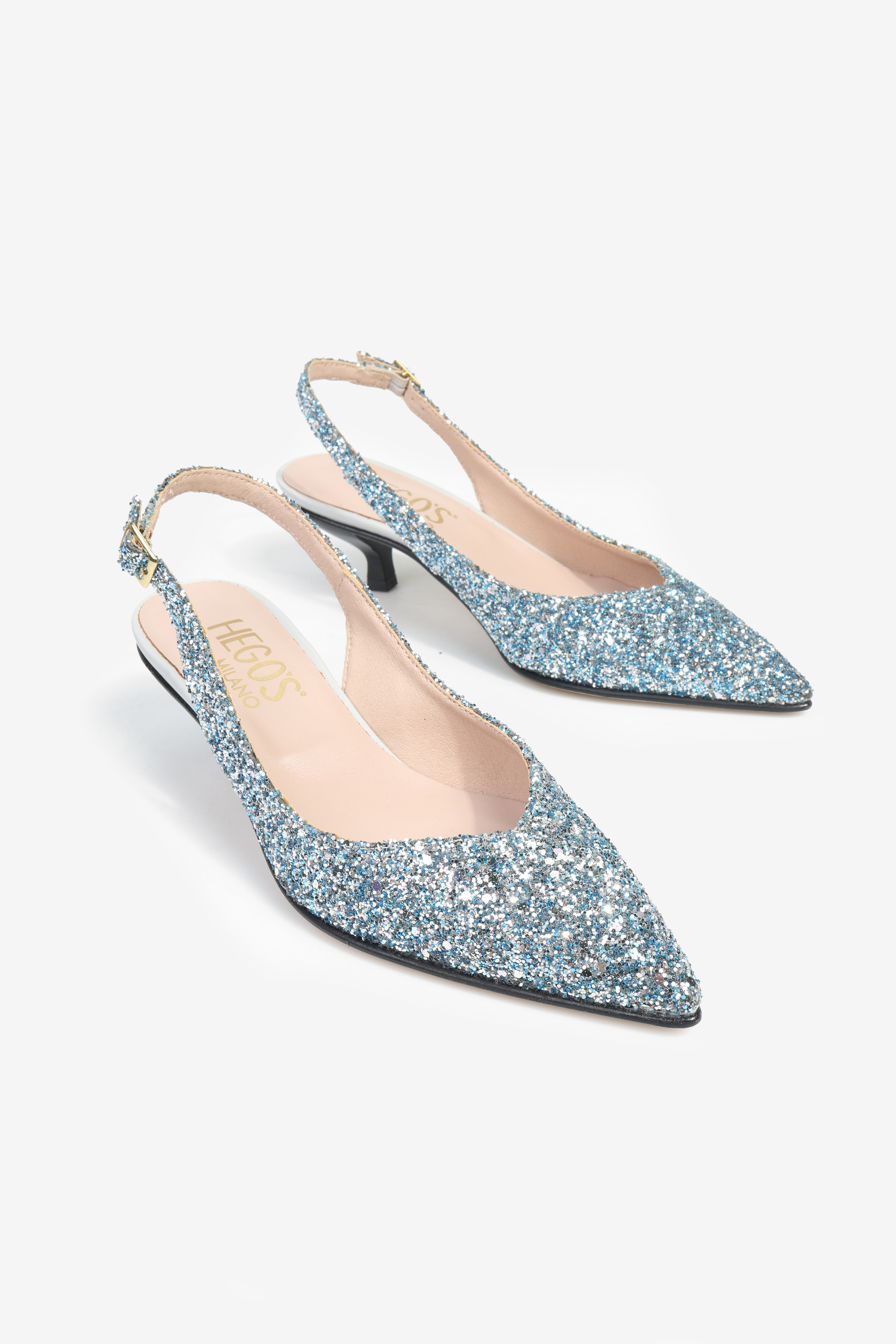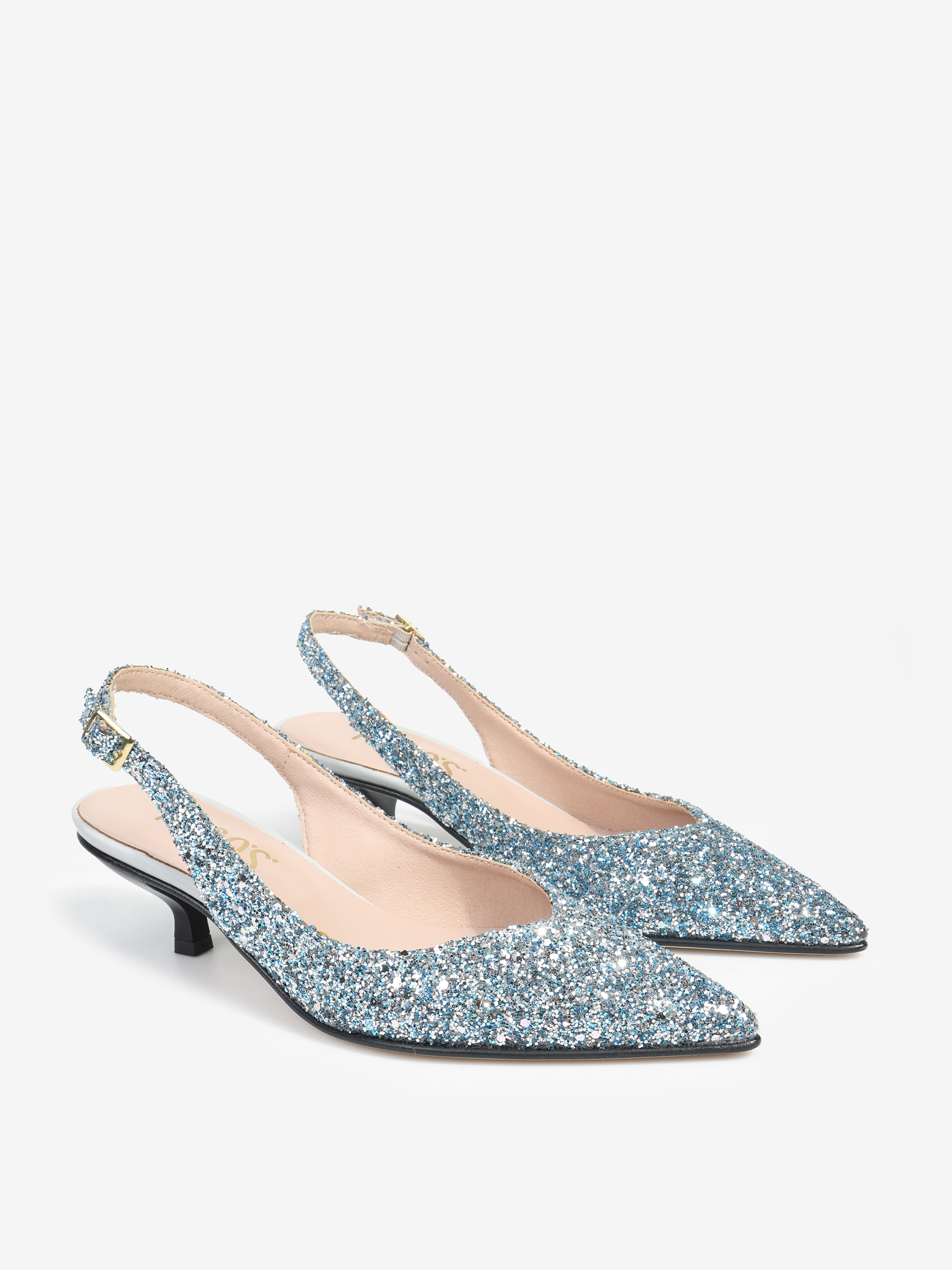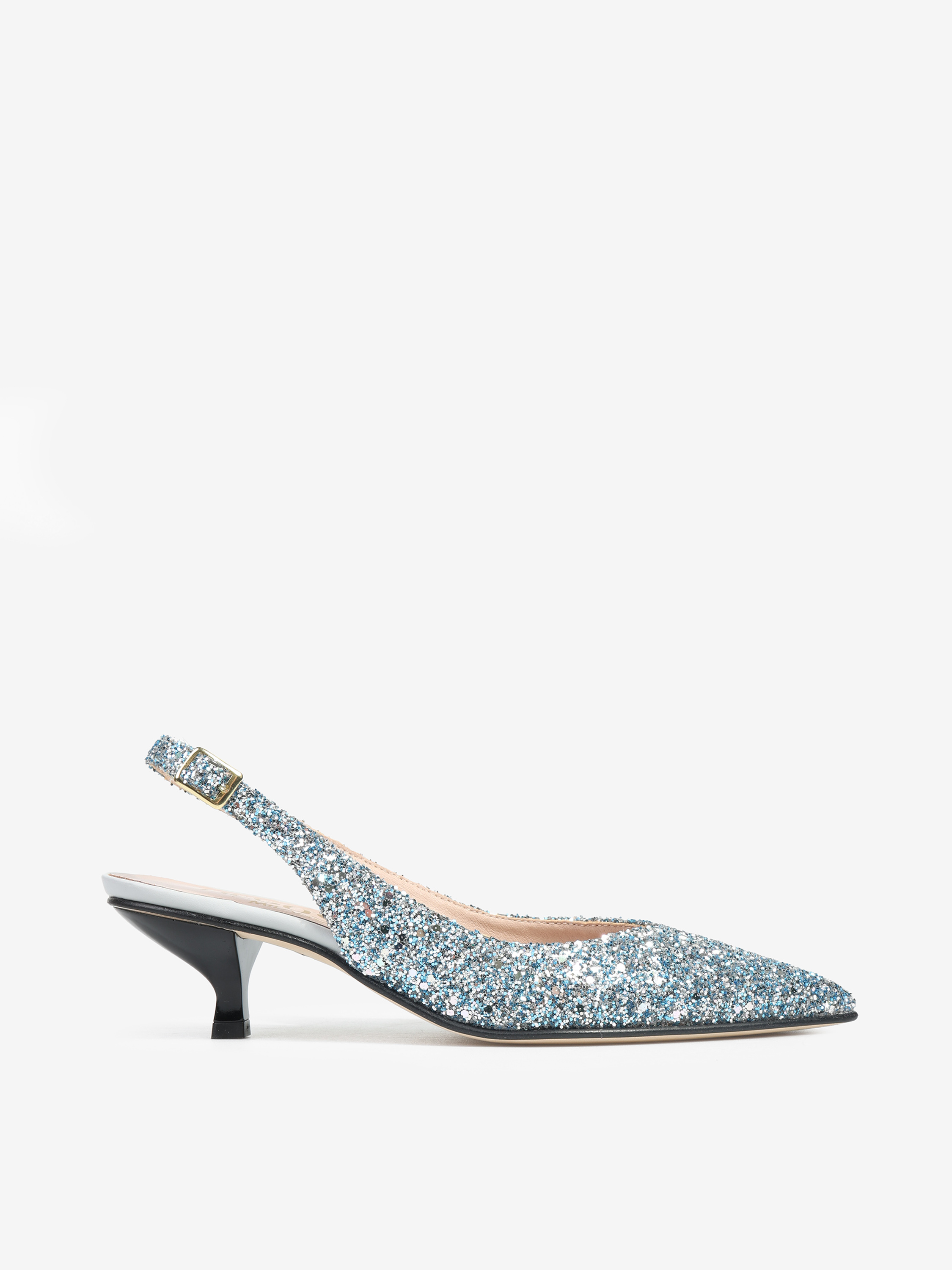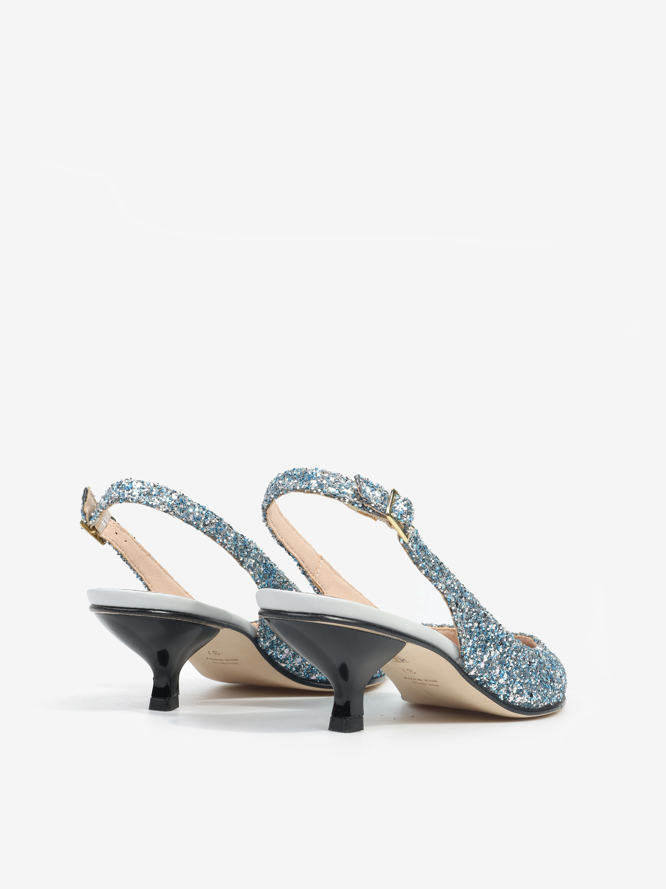 Szpilki z noskiem w szpic wykończone gruboziarnistym brokatem. Odkryta pięta z regulowanym paskiem.
