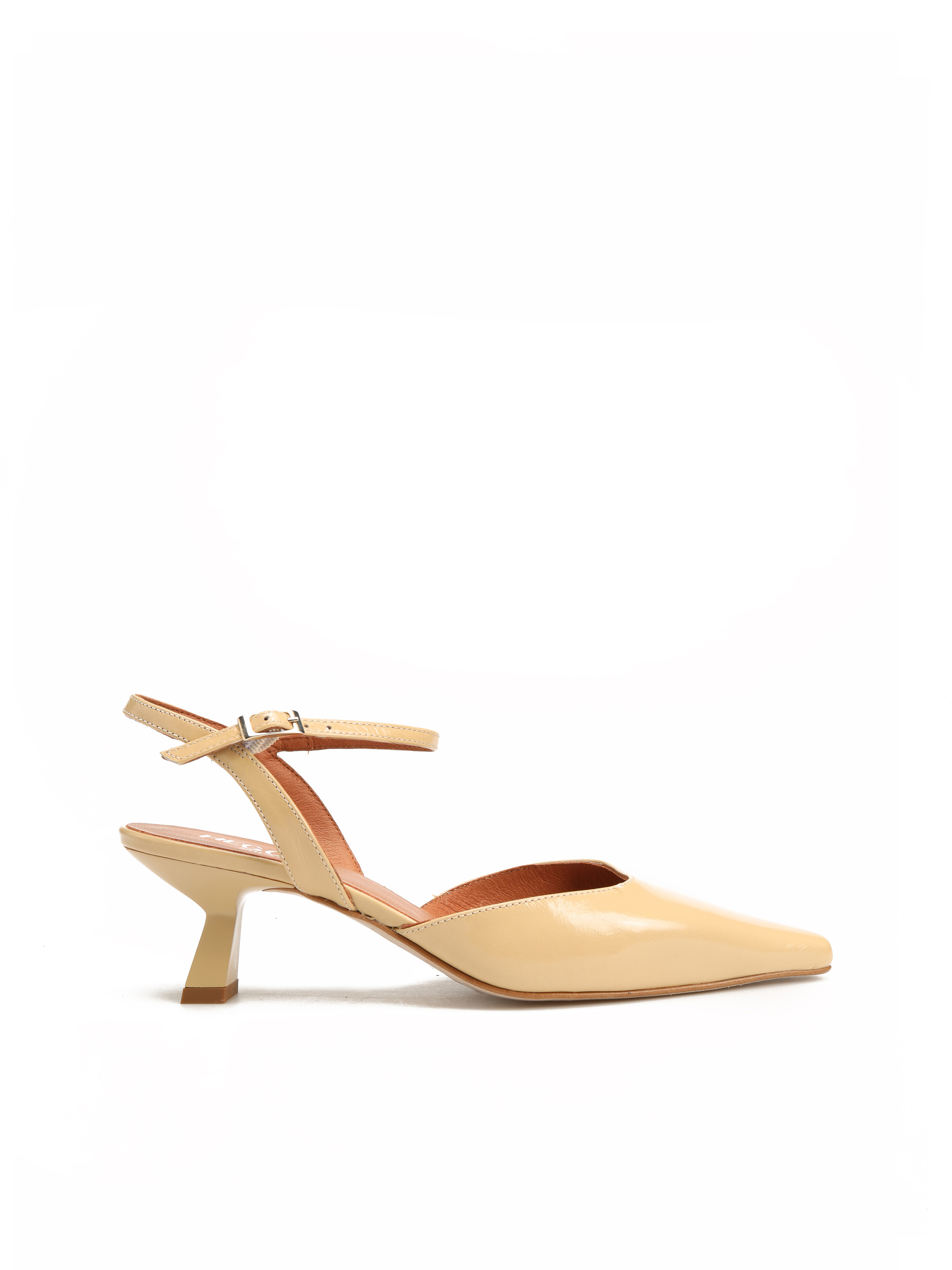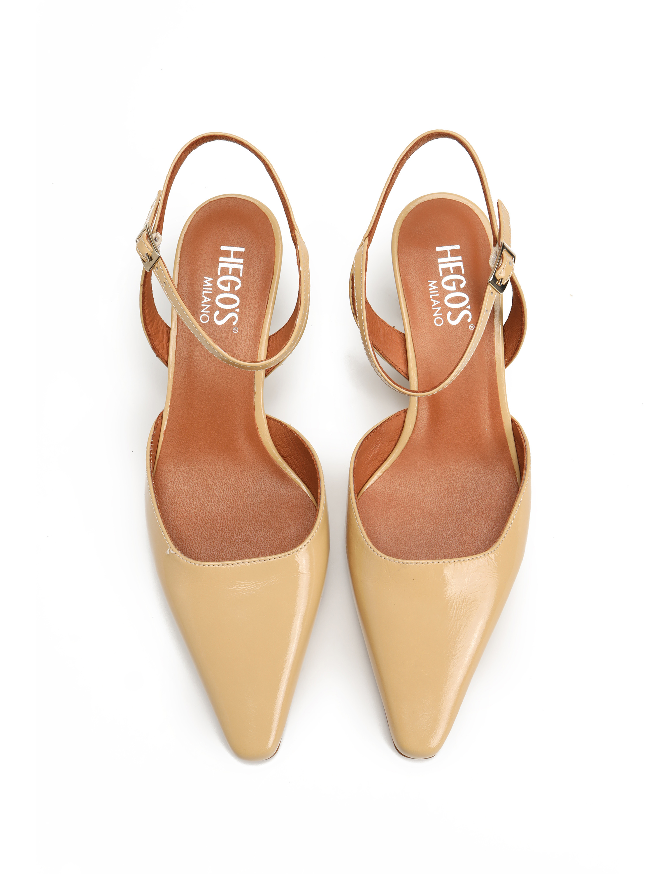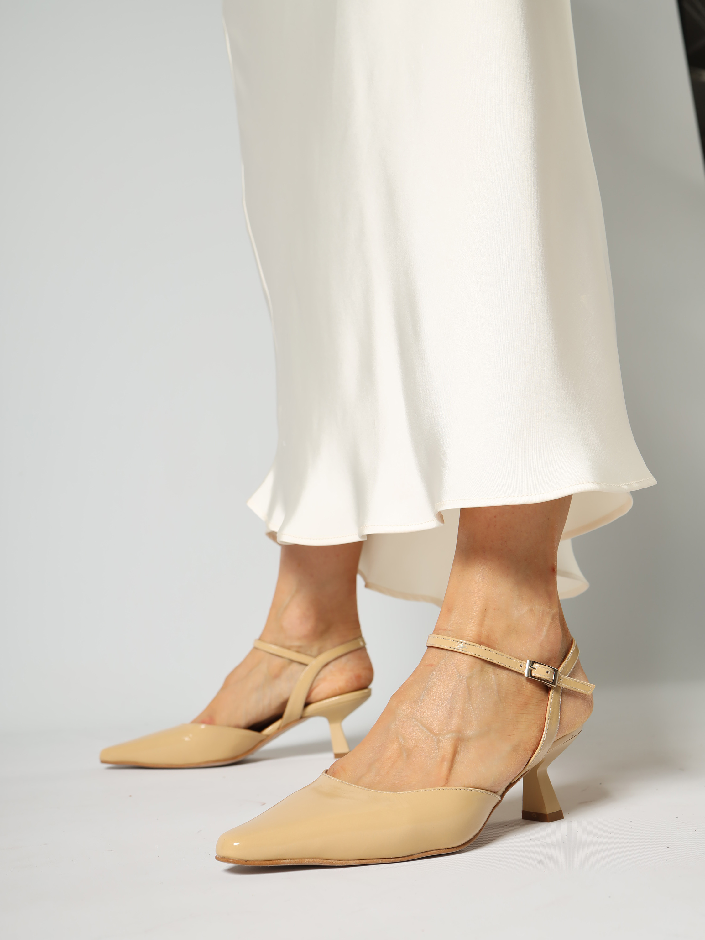 Szpilki z odkrytą piętą wykonane są z lakierowanej skóry. Cholewka w beżowym kolorze posiada zapinany wokół kostki regulowany pasek. Fason z noskiem w szpic oraz wygodnym obcasem na niewysokiej szpilce.