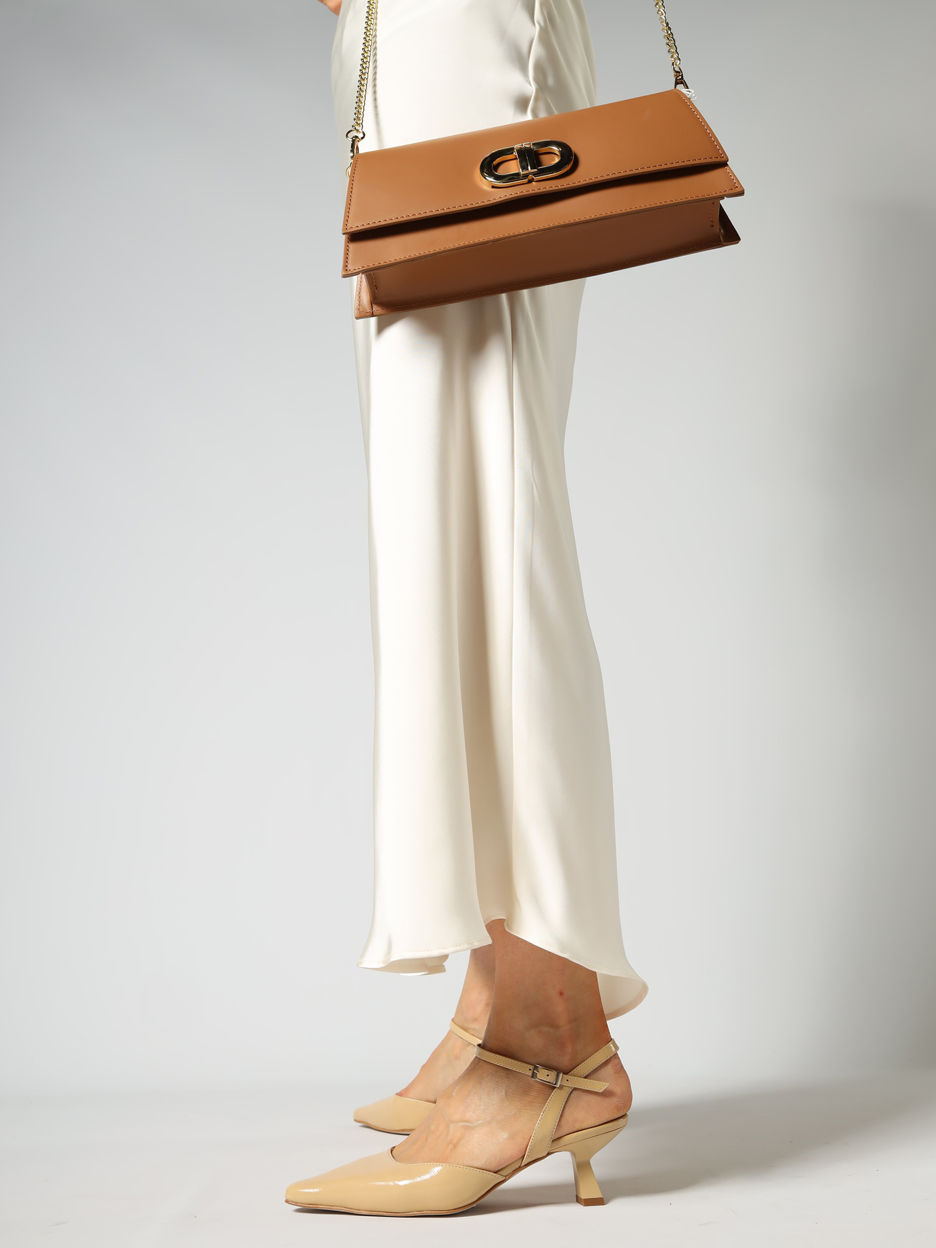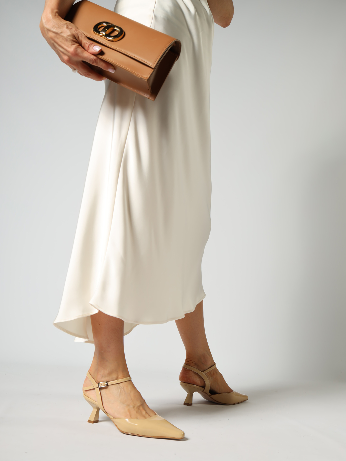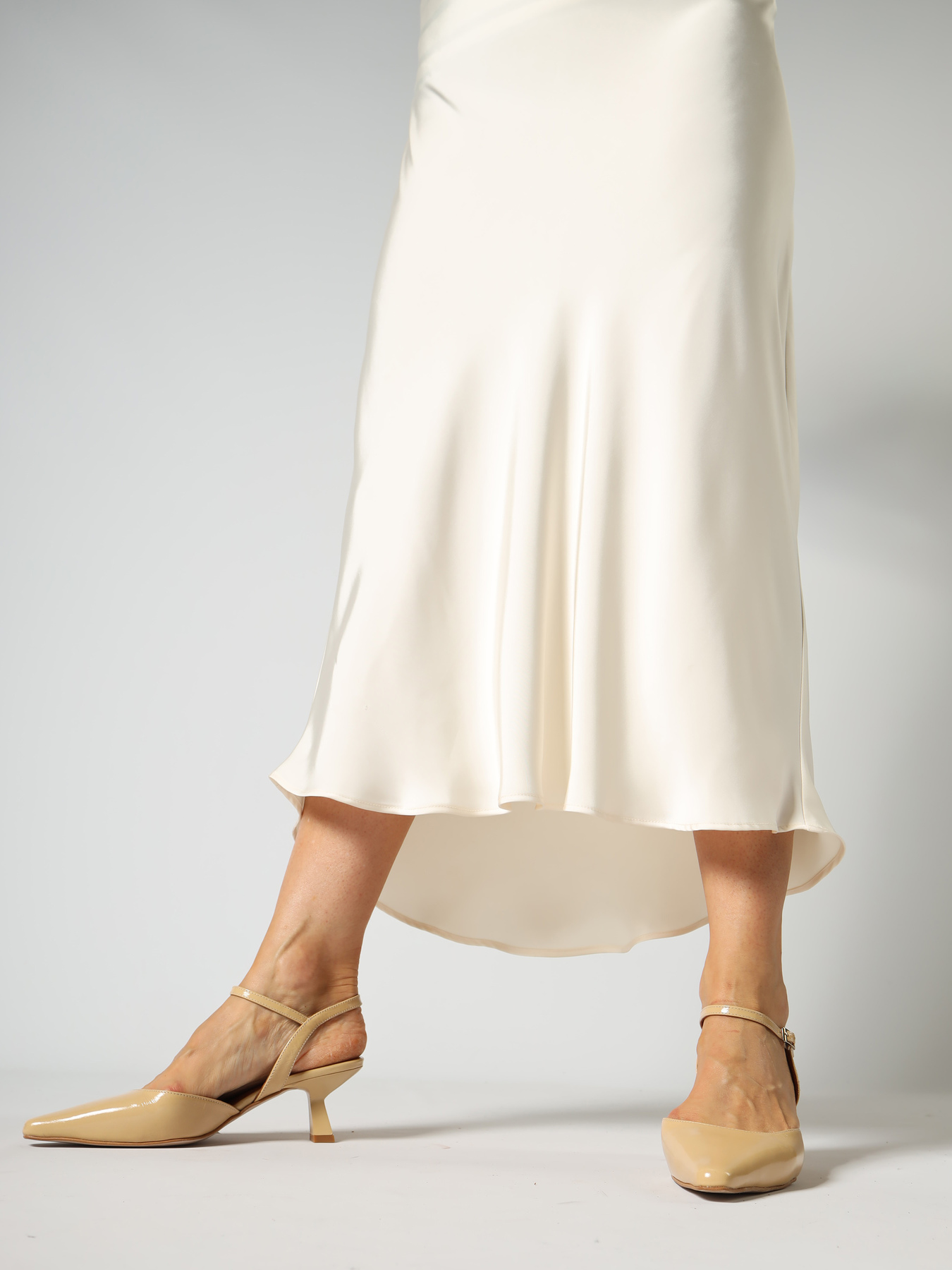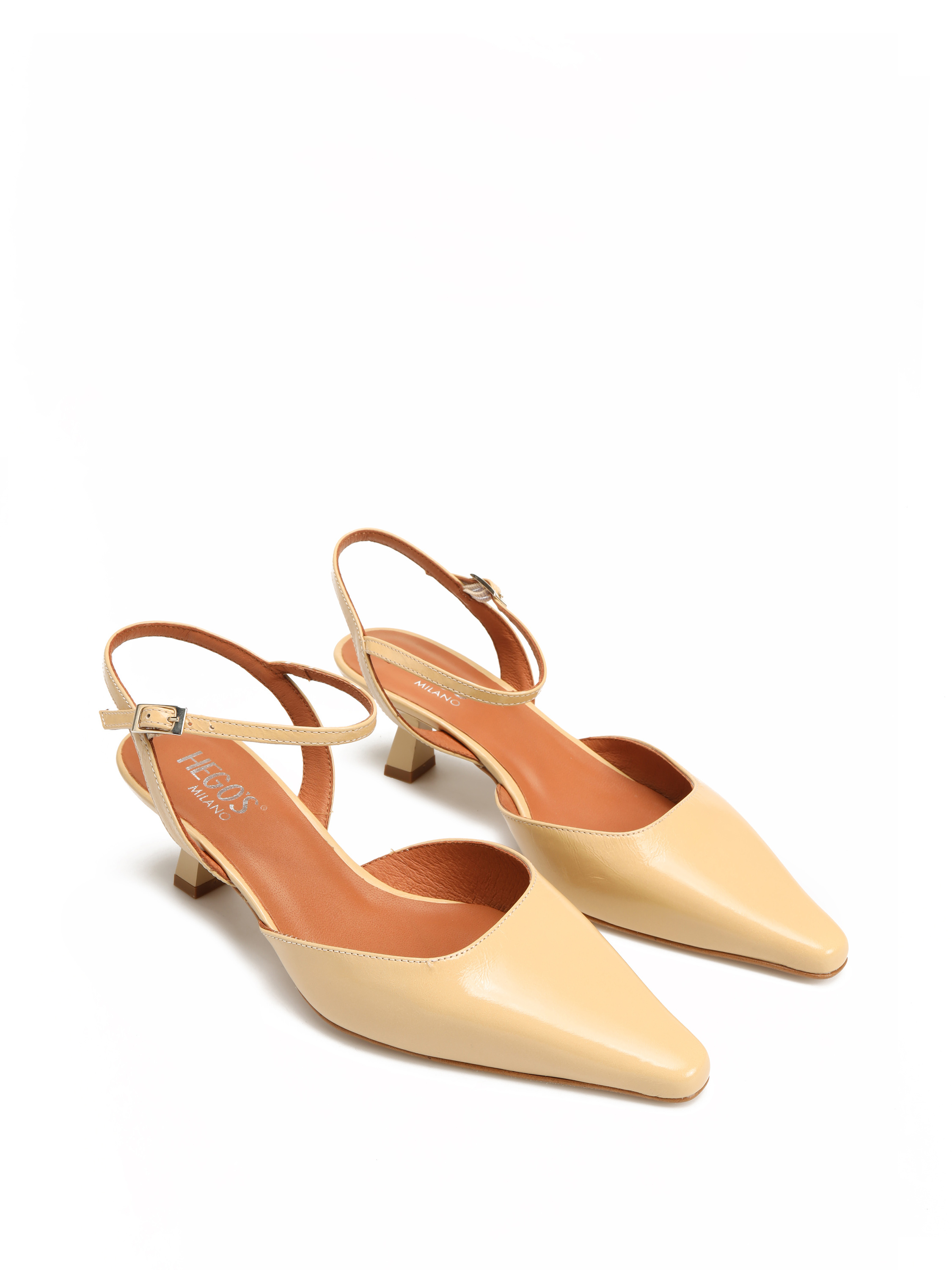 Szpilki z odkrytą piętą wykonane są z lakierowanej skóry. Cholewka w beżowym kolorze posiada zapinany wokół kostki regulowany pasek. Fason z noskiem w szpic oraz wygodnym obcasem na niewysokiej szpilce.