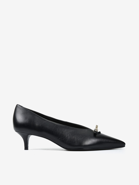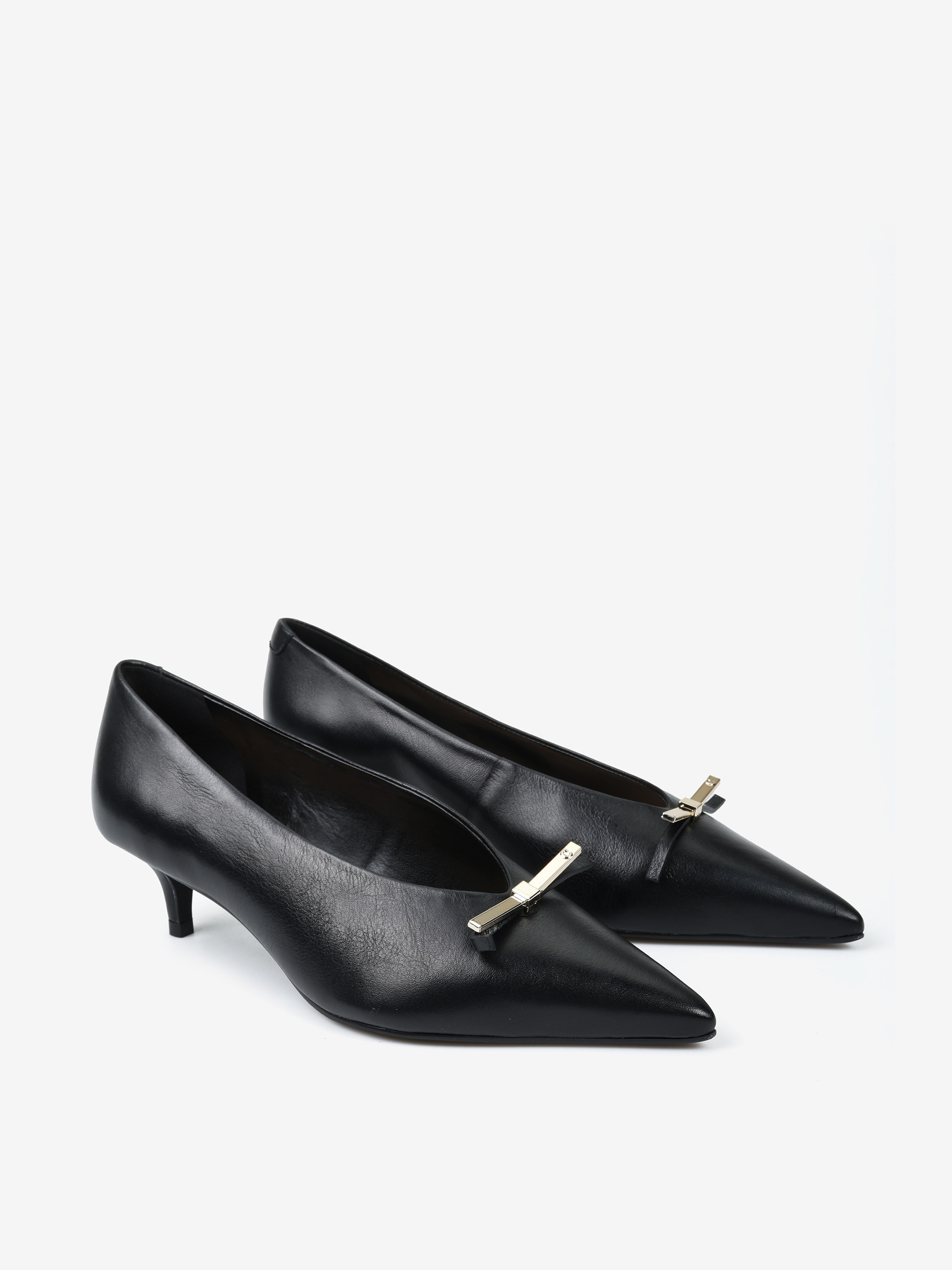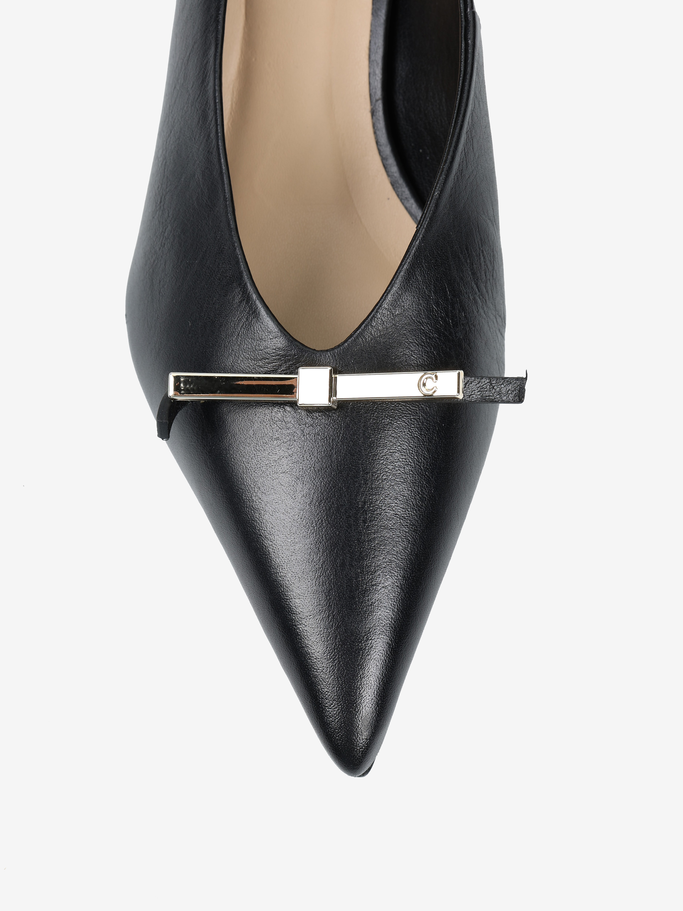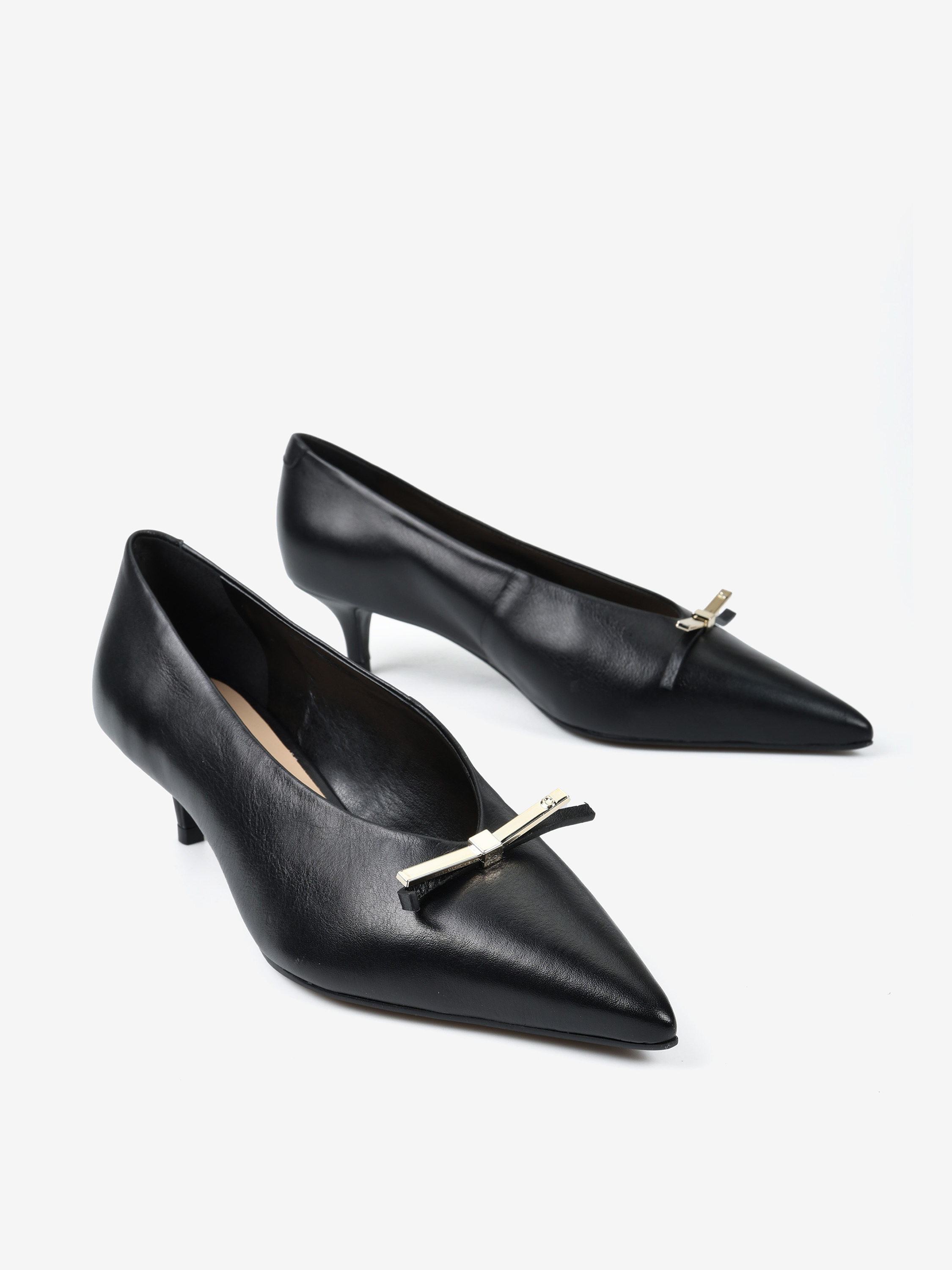 Szpilki z zabudowanymi brzegami i noskiem w szpic. Ozdobna kokardka wykonana z metalu i skórzanych pasków.
