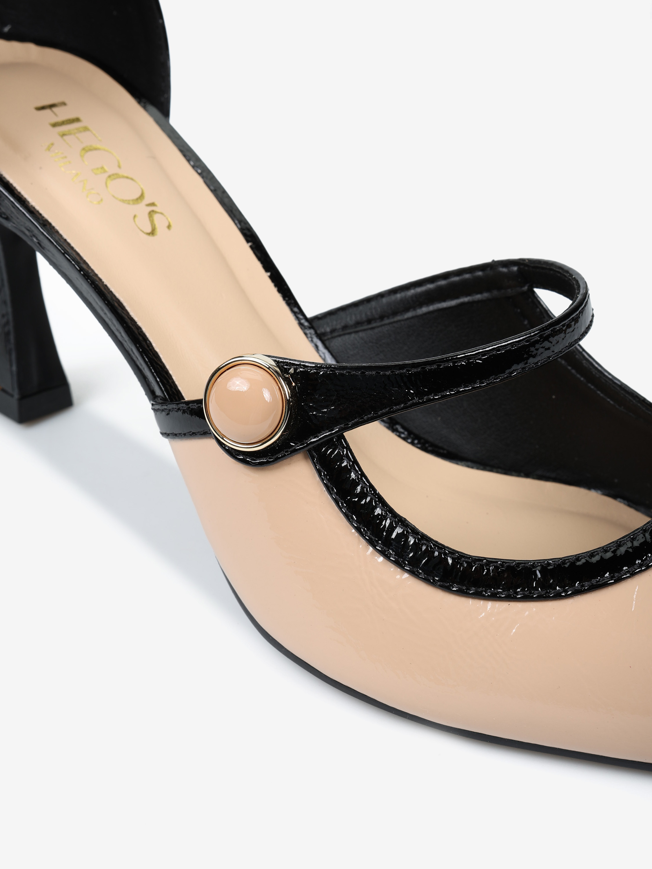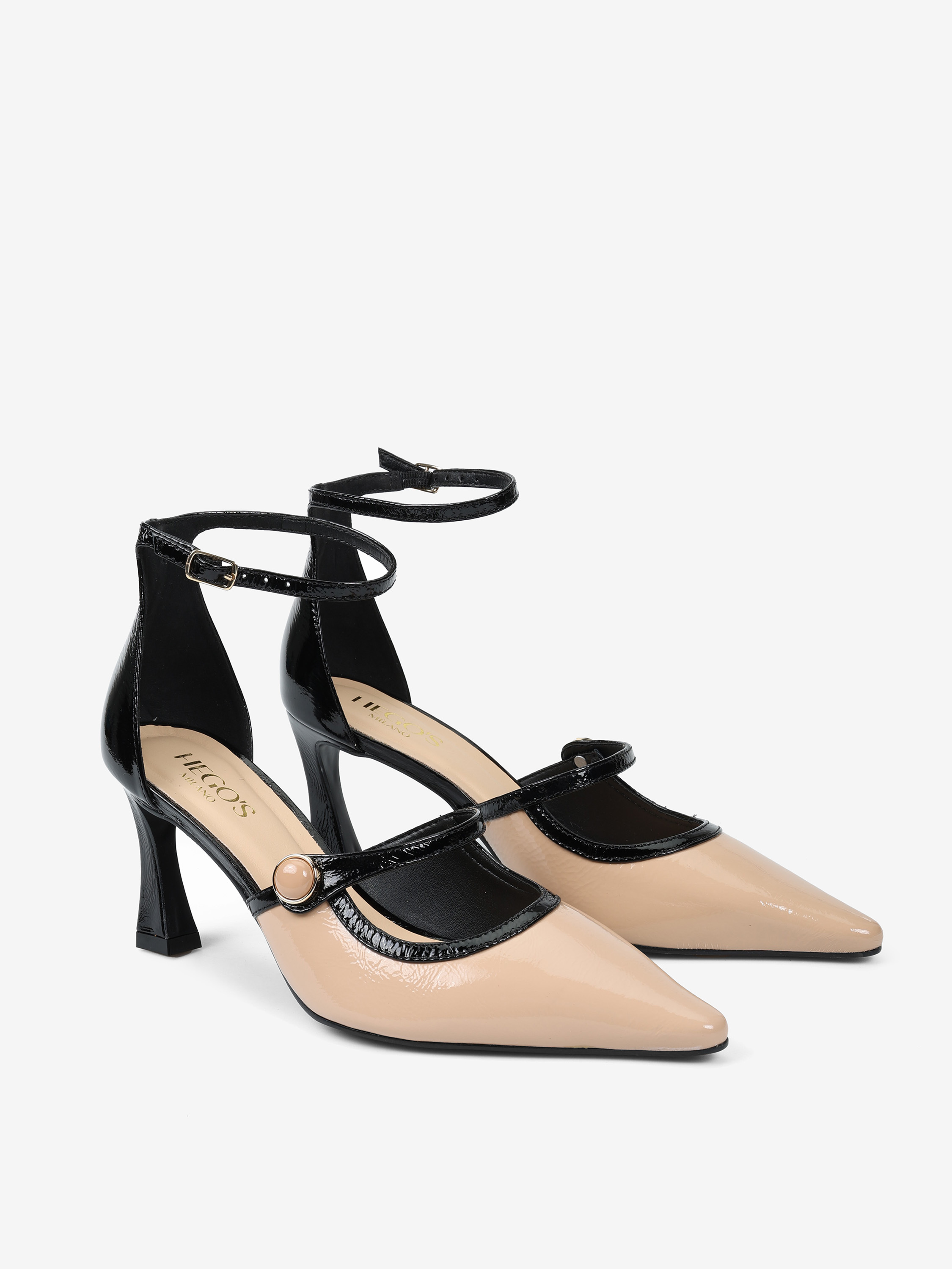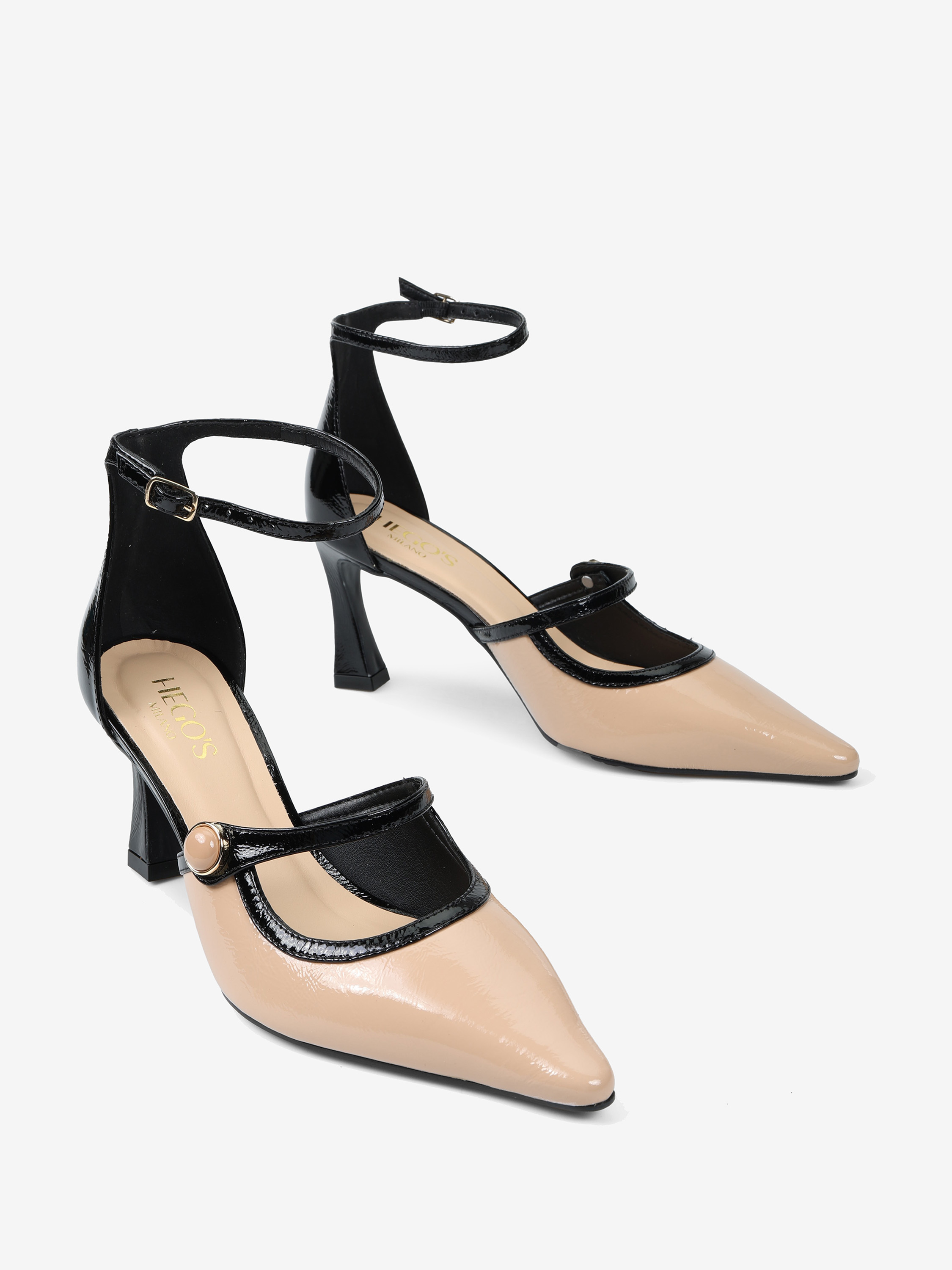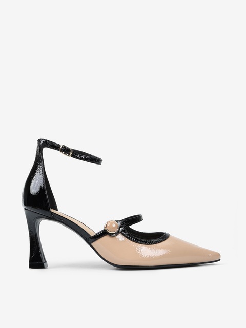 Lakierowane szpilki z zakrytą pięta i regulowanym paskiem na kostce. Beżowy nosek w szpic z ozdobnym paskiem.
