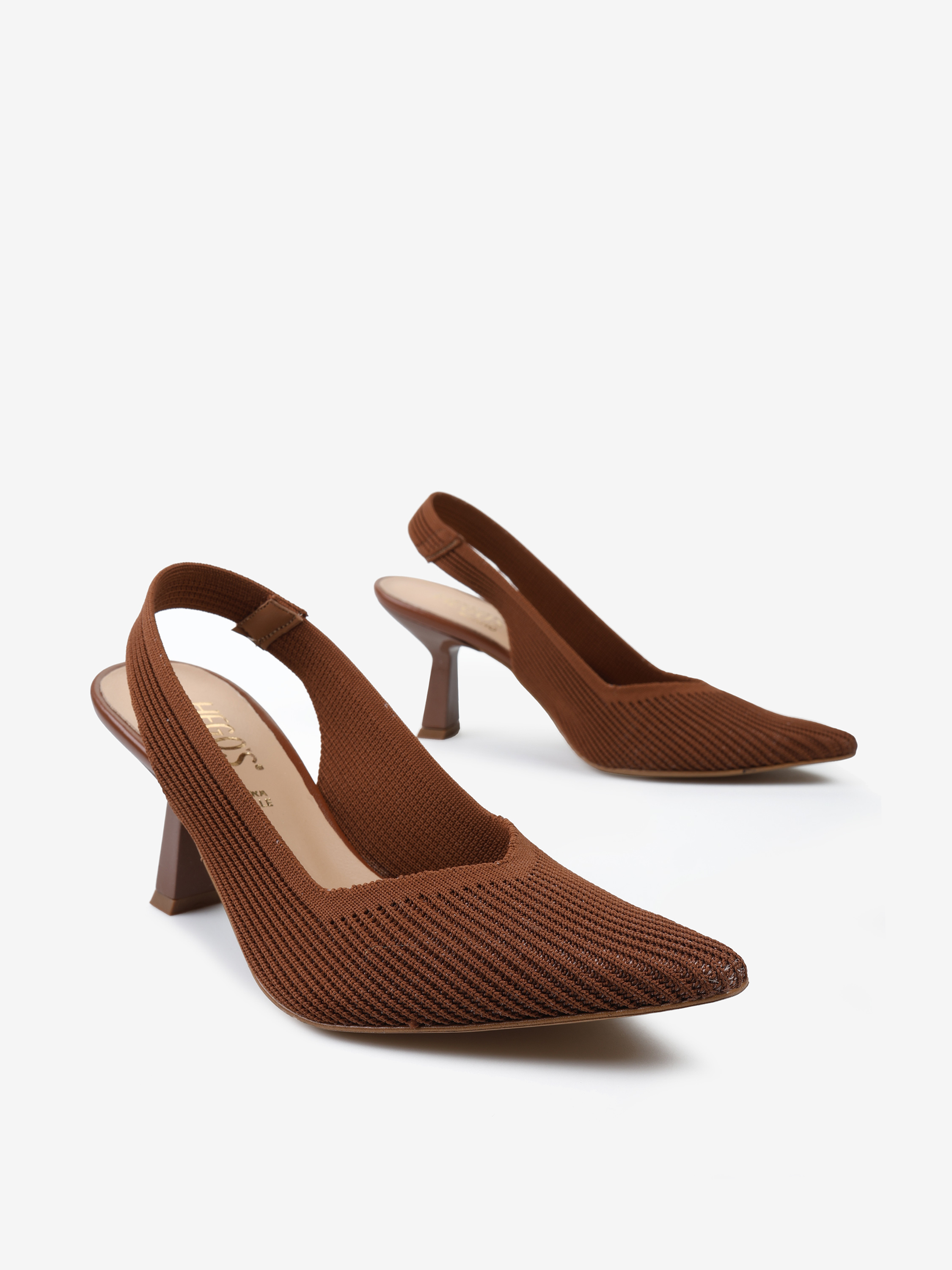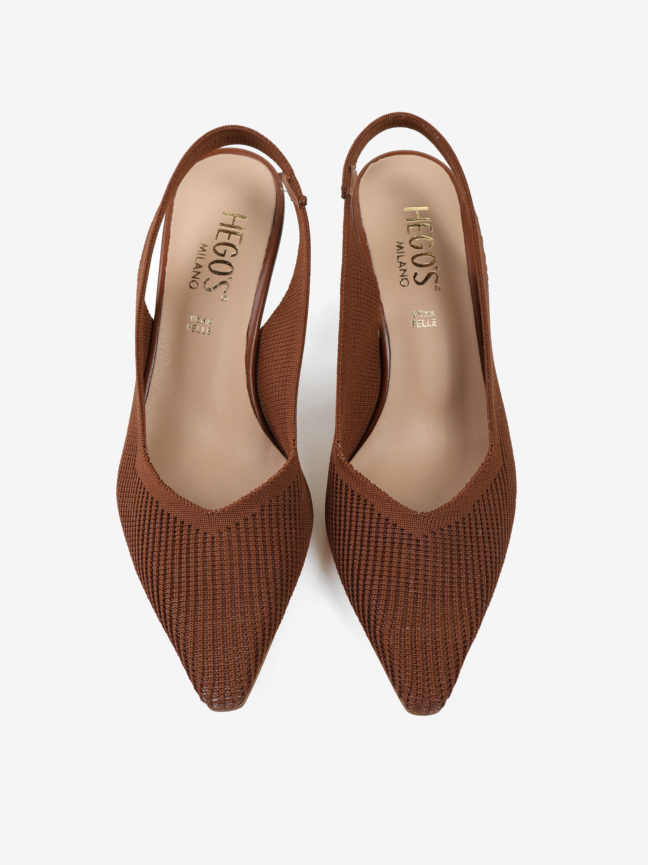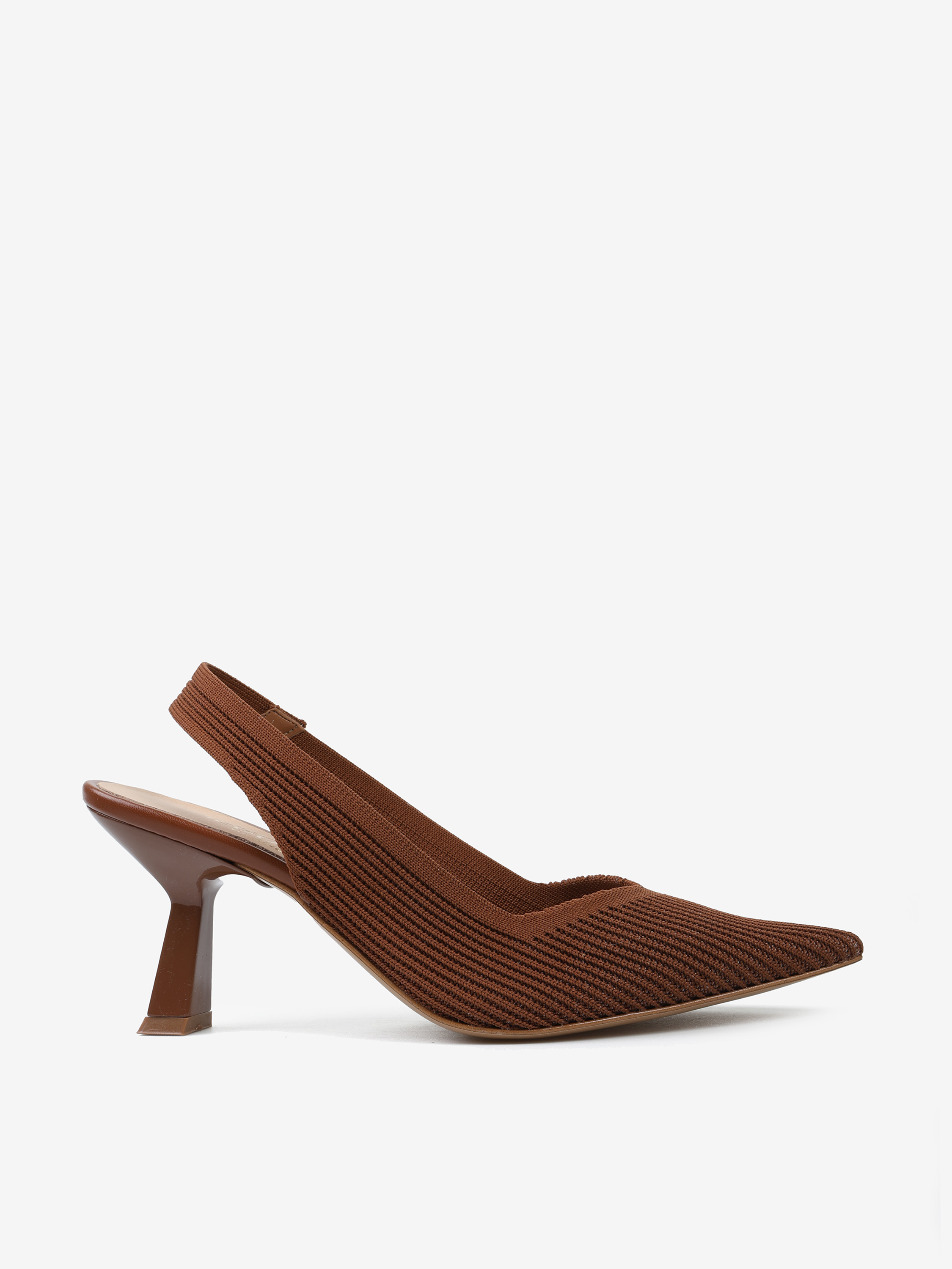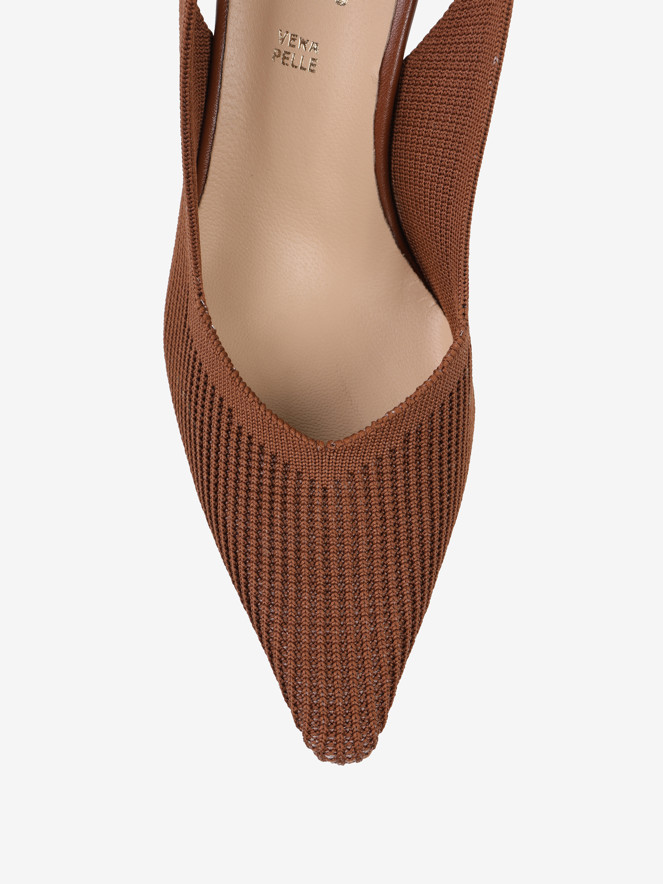 Szpilki z noskiem w szpic wykonane z miękkiej, prążkowanej tkaniny. Głębokie wycięcie i odkryta pięta z paskiem dopasowującym się do stopy