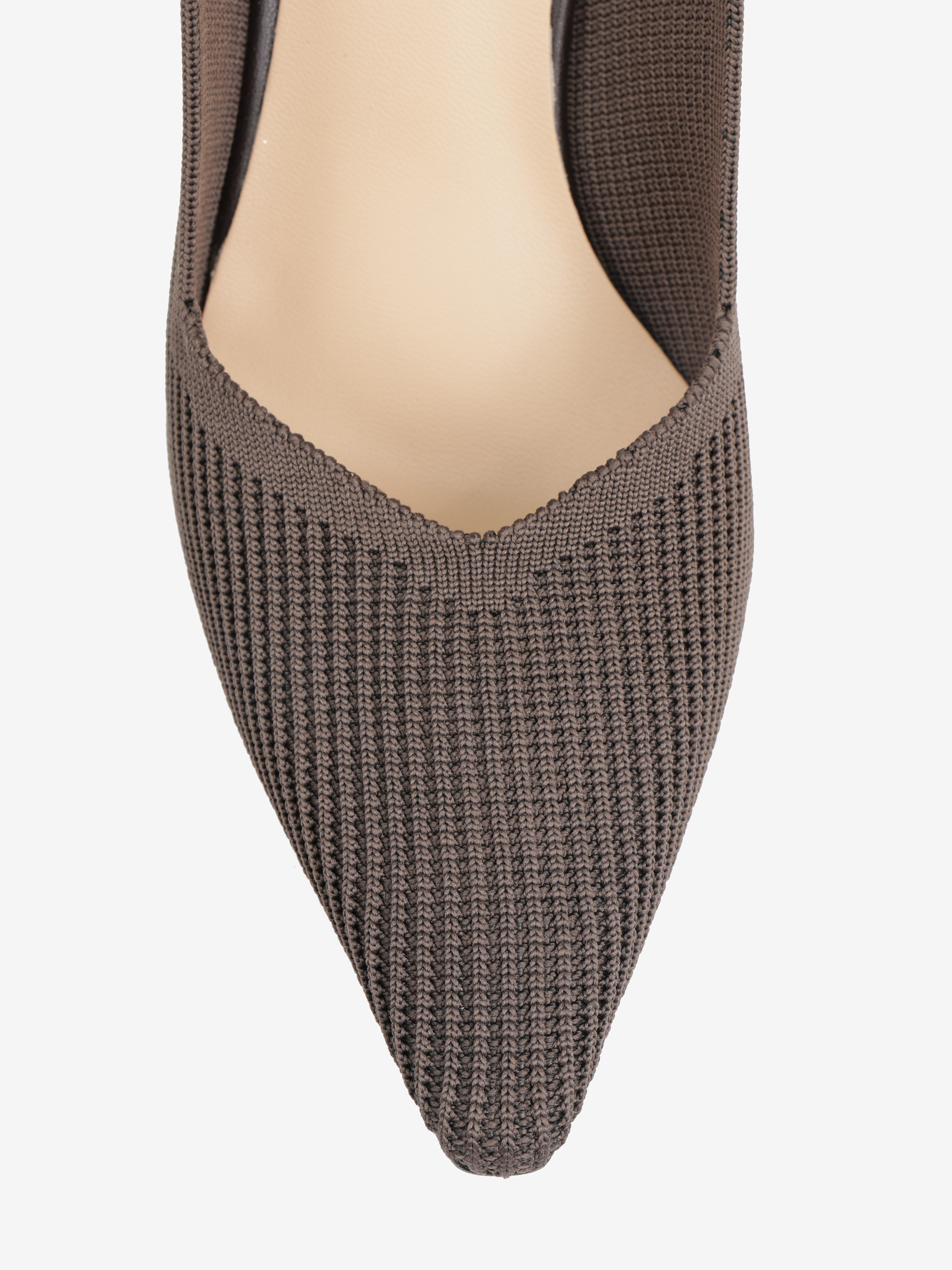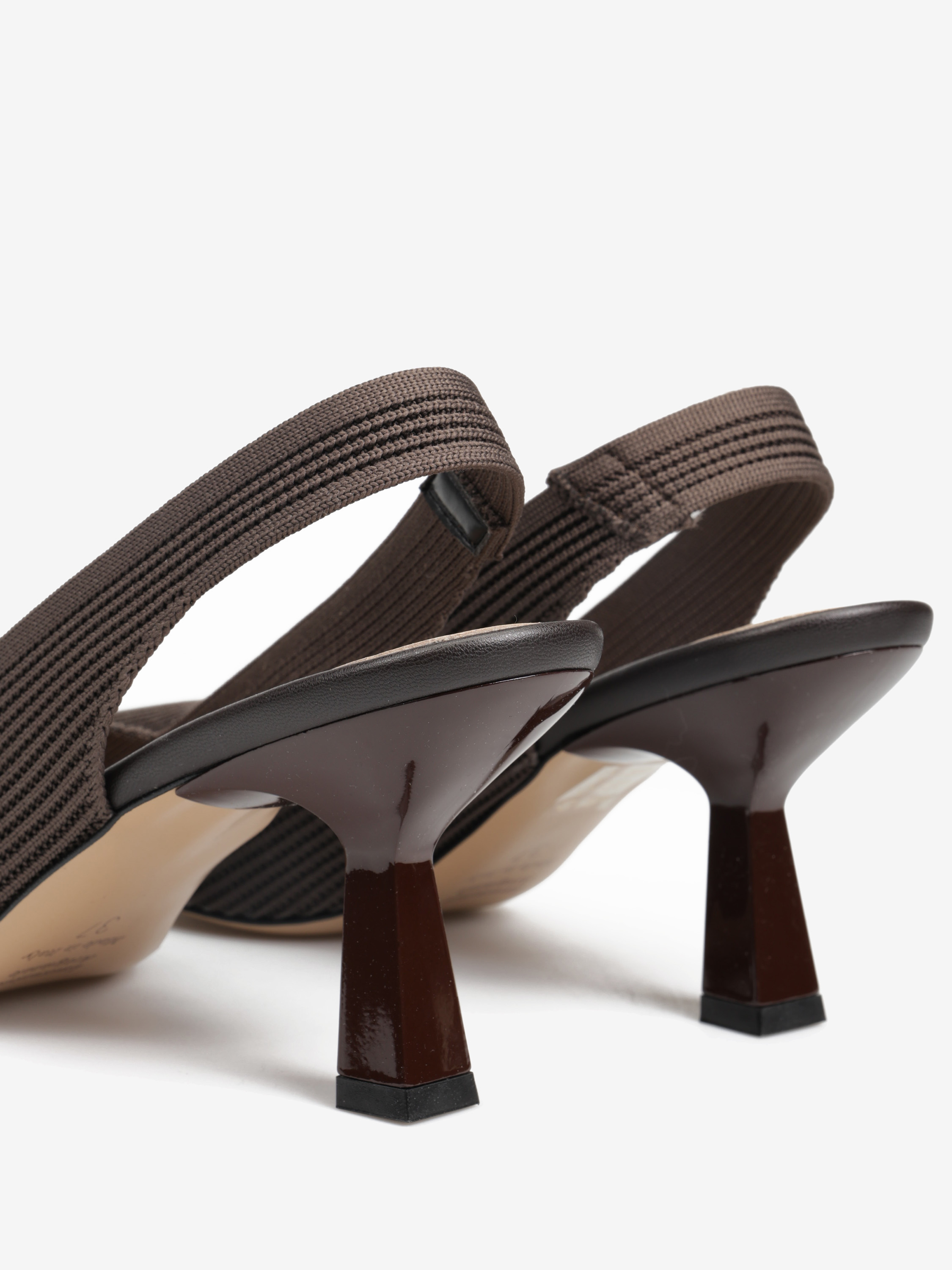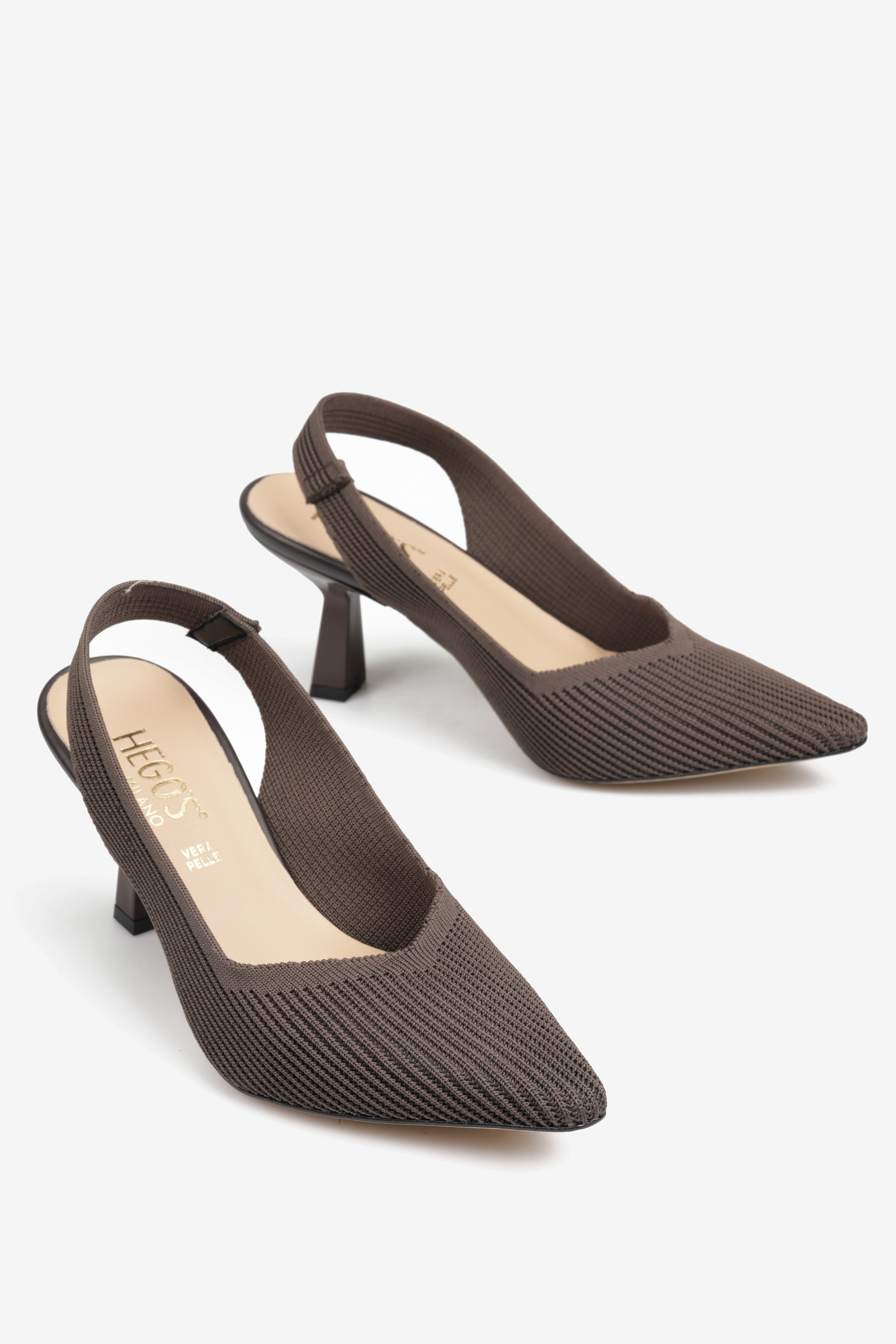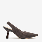 Szpilki z noskiem w szpic, wykonane z miękkiej tkaniny w prążki. Głębokie wycięcie i odkryta pięta z paskiem dopasowującym się do stopy.