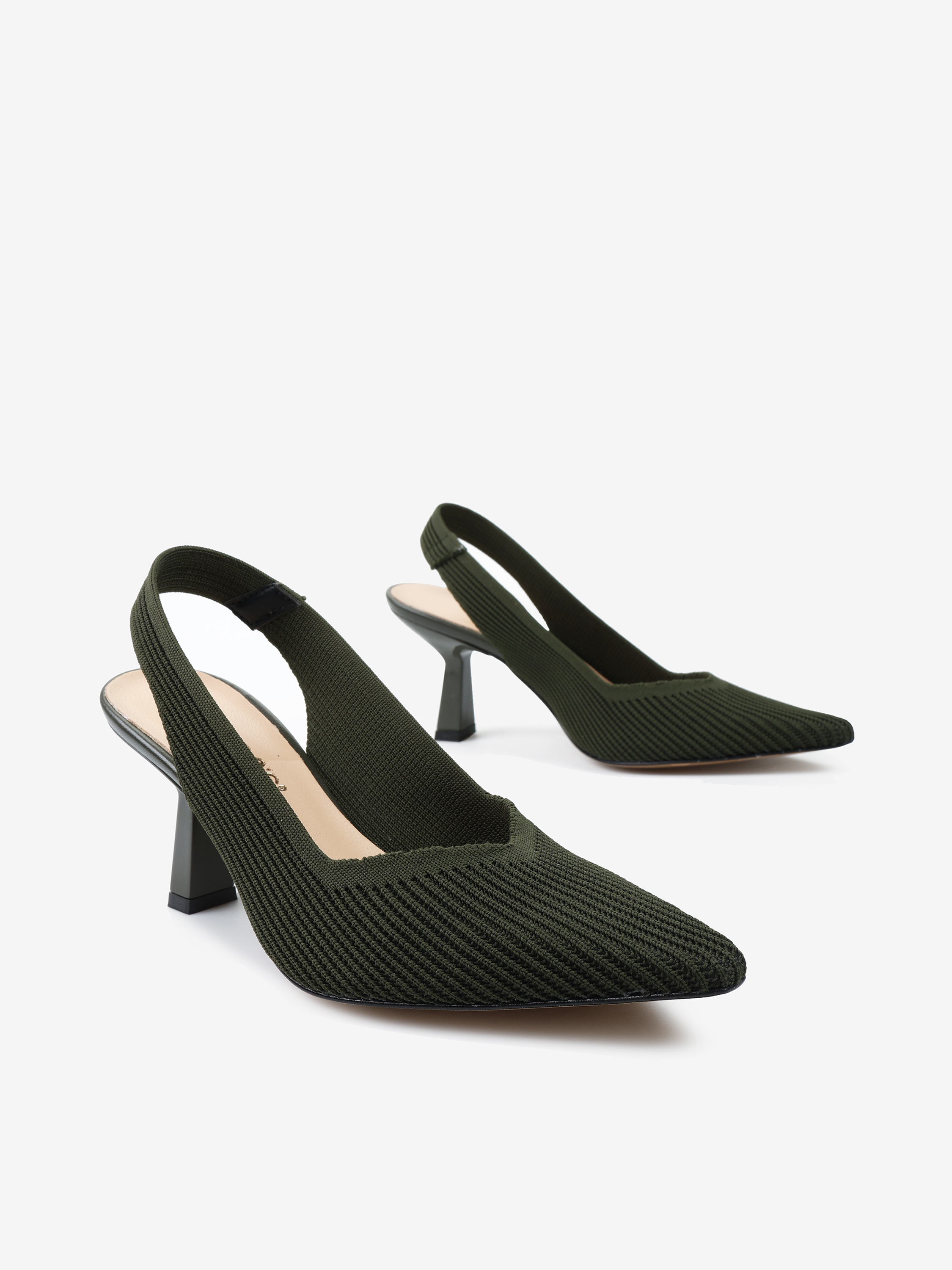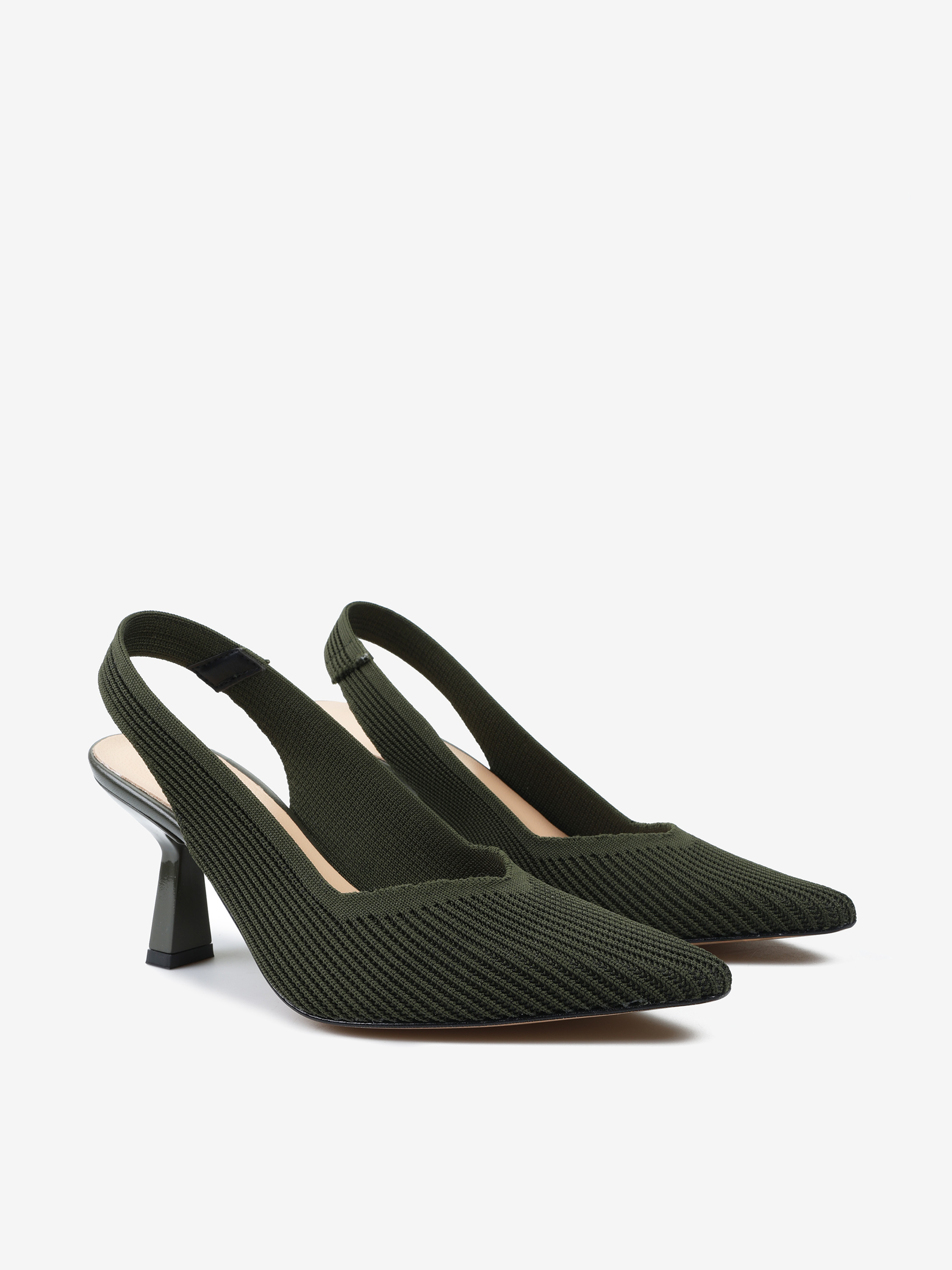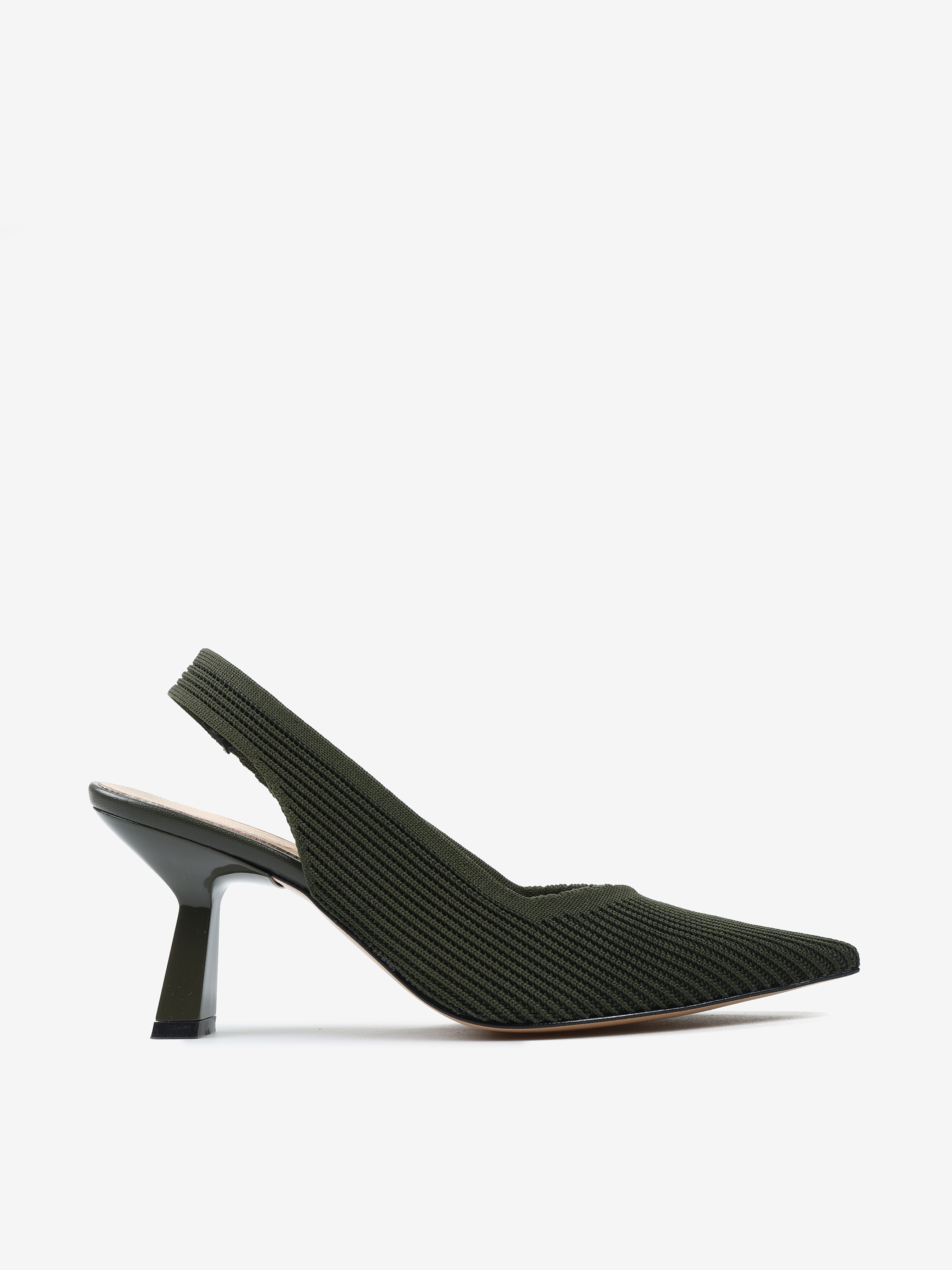 Szpilki z noskiem w szpic wykonane z miękkiej, prążkowanej tkaniny. Głębokie wycięcie i odkryta pięta z paskiem dopasowującym się do stopy