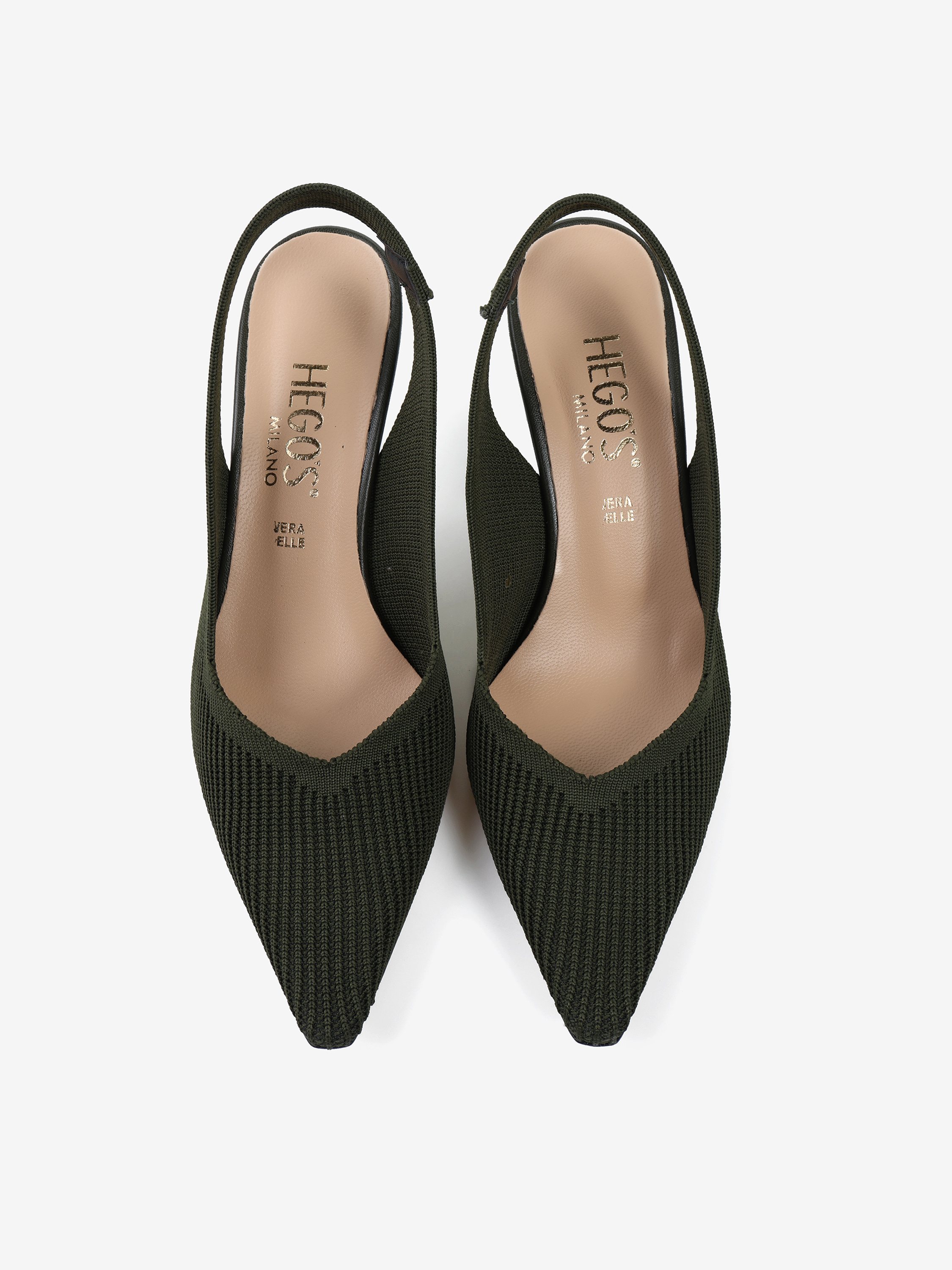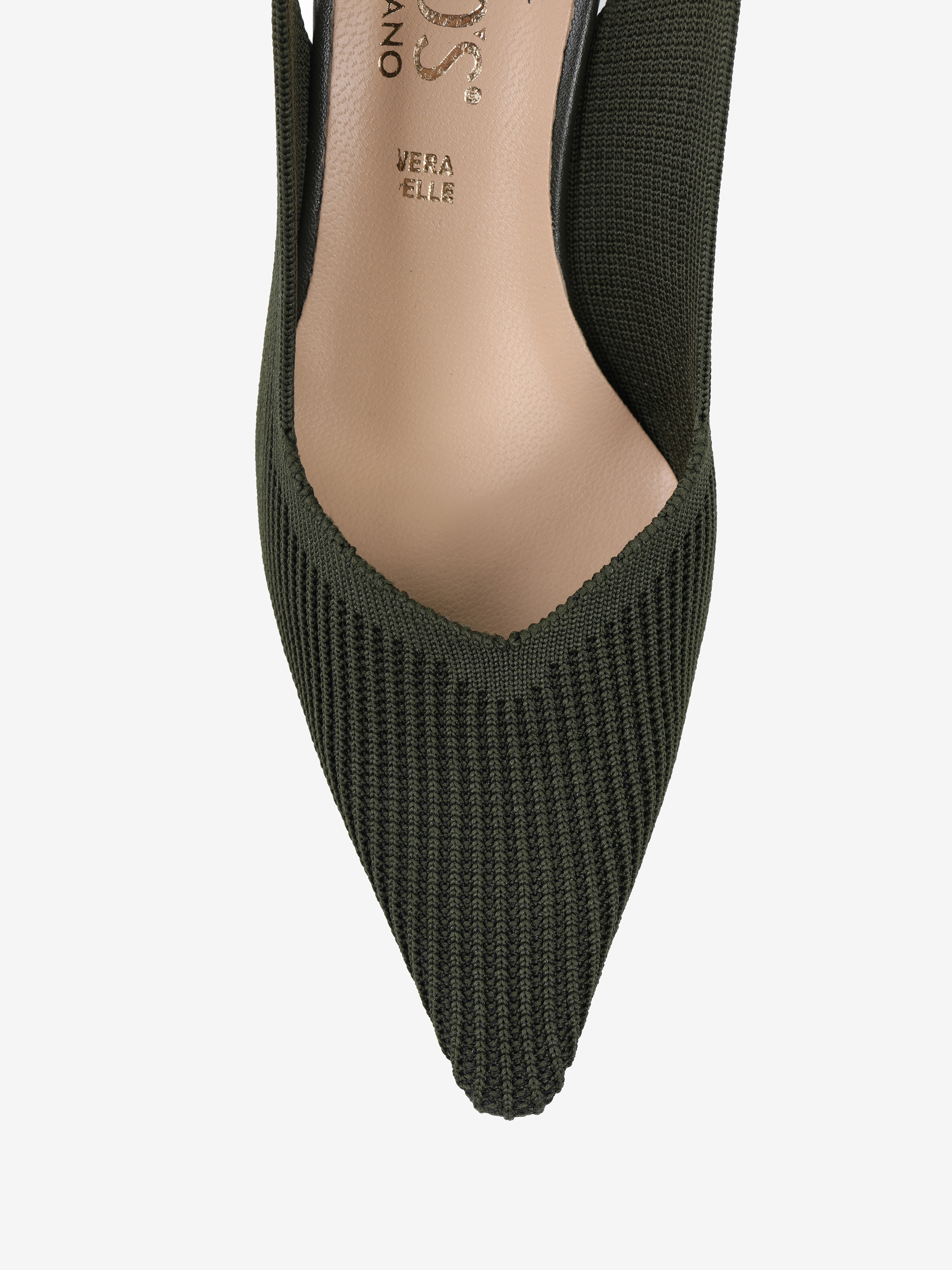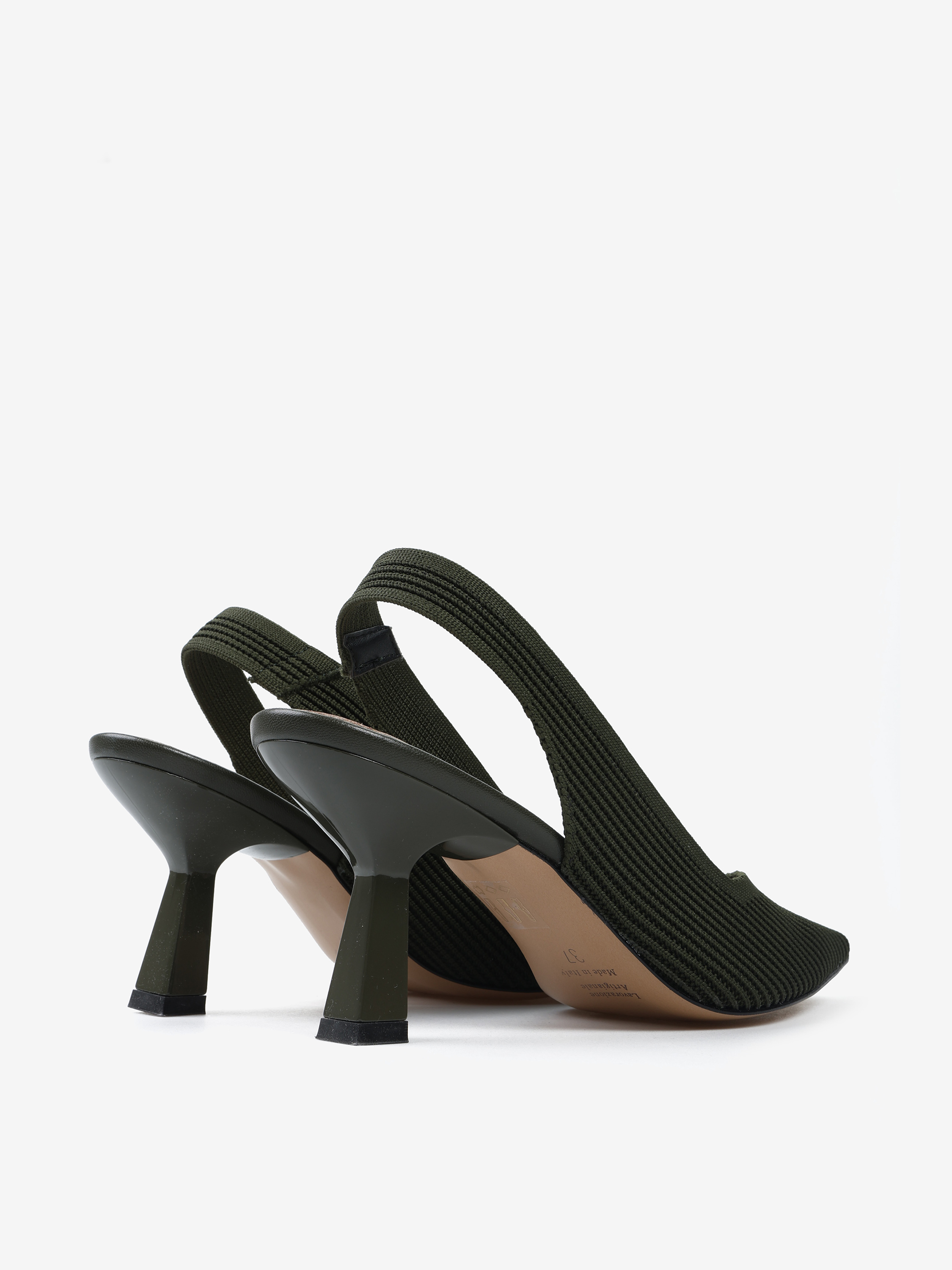 Szpilki z noskiem w szpic wykonane z miękkiej, prążkowanej tkaniny. Głębokie wycięcie i odkryta pięta z paskiem dopasowującym się do stopy