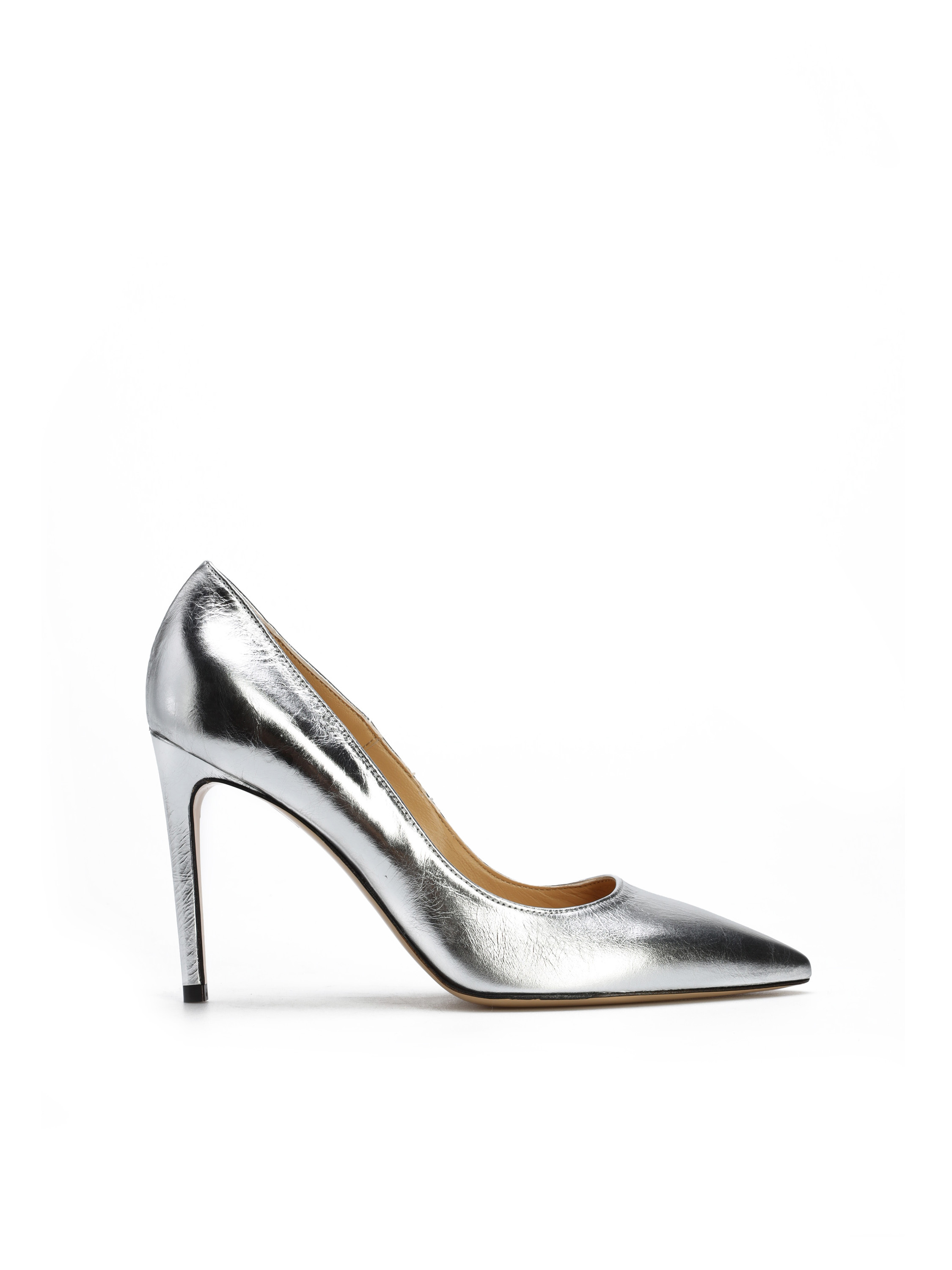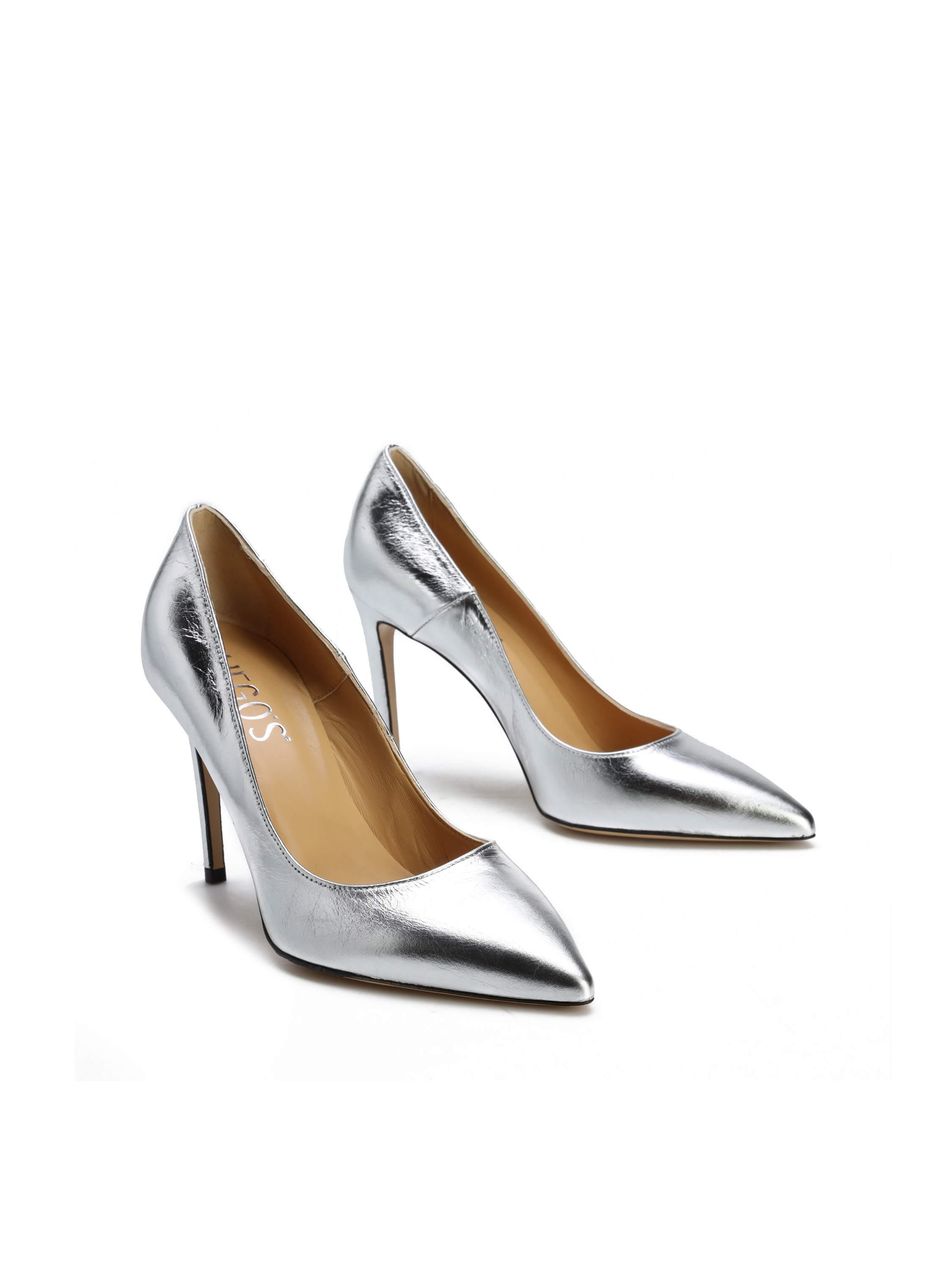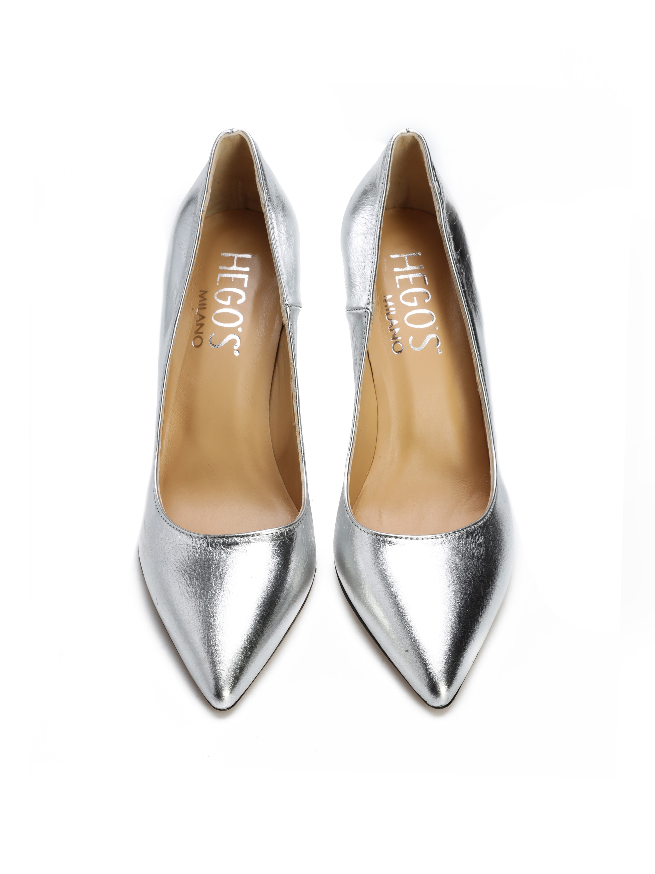 Szpilki w szpic wykonane są z włoskiej, metalizowanej skóry. Cholewka w modnym, srebrnym kolorze. Wygodny obcas na szpilce w połączeniu ze skórzaną wkładką zapewnią komfort podczas użytkowania obuwia.