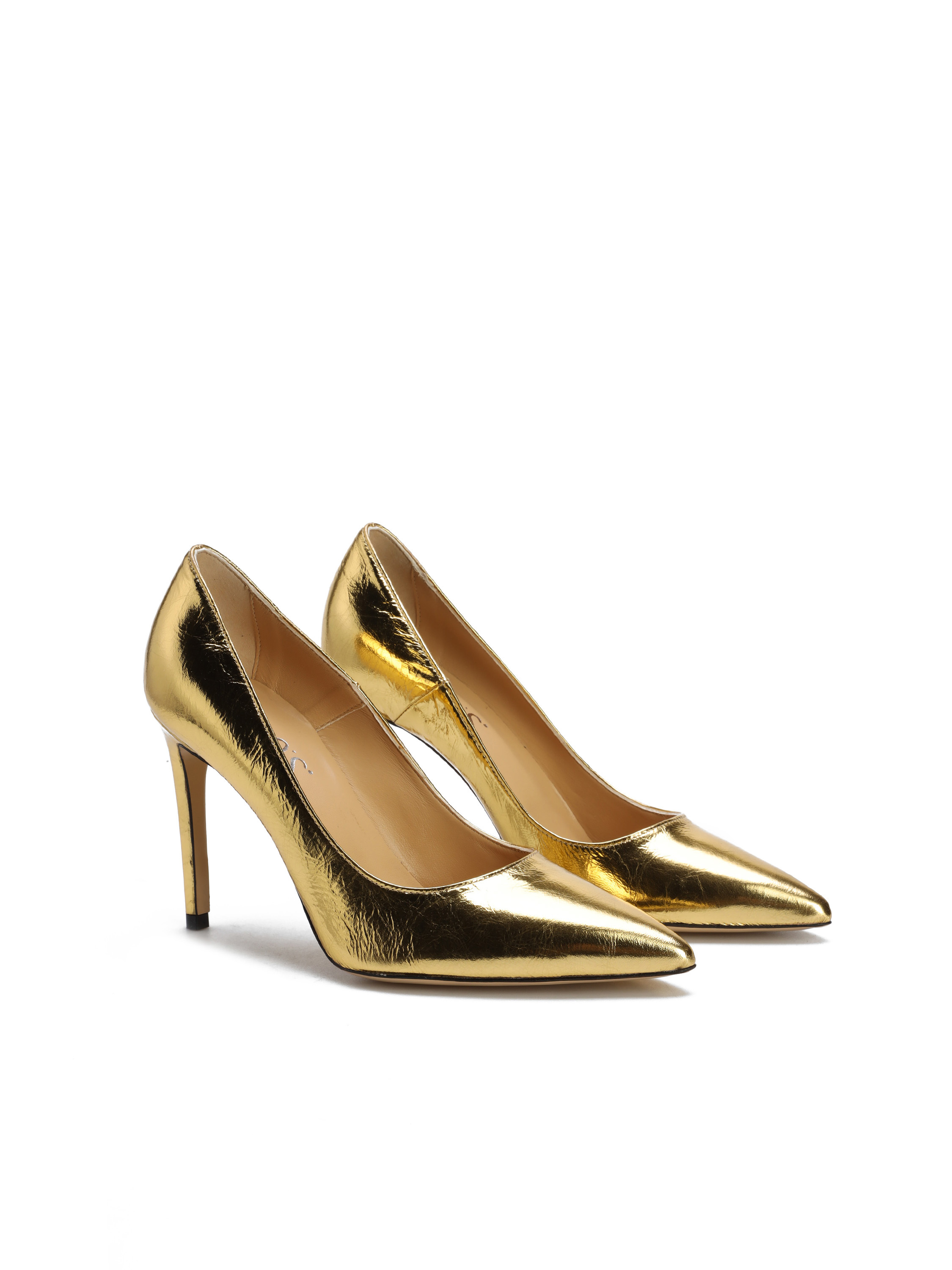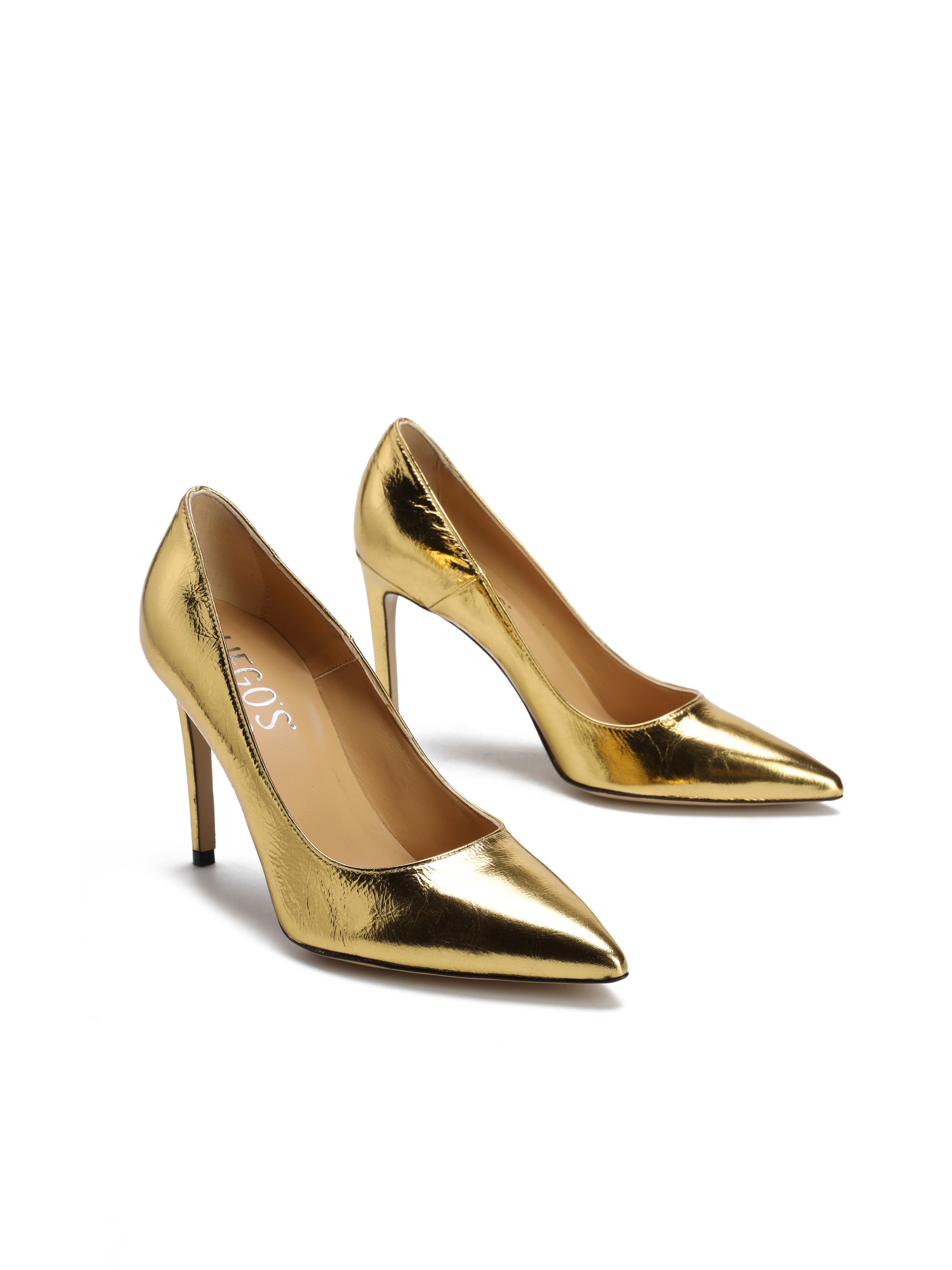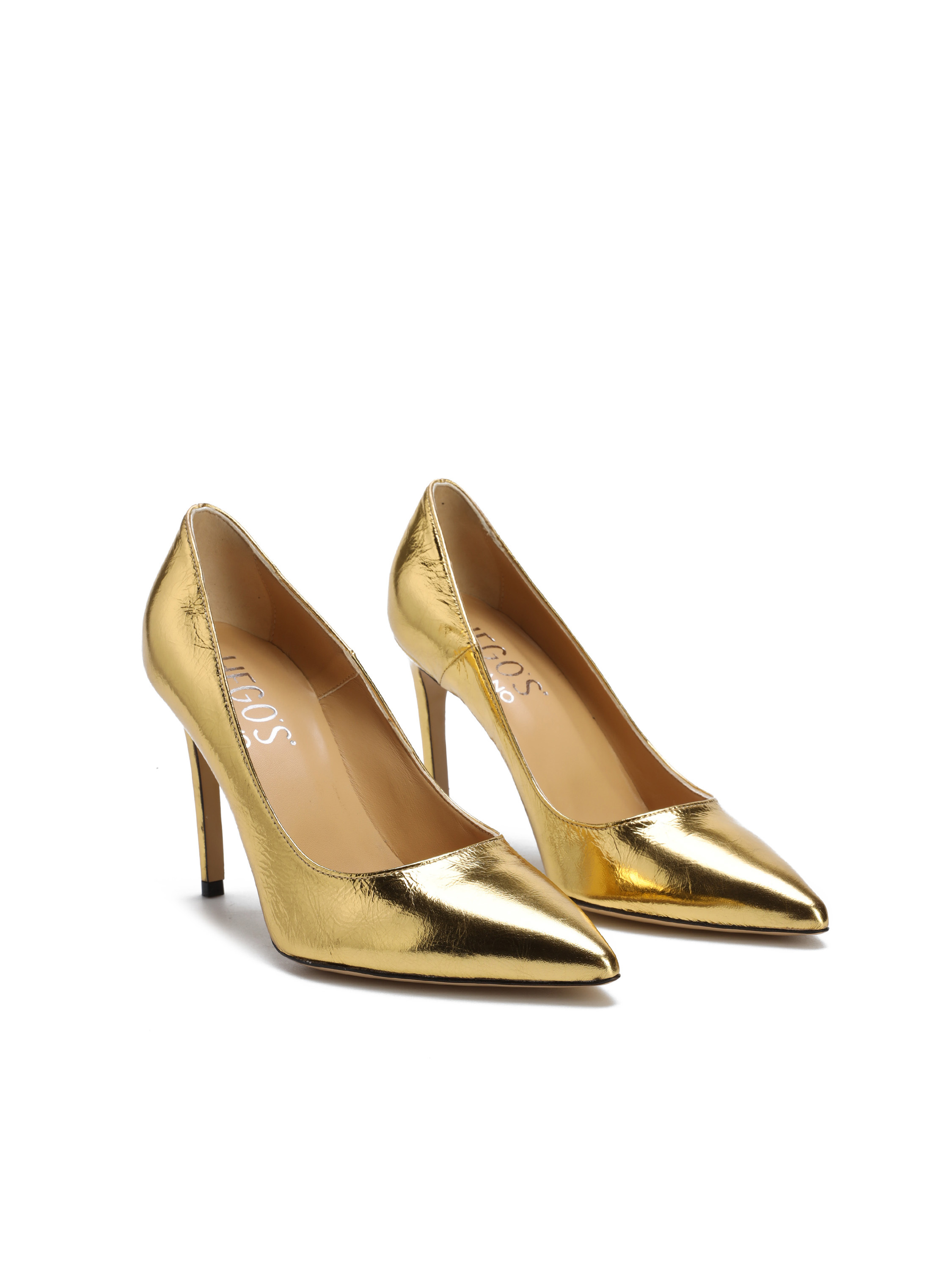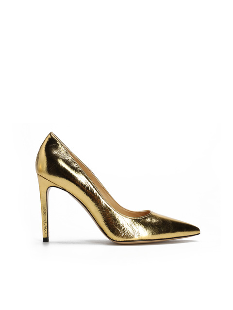 Szpilki w szpic wykonane są z włoskiej, metalizowanej skóry. Cholewka w złotym kolorze. Wygodny obcas na szpilce w połączeniu ze skórzaną wkładką zapewnią komfort podczas użytkowania obuwia.