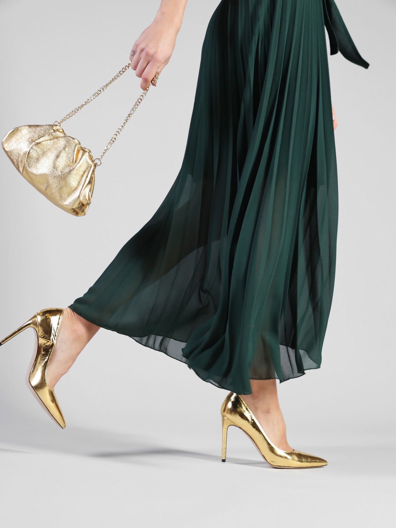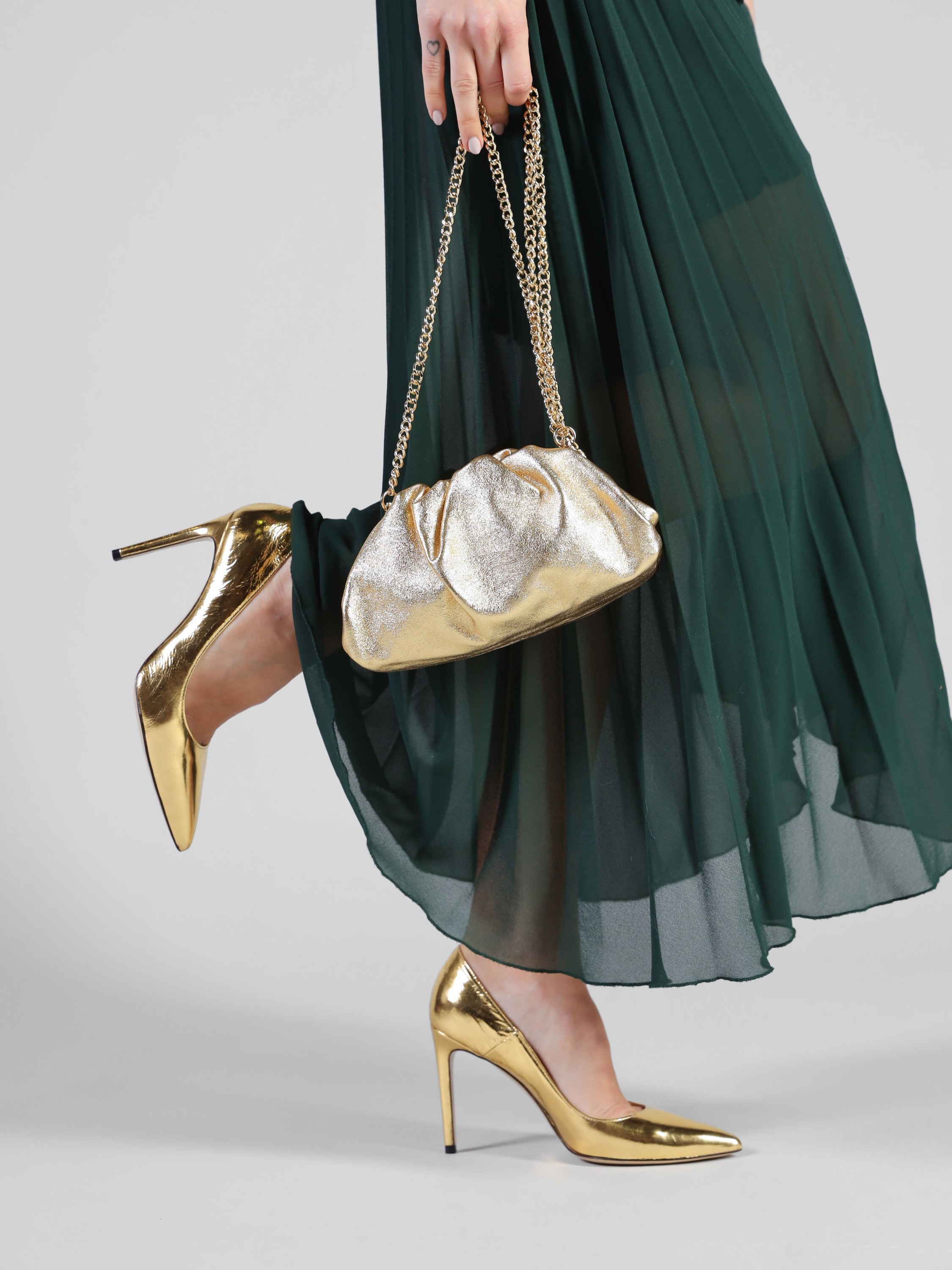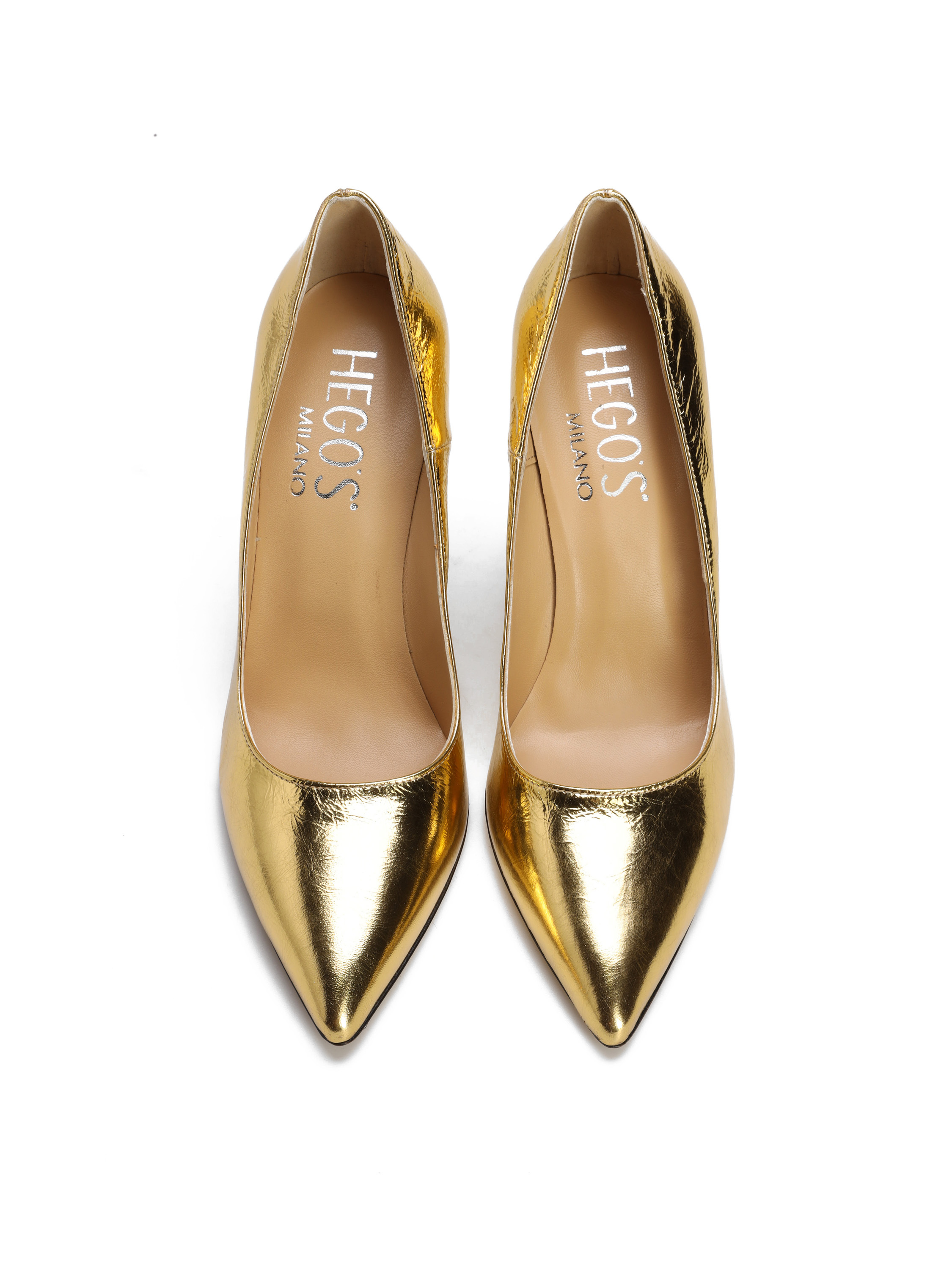 Szpilki w szpic wykonane są z włoskiej, metalizowanej skóry. Cholewka w złotym kolorze. Wygodny obcas na szpilce w połączeniu ze skórzaną wkładką zapewnią komfort podczas użytkowania obuwia.