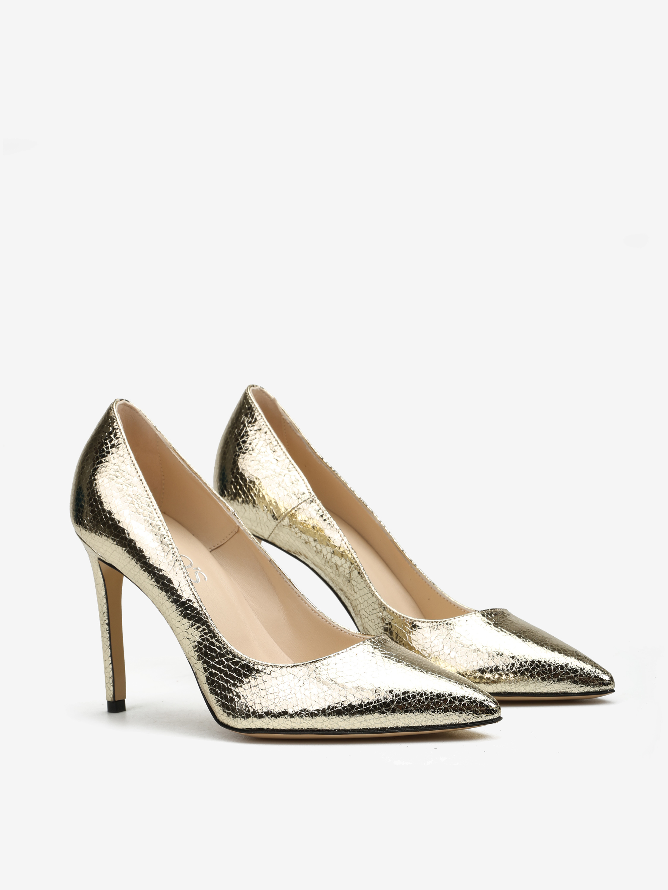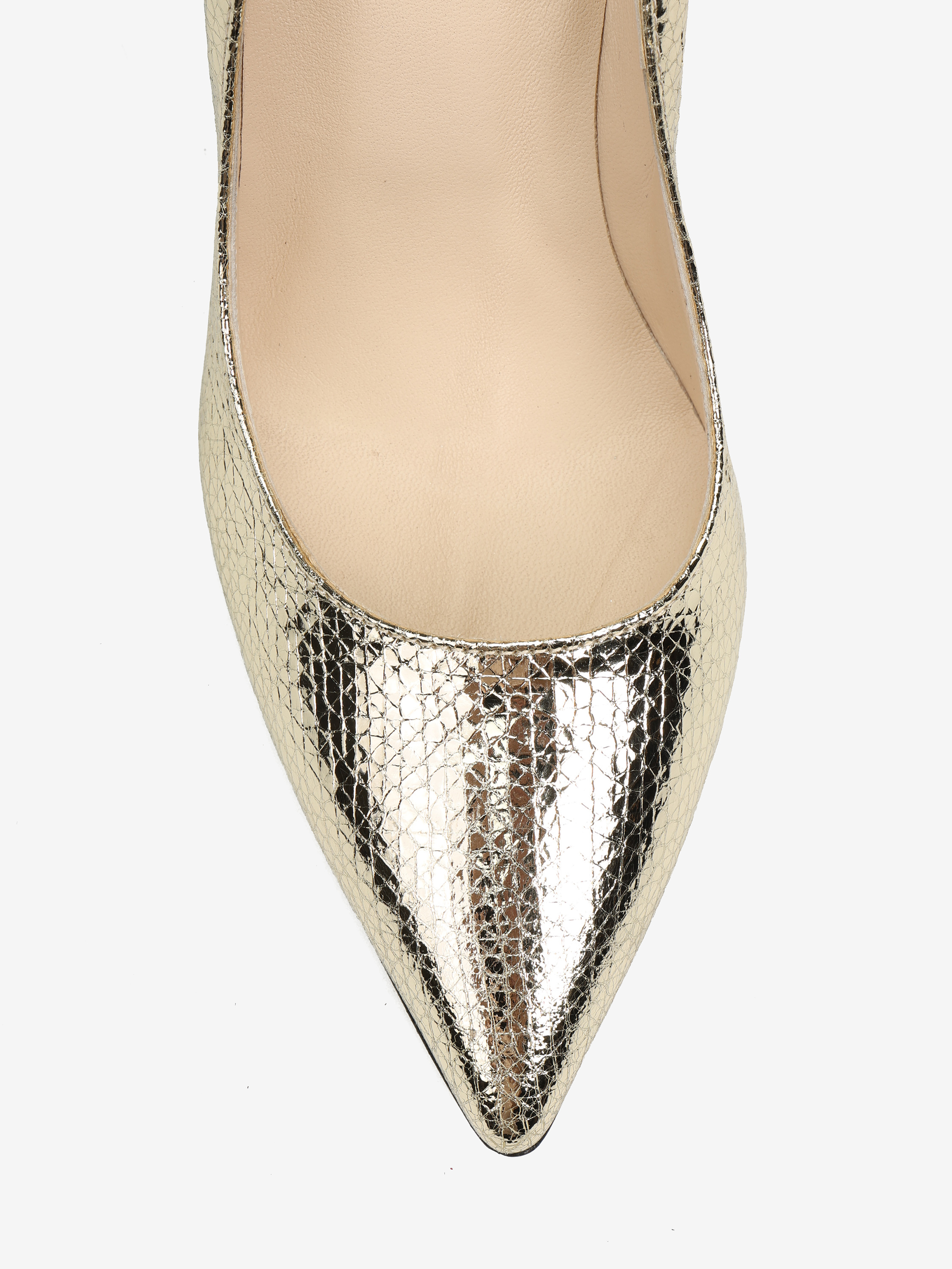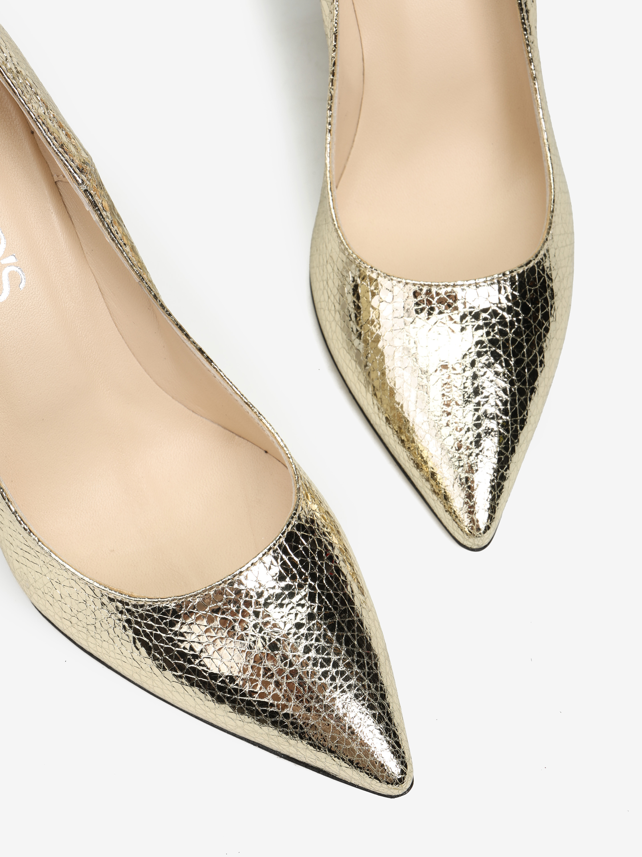 Ponadczasowe, klasyczne szpilki z noskami w szpic. Wykonane z włoskiej skóry metalizowanej w złotym kolorze.
