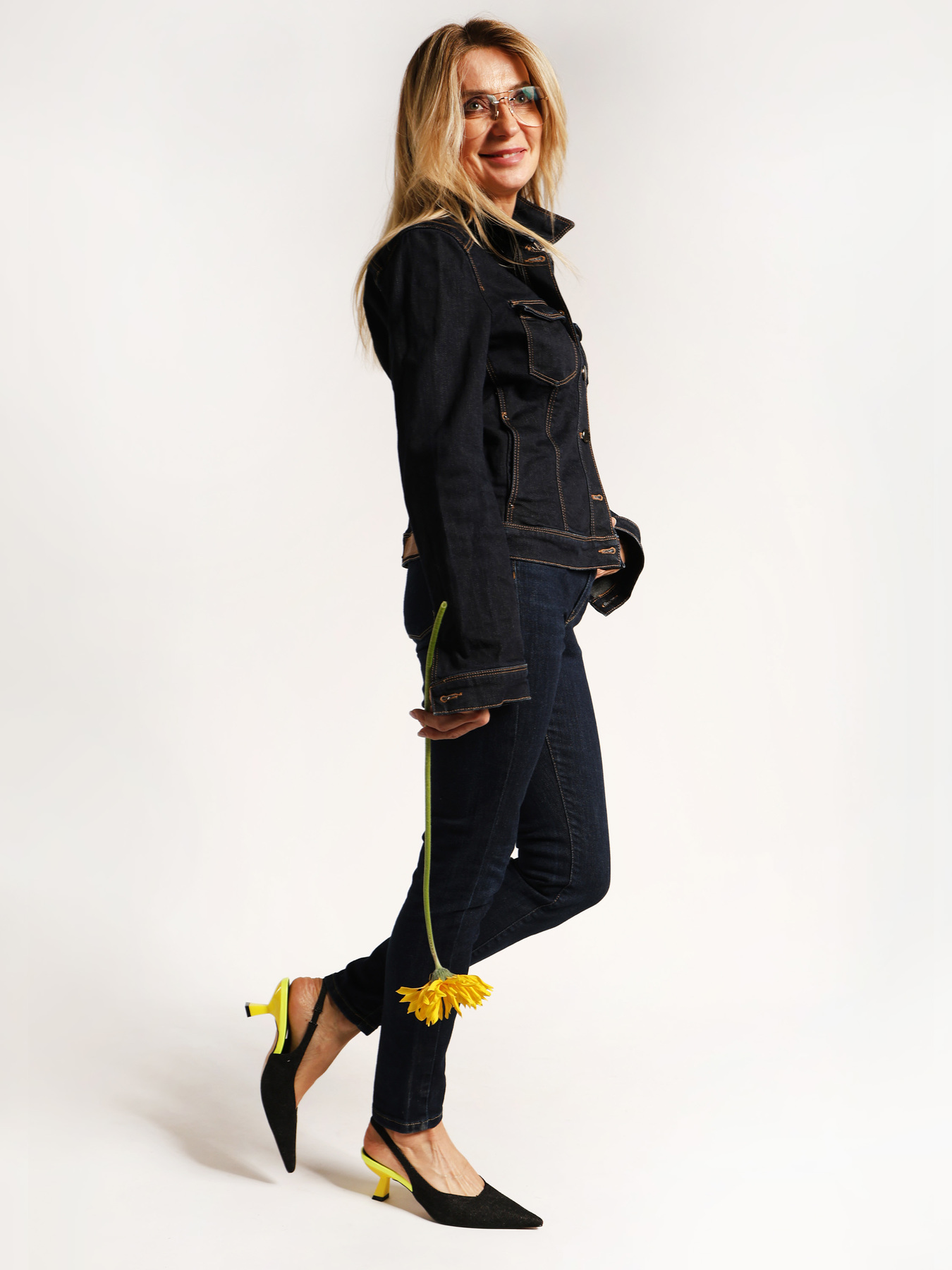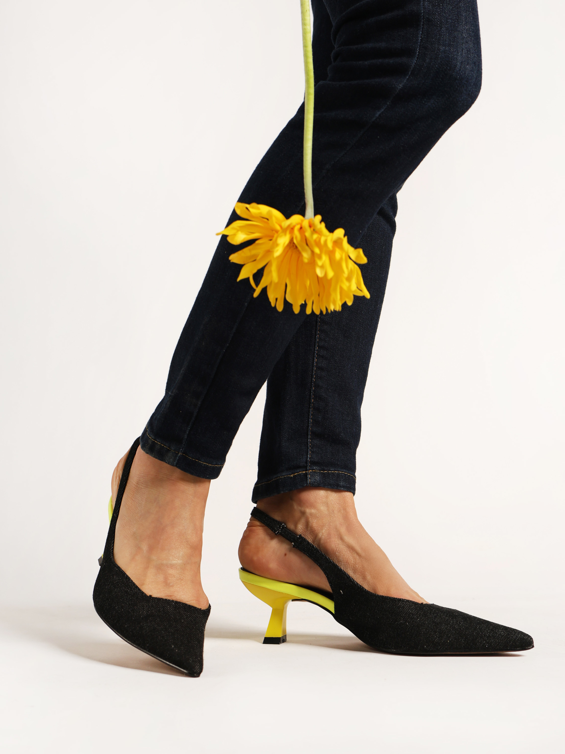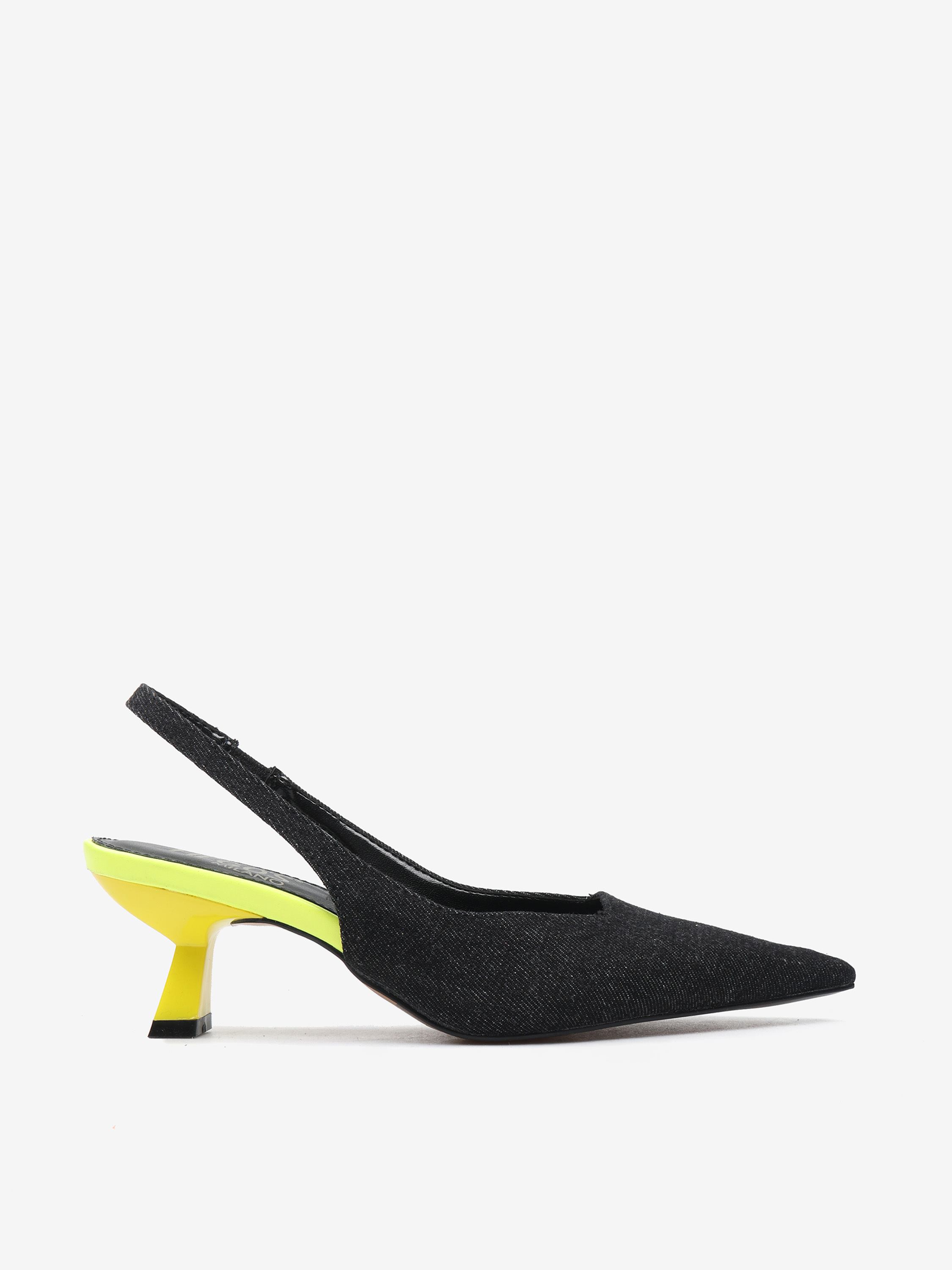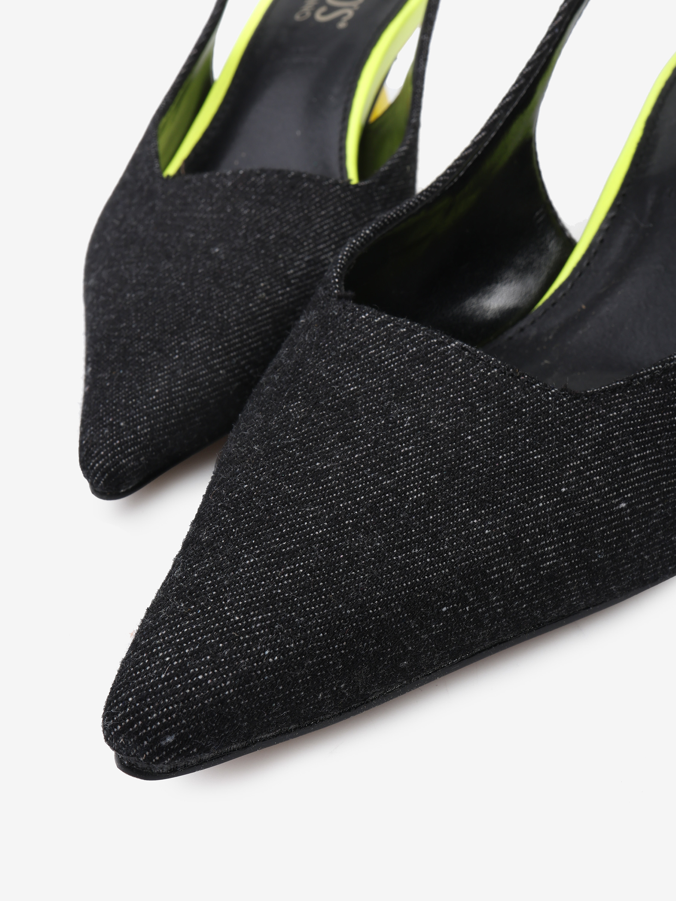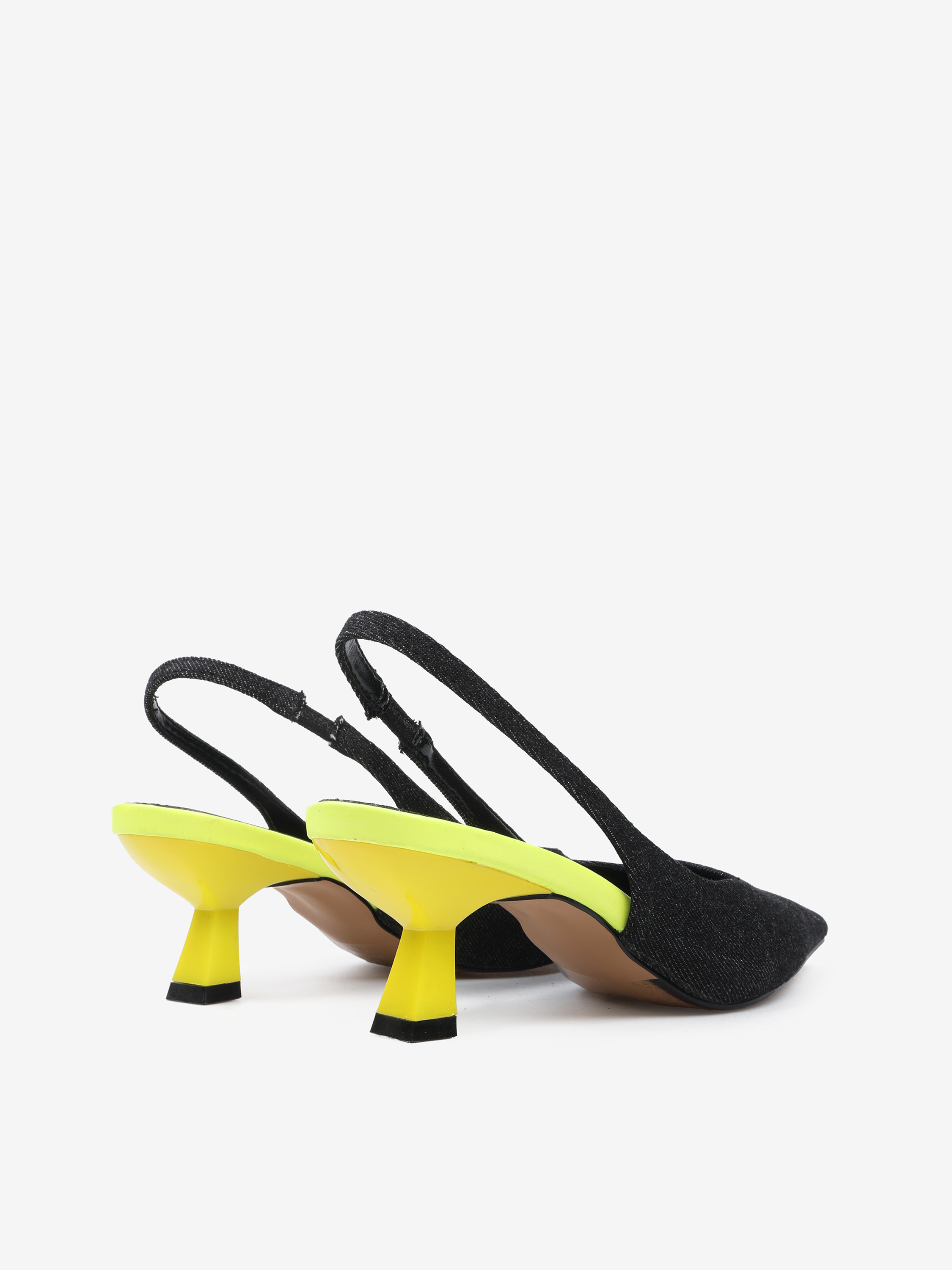 Czółenka z ciemnego jeansu na neonowej szpilce. Nosek w szpic i odkryta pięta z paskiem dopasowującym się do stopy.