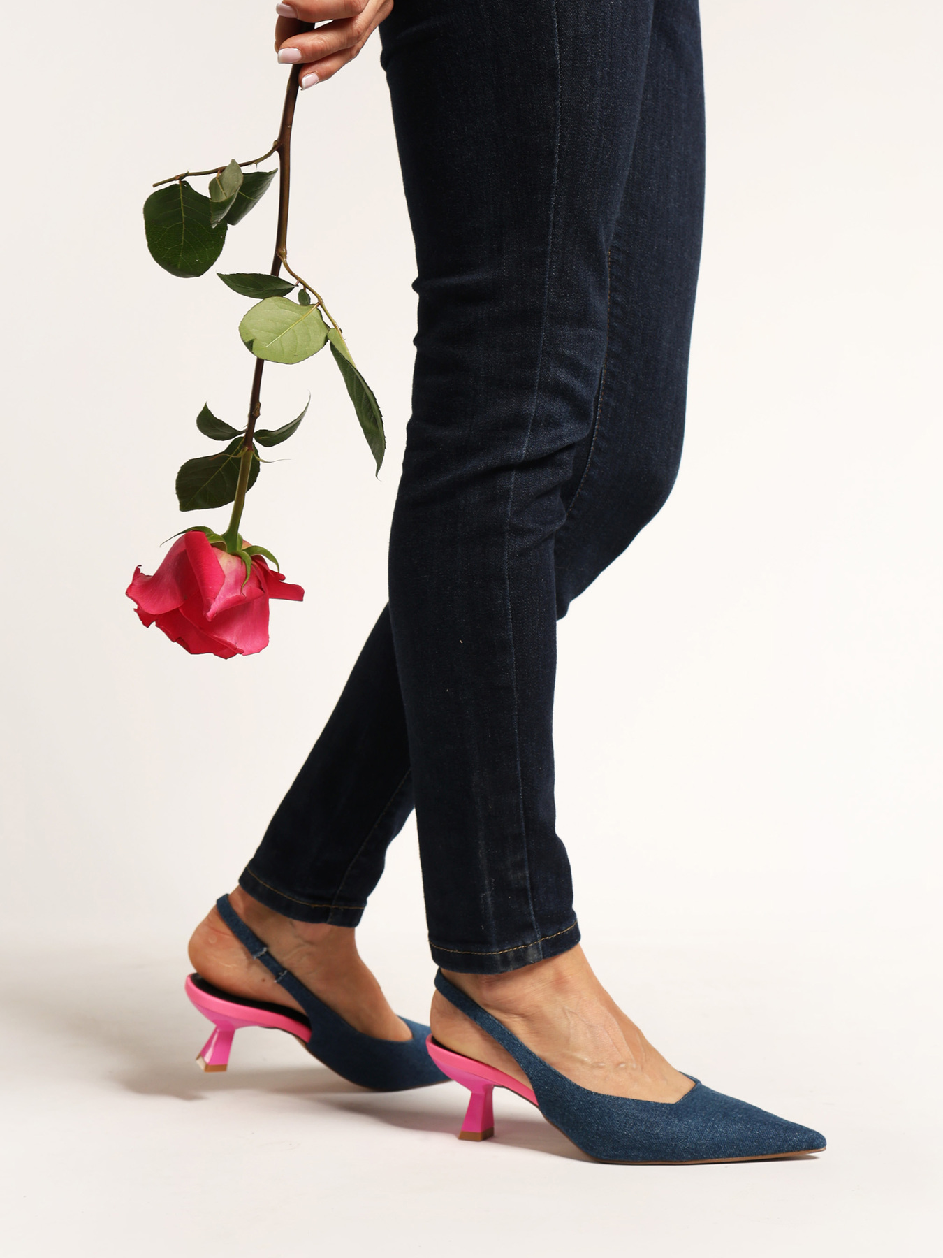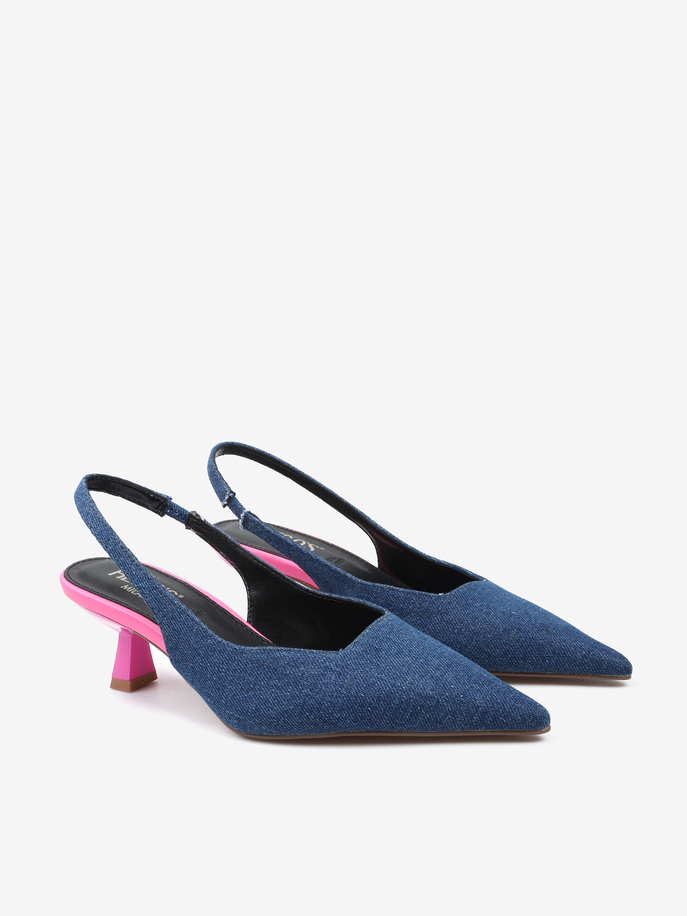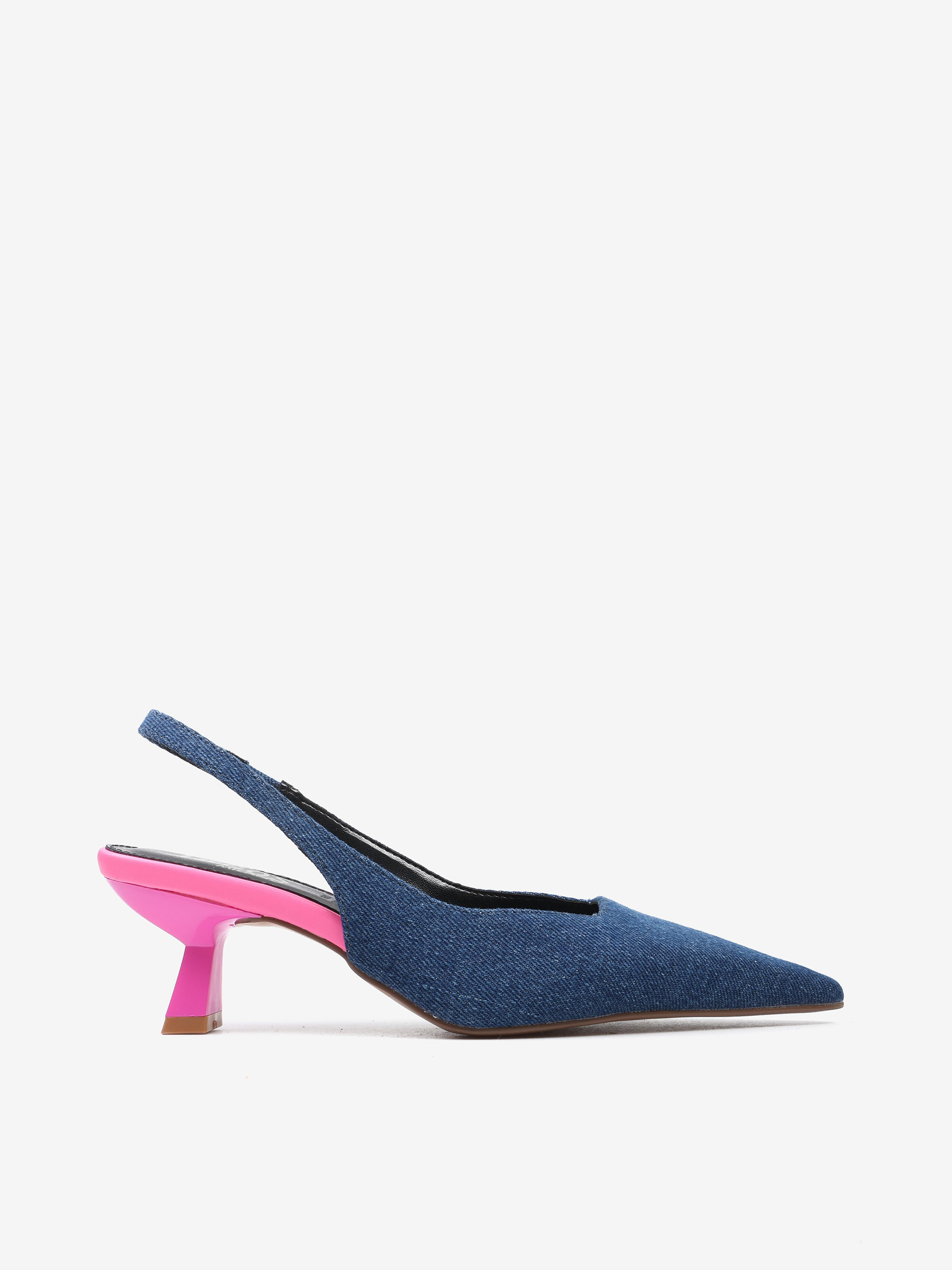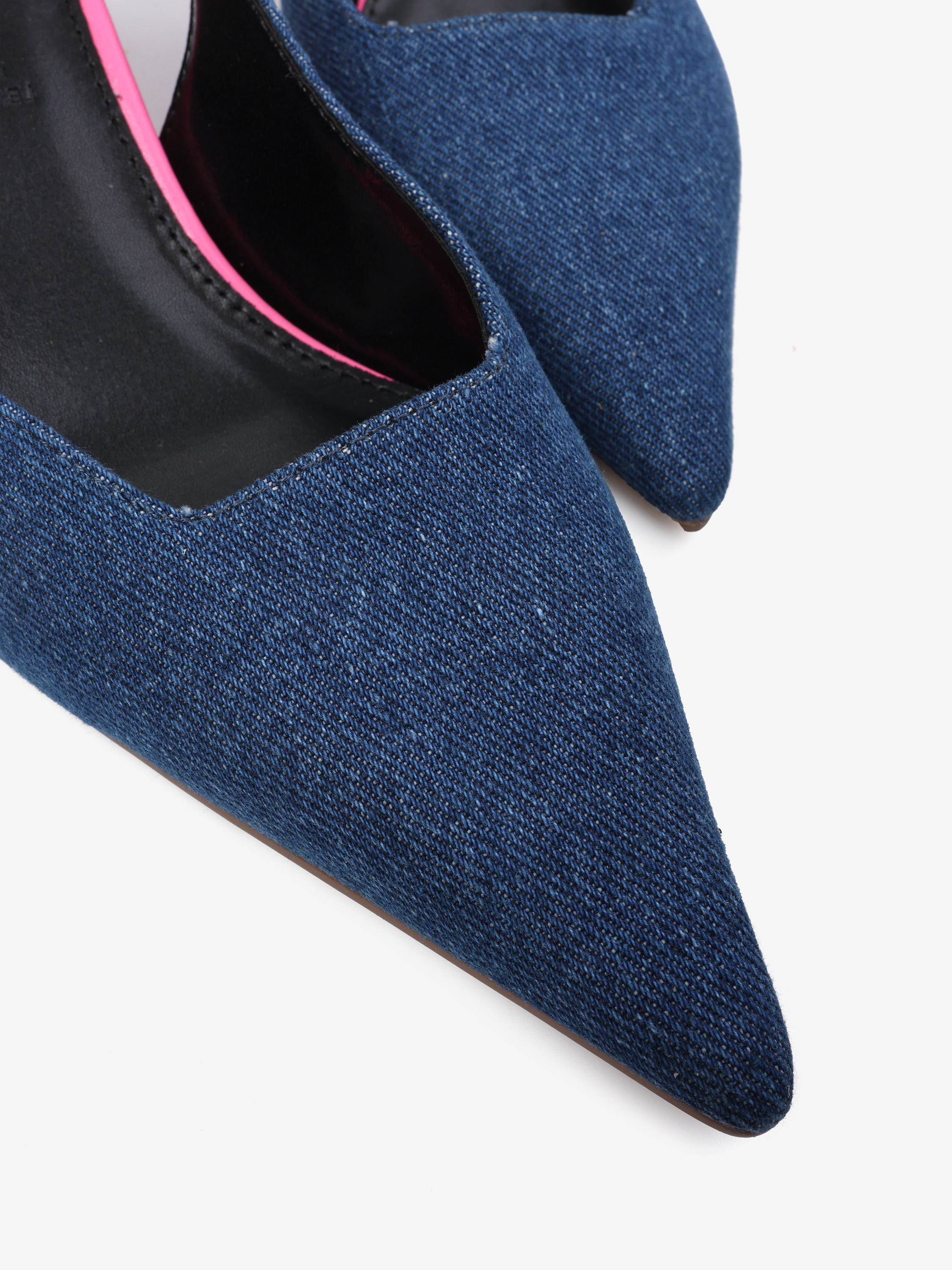 Jeansowe czółenka na neonowej szpilce. Nosek w szpic i odkryta pięta z paskiem dopasowującym się do stopy.