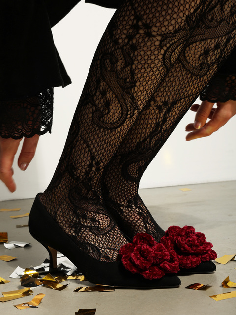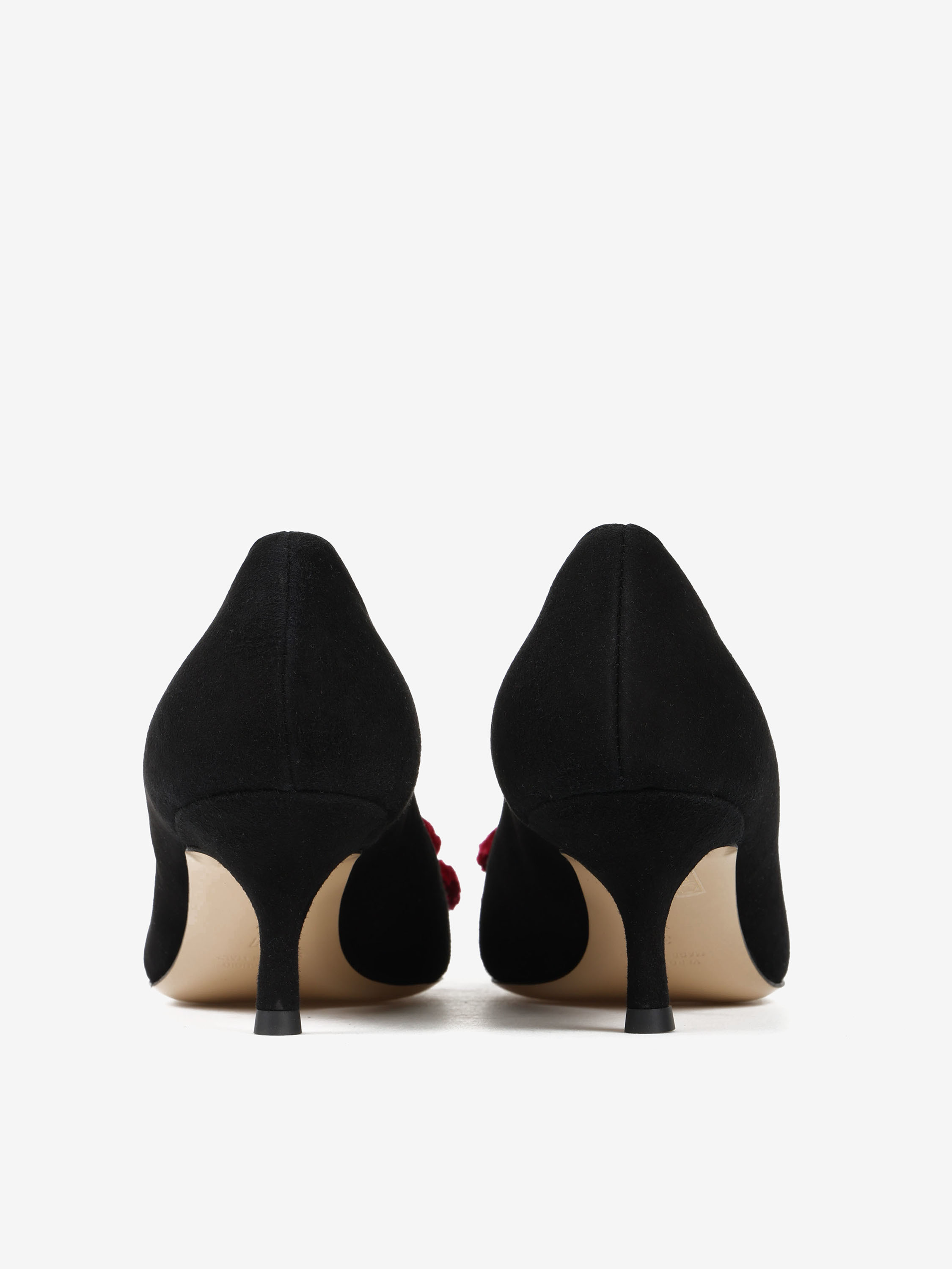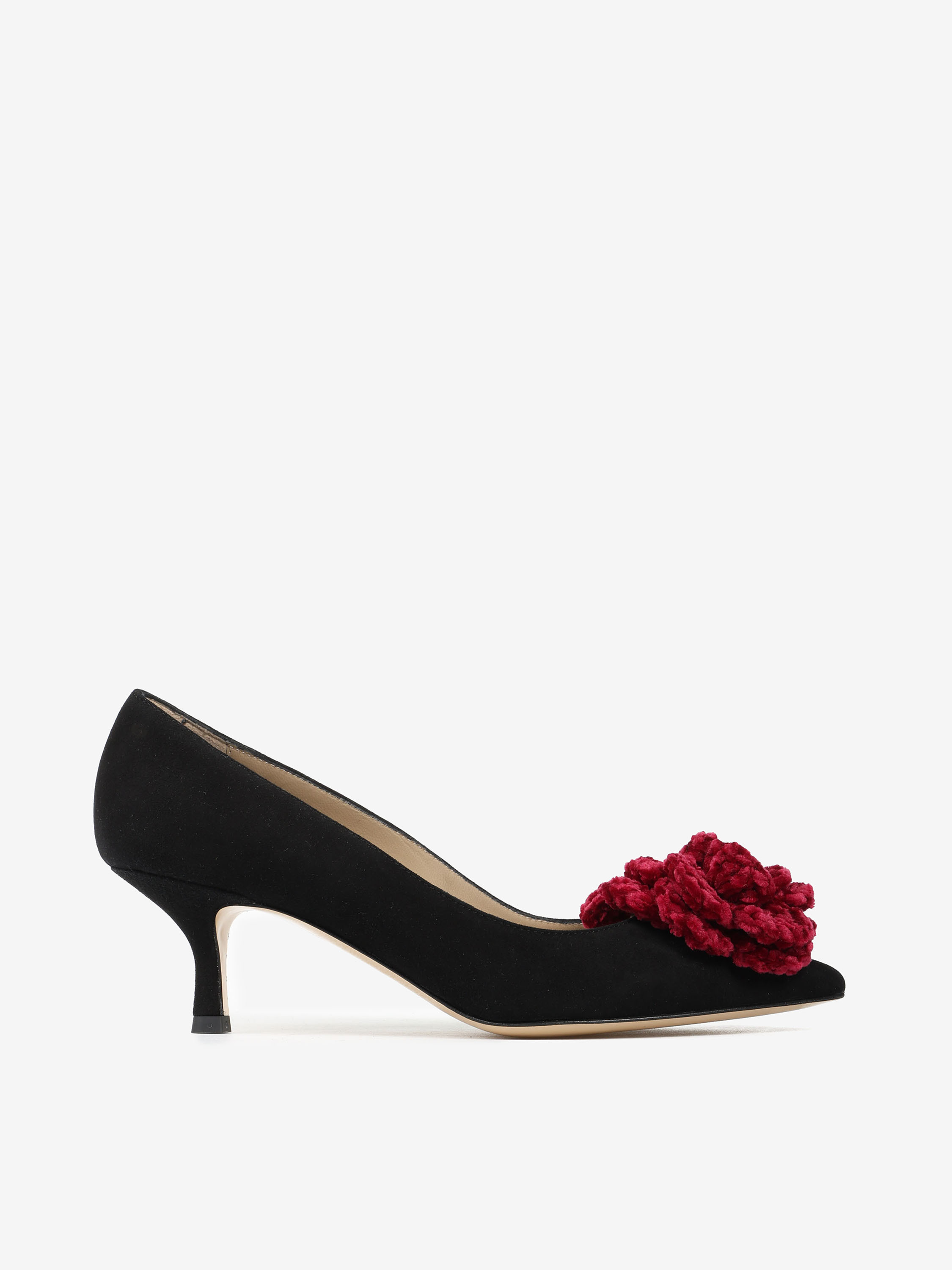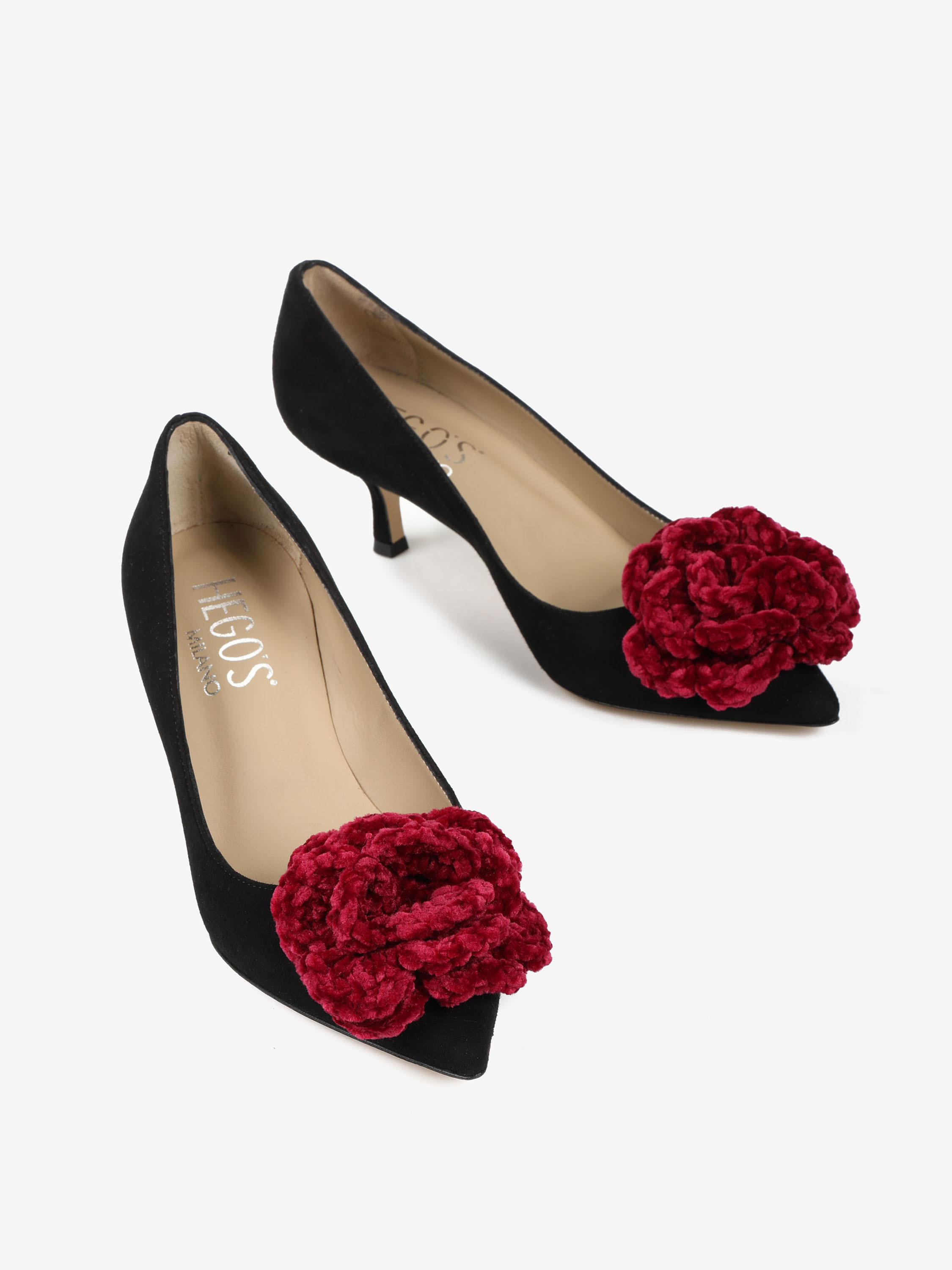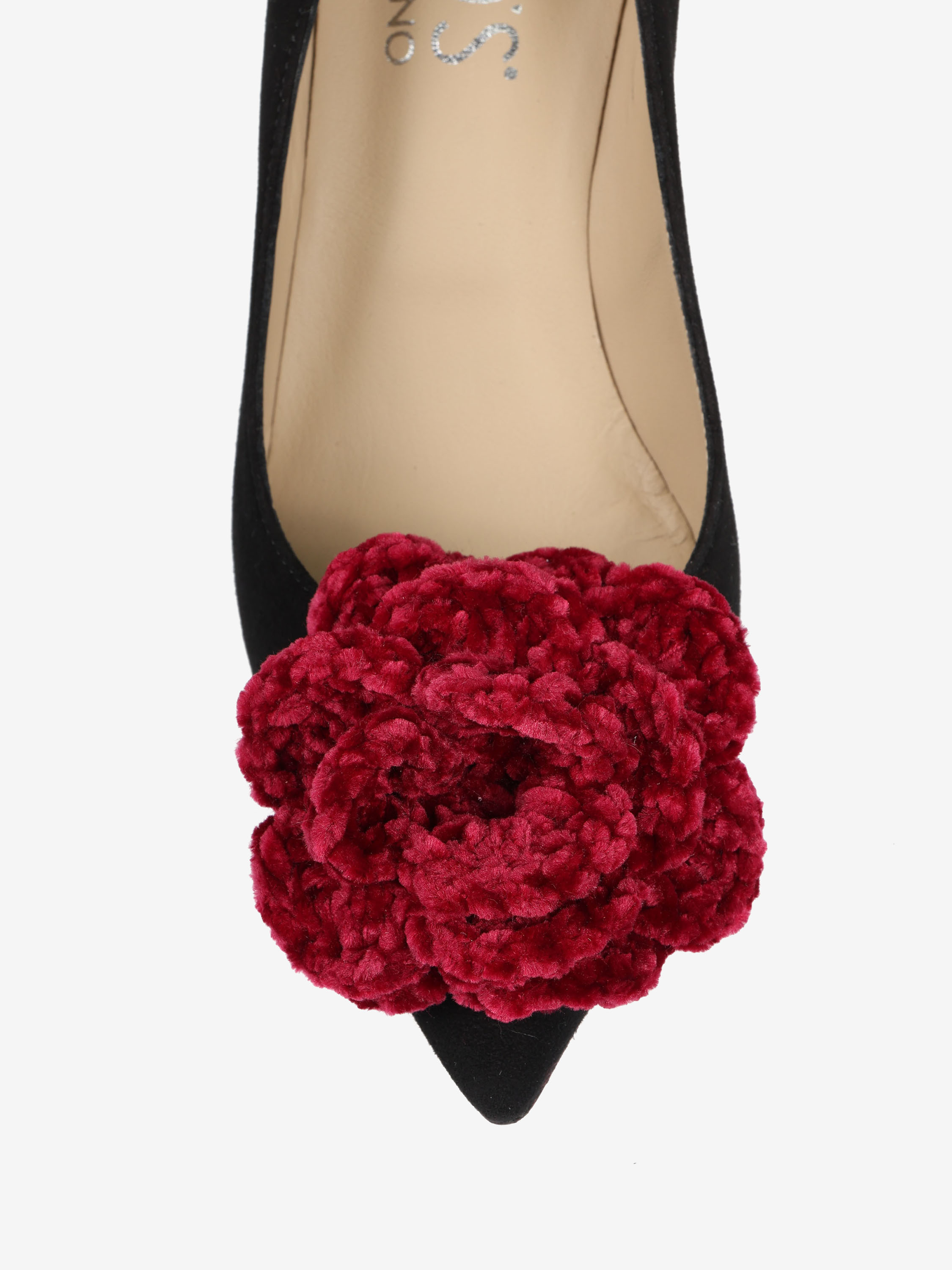 Zamszowe szpilki z noskiem w szpic ozdobione szydełkowym, bordowym kwiatem.