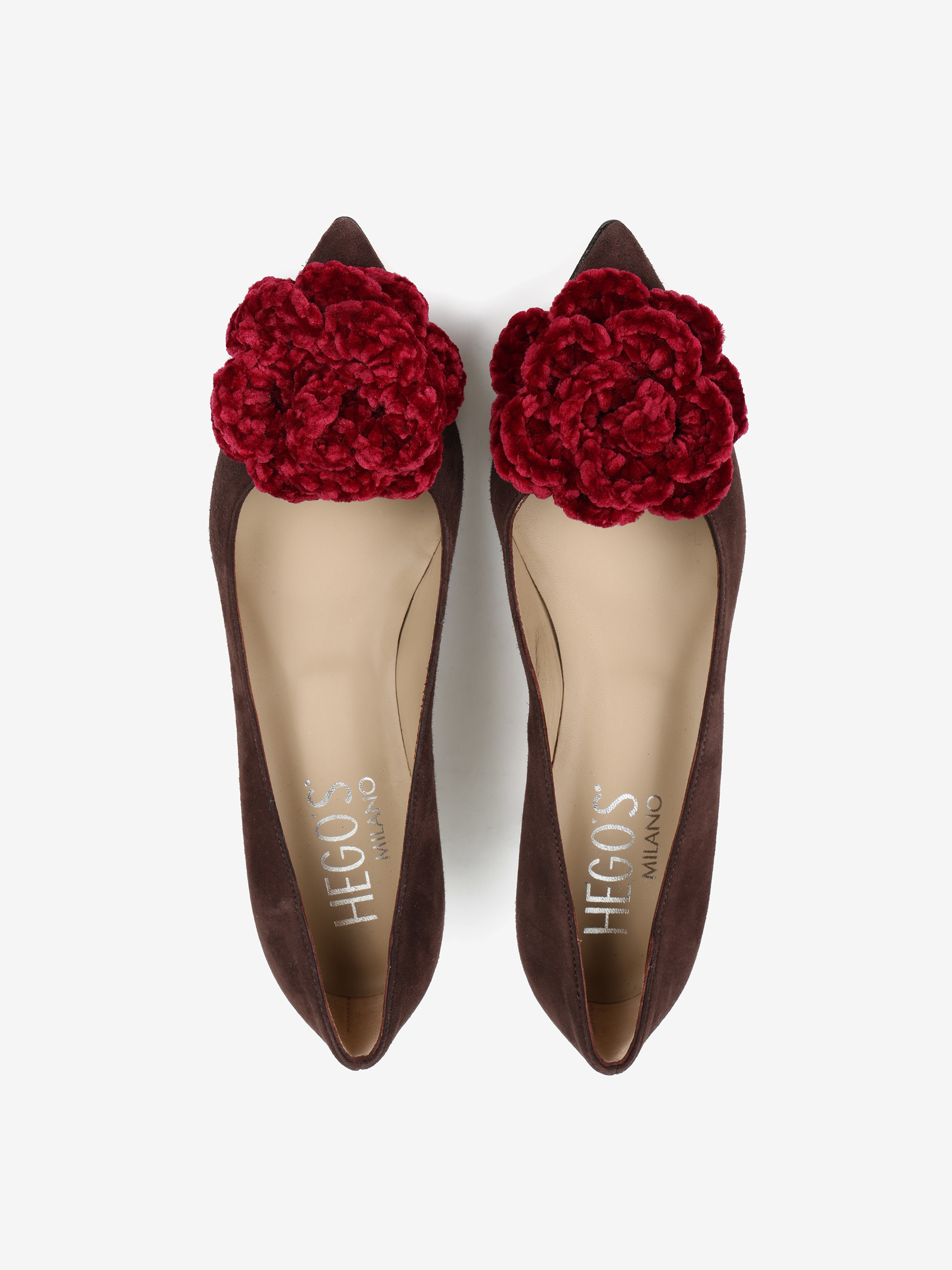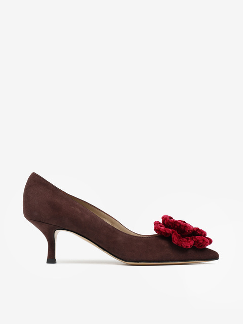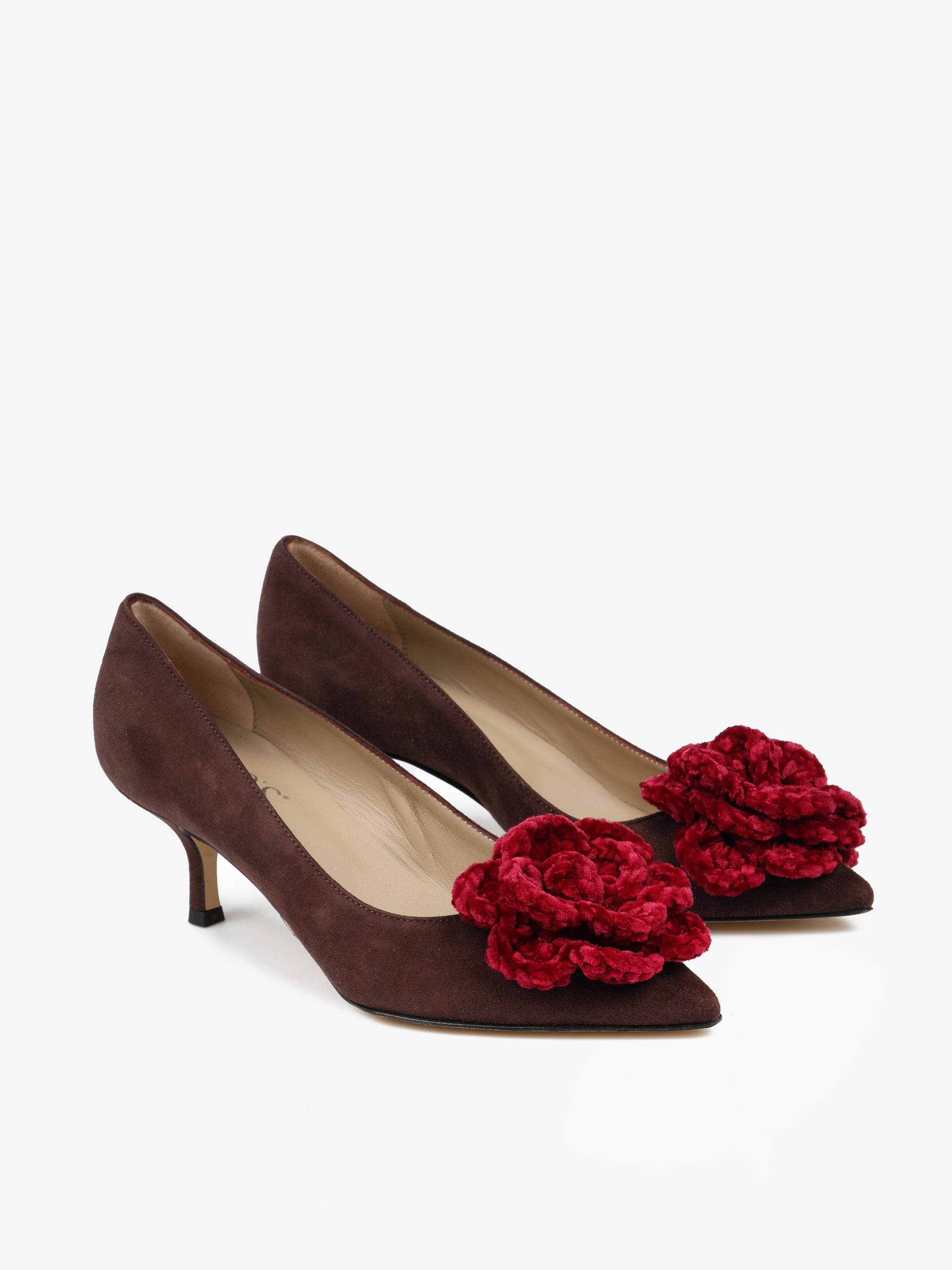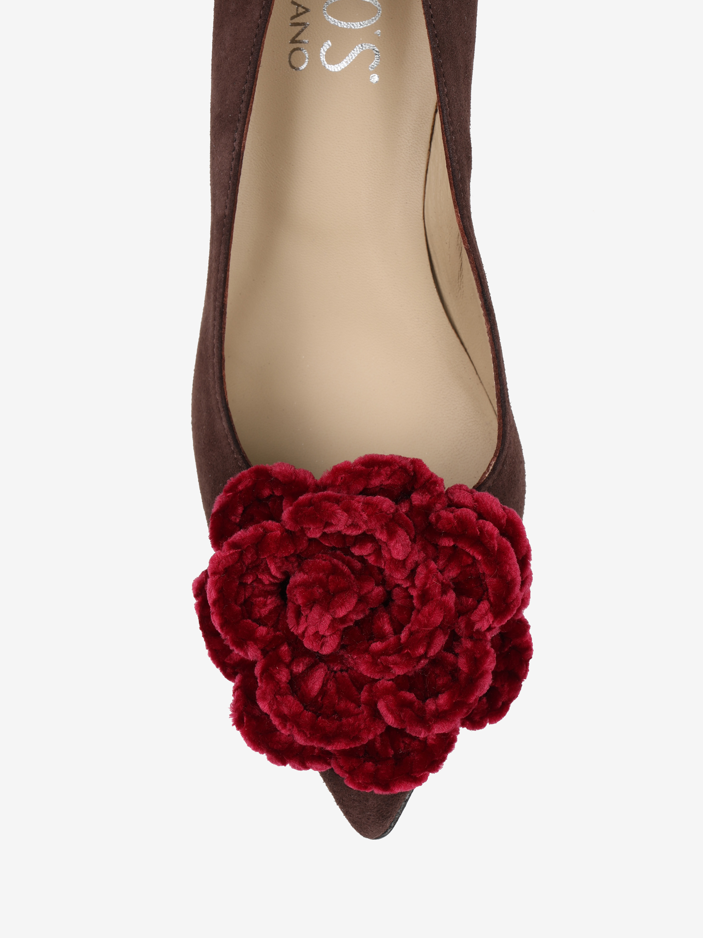 Zamszowe szpilki z noskiem w szpic ozdobione szydełkowym, bordowym kwiatem.