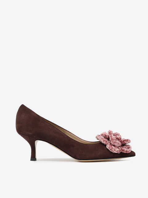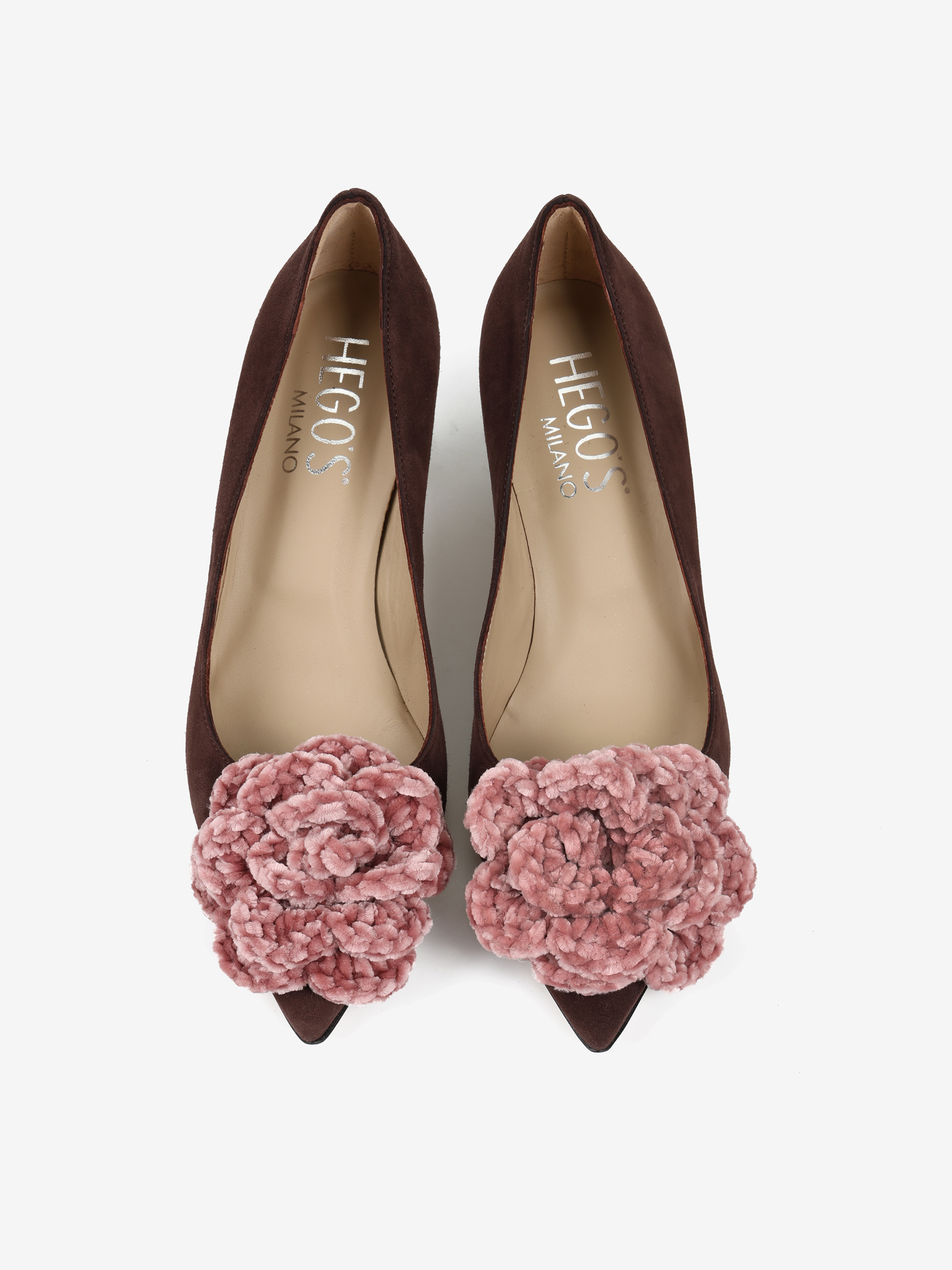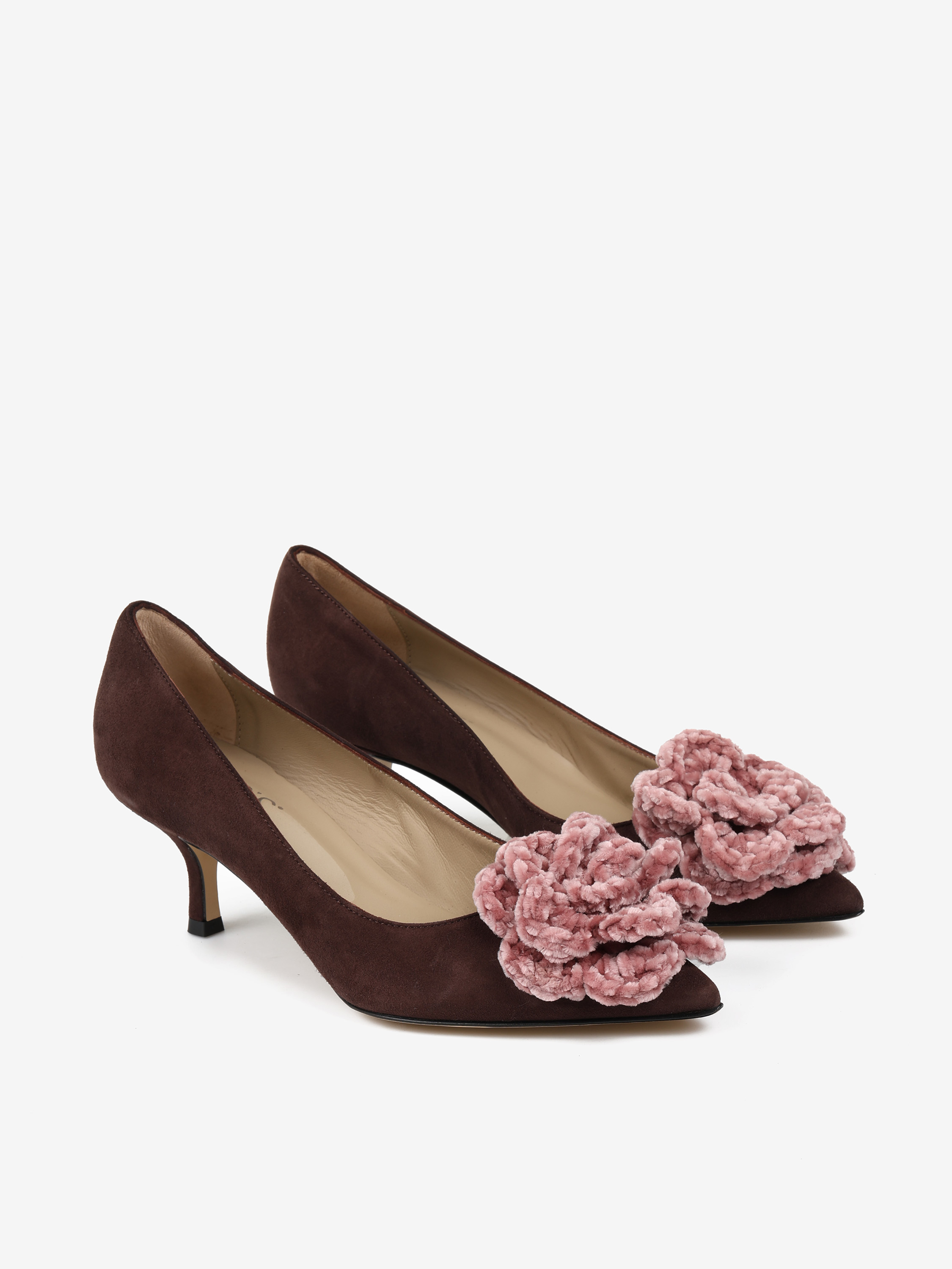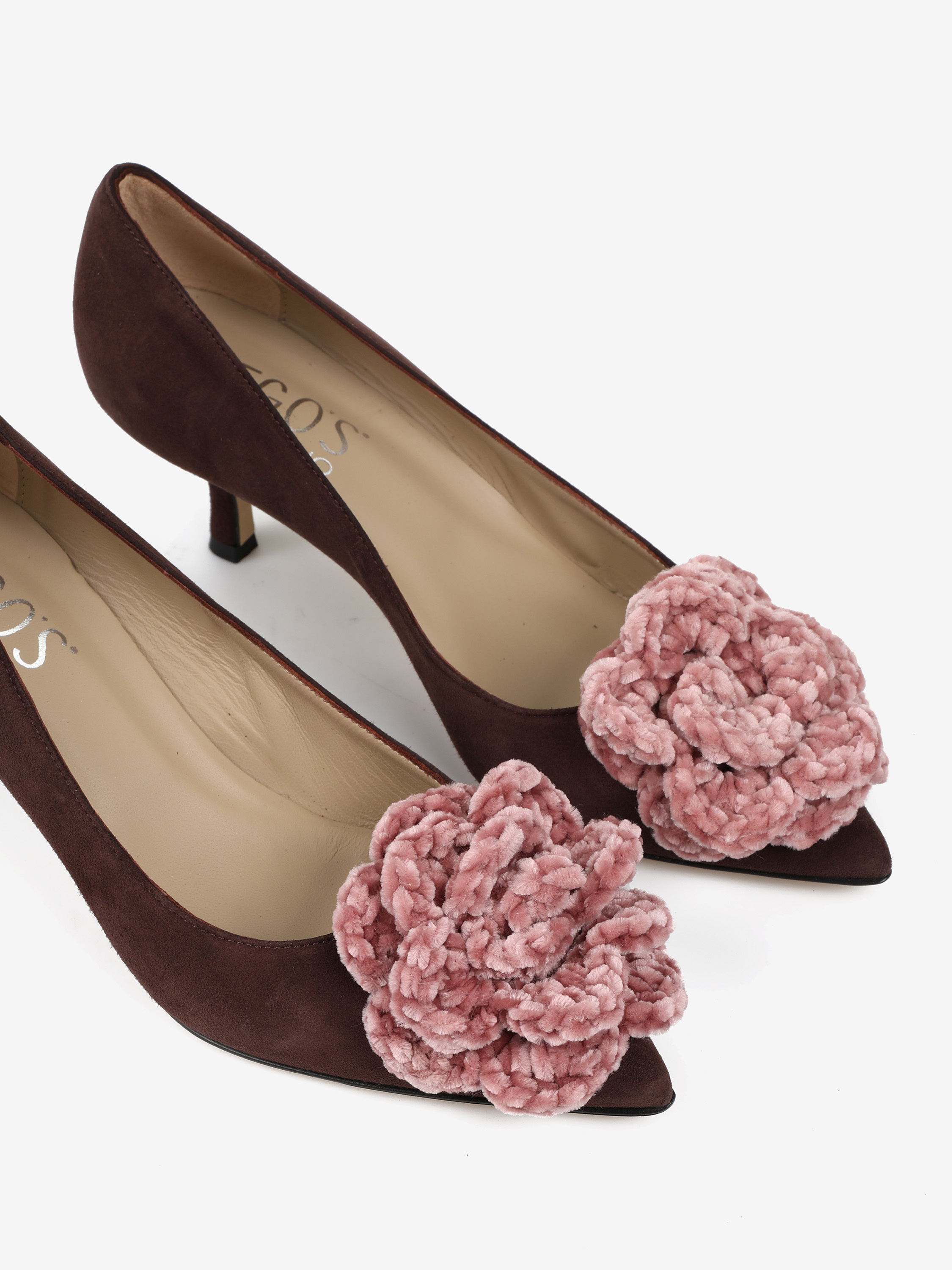 Zamszowe szpilki z noskiem w szpic ozdobione szydełkowym, pudrowo różowym kwiatem.