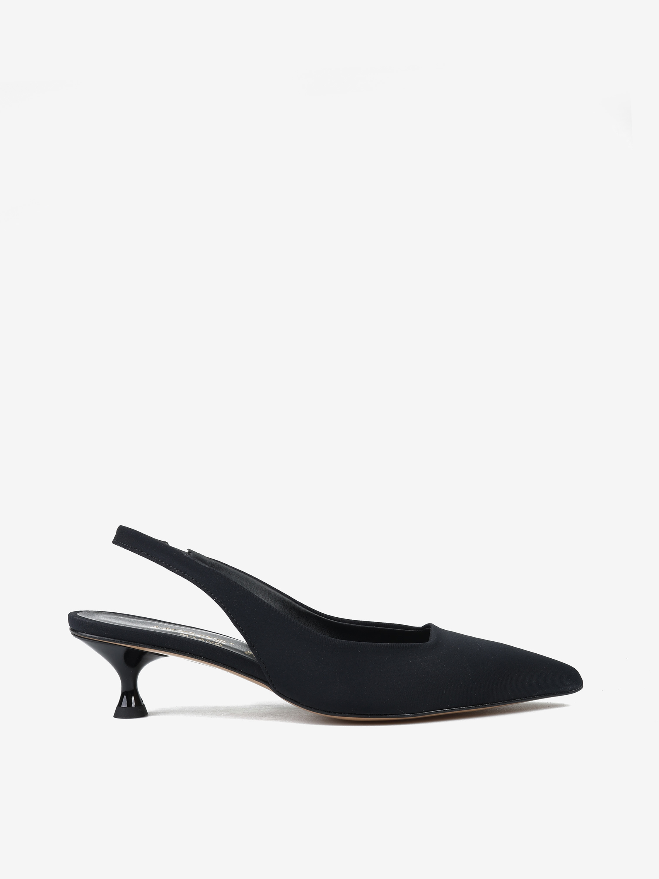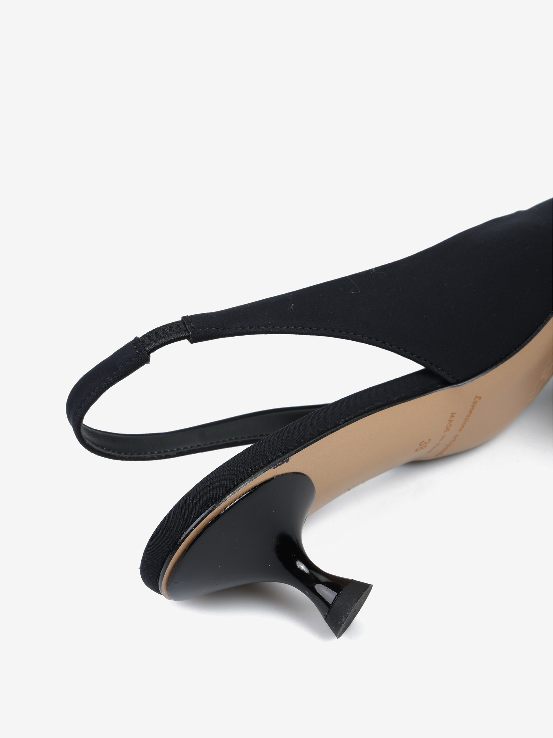 Szpilki z noskiem w szpic, wykonane z tkaniny. Odkryta pięta z paskiem dopasowującym się do stopy.