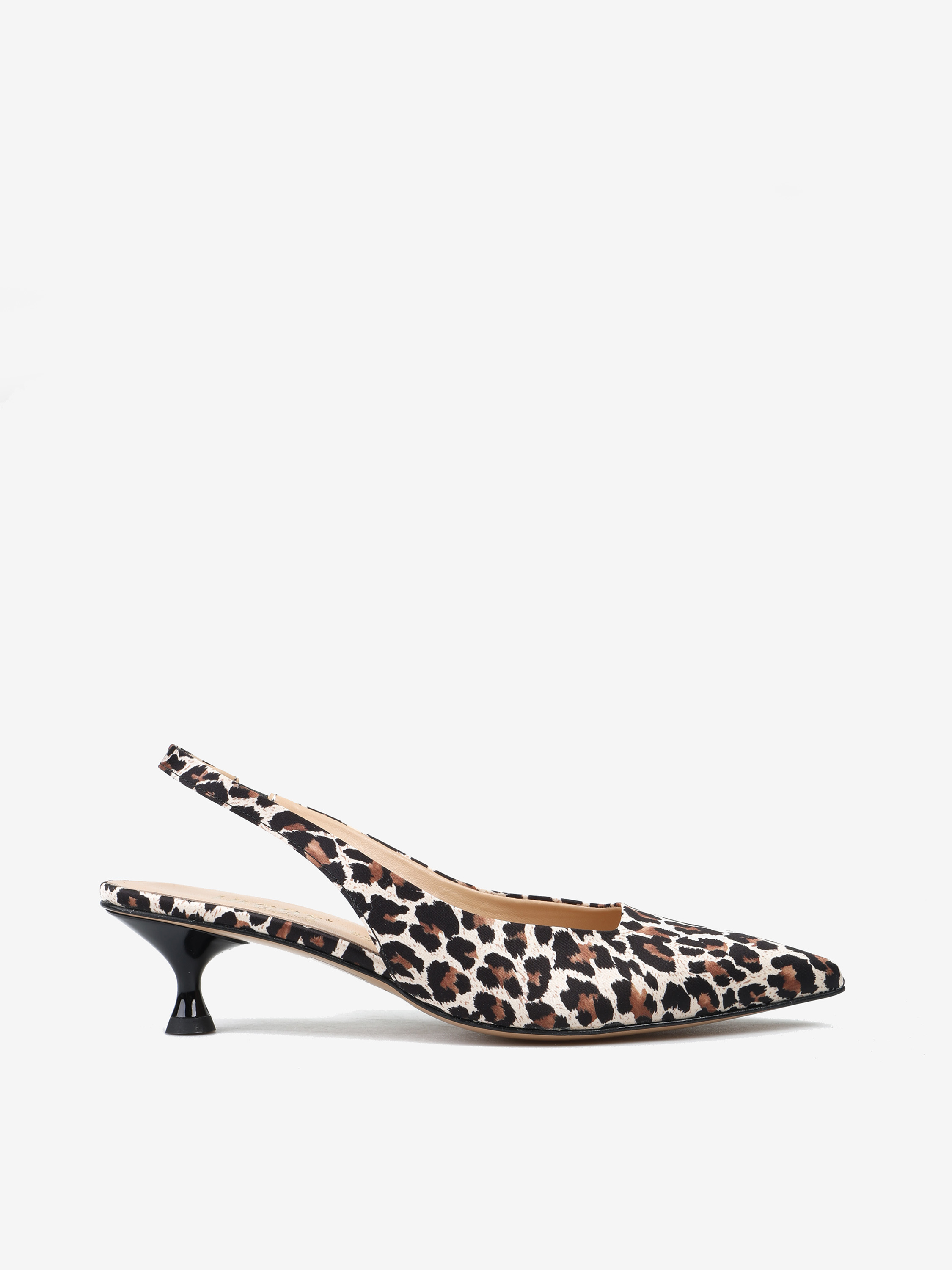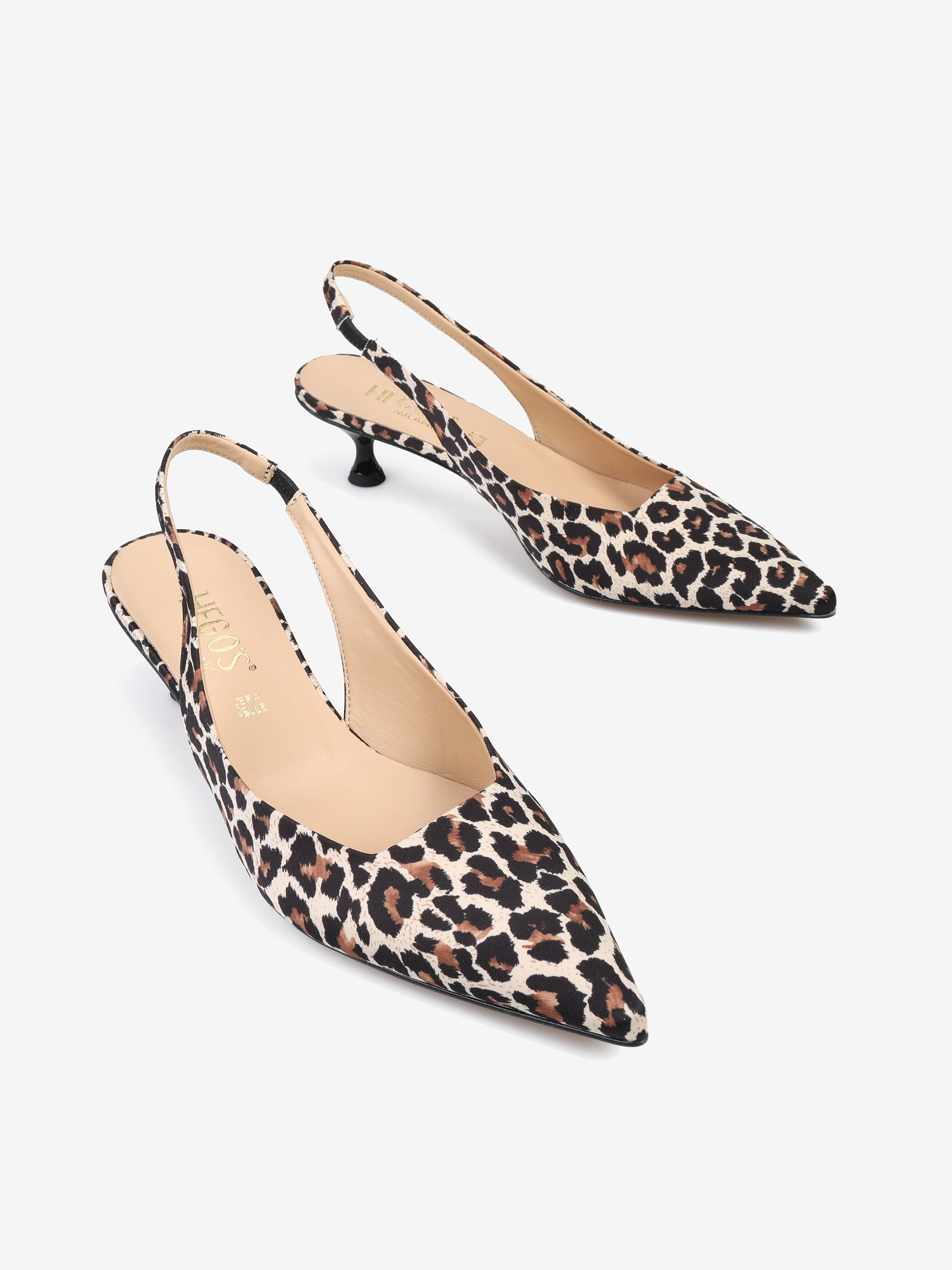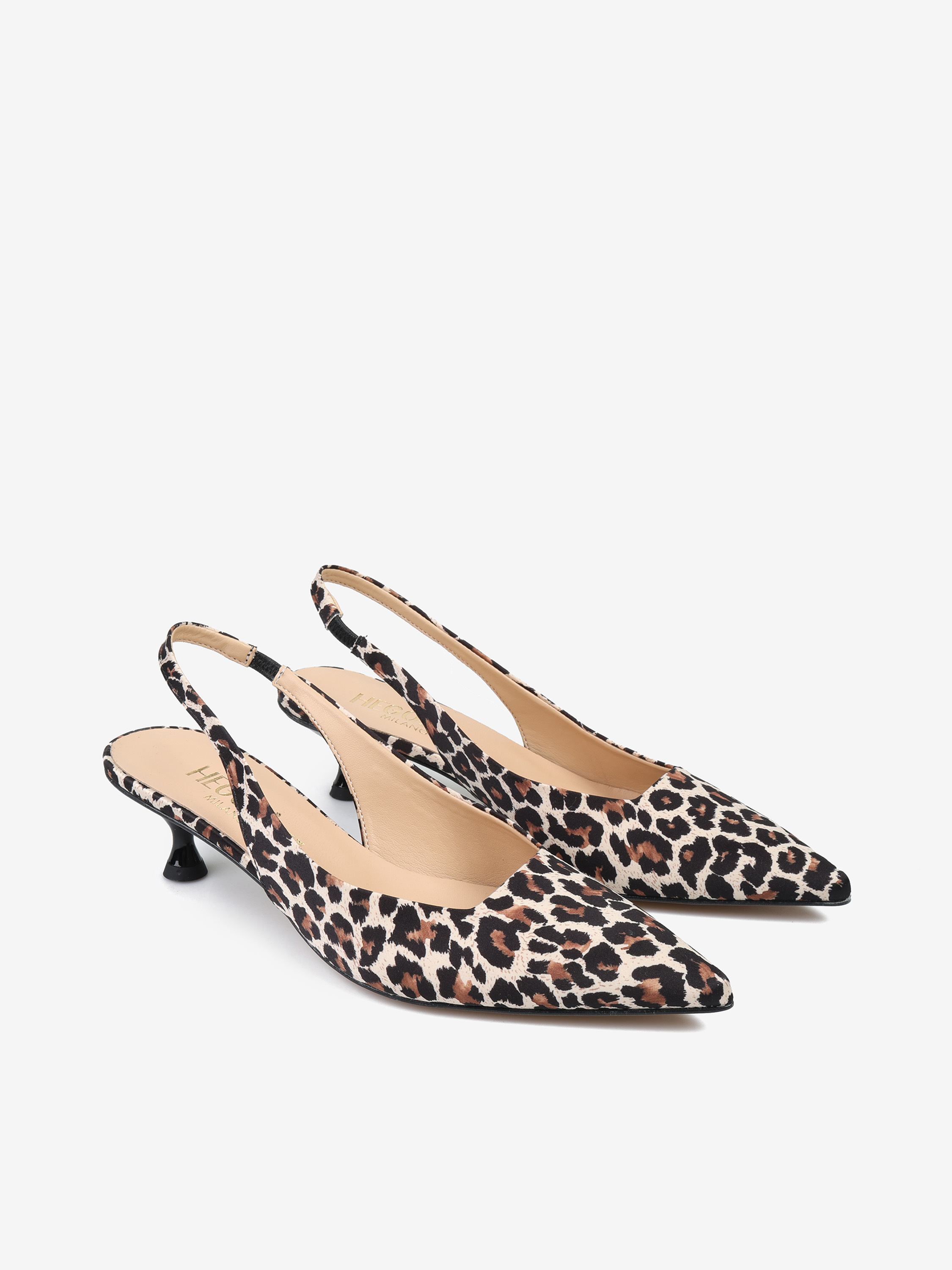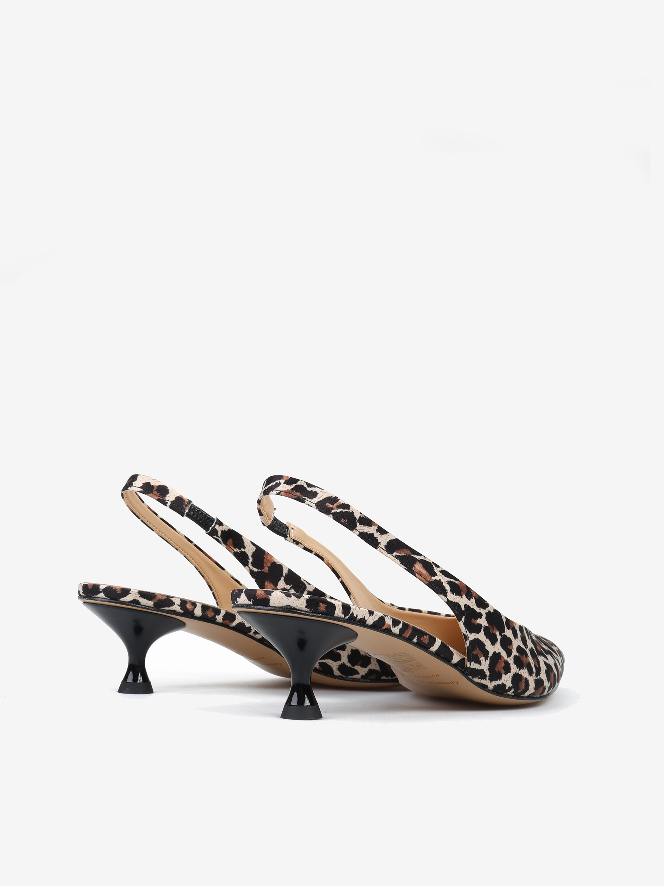Szpilki z noskiem w szpic, wykonane z tkaniny ze zwierzęcym wzorem. Odkryta pięta z paskiem dopasowującym się do stopy.