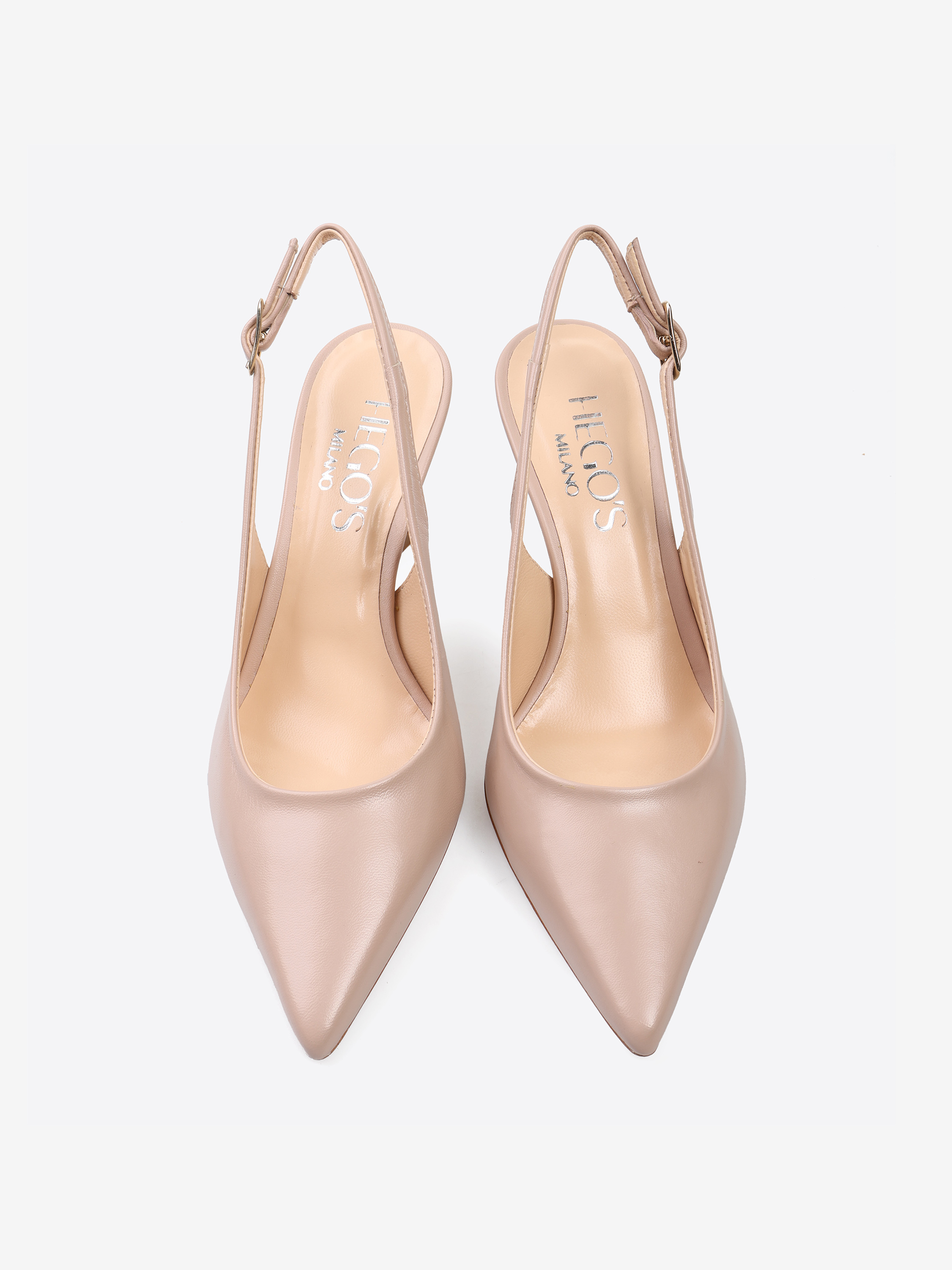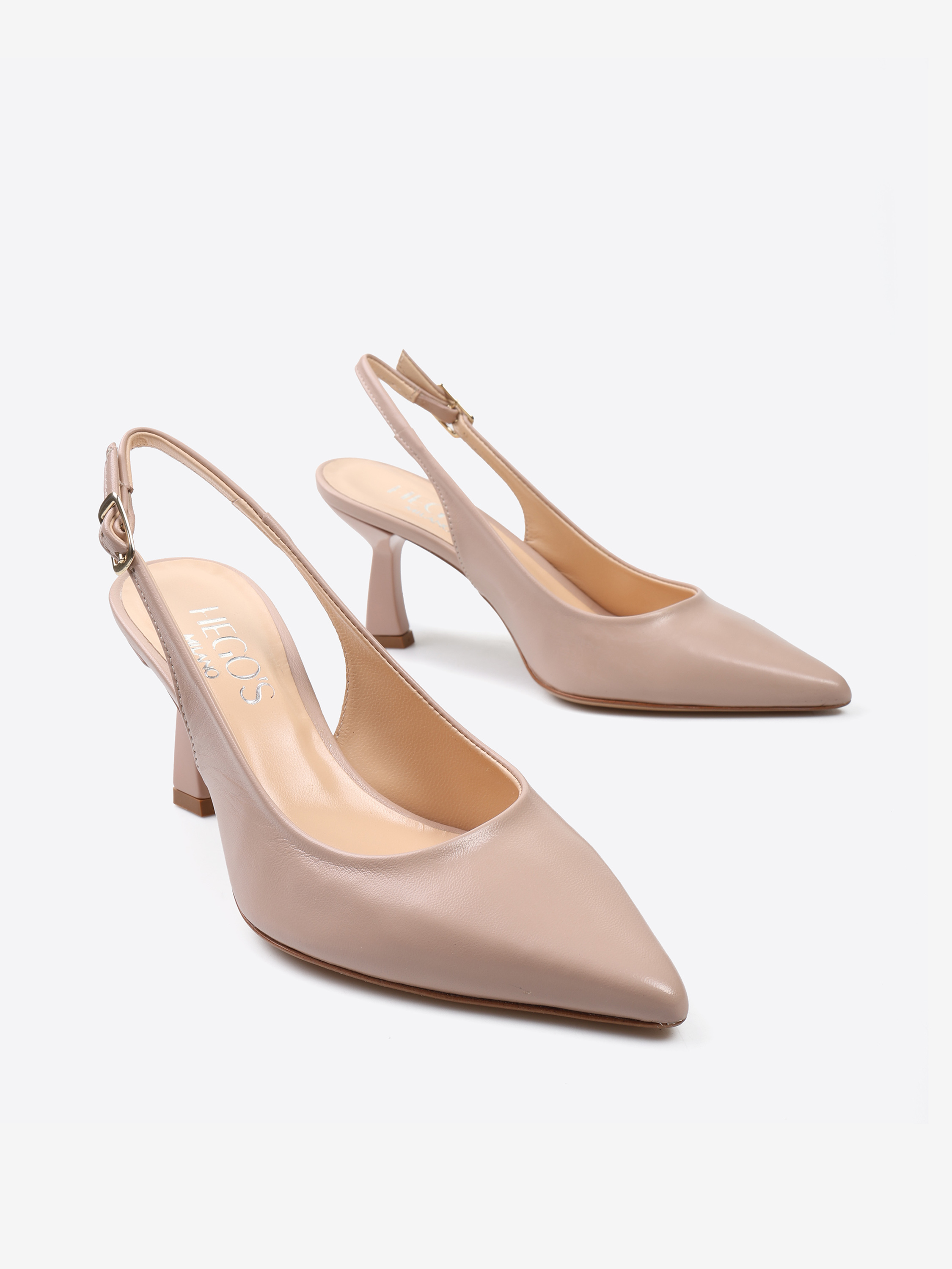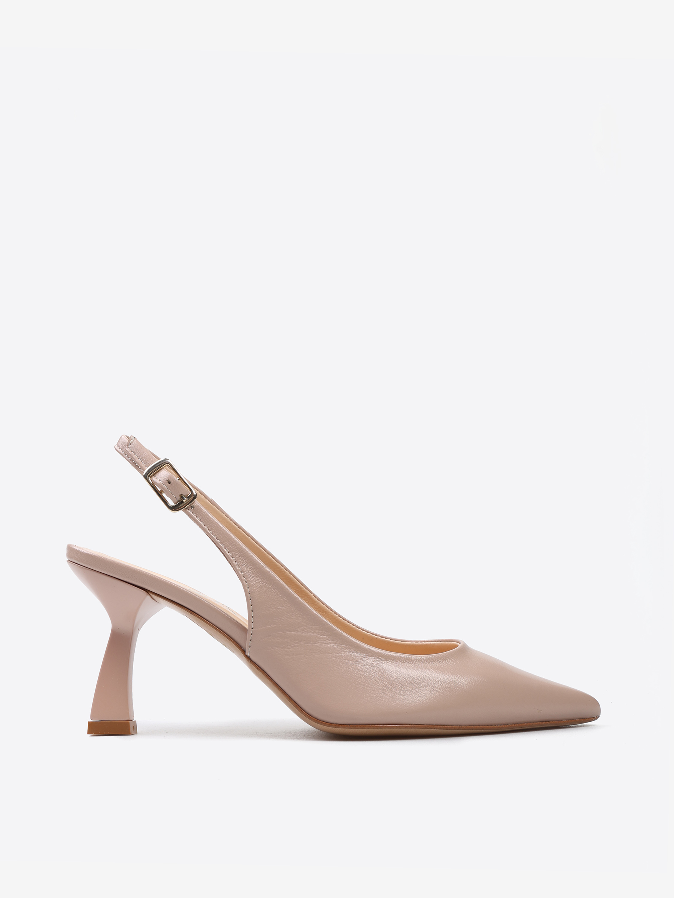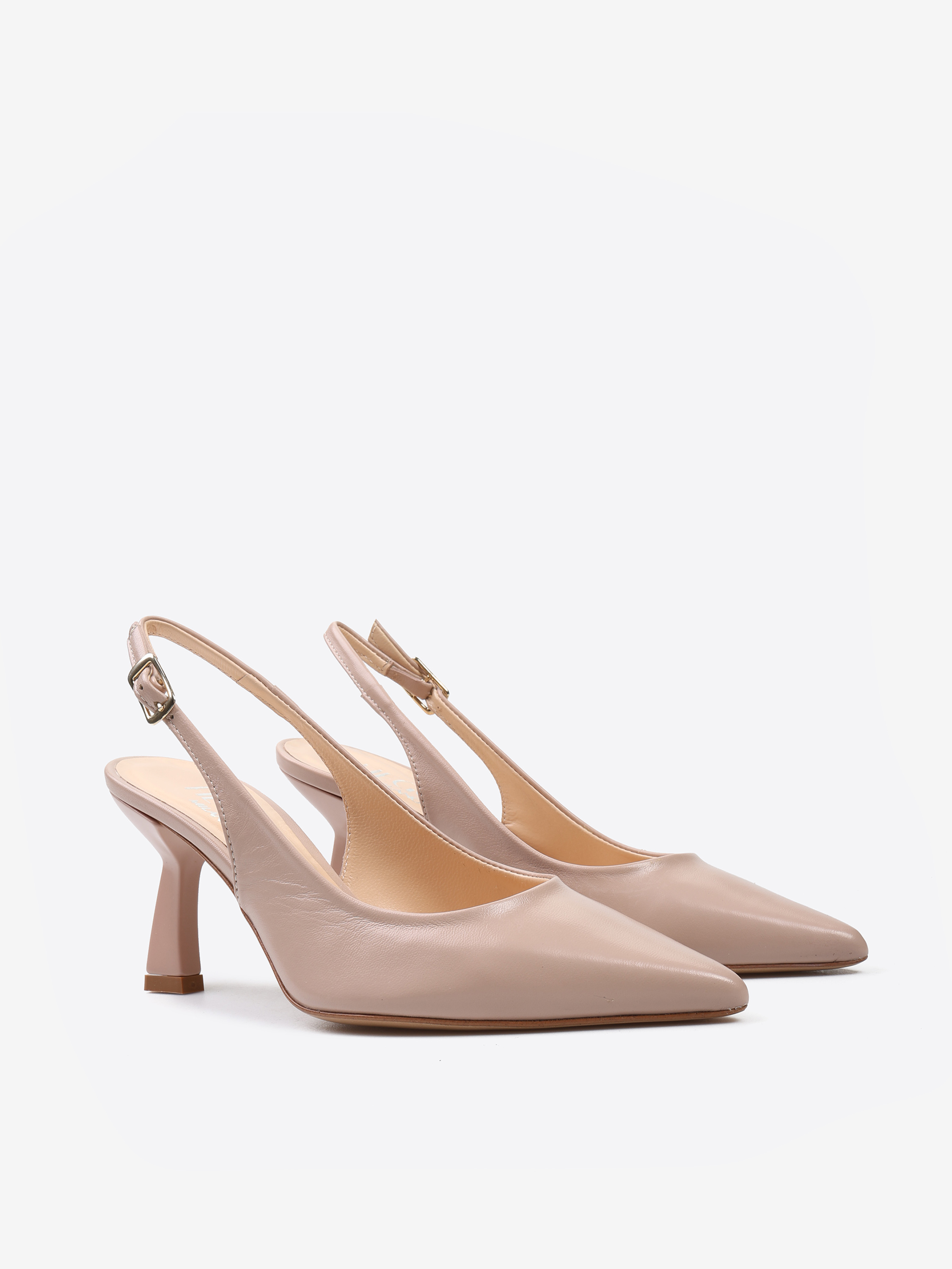 Klasyczne szpilki z noskiem w szpic wykonane z miękkiej, delikatnej skóry. Odkryta pięta z regulowanym paskiem.