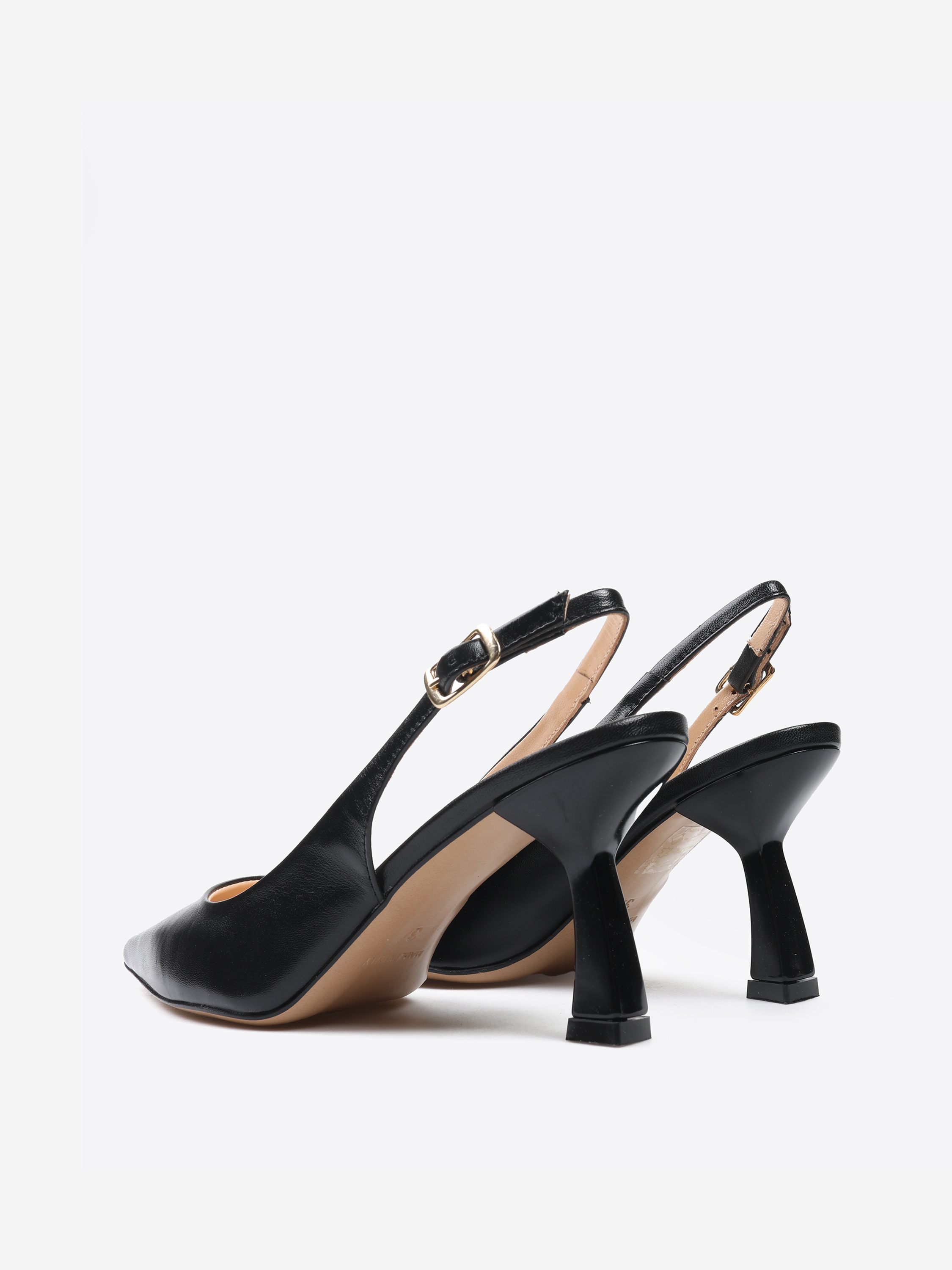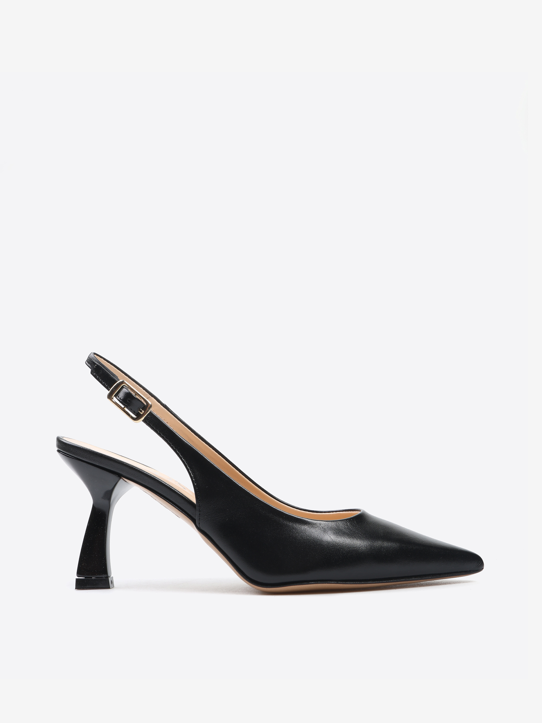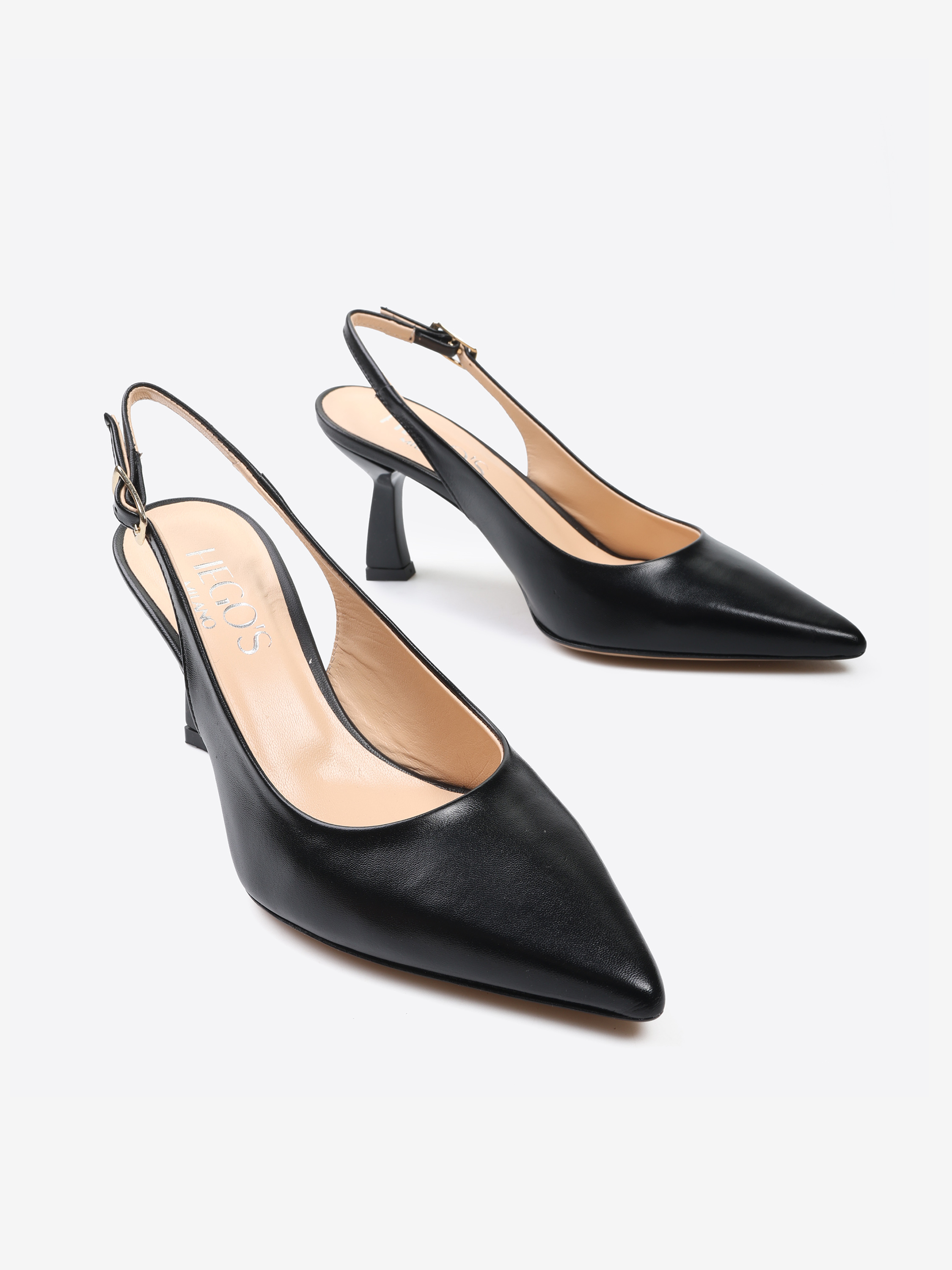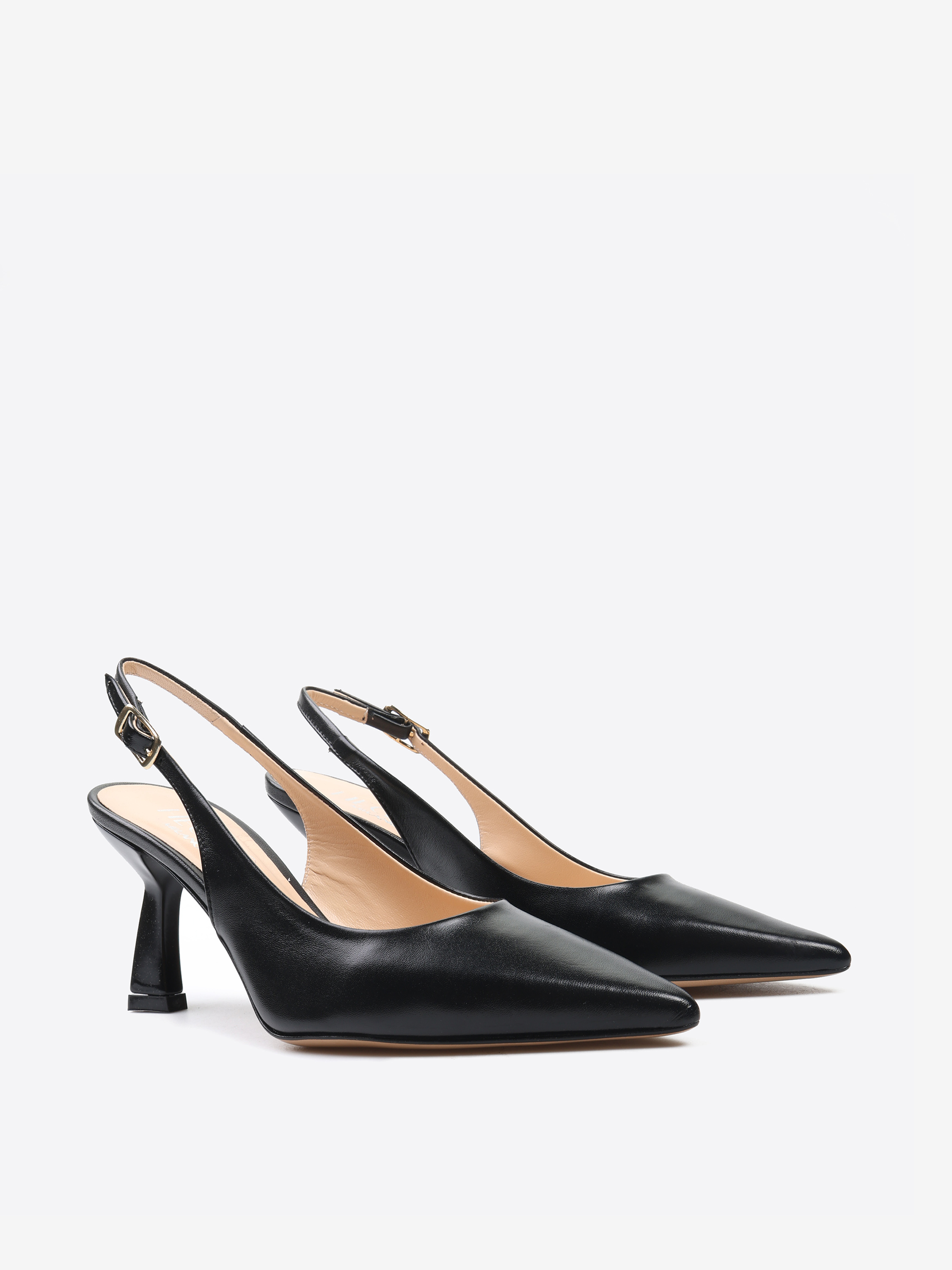 Klasyczne szpilki z noskiem w szpic wykonane z miękkiej, delikatnej skóry. Odkryta pięta z regulowanym paskiem.