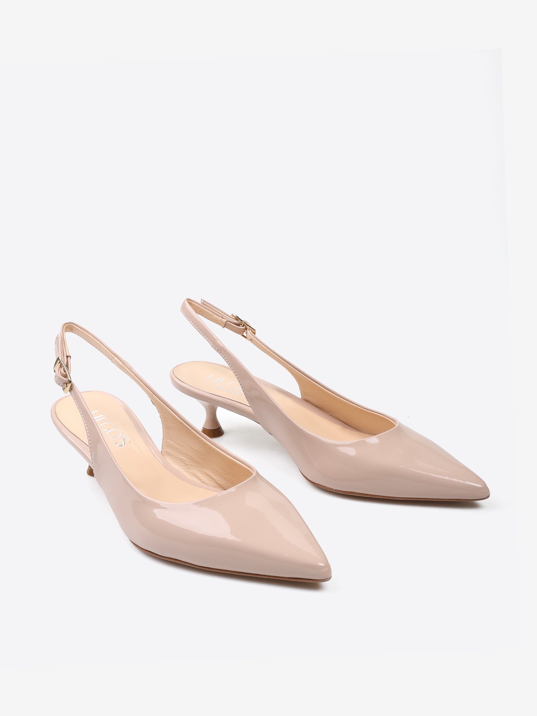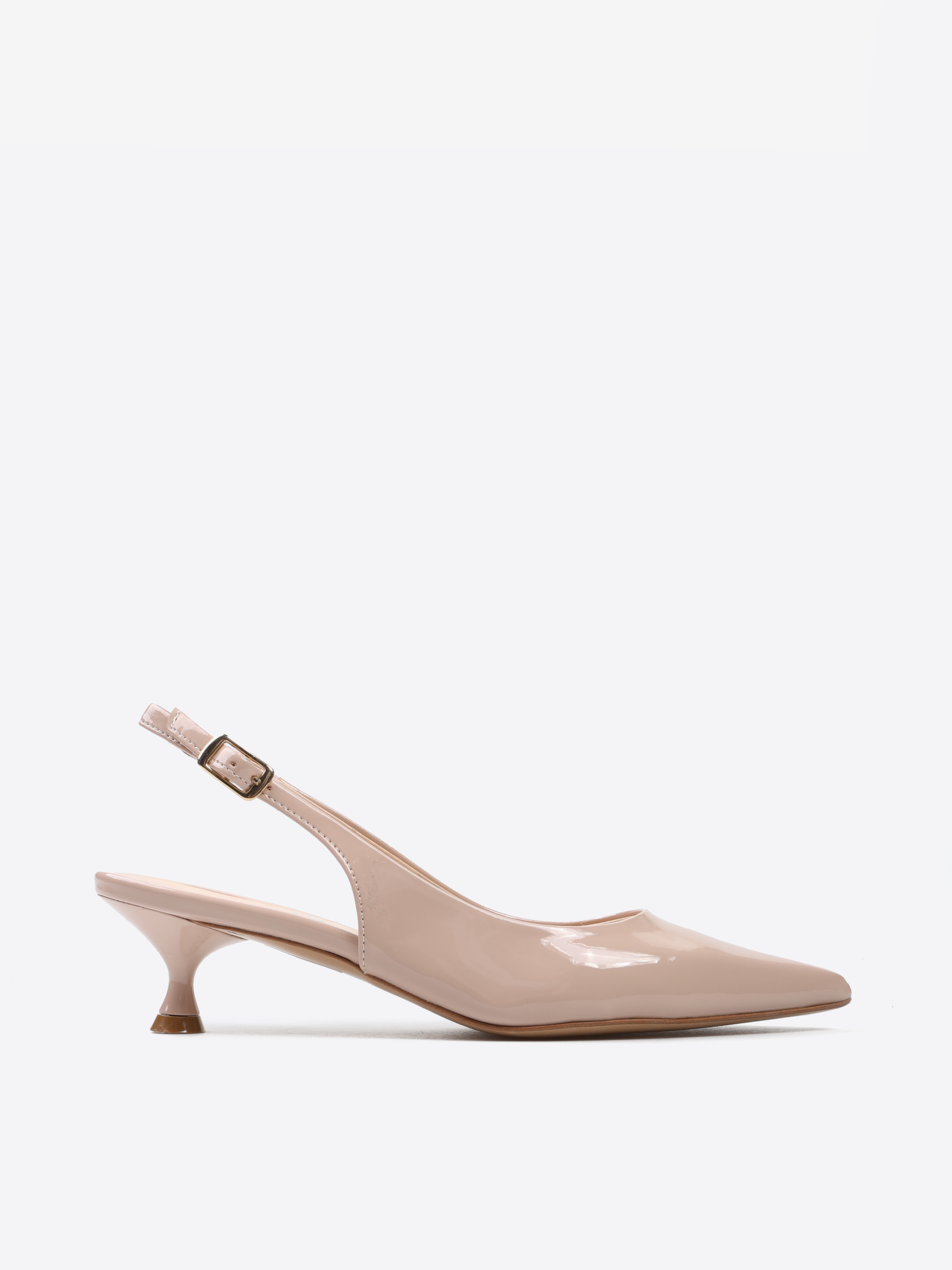 Lakierowane, klasyczne szpilki z noskiem w szpic. Odkryta pięta z regulowanym paskiem.