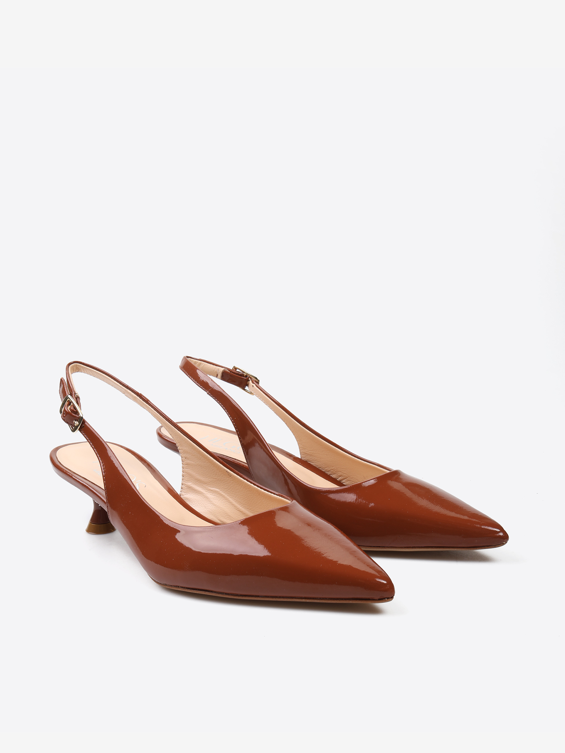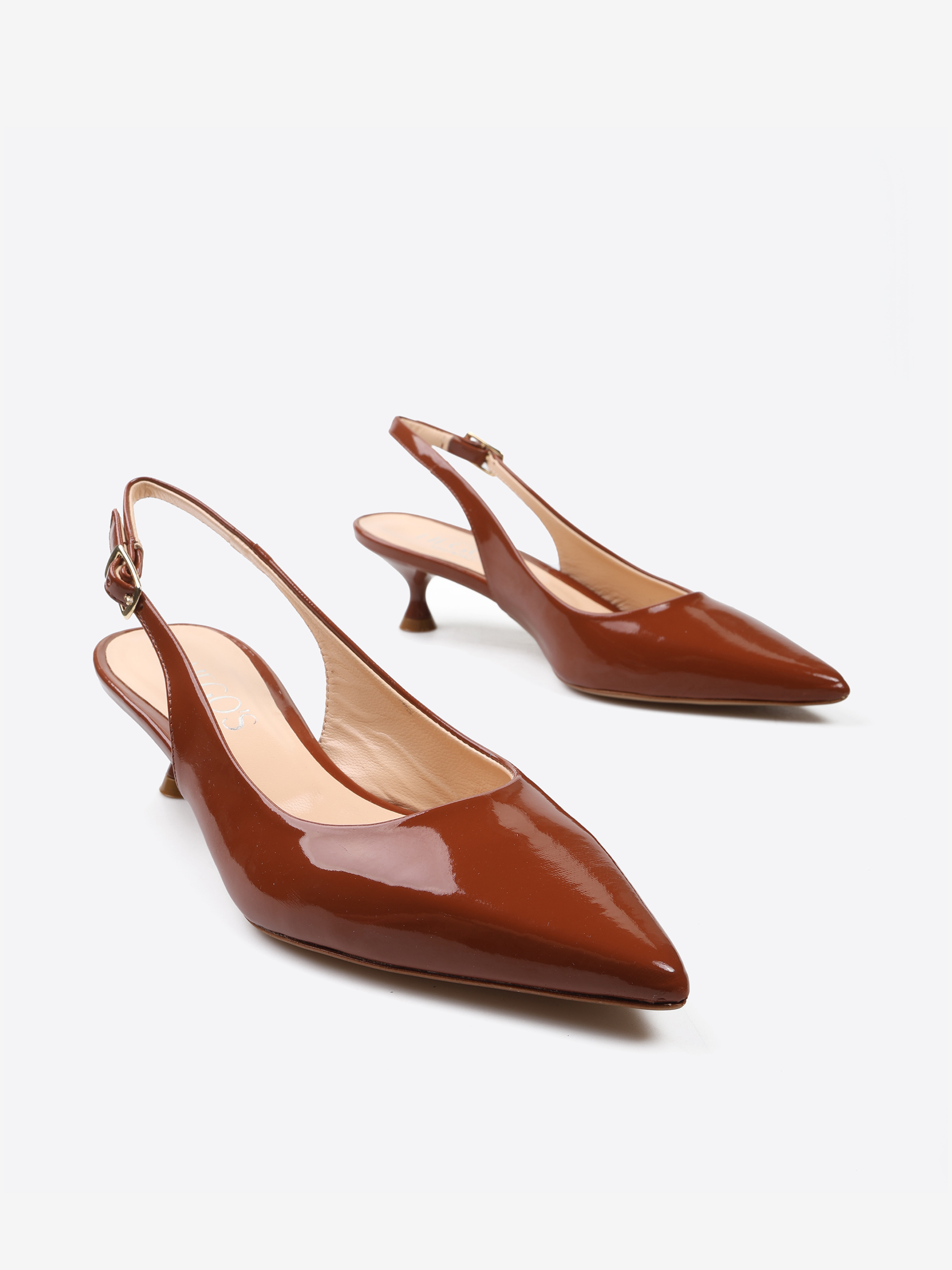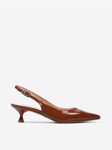 Lakierowane, klasyczne szpilki z noskiem w szpic. Odkryta pięta z regulowanym paskiem.
