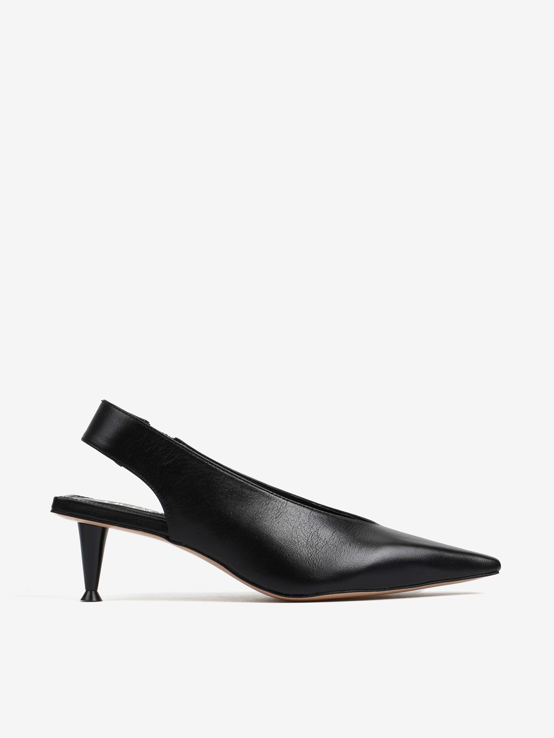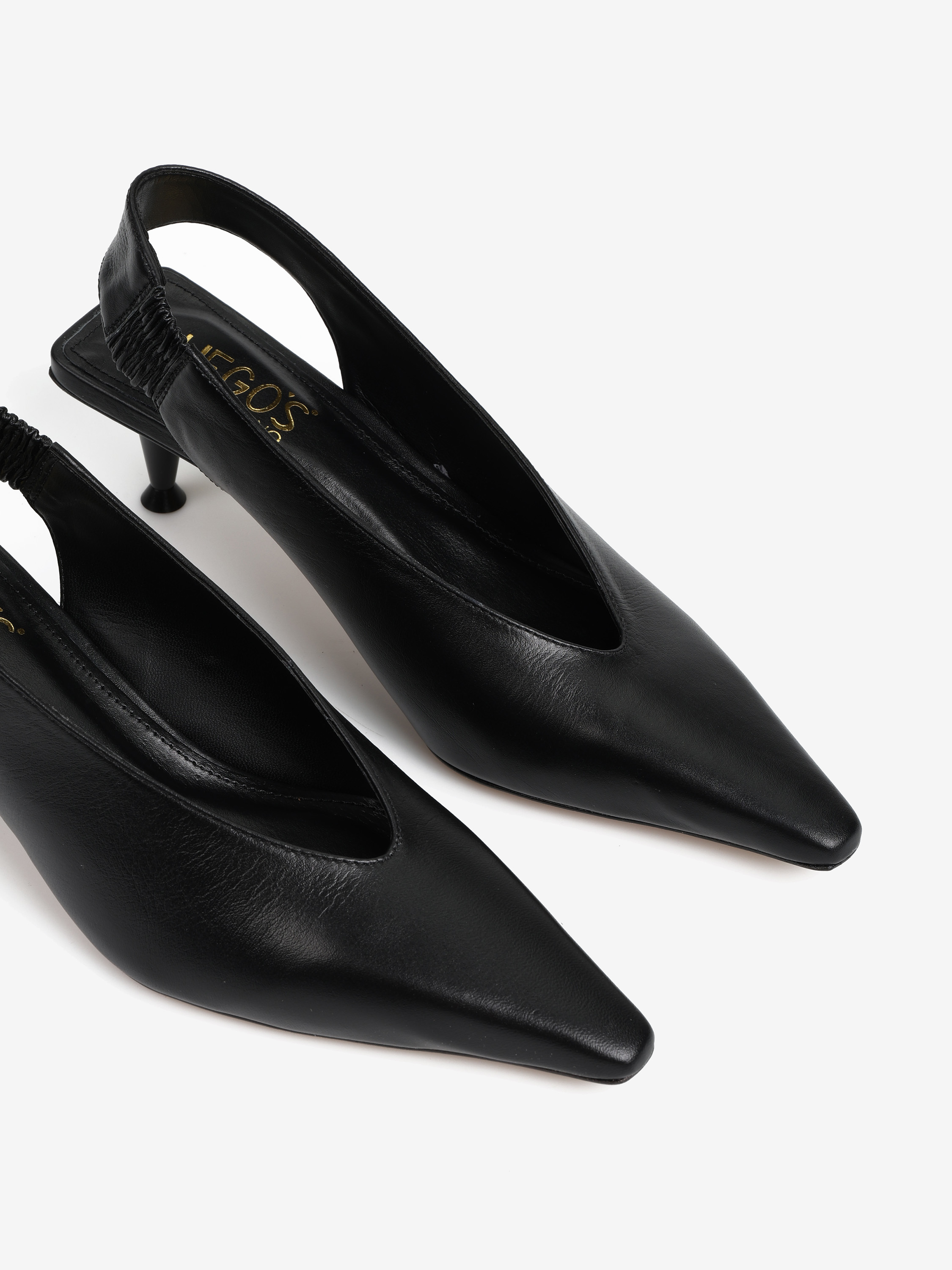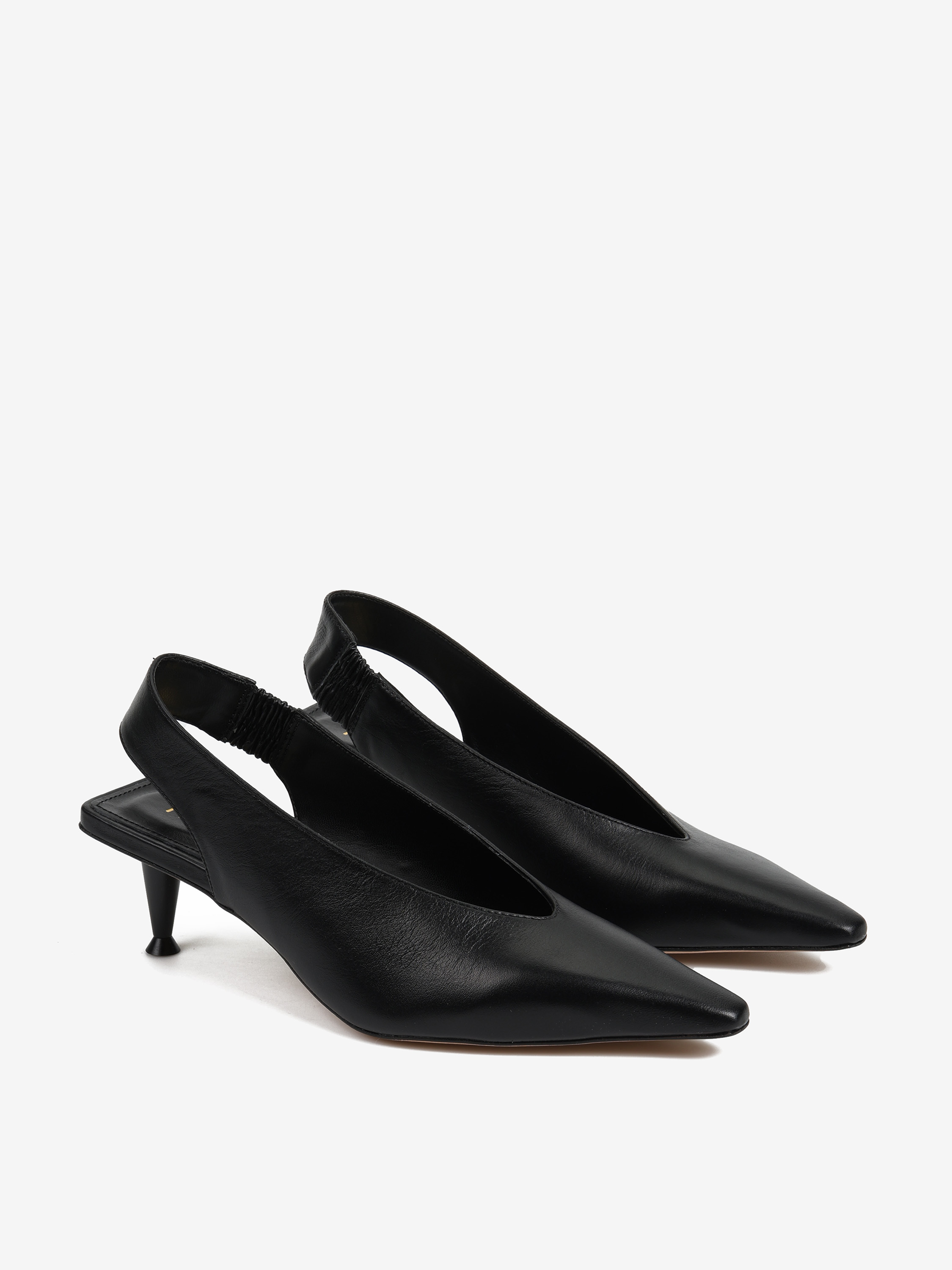Szpilki z geometrycznym obcasem i wydłużonymi noskami w szpic. Odkryta pięta z elastycznym paskiem.
