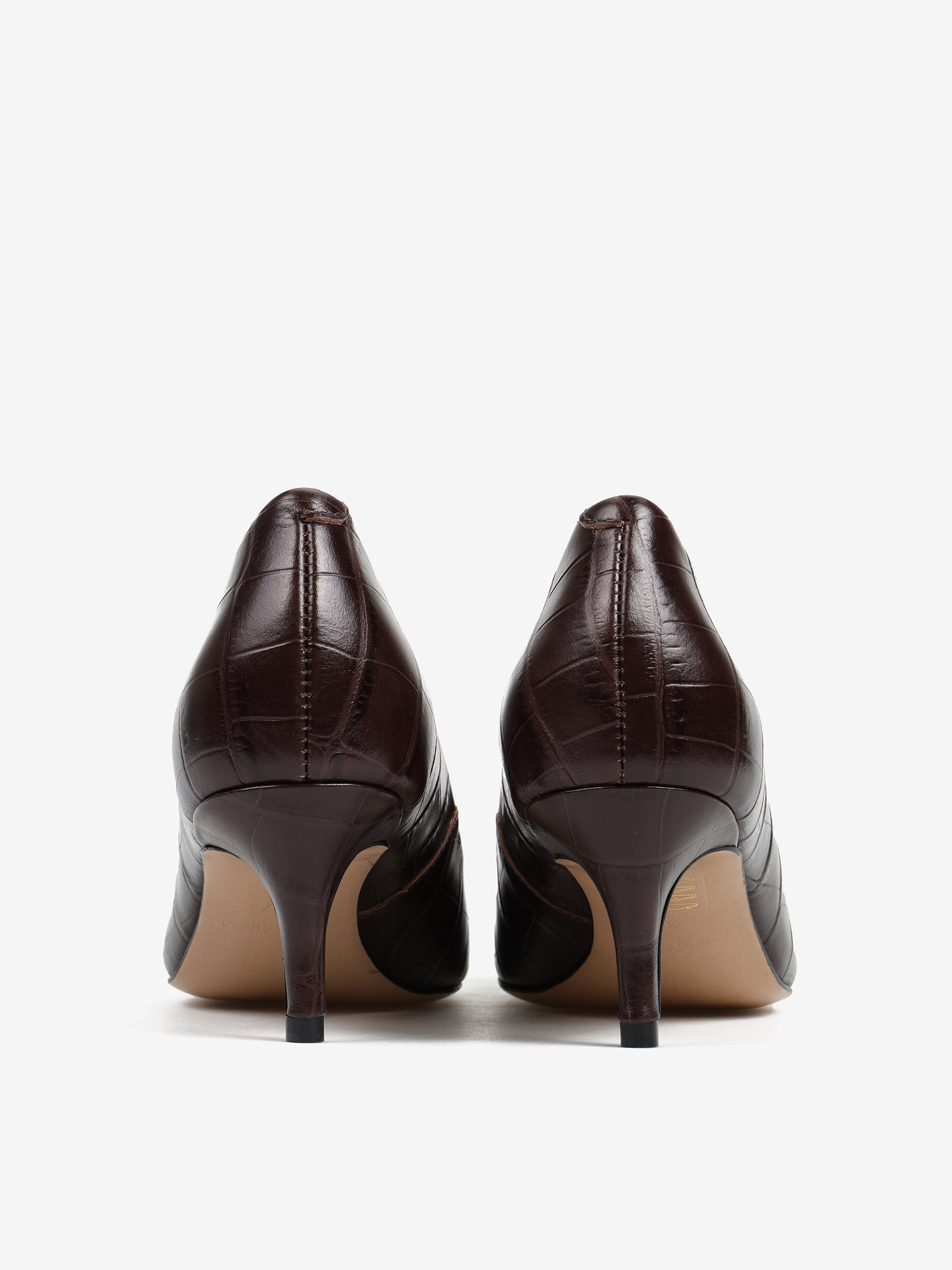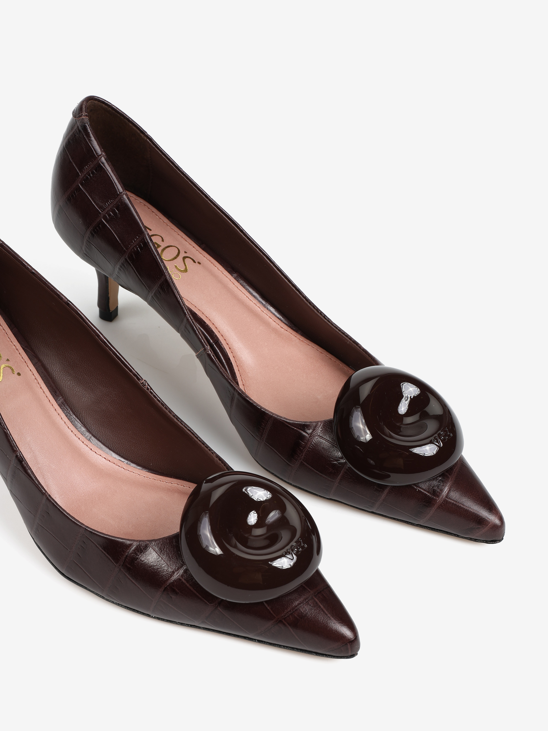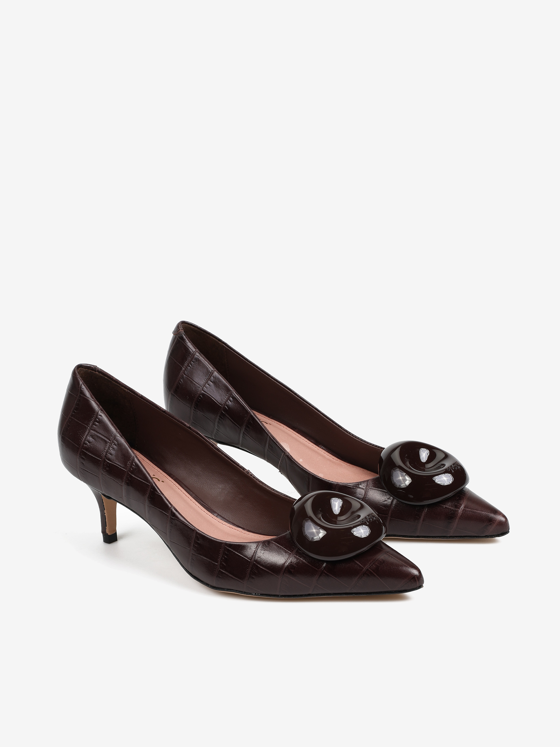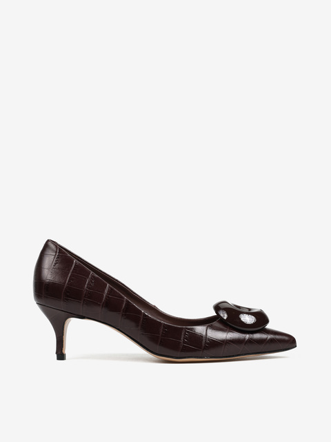 Klasyczne szpilki z naturalnej skóry tłoczonej w krokodyli wzór. Noski w szpic z ozdobną aplikacją.