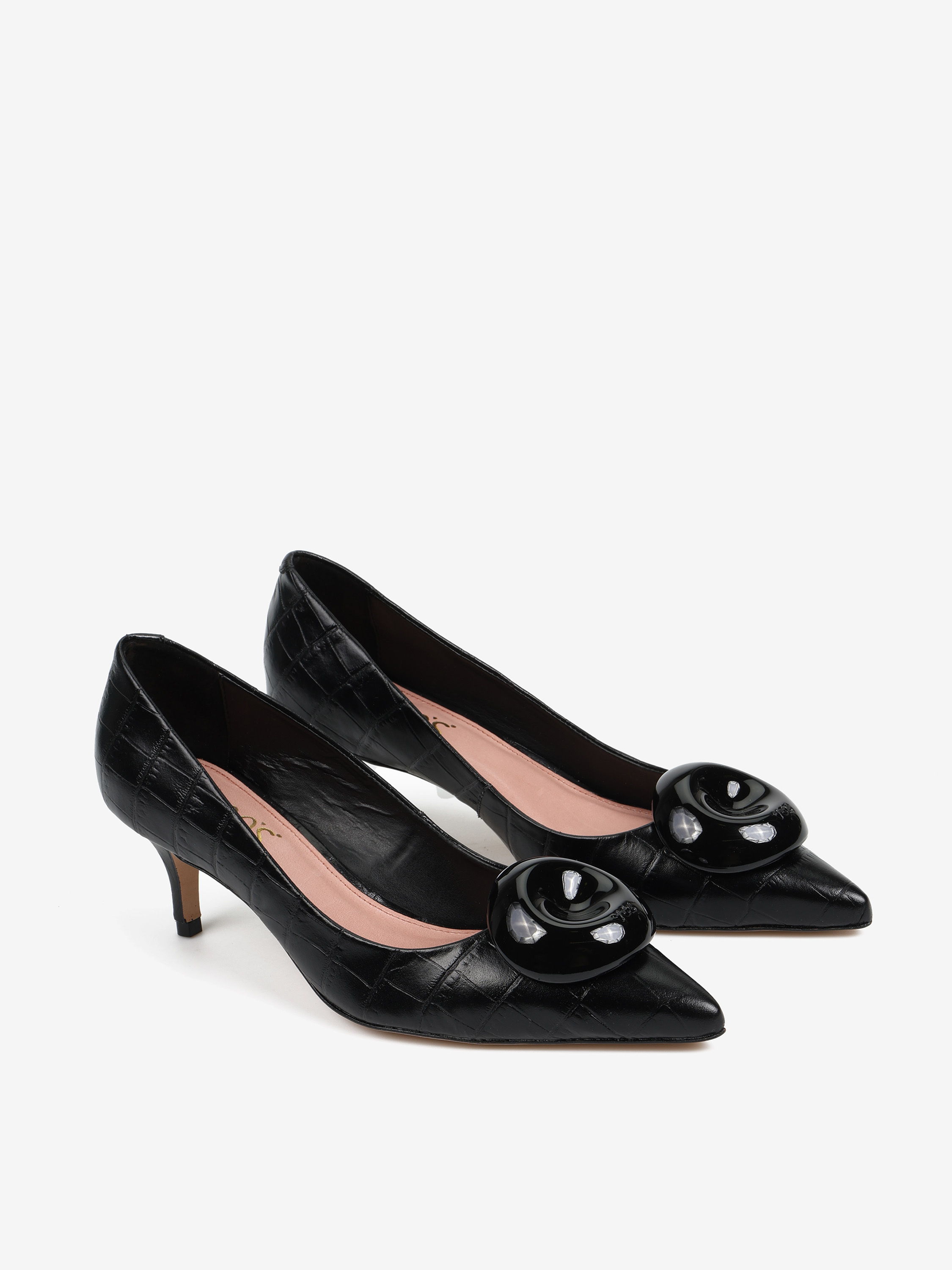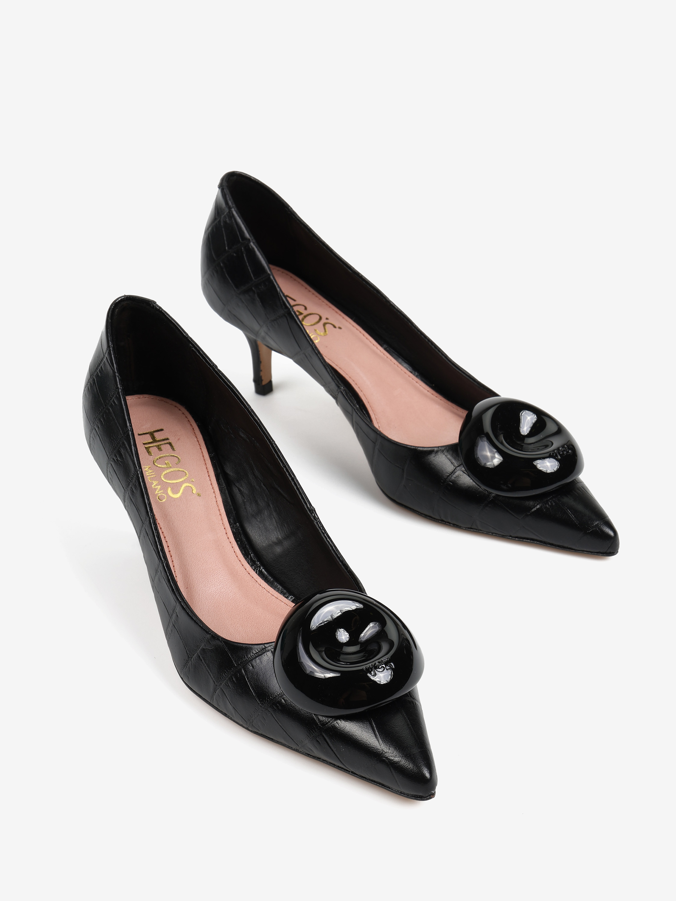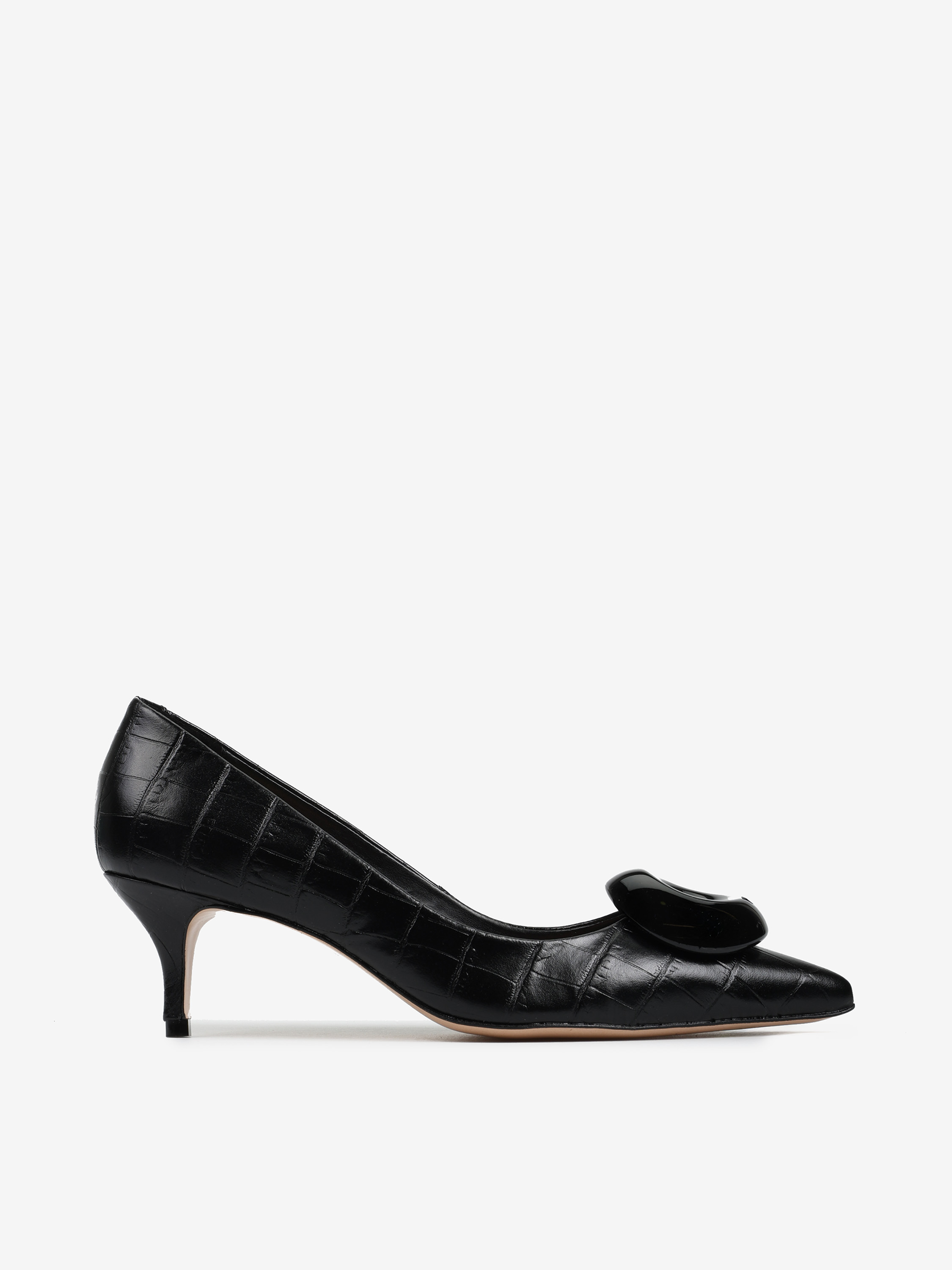 Klasyczne szpilki z naturalnej skóry tłoczonej w krokodyli wzór. Noski w szpic z ozdobną aplikacją.