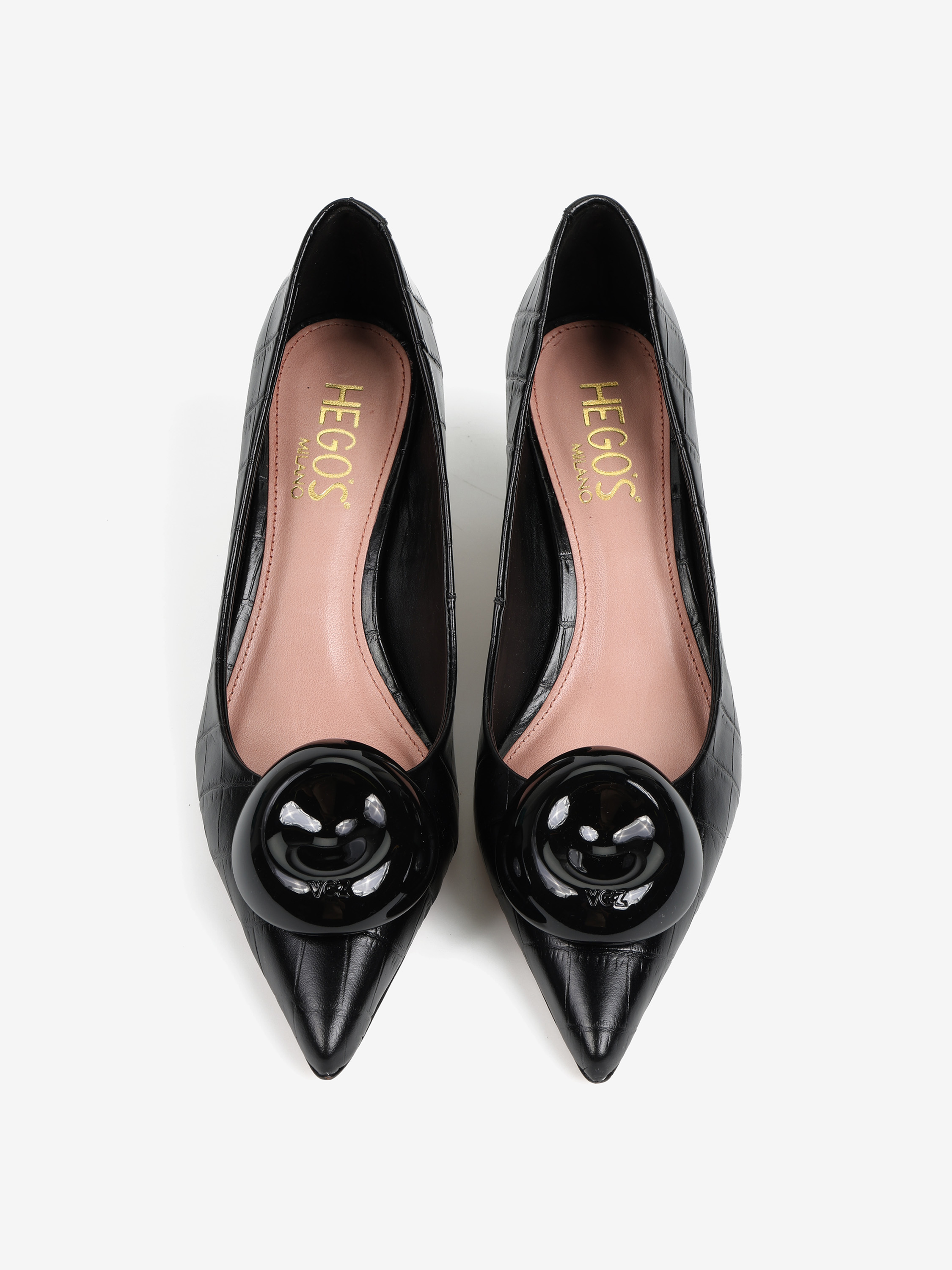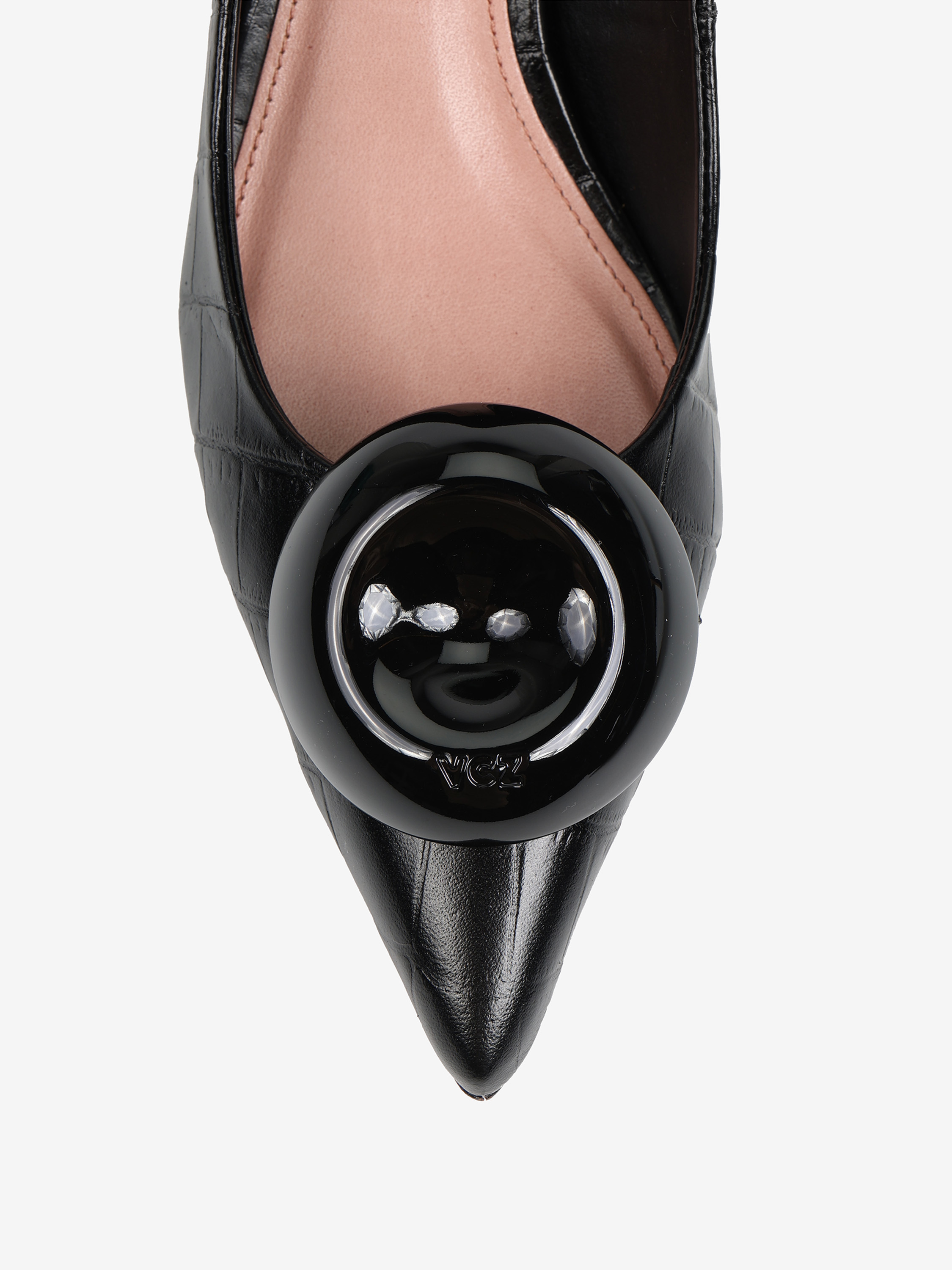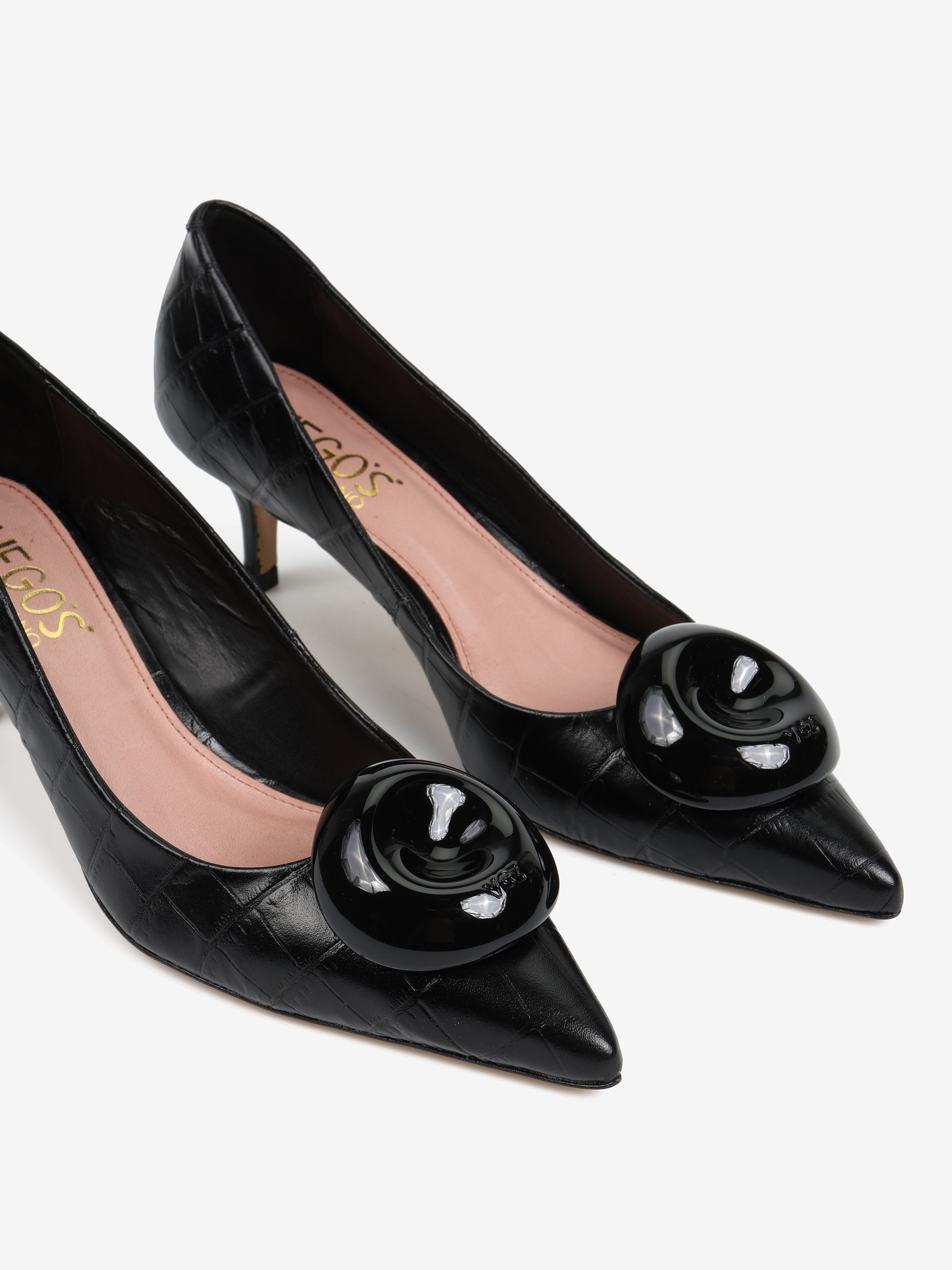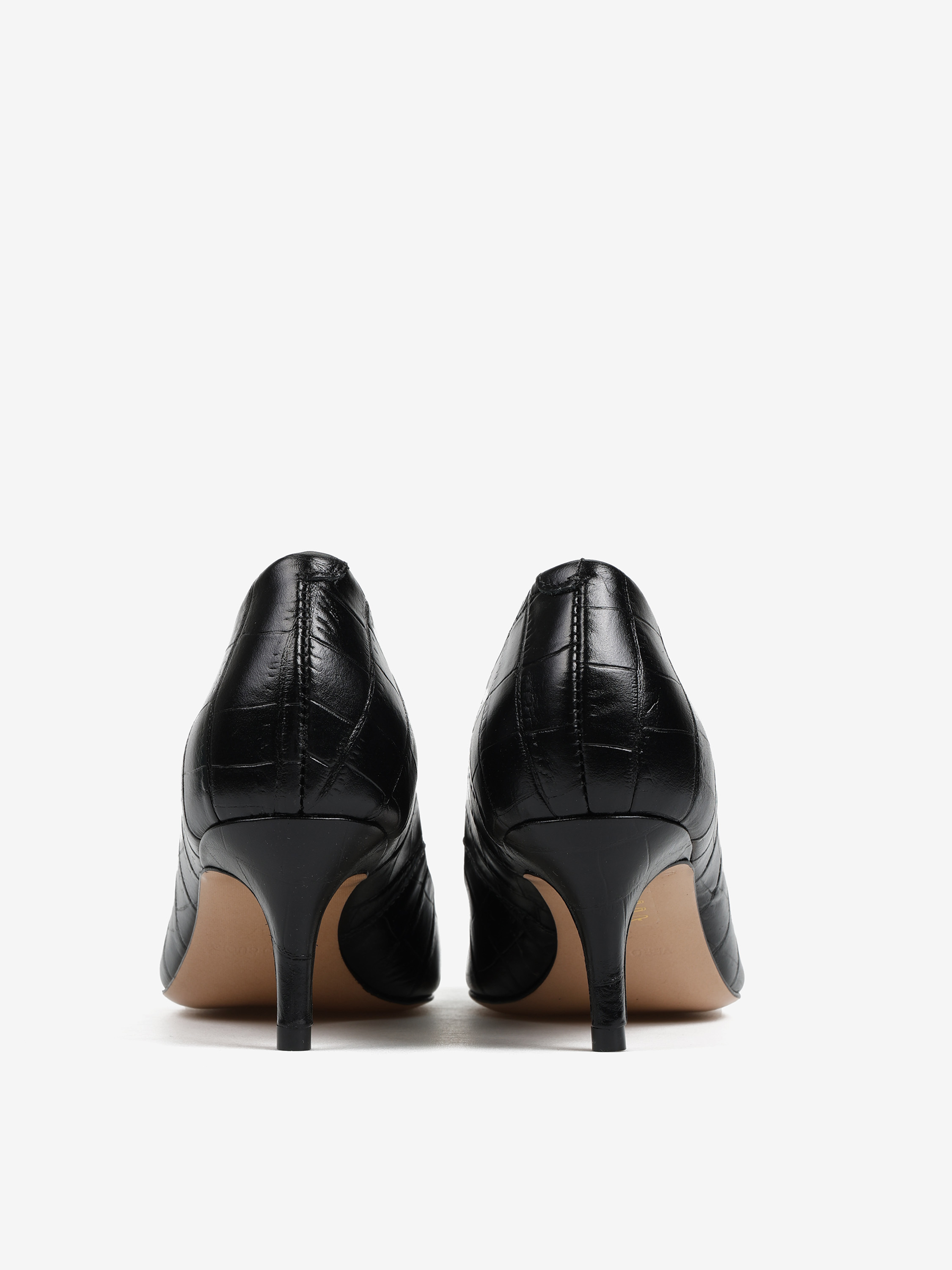 Klasyczne szpilki z naturalnej skóry tłoczonej w krokodyli wzór. Noski w szpic z ozdobną aplikacją.