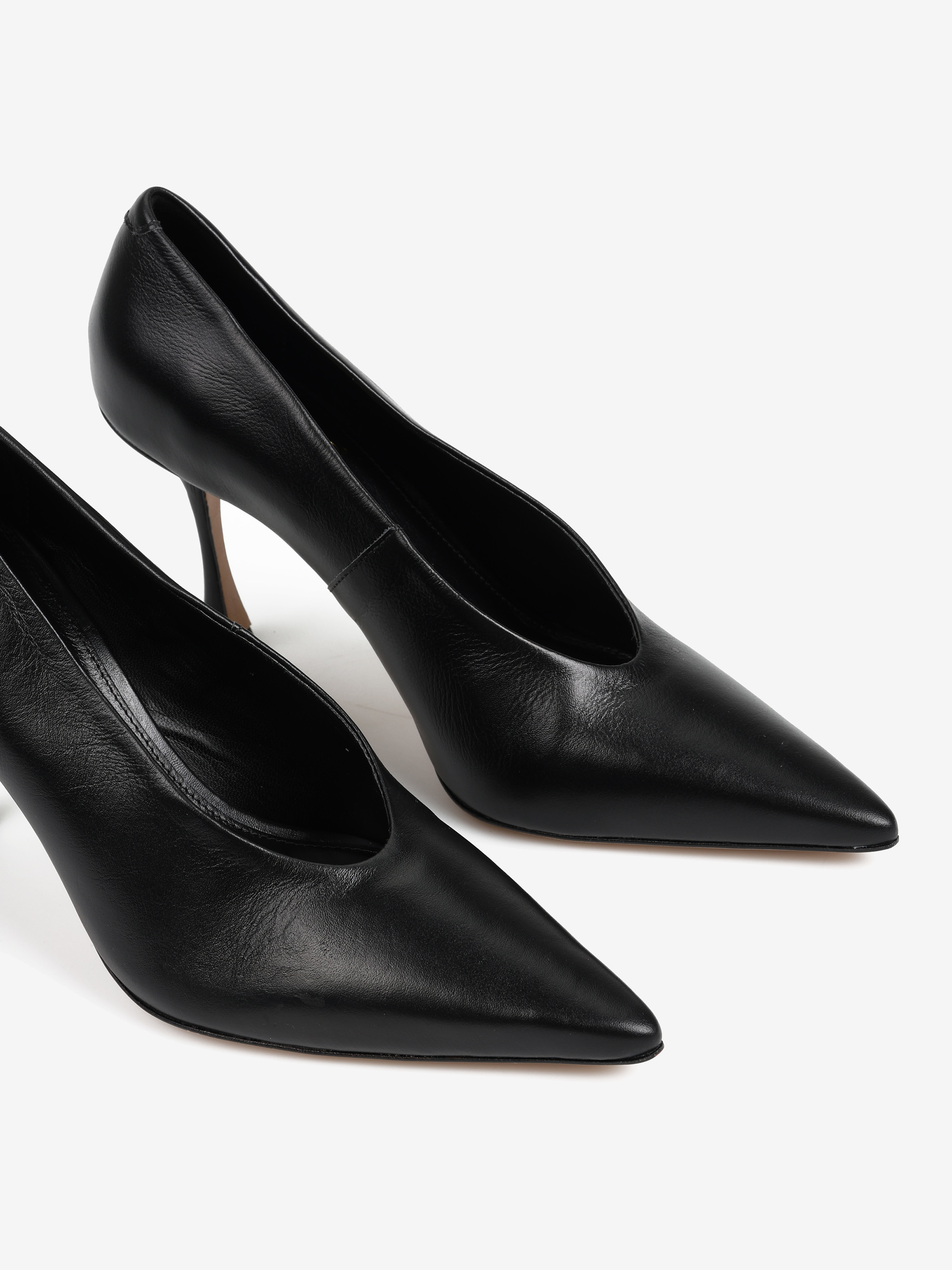 Szpilki na wysokim, delikatnie rozszerzanym obcasie. Owalne wycięcia z zabudowanymi brzegami i noski w szpic.