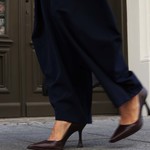Szpilki na wysokim, rozszerzanym obcasie. Głębokie wycięcie i noski w szpic.
